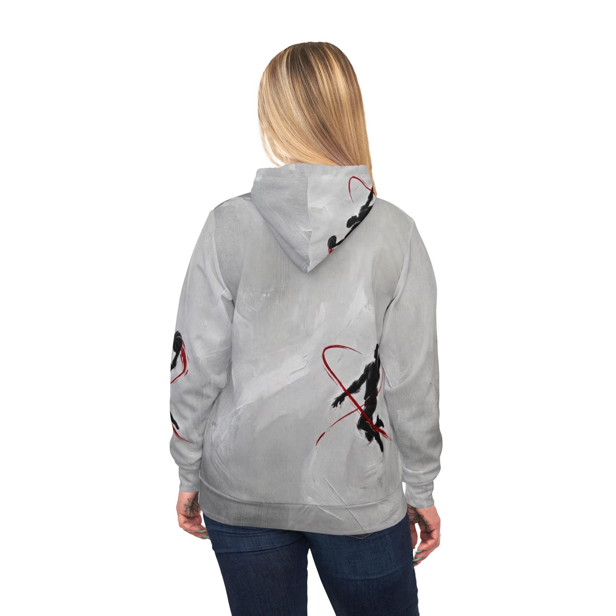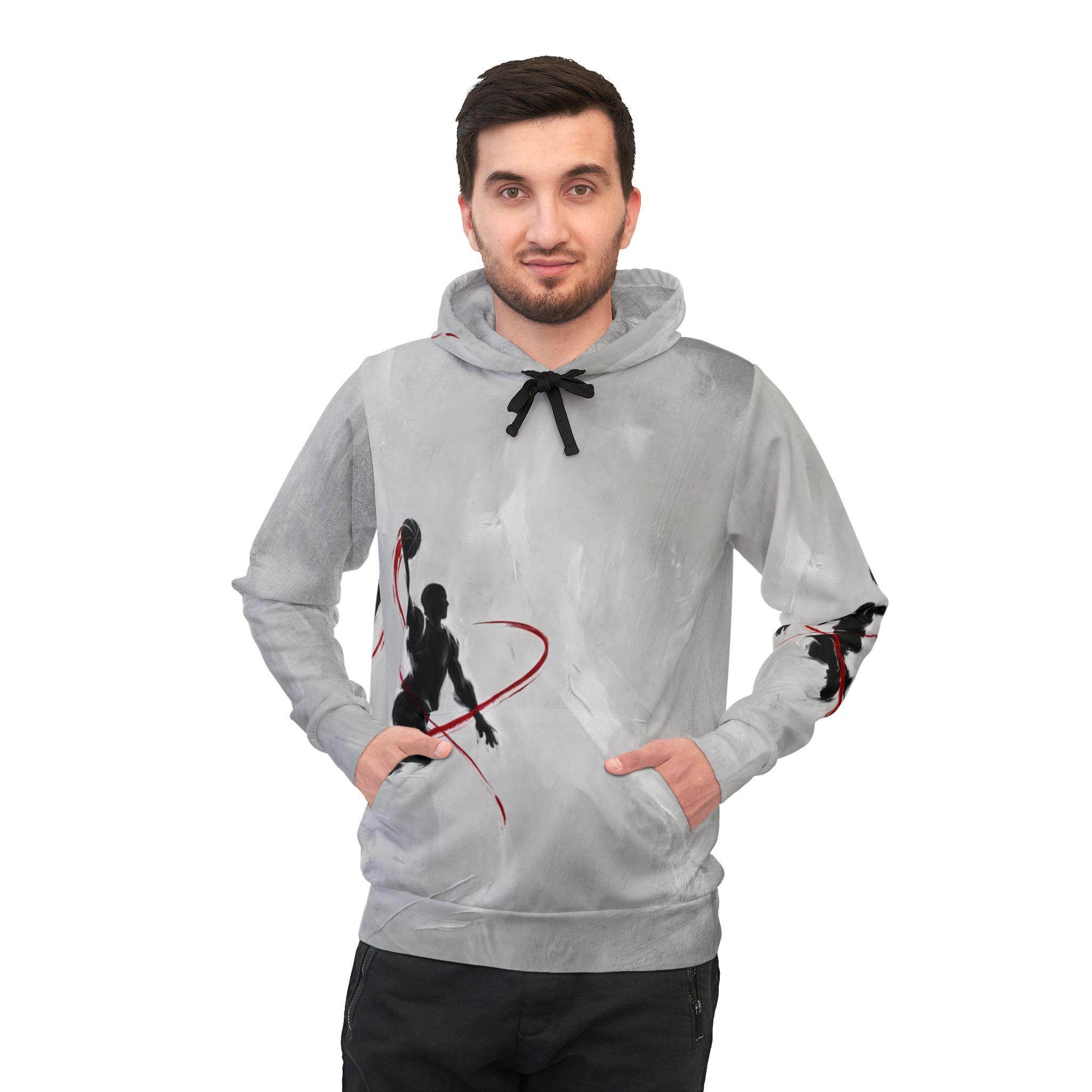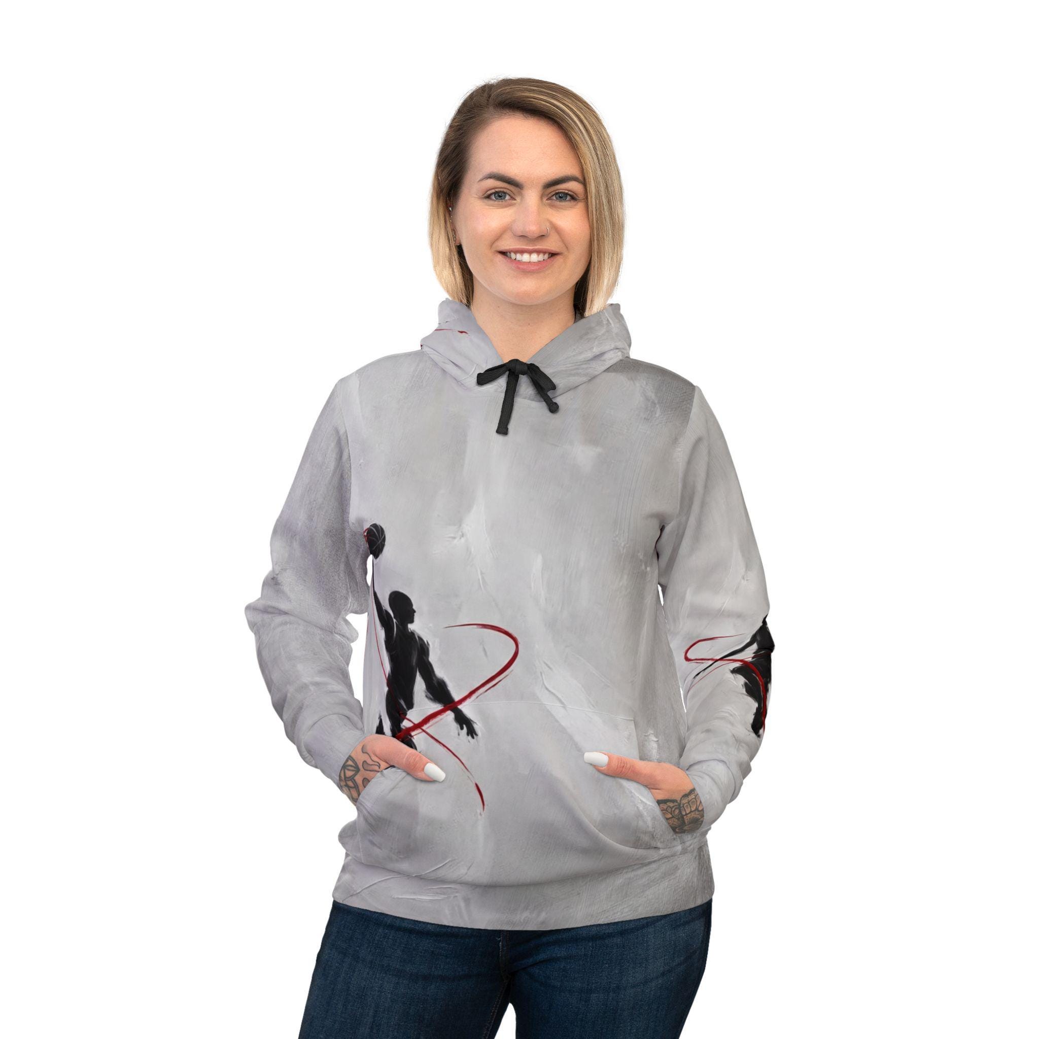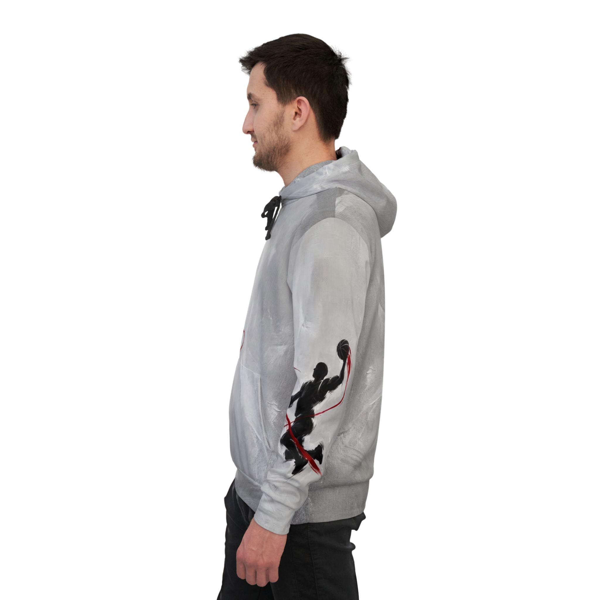 Lightweight athletic hoodie with an urban-sport vibe. A soft, slightly stretchy knit drapes easily during warmups or streetwear days, while the subtle smoky gray background keeps the bold silhouette artwork the focal point. The dynamic, mid-air basketball figure and swooping red trail bring motion to every angle—on the chest, sleeves, and back—so the hoodie reads like a continuous action scene. The adjustable hood with black drawstrings and clean, matched seams give it a finished, purposeful look. Wear it for early-morning drills, pick-up games, or layered over a tee when the evening cools; it moves with you and keeps the energy of the court close at hand.