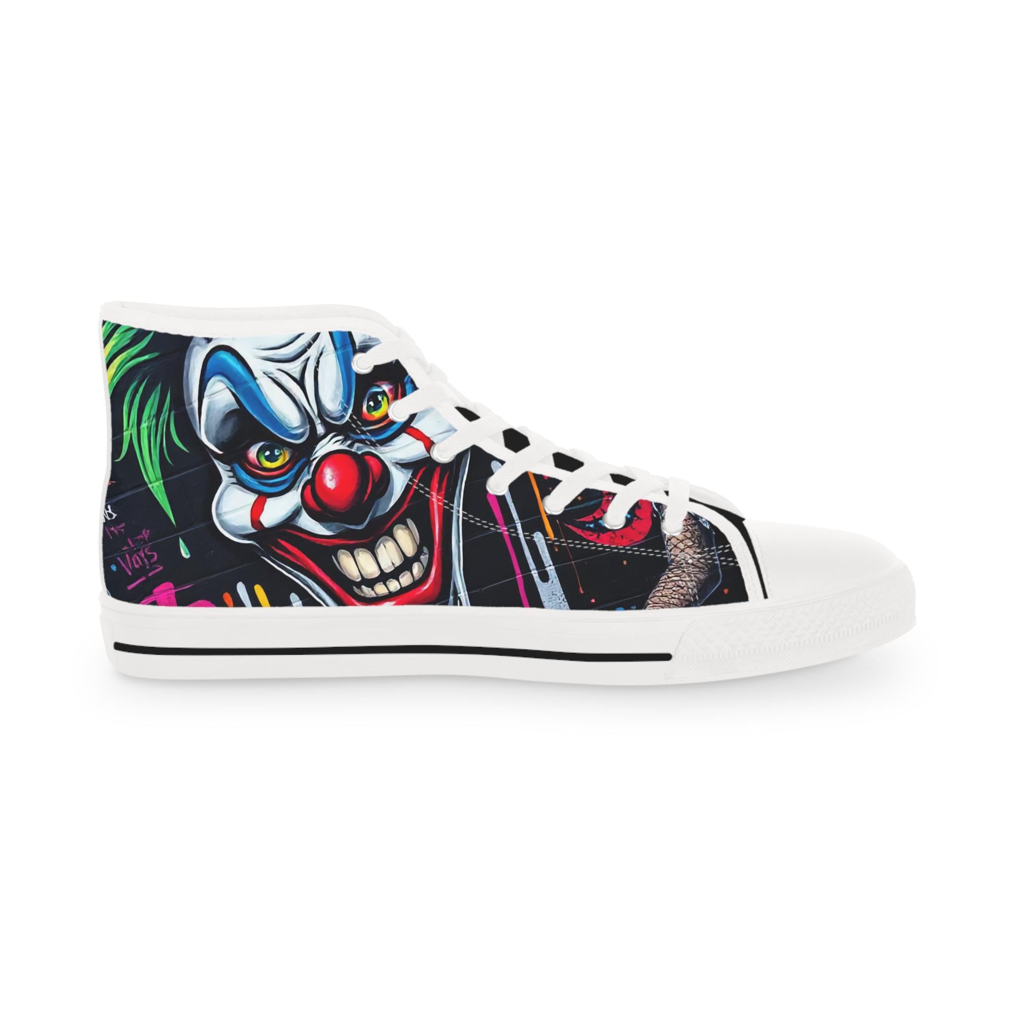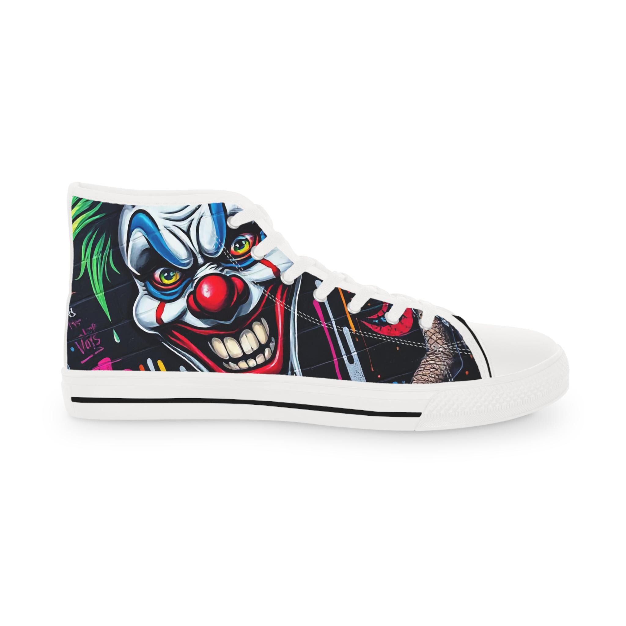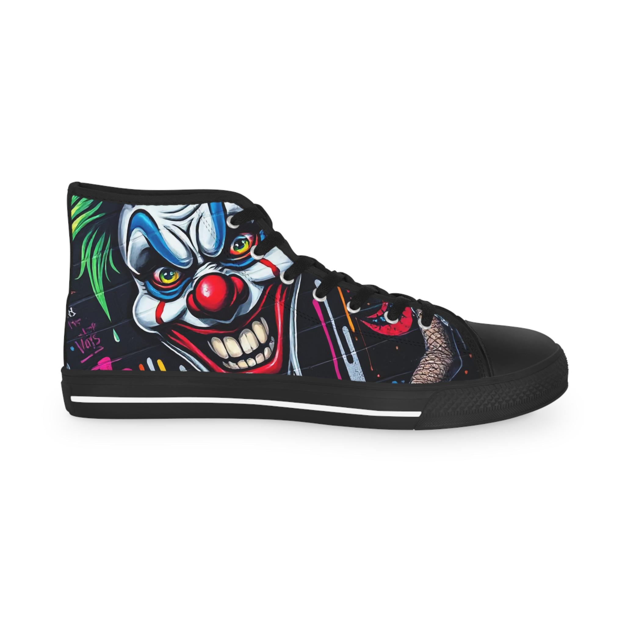 These high-top sneakers bring bold, in-your-face flair to every step. The full-wrap design features a menacing clown face rendered in vivid color—sharp blues, blood-red accents, and shadowed details that peek from the sides and tongue. Built on a breathable polyester canvas with PU leather trims and a pleather toe cap, they balance striking street style with durable construction. EVA memory-foam insoles cushion and absorb shock, while a sturdy rubber outsole keeps traction steady. Metal eyelets and a classic lace-up profile add a familiar, tough look that complements the edgy artwork. Wear them to stand out at late-night shows, skate sessions, or when you want your footwear to do the talking.