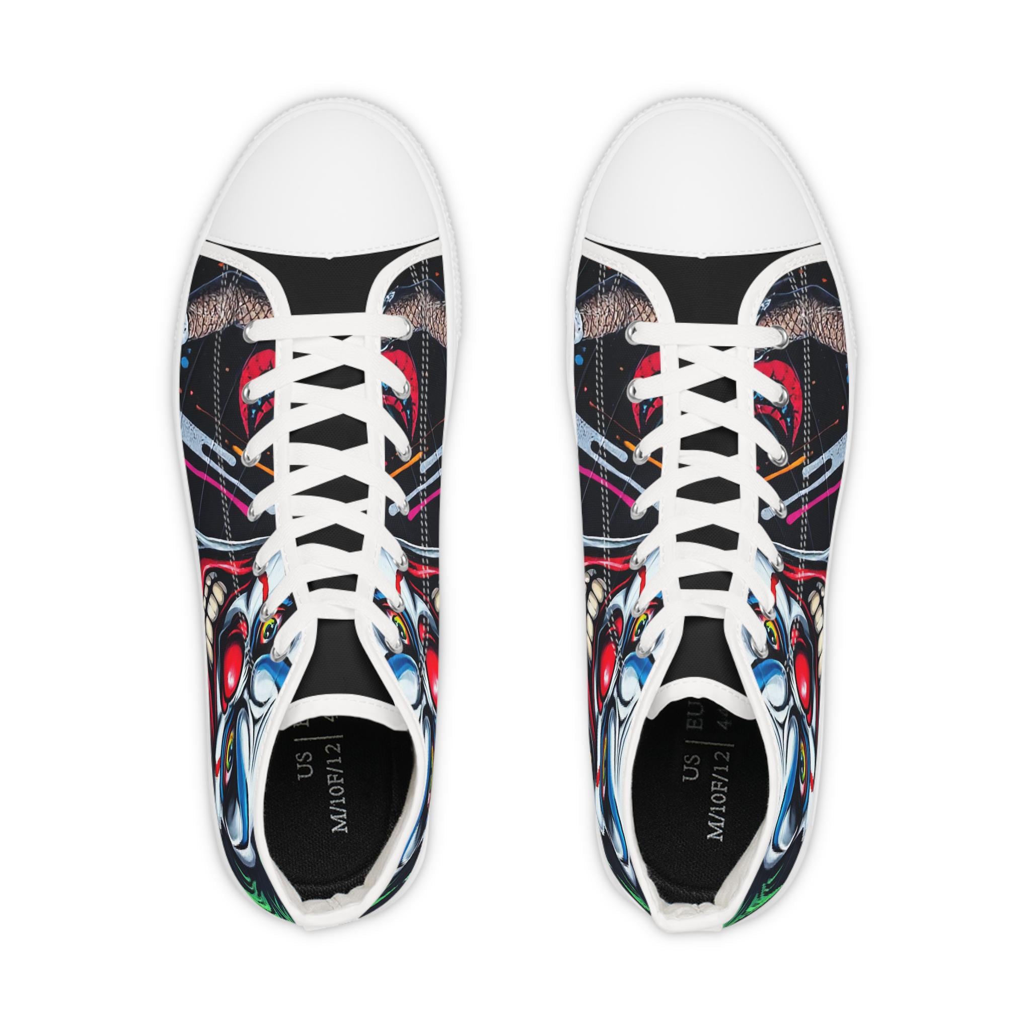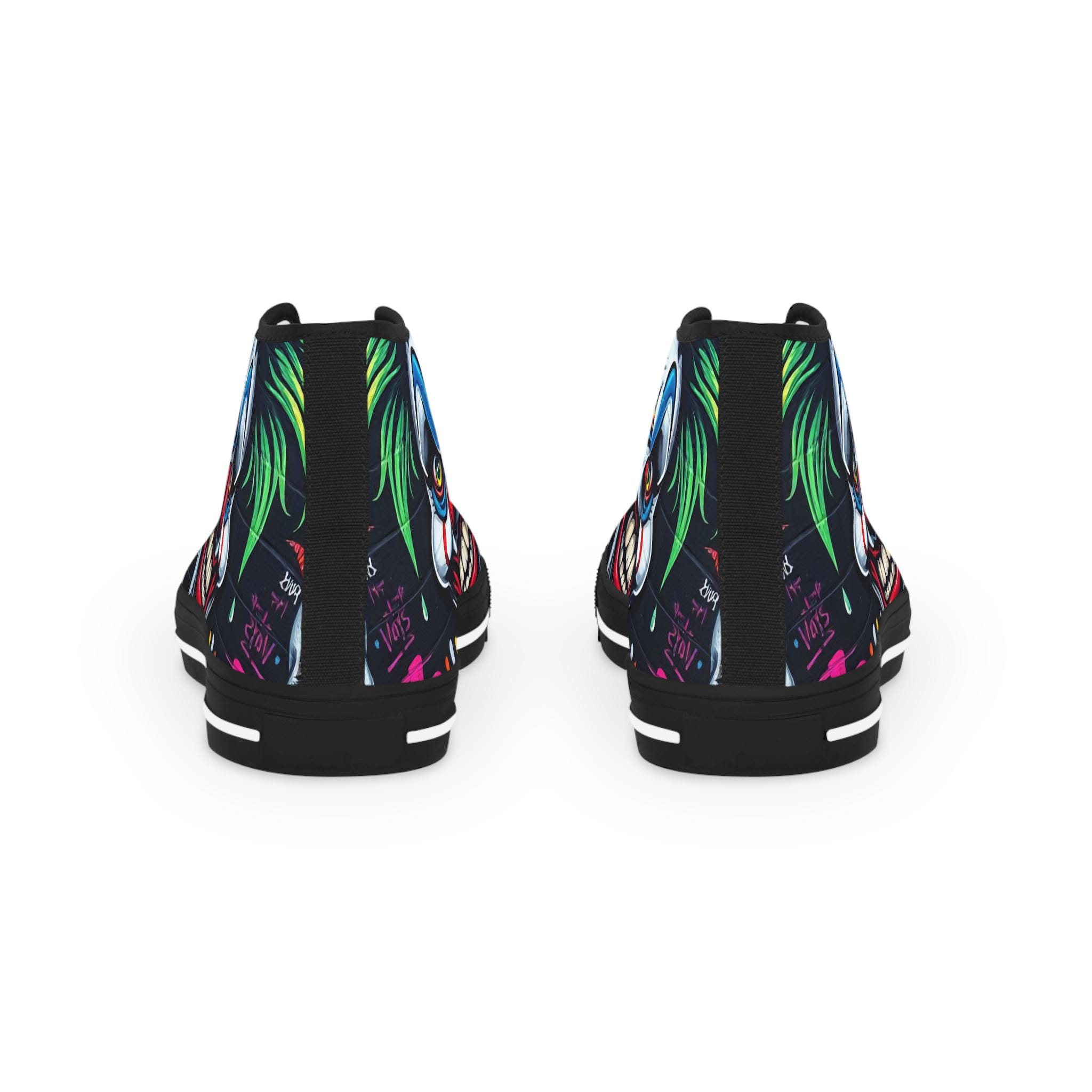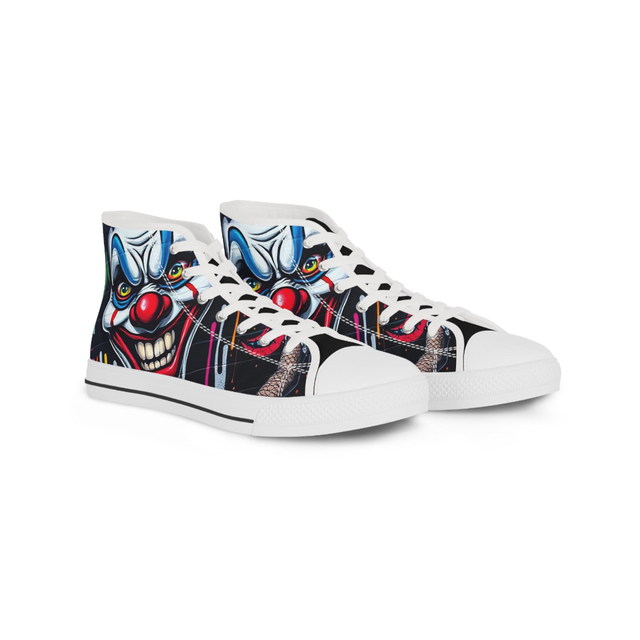 These high-top sneakers bring bold, in-your-face flair to every step. The full-wrap design features a menacing clown face rendered in vivid color—sharp blues, blood-red accents, and shadowed details that peek from the sides and tongue. Built on a breathable polyester canvas with PU leather trims and a pleather toe cap, they balance striking street style with durable construction. EVA memory-foam insoles cushion and absorb shock, while a sturdy rubber outsole keeps traction steady. Metal eyelets and a classic lace-up profile add a familiar, tough look that complements the edgy artwork. Wear them to stand out at late-night shows, skate sessions, or when you want your footwear to do the talking.