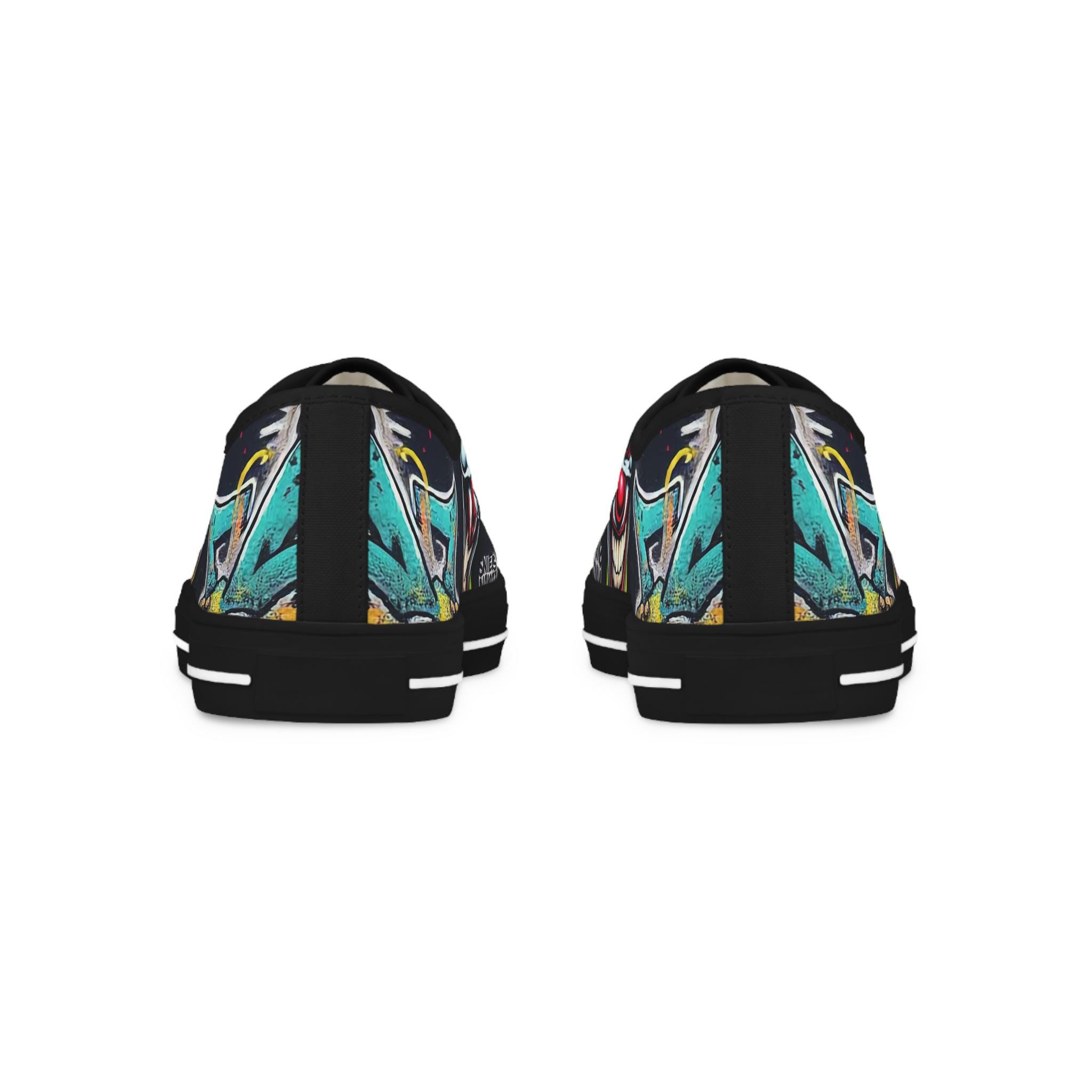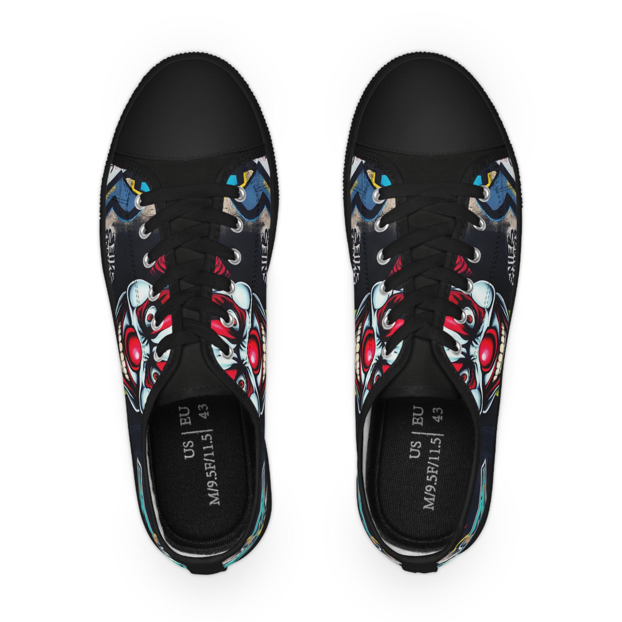 Low-top canvas sneakers that wear like a statement. Dark, detailed clown artwork wraps the sides and tongue, giving these shoes an edgy, streetwise vibe that suits nights out, skate sessions, or adding attitude to an everyday outfit. The padded memory-foam insole and EVA shock layer keep each step surprisingly cushioned, while pleather-reinforced toes and metal eyelets add long-wearing toughness. They run slightly large — size down if you prefer a snug fit. These sneakers pair well with slim jeans, graphic tees, and layered outerwear for an effortlessly bold look.