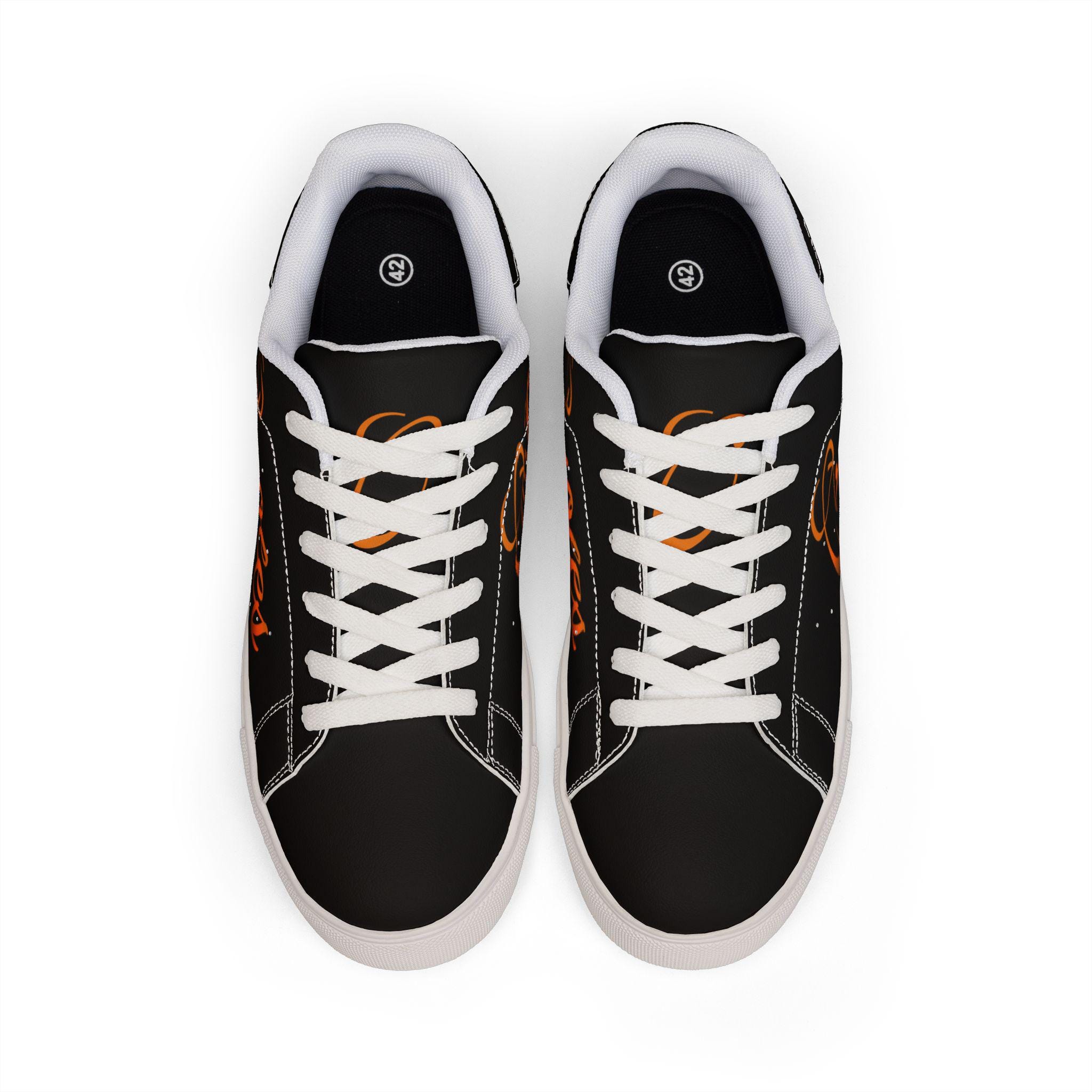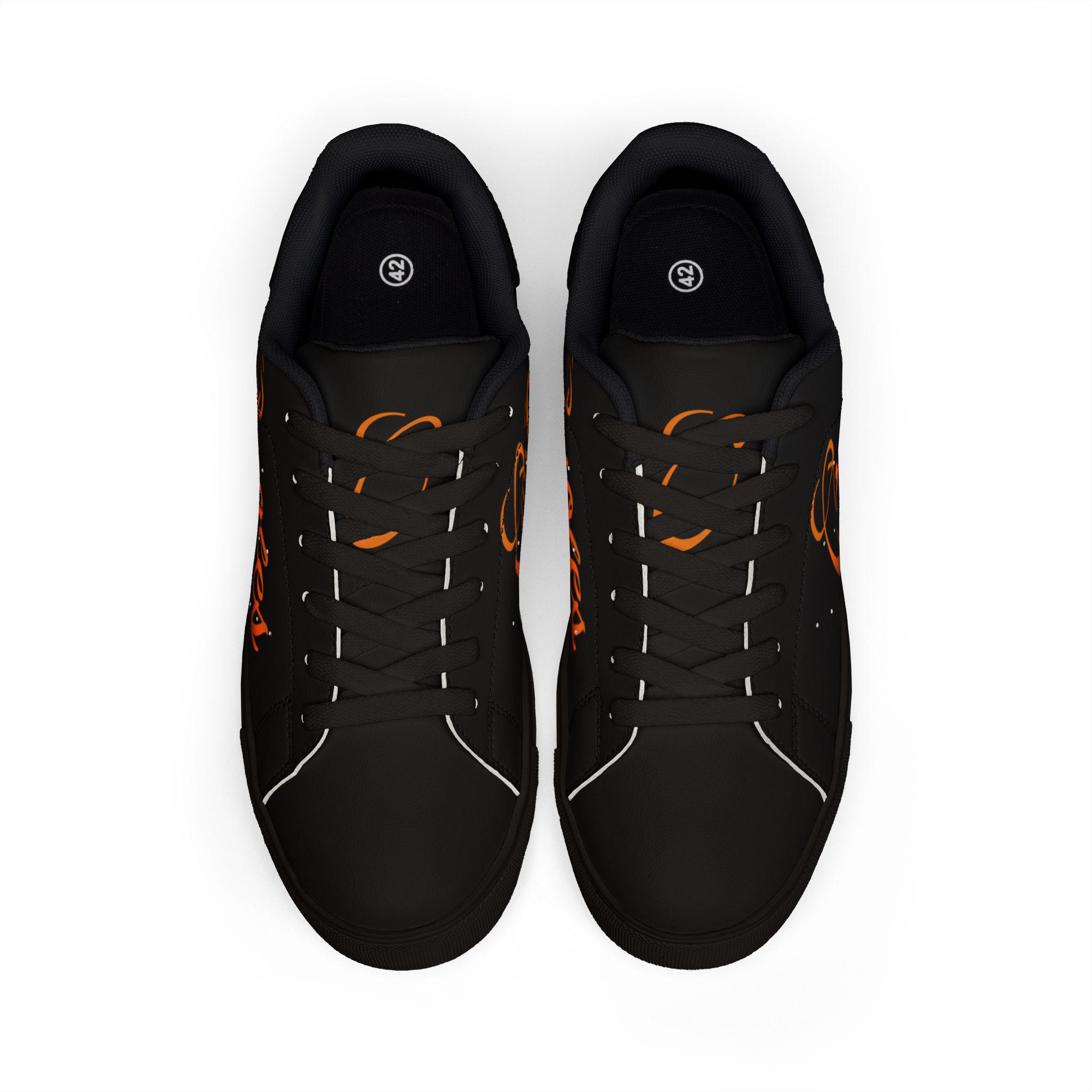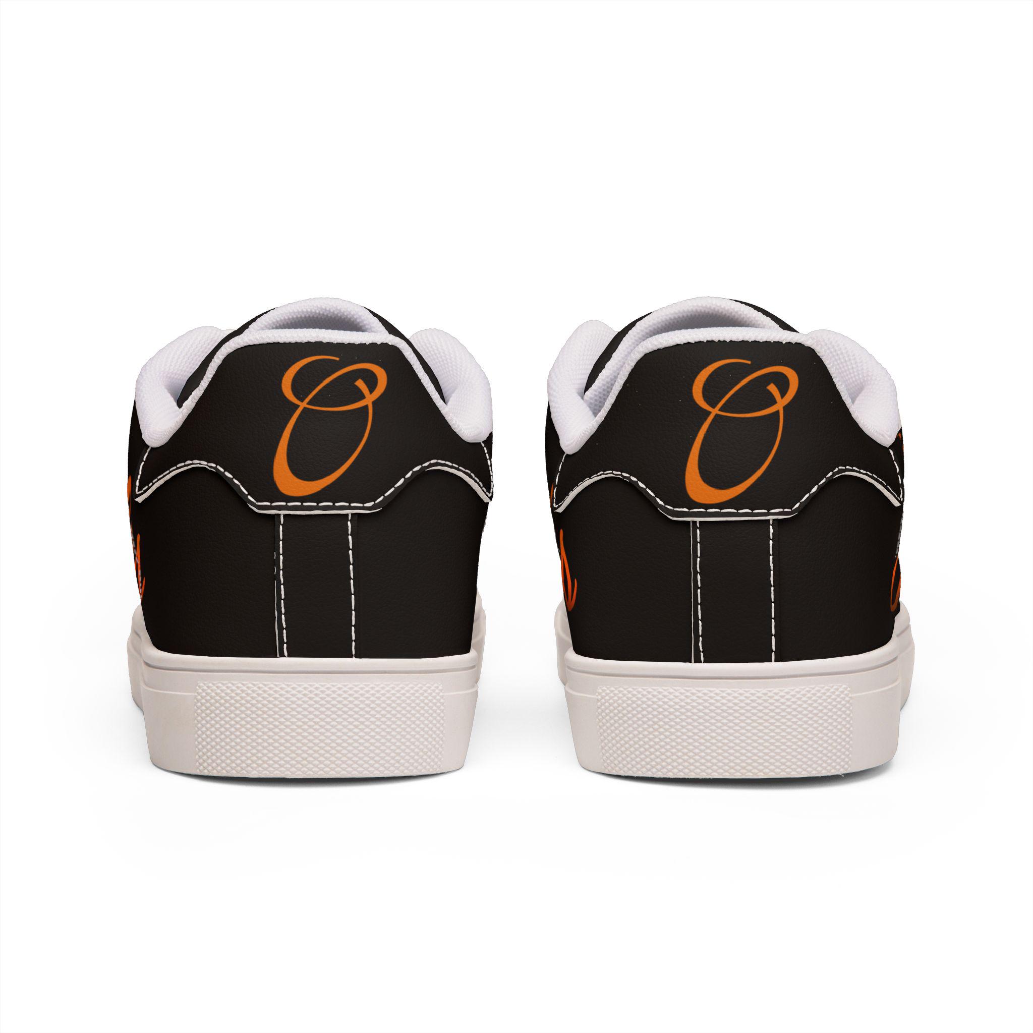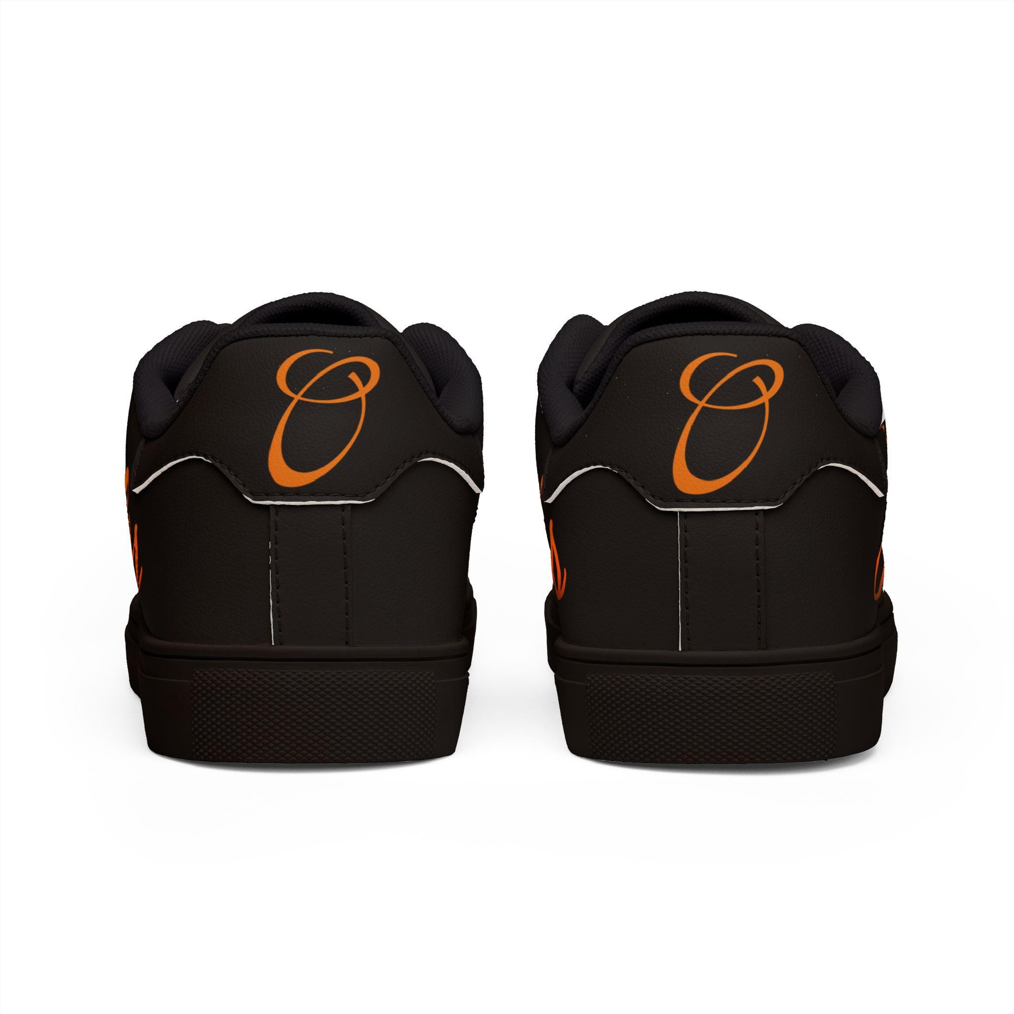 Black low-top sneakers that carry a quiet, confident energy — built to look like leather while keeping everyday wear lightweight and grippy. Smooth microfiber PU uppers take a scripted “Orioles” graphic in warm orange tones, sitting against a deep black canvas that lets the lettering pop. Lace-up construction locks your foot in place for strolls through the neighborhood or game-day walks to the stadium. A rubber outsole with an EVA layer softens each step and improves traction, while contrast stitching ties the silhouette together. Available in a wide size range for adult wearers who want sporty-casual style with a team-spirited accent.