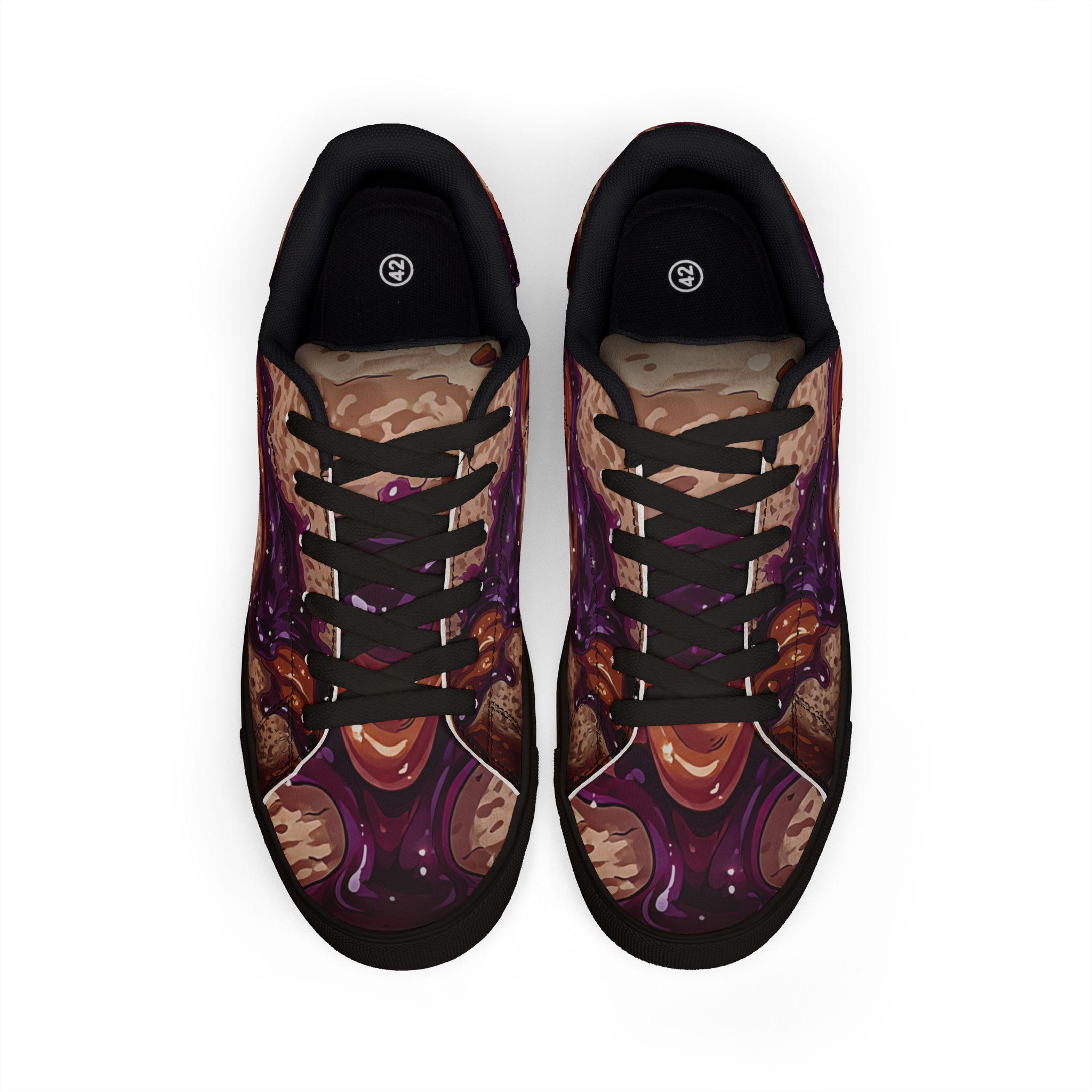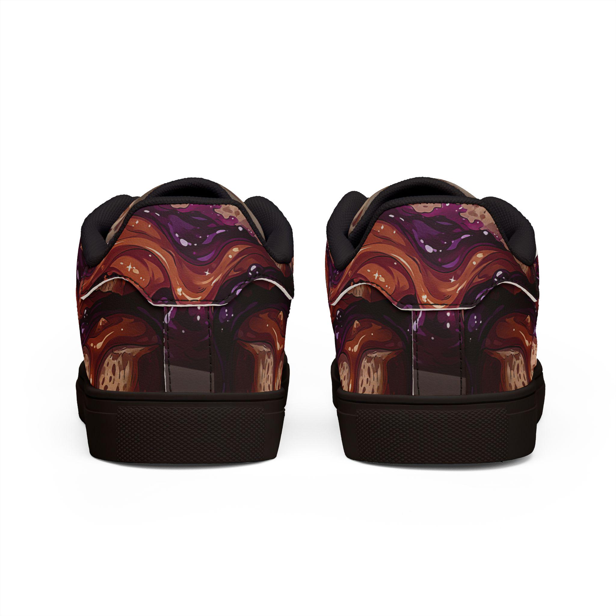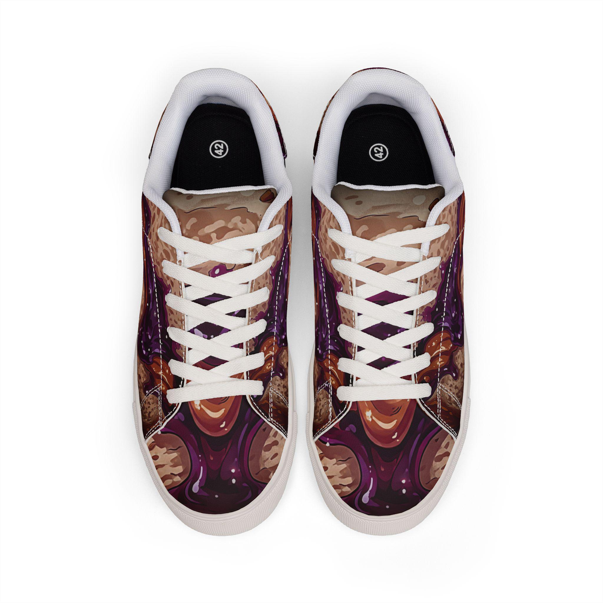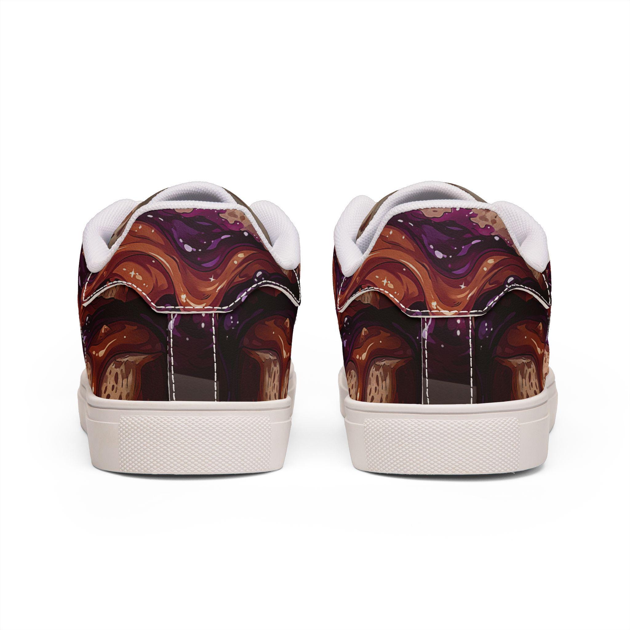 These low-top leather sneakers bring bold, artistic energy to everyday wear. The microfiber PU upper showcases a rich, painterly pattern in deep plums and warm browns that feels both expressive and wearable. A lace-up design keeps your step secure, while the rubber outsole with an EVA layer cushions each stride. They sit low on the ankle for a relaxed silhouette that pairs with cropped jeans, worn-in chinos, or layered streetwear. Wear them when you want your footwear to start conversations — whether wandering through a weekend market, heading to an indie gallery opening, or adding edge to a casual night out. The detailed stitching and color-contrasted sole options add subtle craftsmanship that complements the artwork across the whole shoe.