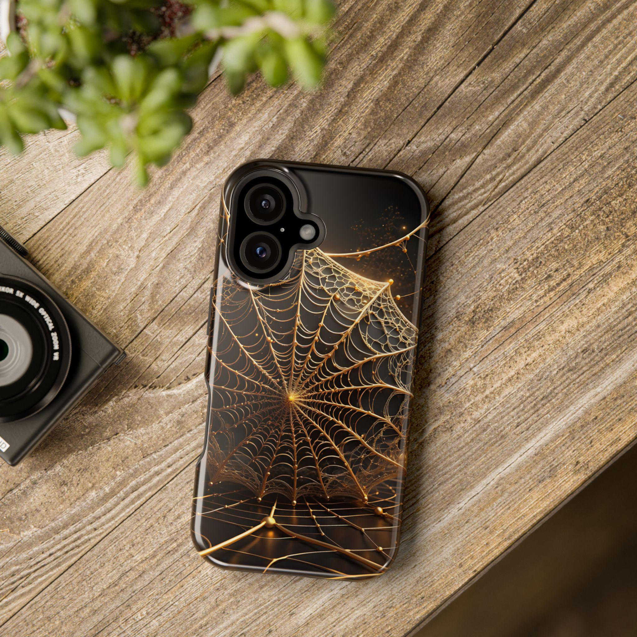 This magnetic, impact-resistant phone case blends protective performance with a moody, intricate design. The deep black background and shimmering gold web pattern catch light like a city at night, giving the case an artful, slightly mysterious feel. Built with a rigid polycarbonate shell and a cushioned TPU liner, it absorbs shocks and shields edges without adding bulk. The embedded magnet ring keeps MagSafe® accessories aligned for easier charging and attachments. Choose glossy for a reflective, jewel-like finish or matte for a satin, low-glare look. Lightweight and durable, this case slips into daily life — from late-night walks to crowded commutes — while reflecting a taste for craftsmanship and subtle drama.