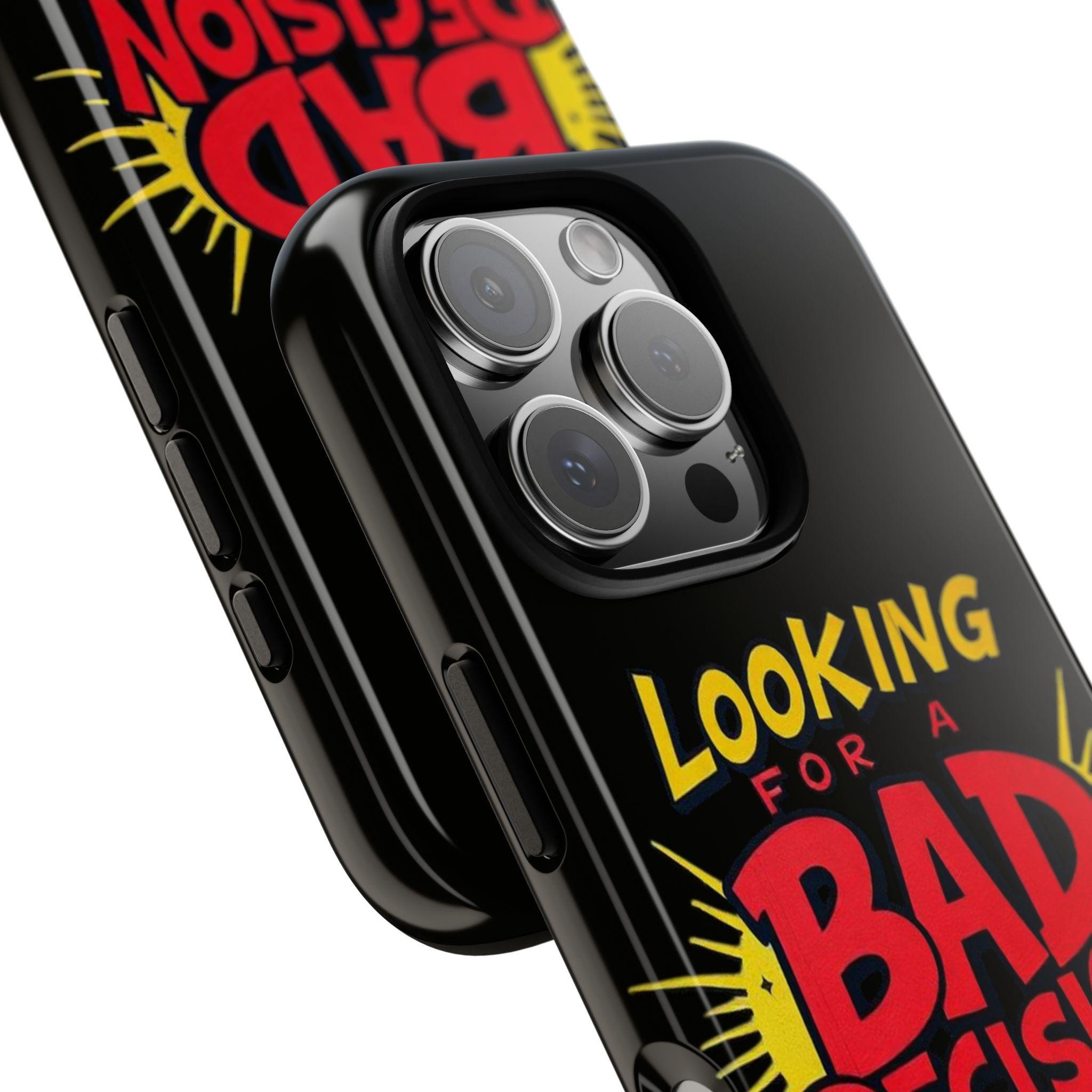 A slim, tough phone case that brings attitude and protection to your everyday carry. Bold retro lettering pops against a deep matte black background: “Looking for a Bad Decision” reads like a dare, playful and unapologetic. The dual-layer build and silicone liner absorb shocks so your phone survives the slips, drops, and small adventures that come with city nights and weekend escapes. Finished with a high-density 3D wrap and UV-resistant inks, the graphic stays vivid even after sun-soaked days. Clear port openings keep connectivity hassle-free and wireless charging works without removing the case. This case fits into the life of someone who moves fast, laughs loud, and doesn’t take themselves too seriously—carry that energy wherever you go.