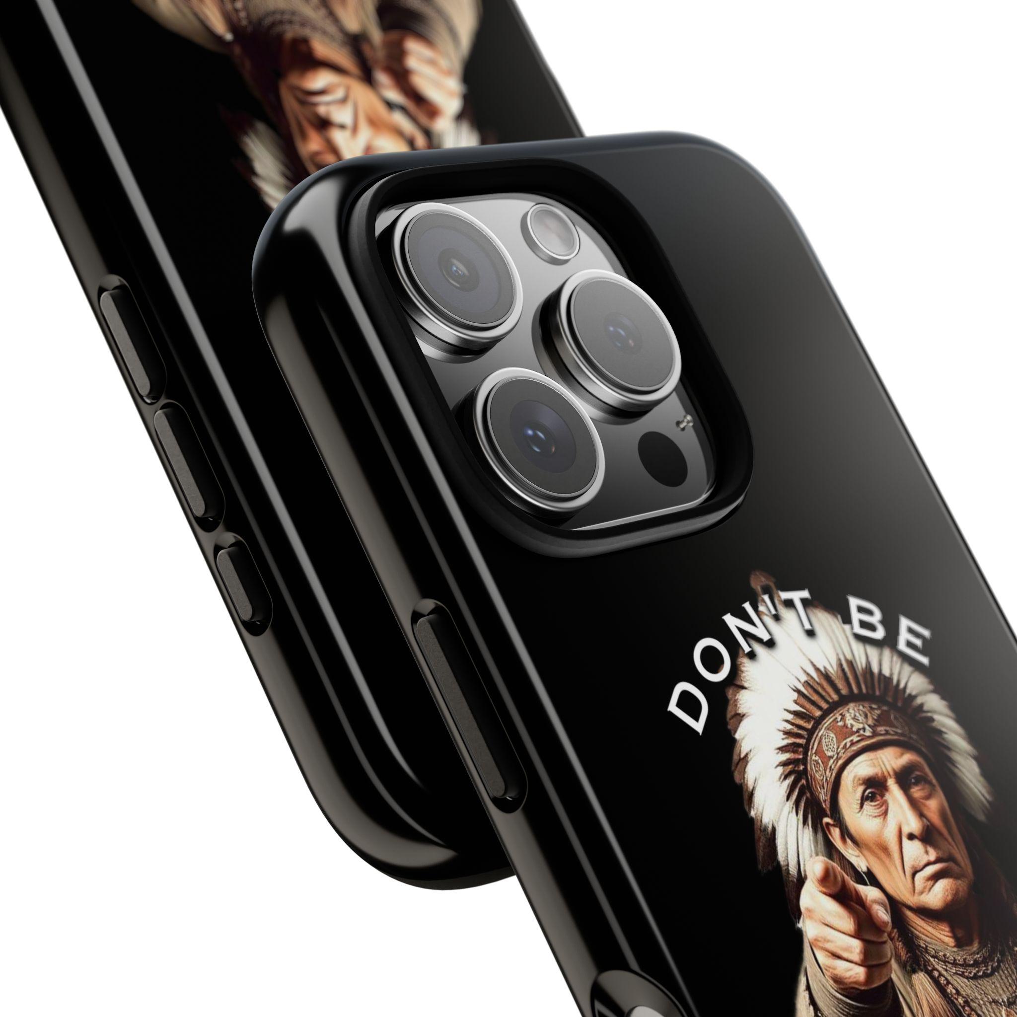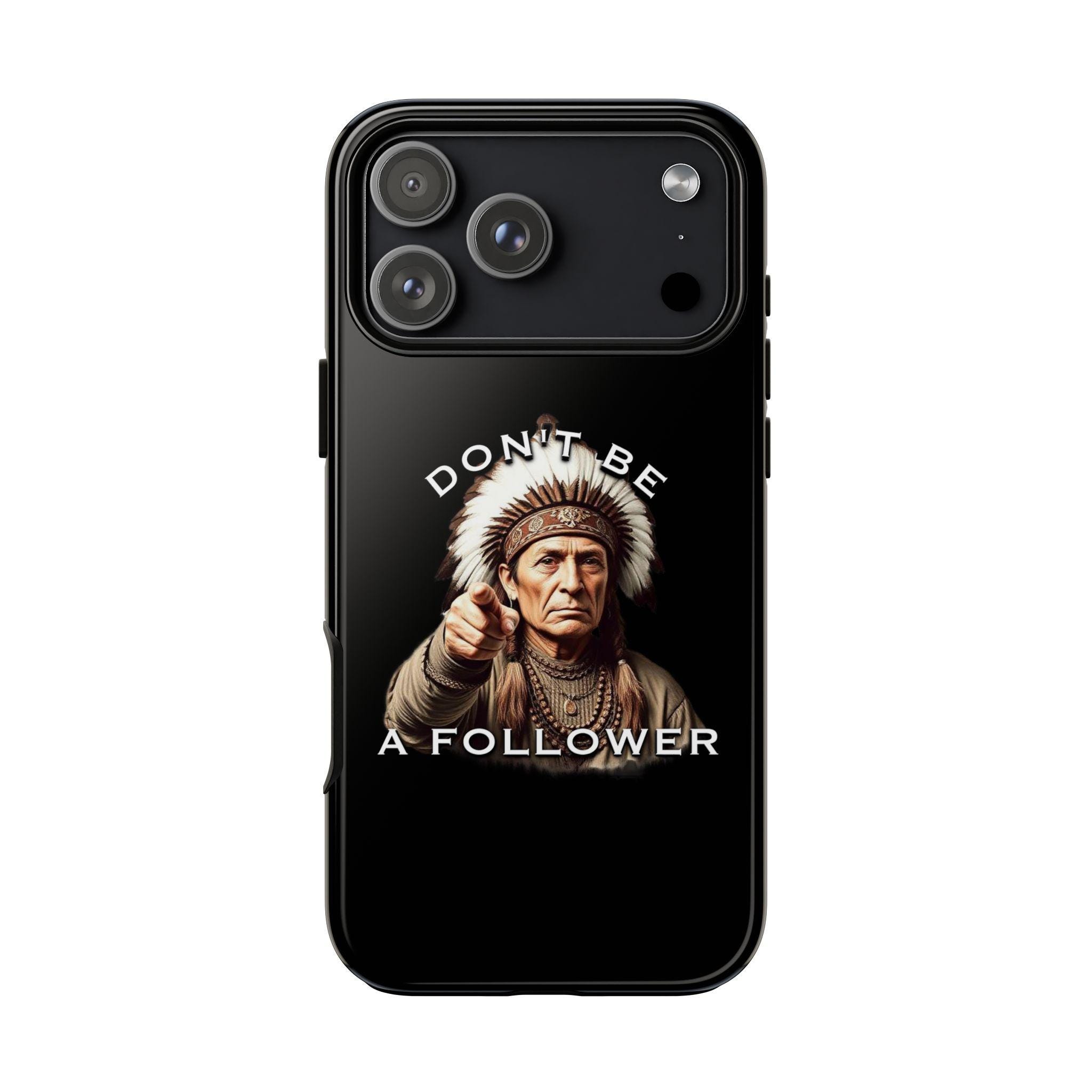 A rugged protective phone case with a bold, vintage-inspired graphic — an elder chief pointing forward beneath the phrase “DON’T BE A FOLLOWER.” The dual-layer shell (polycarbonate exterior + TPU silicone liner) absorbs shocks while keeping a slim profile. Full-coverage 3D wrap printing preserves the design’s depth and contrast, and UV protection helps maintain color outdoors. Clear port openings and wireless-charging compatibility keep daily use effortless. This case feels strong and purposeful — it’s for someone who carries conviction and wants their phone to reflect that quiet confidence.