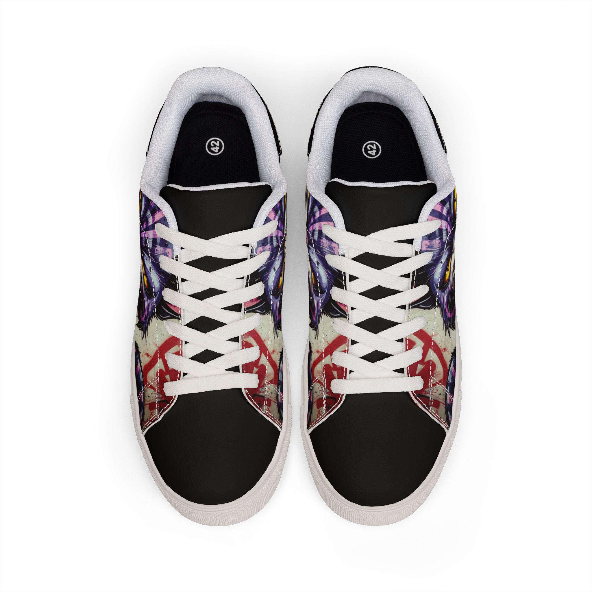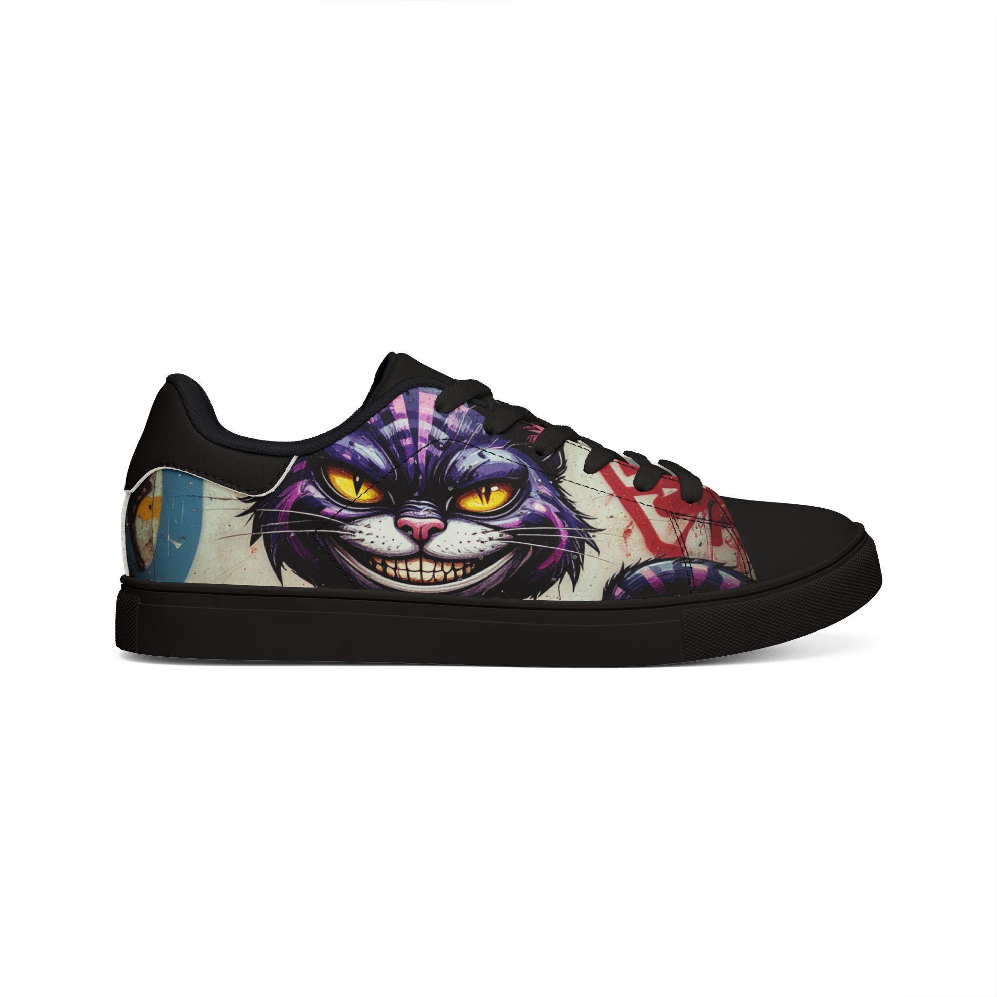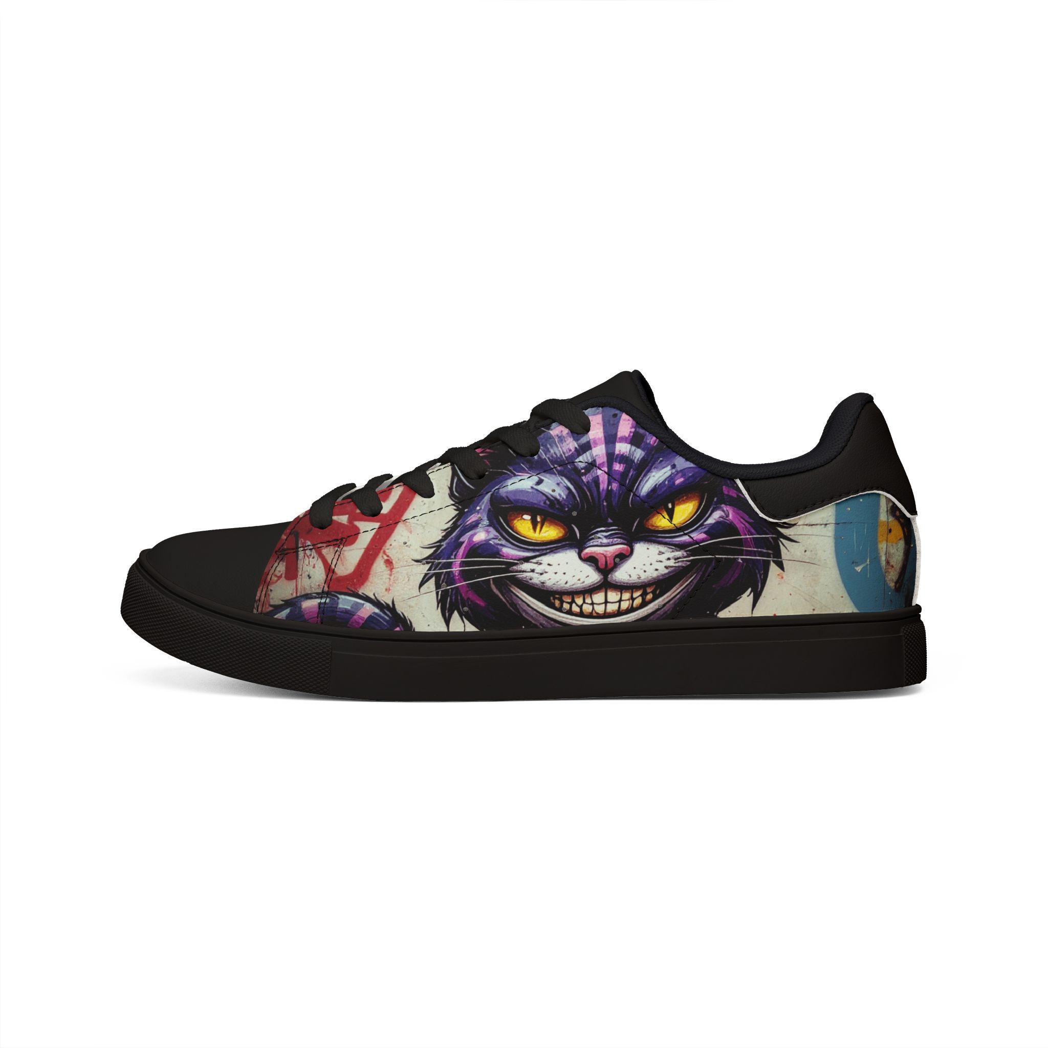Step into a little bit of mischief and a lot of personality. These low-top leather sneakers take a bold, illustrated Cheshire-cat face and turn it into wearable attitude—bright yellow eyes, a crooked grin, and vivid graffiti accents wrap around the sides for a street-ready look. Lightweight microfiber leather gives a smooth, leather-like finish while the EVA-cushioned rubber sole keeps each step springy and sure. They feel casual and confident: pair them with rolled jeans, a leather jacket, or your favorite band tee for days when you want your footwear to do the talking. Built to last and easy to style, they blend quirky art with everyday comfort so you can roam, explore, and stir up smiles wherever you go.