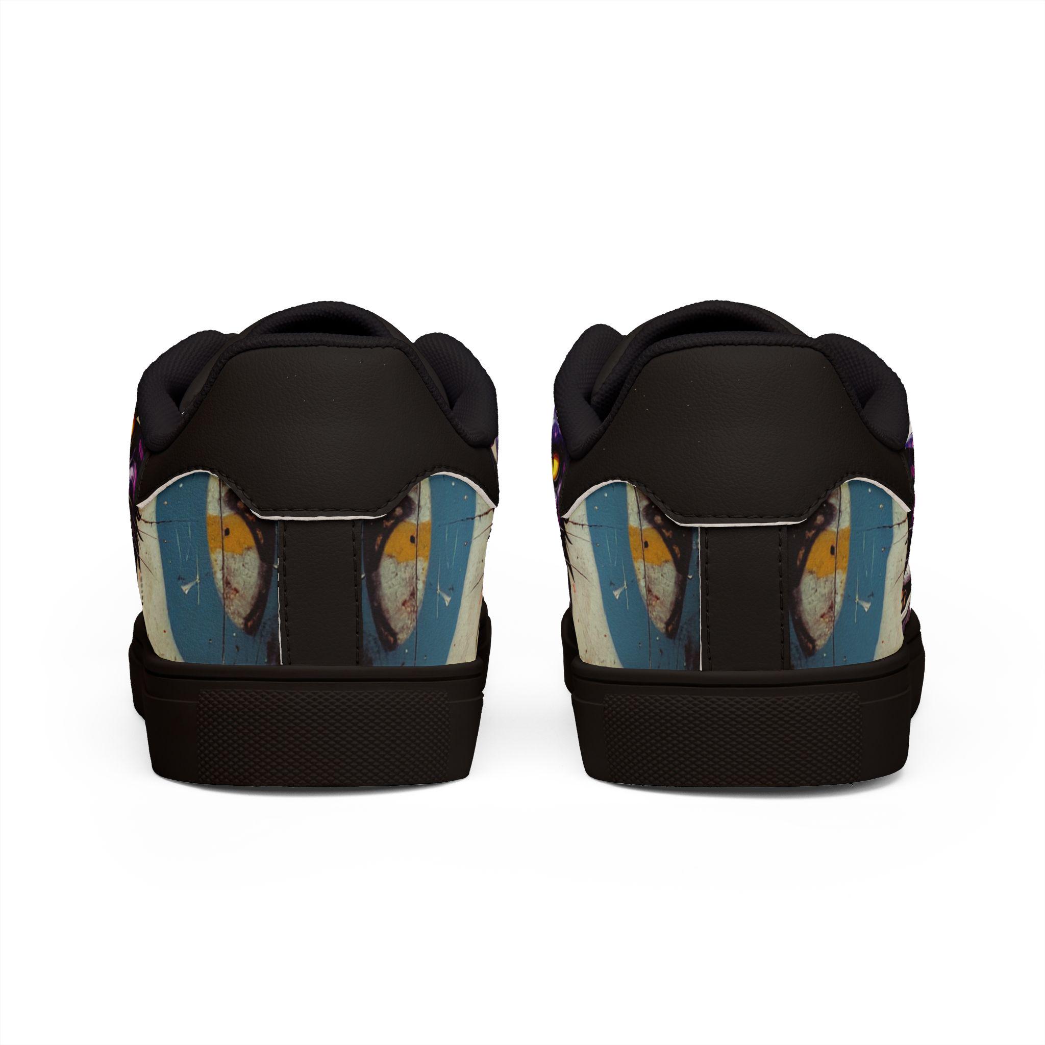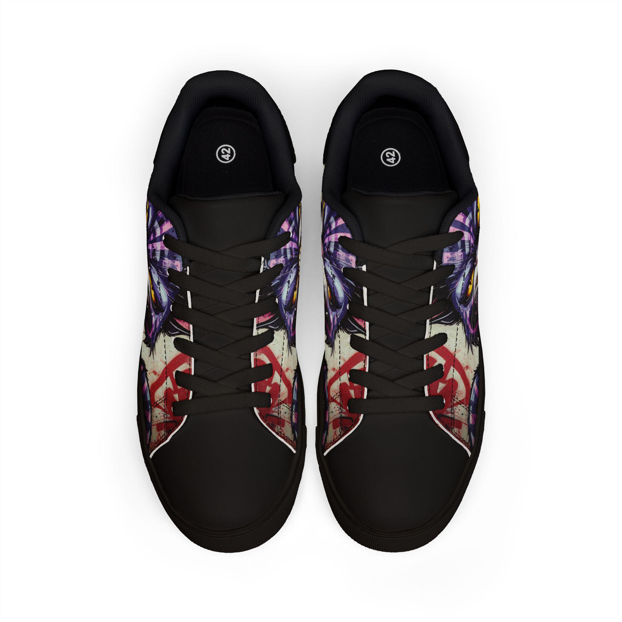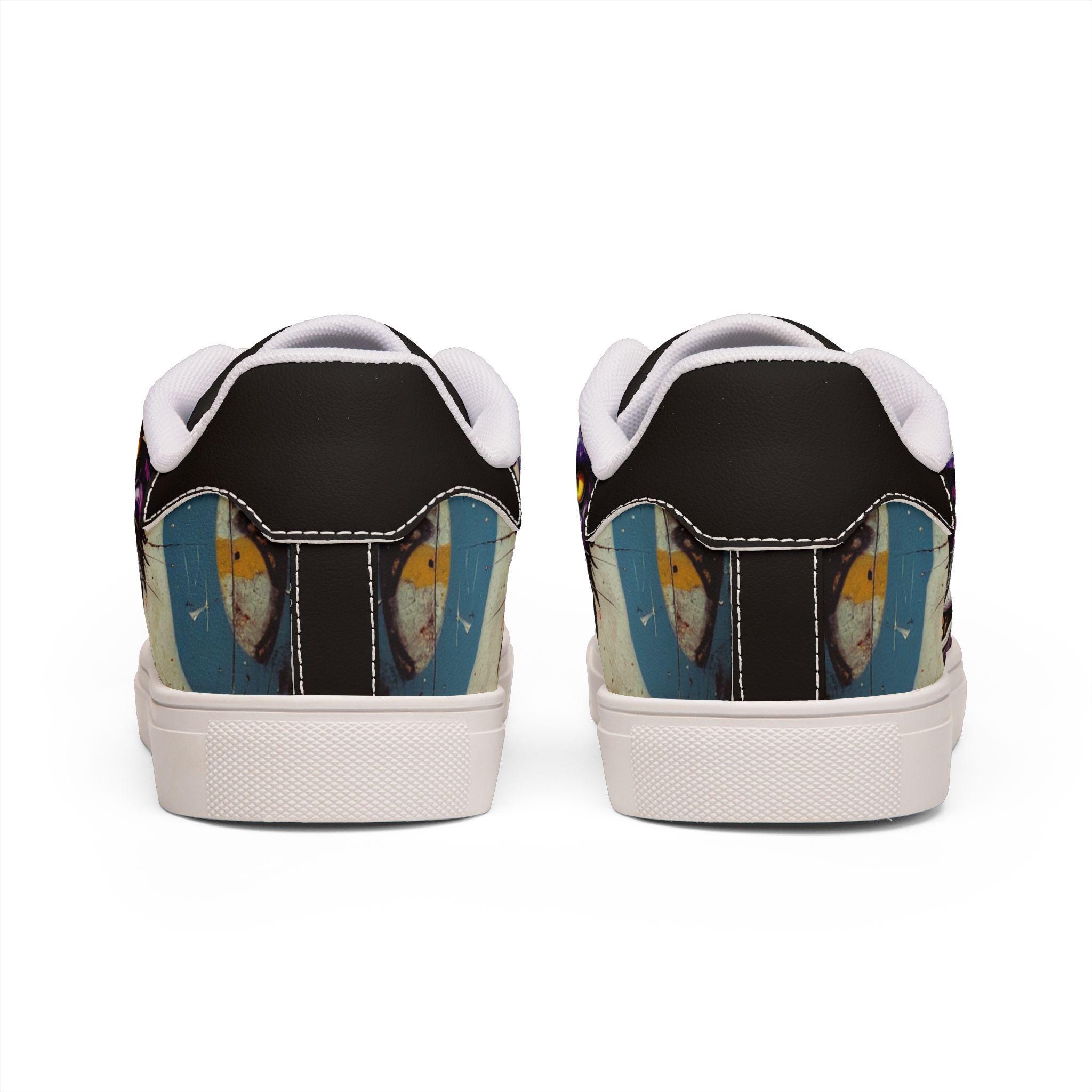 Step into a little bit of mischief and a lot of personality. These low-top leather sneakers take a bold, illustrated Cheshire-cat face and turn it into wearable attitude—bright yellow eyes, a crooked grin, and vivid graffiti accents wrap around the sides for a street-ready look. Lightweight microfiber leather gives a smooth, leather-like finish while the EVA-cushioned rubber sole keeps each step springy and sure. They feel casual and confident: pair them with rolled jeans, a leather jacket, or your favorite band tee for days when you want your footwear to do the talking. Built to last and easy to style, they blend quirky art with everyday comfort so you can roam, explore, and stir up smiles wherever you go.