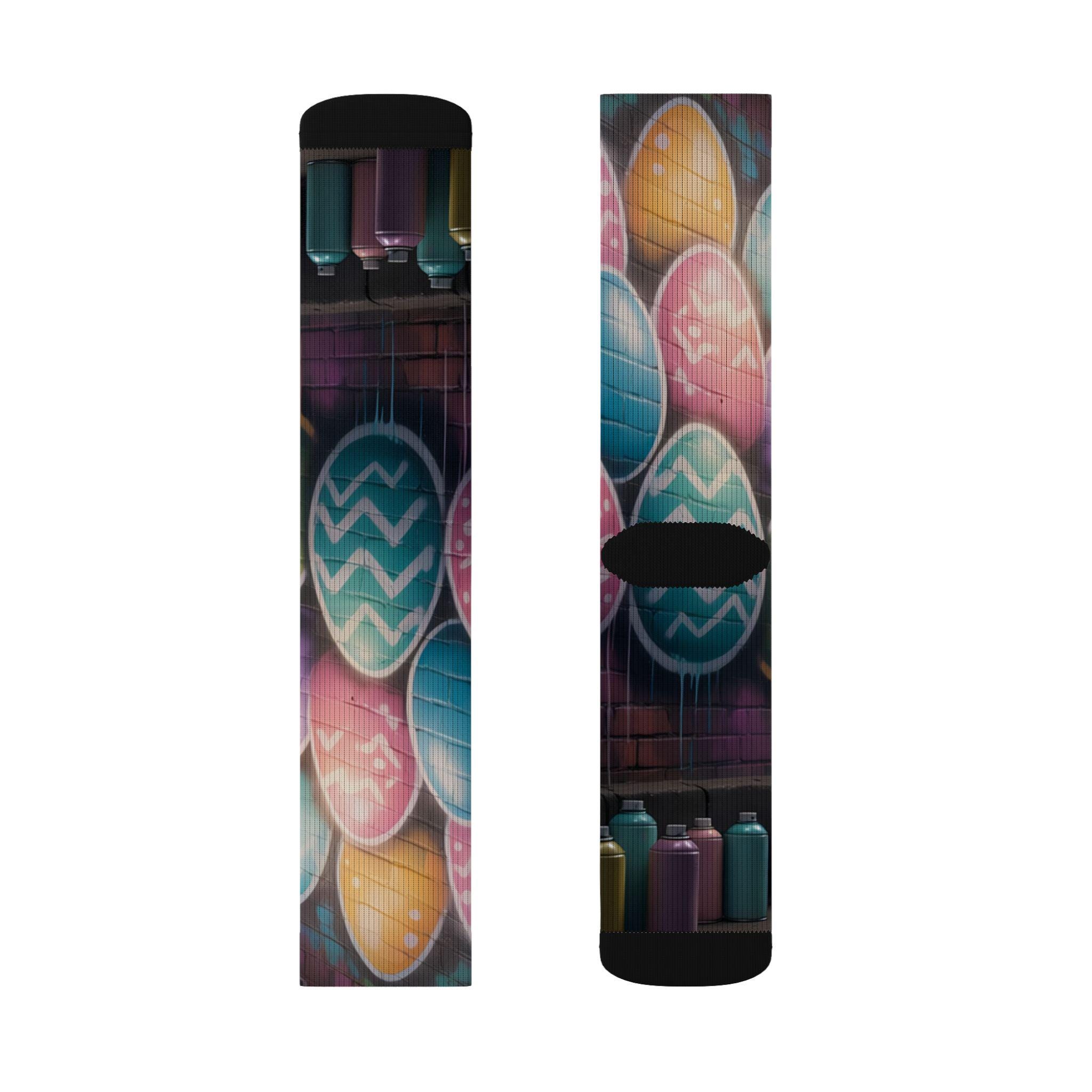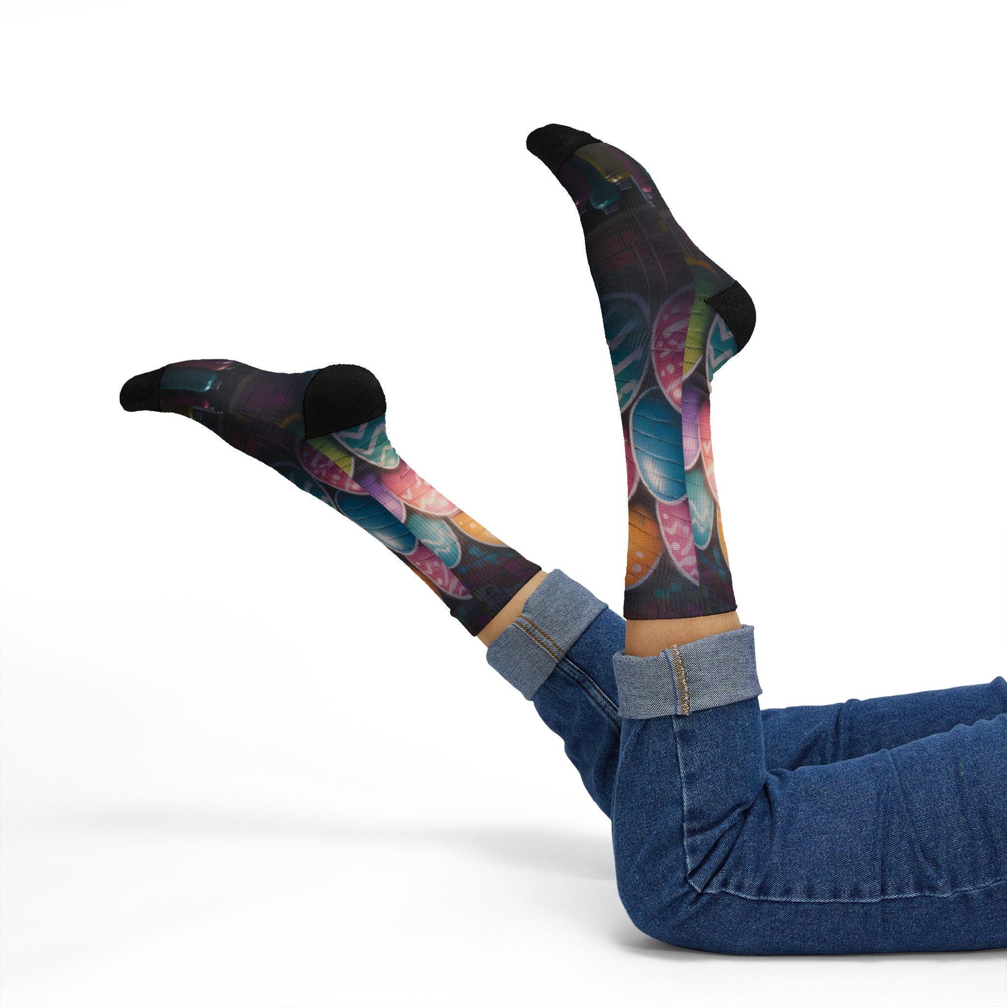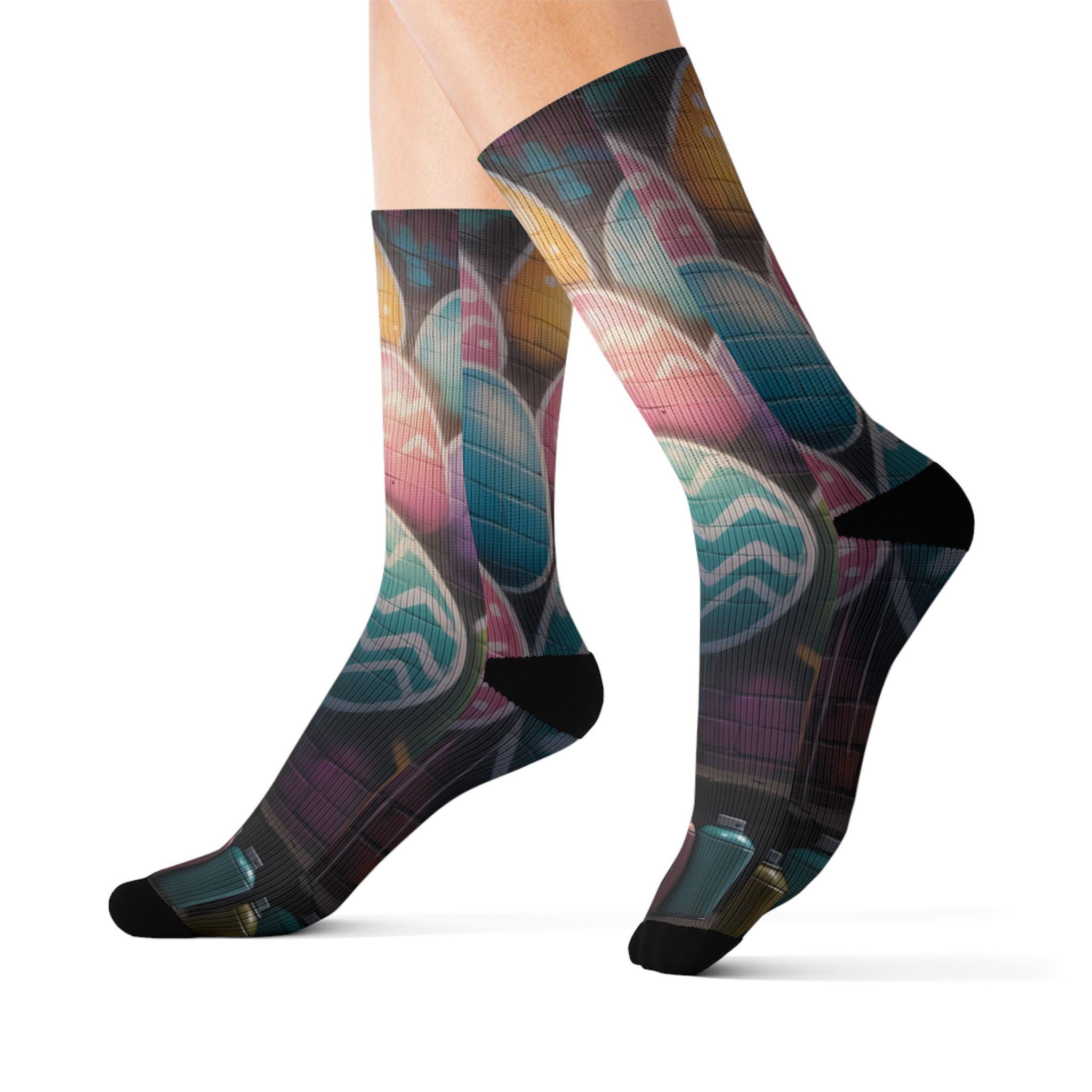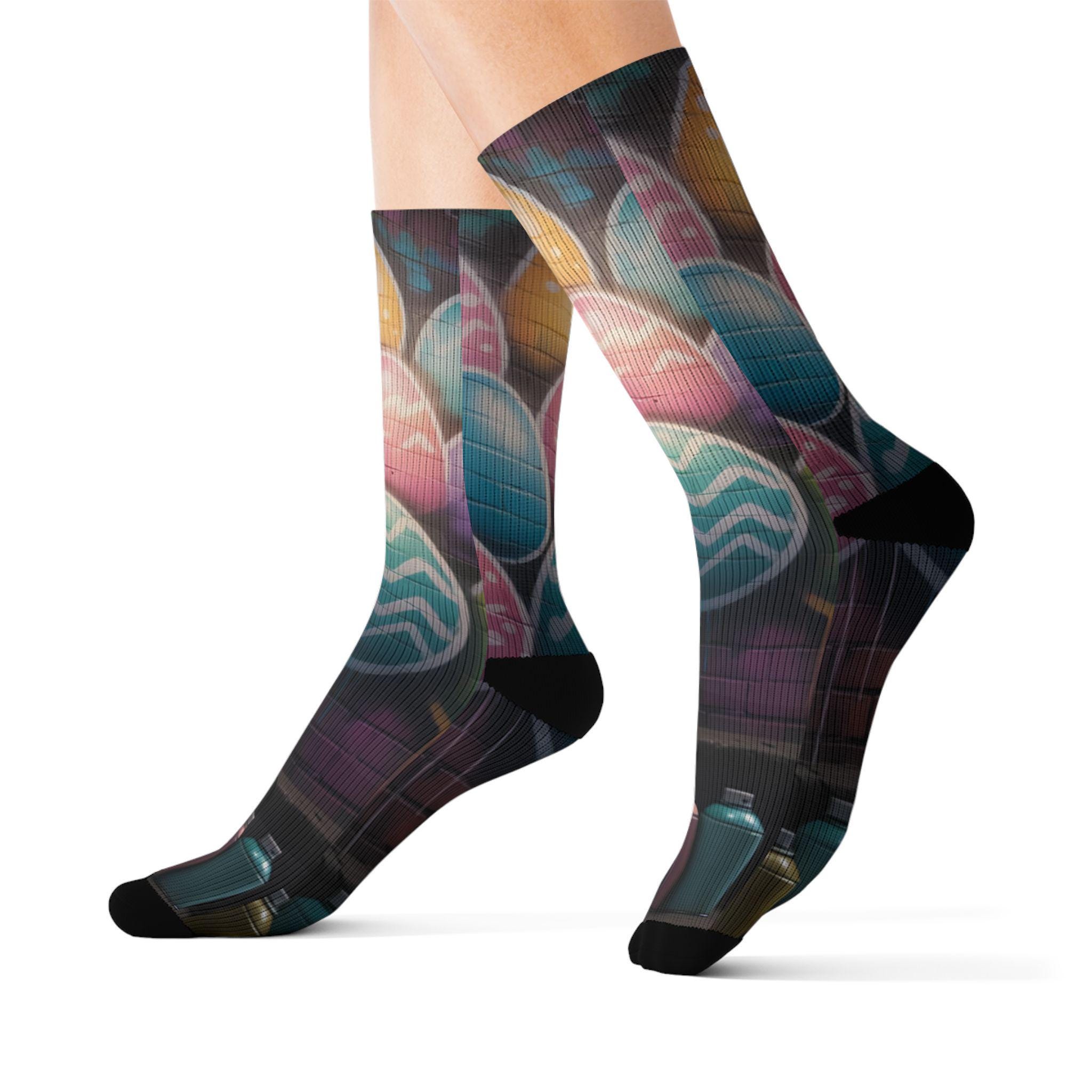 These crew-length sublimation socks bring a playful, color-splashed vibe to everyday wear. Soft fleece lines the sole for warmth and comfort, while cushioned bottoms and a ribbed tube keep the fit snug without squeezing. The all-over print runs edge-to-edge with vibrant chalkboard-style eggs and paint bottles, giving the socks an artsy, hands-on feel that looks great with rolled-up jeans or layered under boots. Lightweight stretch (95% polyester, 5% spandex) lets them move with you—whether you’re sketching in a studio, running errands, or settling in for a cozy craft night. Note: sublimation printing may show slight color shifts at side seams.