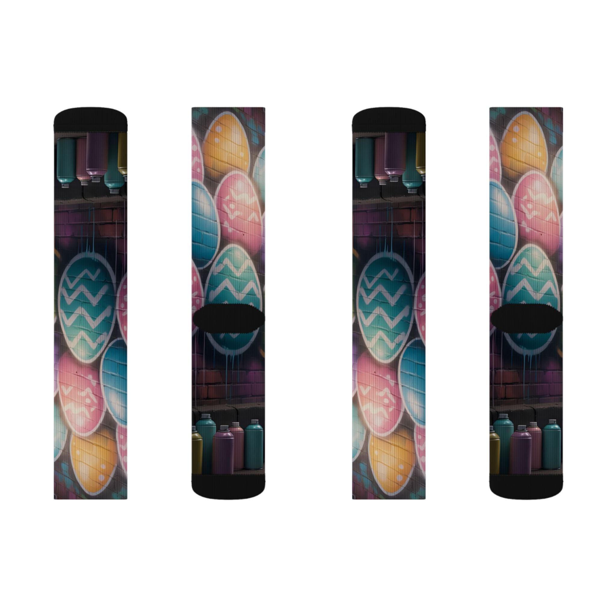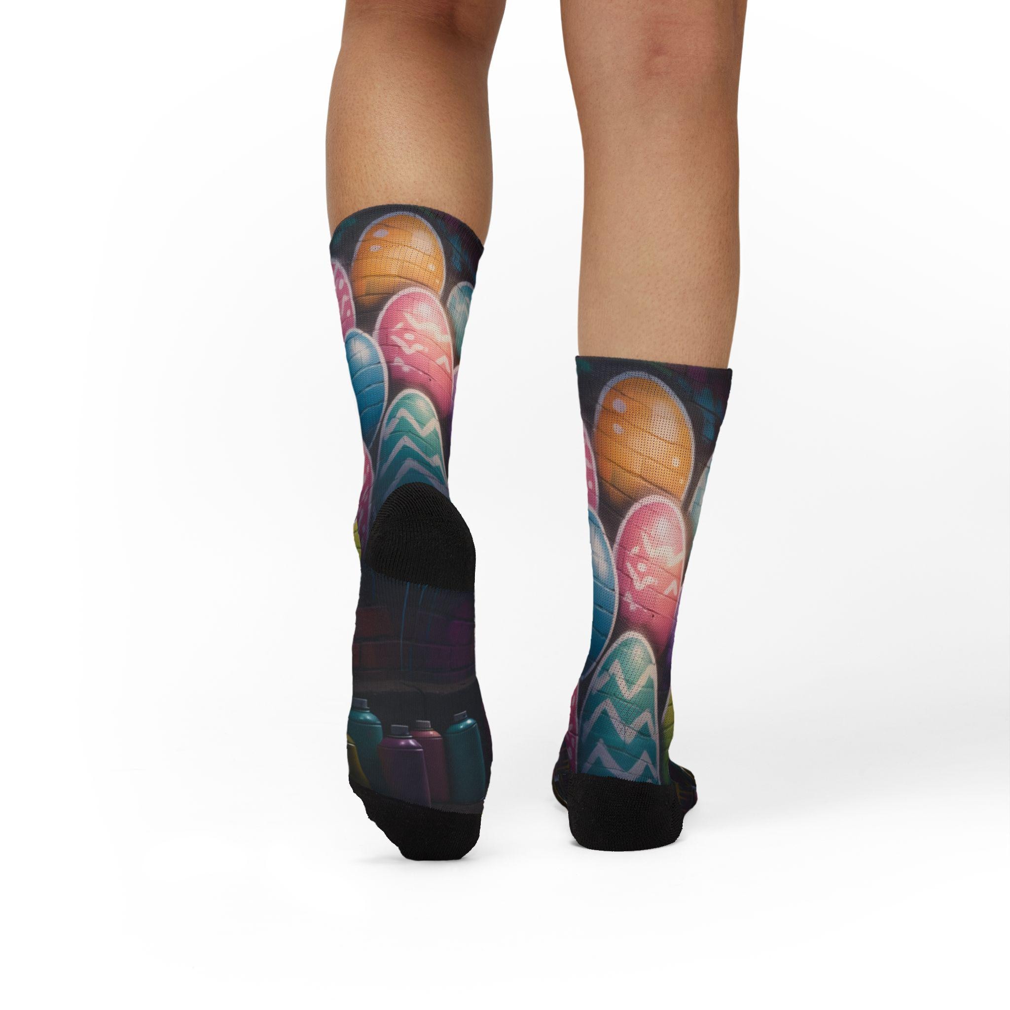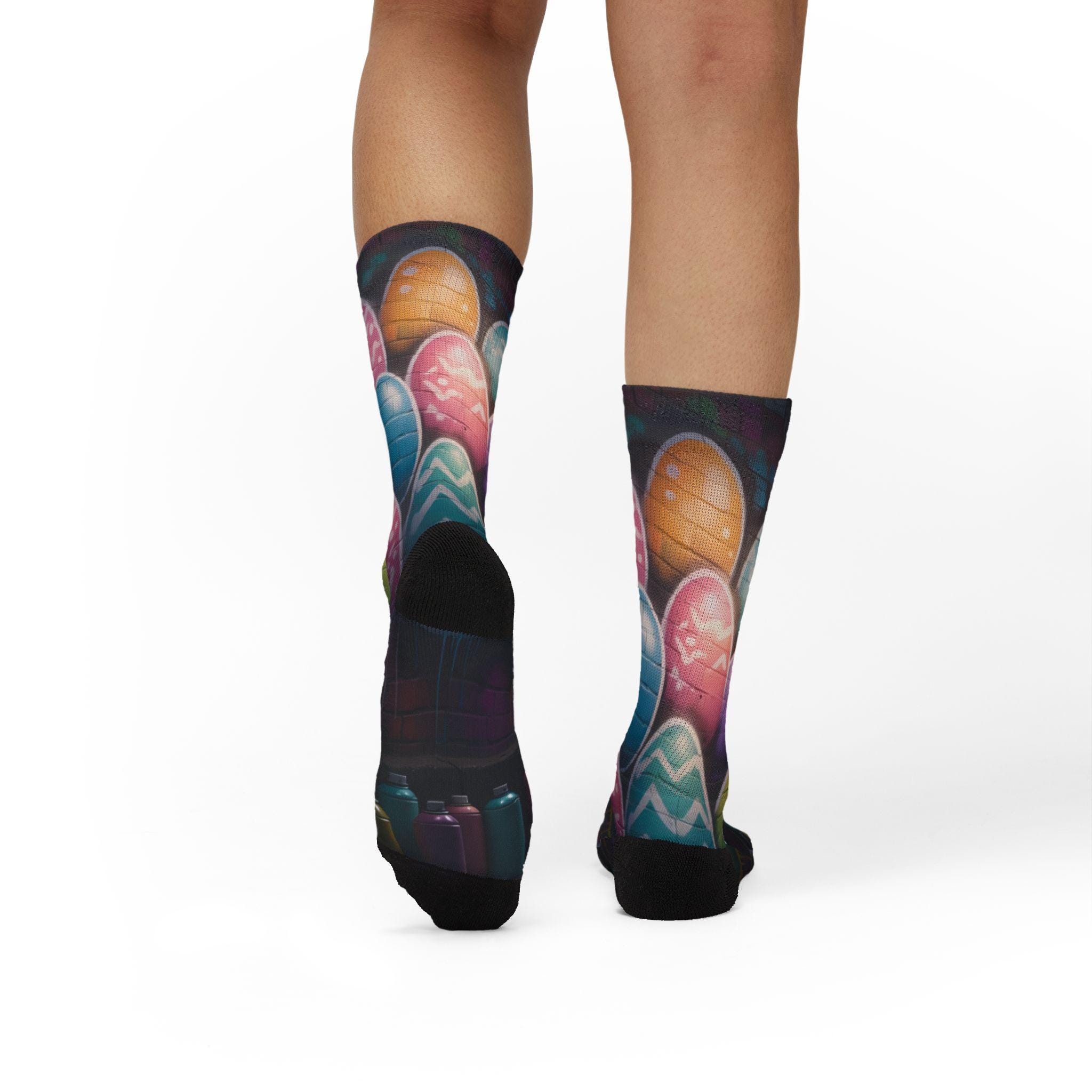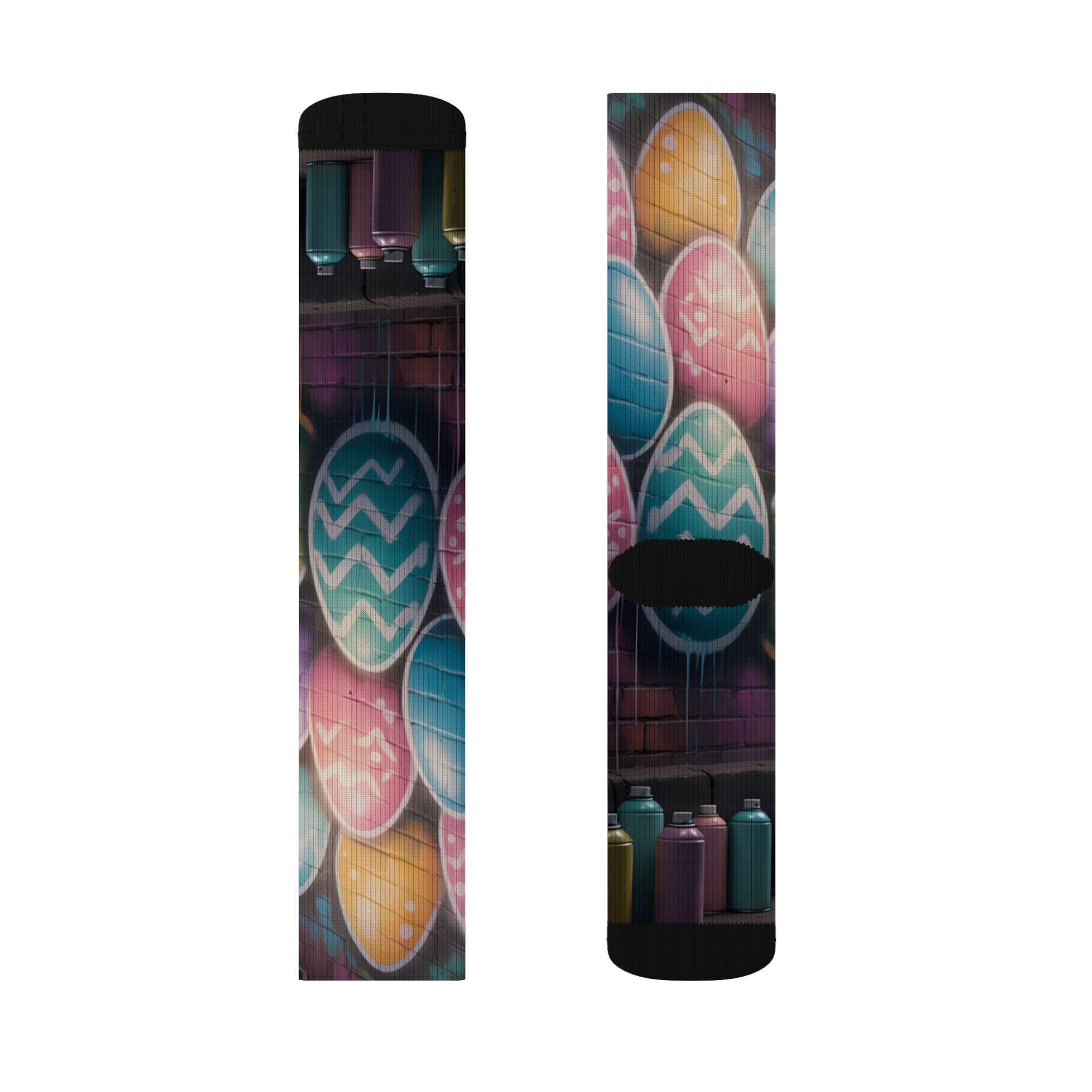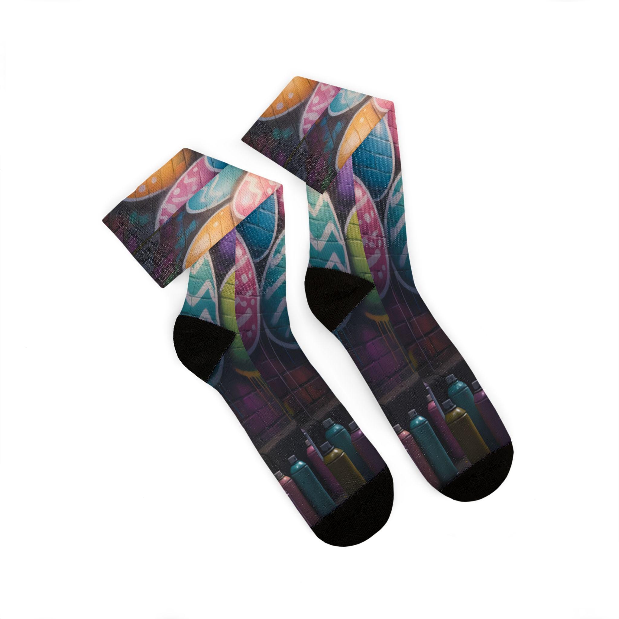 These crew-length sublimation socks bring a playful, color-splashed vibe to everyday wear. Soft fleece lines the sole for warmth and comfort, while cushioned bottoms and a ribbed tube keep the fit snug without squeezing. The all-over print runs edge-to-edge with vibrant chalkboard-style eggs and paint bottles, giving the socks an artsy, hands-on feel that looks great with rolled-up jeans or layered under boots. Lightweight stretch (95% polyester, 5% spandex) lets them move with you—whether you’re sketching in a studio, running errands, or settling in for a cozy craft night. Note: sublimation printing may show slight color shifts at side seams.