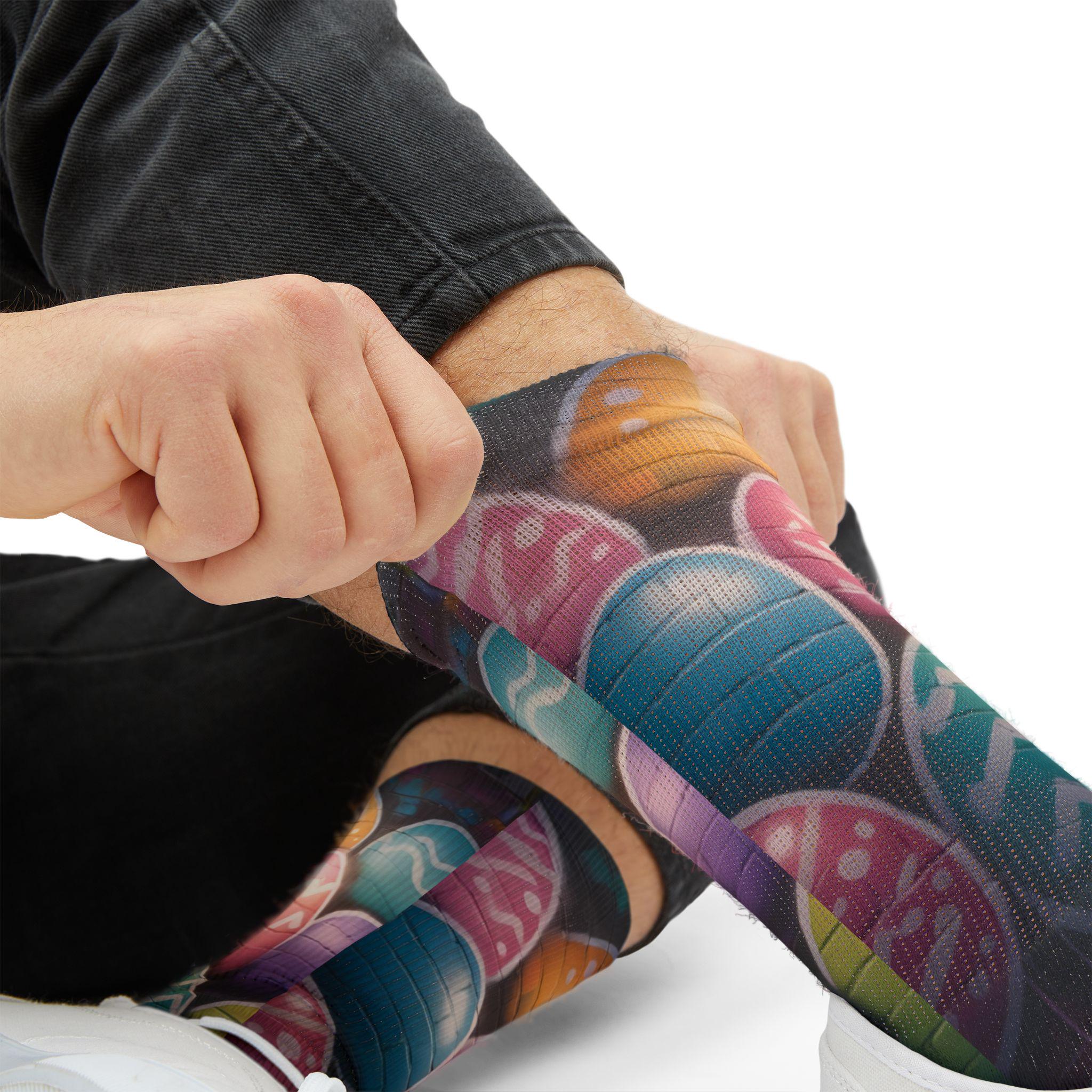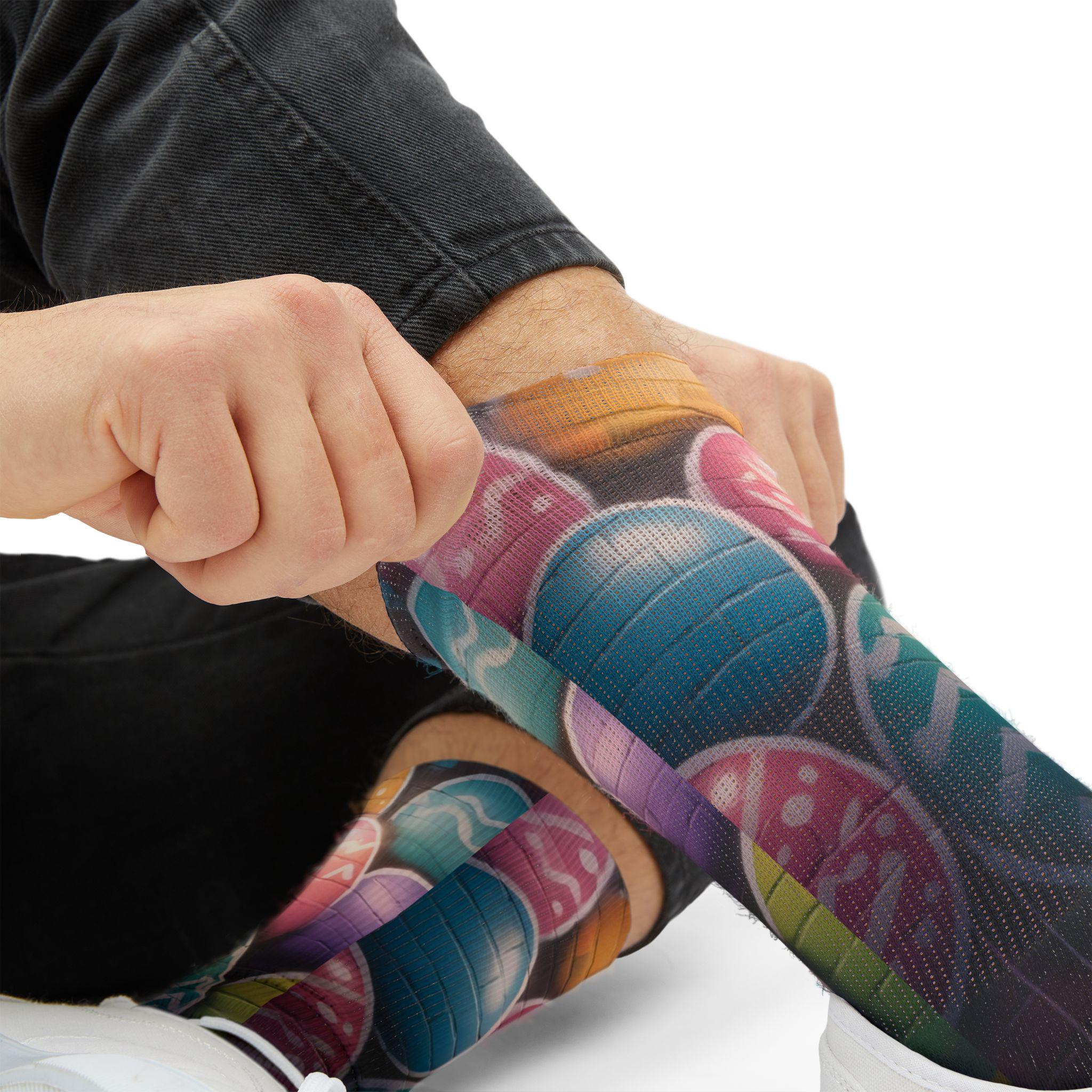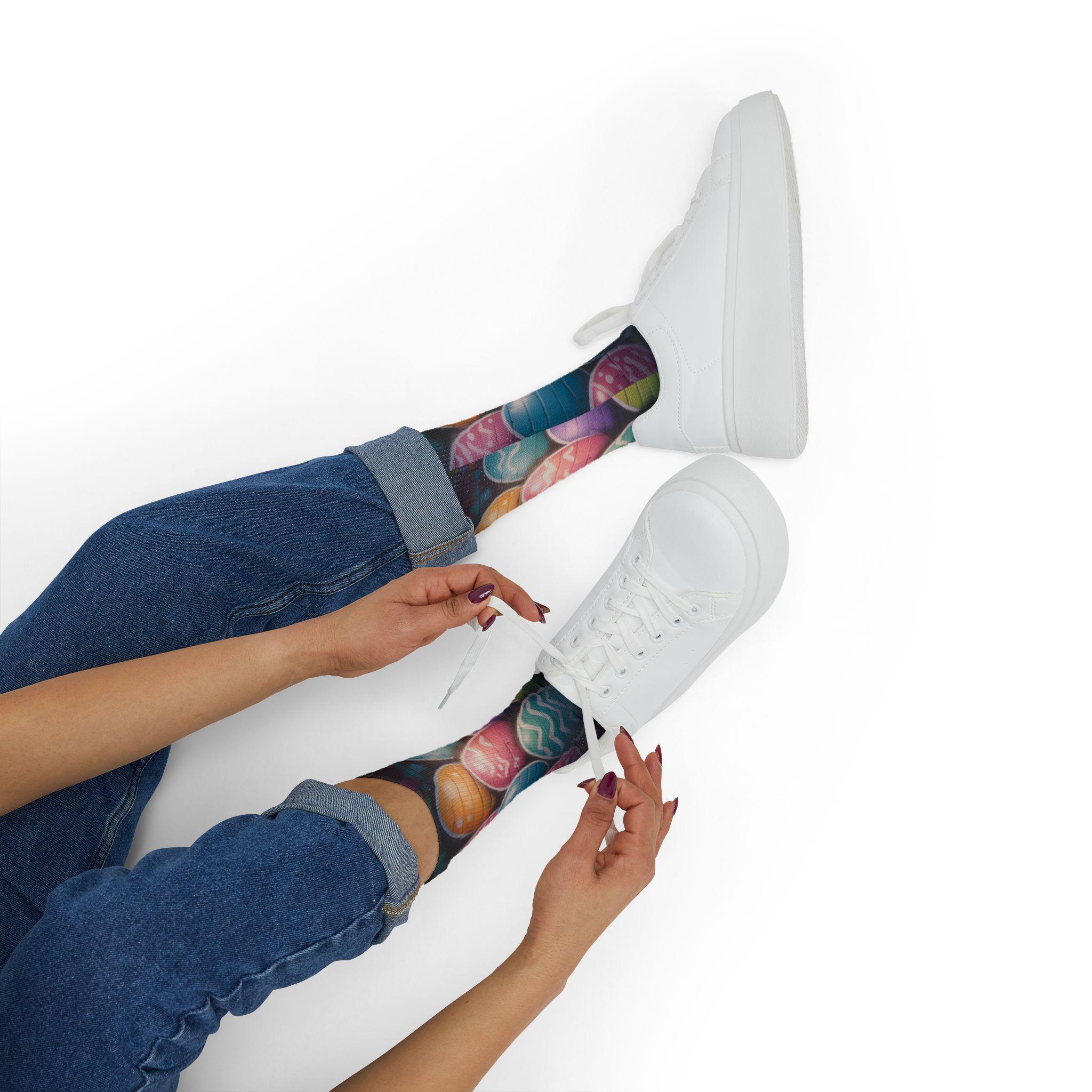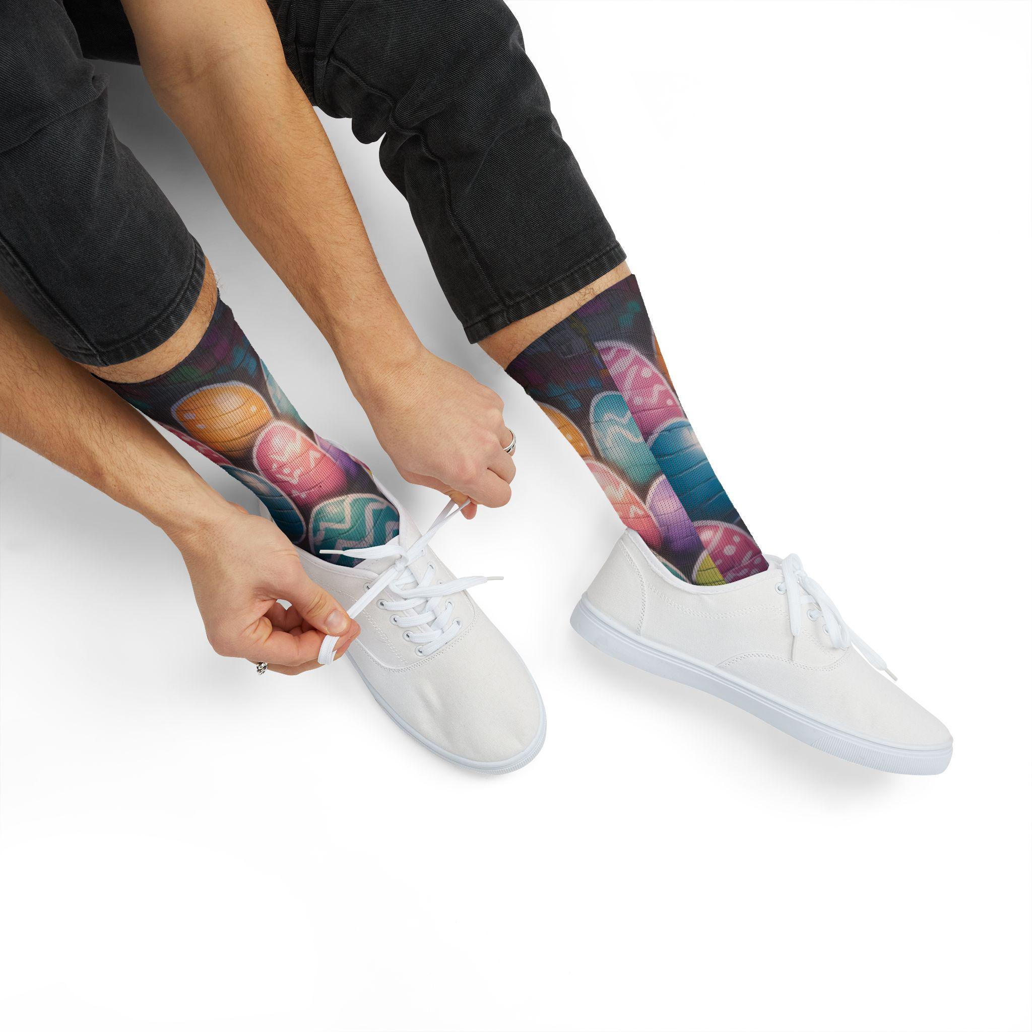 These crew-length sublimation socks bring a playful, color-splashed vibe to everyday wear. Soft fleece lines the sole for warmth and comfort, while cushioned bottoms and a ribbed tube keep the fit snug without squeezing. The all-over print runs edge-to-edge with vibrant chalkboard-style eggs and paint bottles, giving the socks an artsy, hands-on feel that looks great with rolled-up jeans or layered under boots. Lightweight stretch (95% polyester, 5% spandex) lets them move with you—whether you’re sketching in a studio, running errands, or settling in for a cozy craft night. Note: sublimation printing may show slight color shifts at side seams.