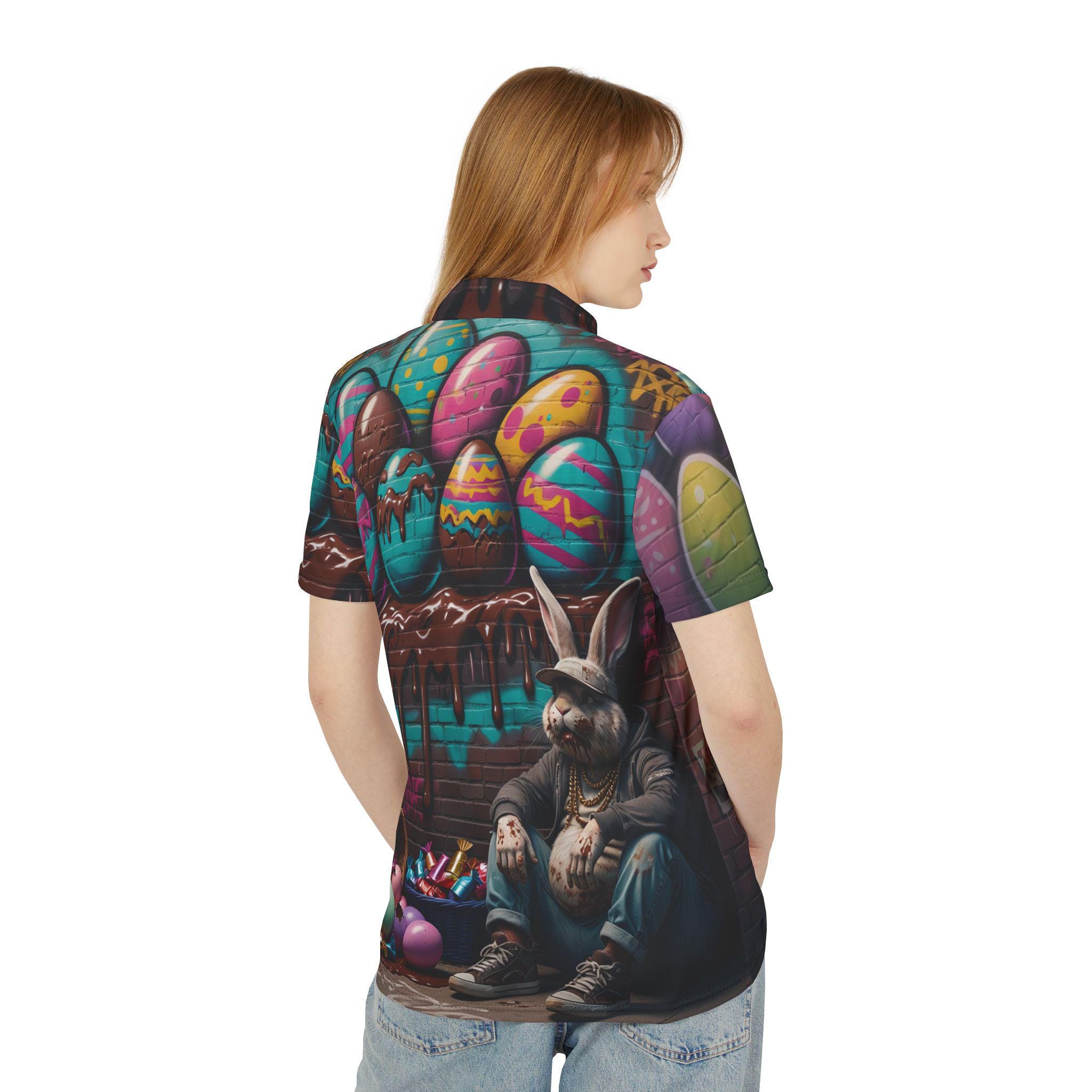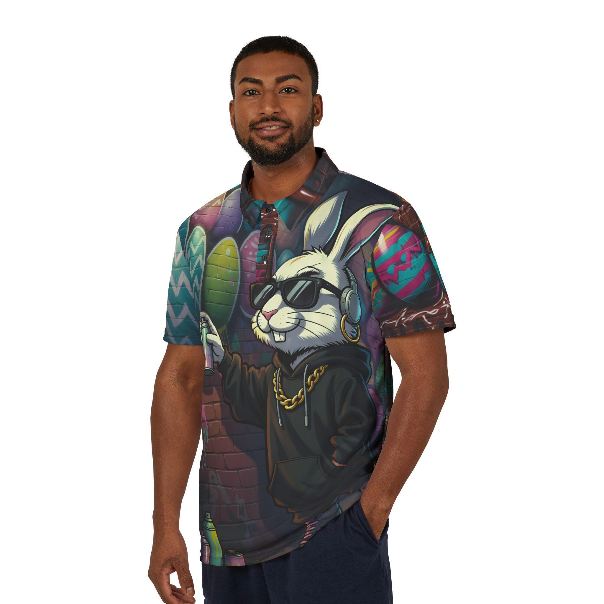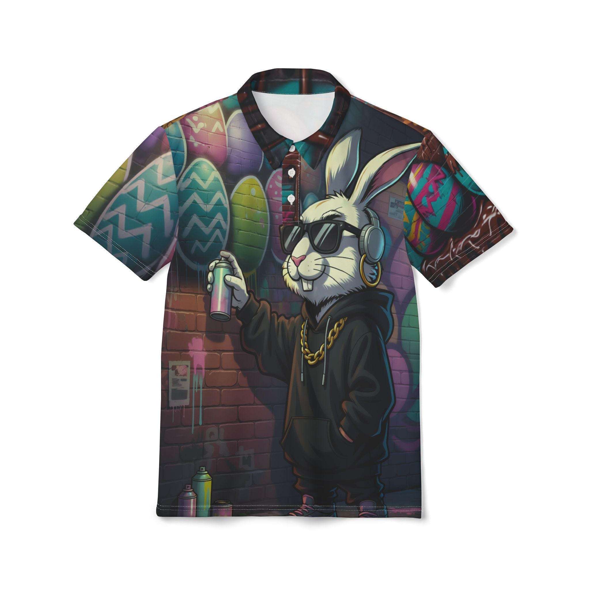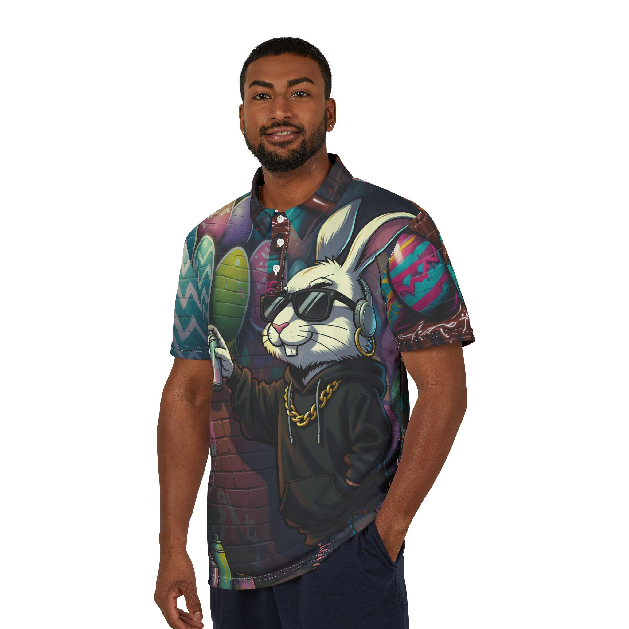 This lightweight polo brings playful street art energy to a classic silhouette. A cool, graffiti‑style rabbit—wearing shades, headphones and a gold chain—sprays colorful egg-shaped murals across the fabric, turning the collar and three-button placket into part of the canvas. The extra-light polyester keeps the print vivid and the shirt breathable, so it sits comfortably during warm days or layered under a jacket when the evening cools. Wear it to bring a casual, creative spark to weekend hangouts, art walks, or relaxed gatherings where bold, whimsical style starts conversations.