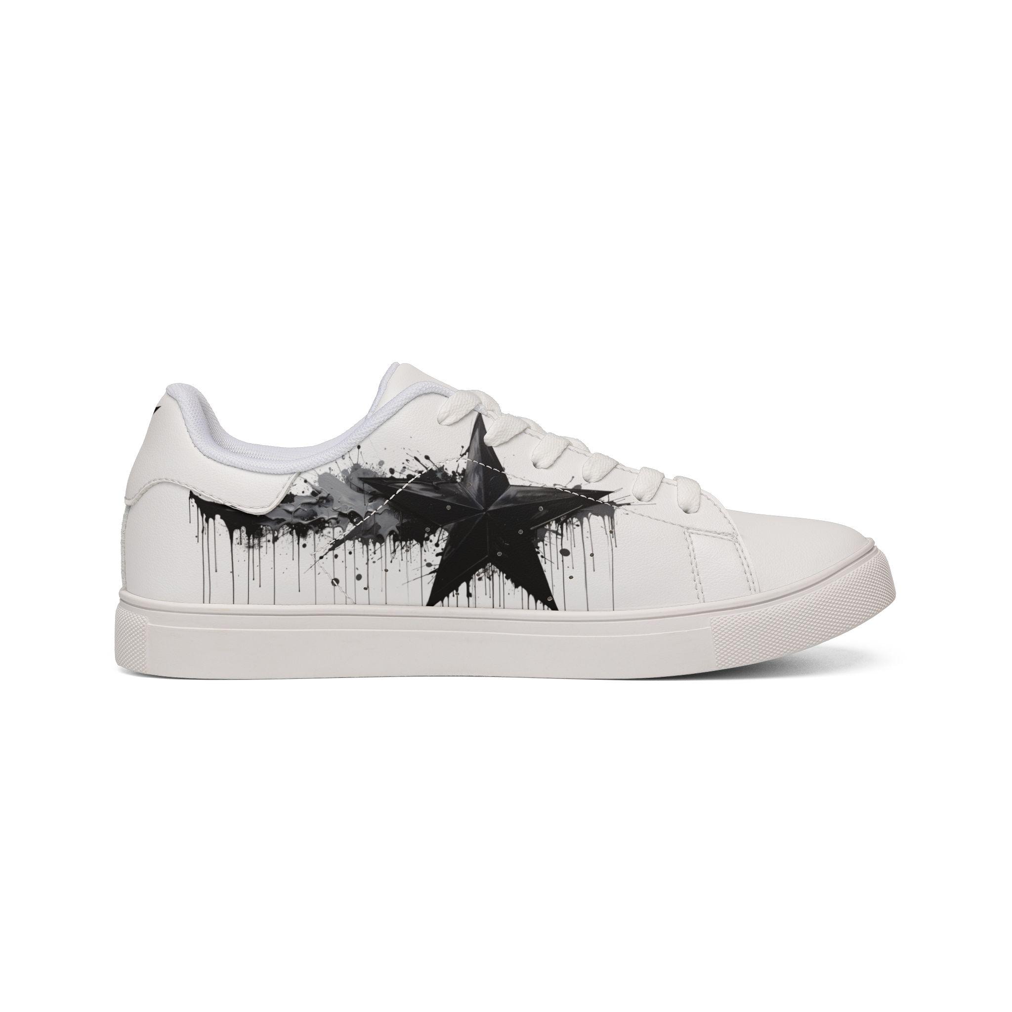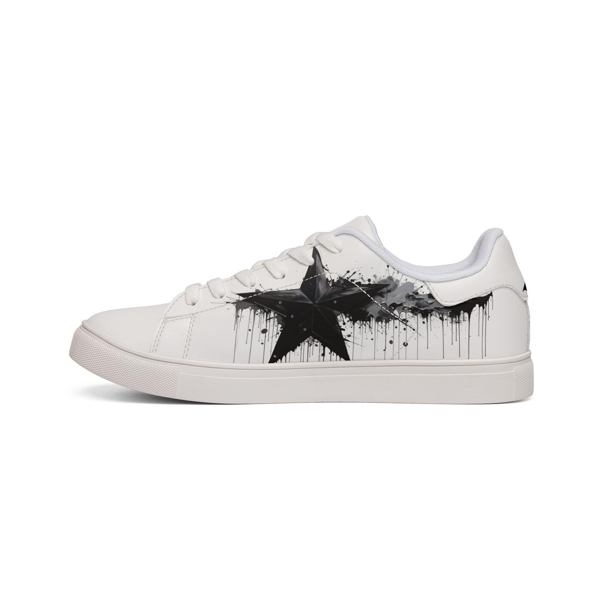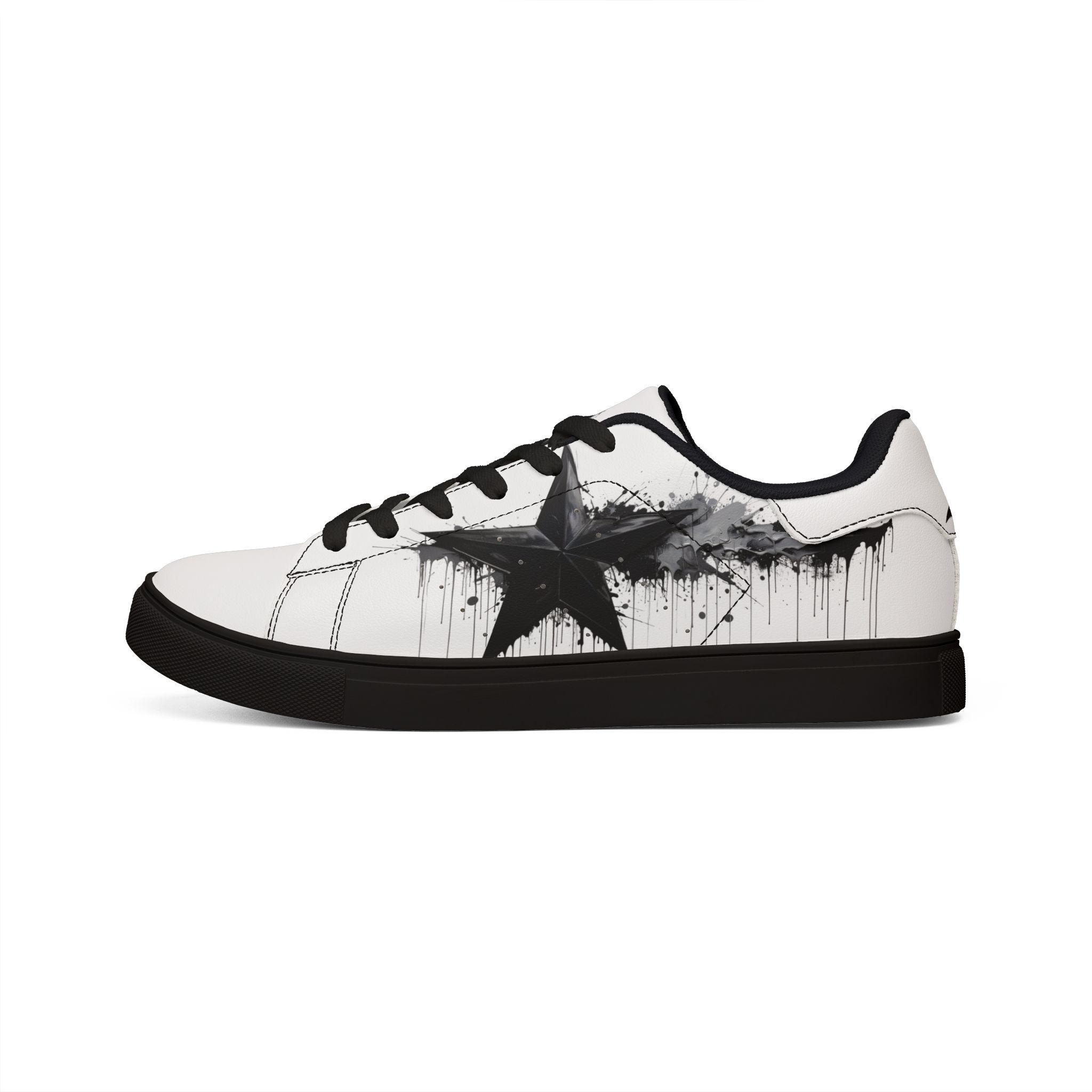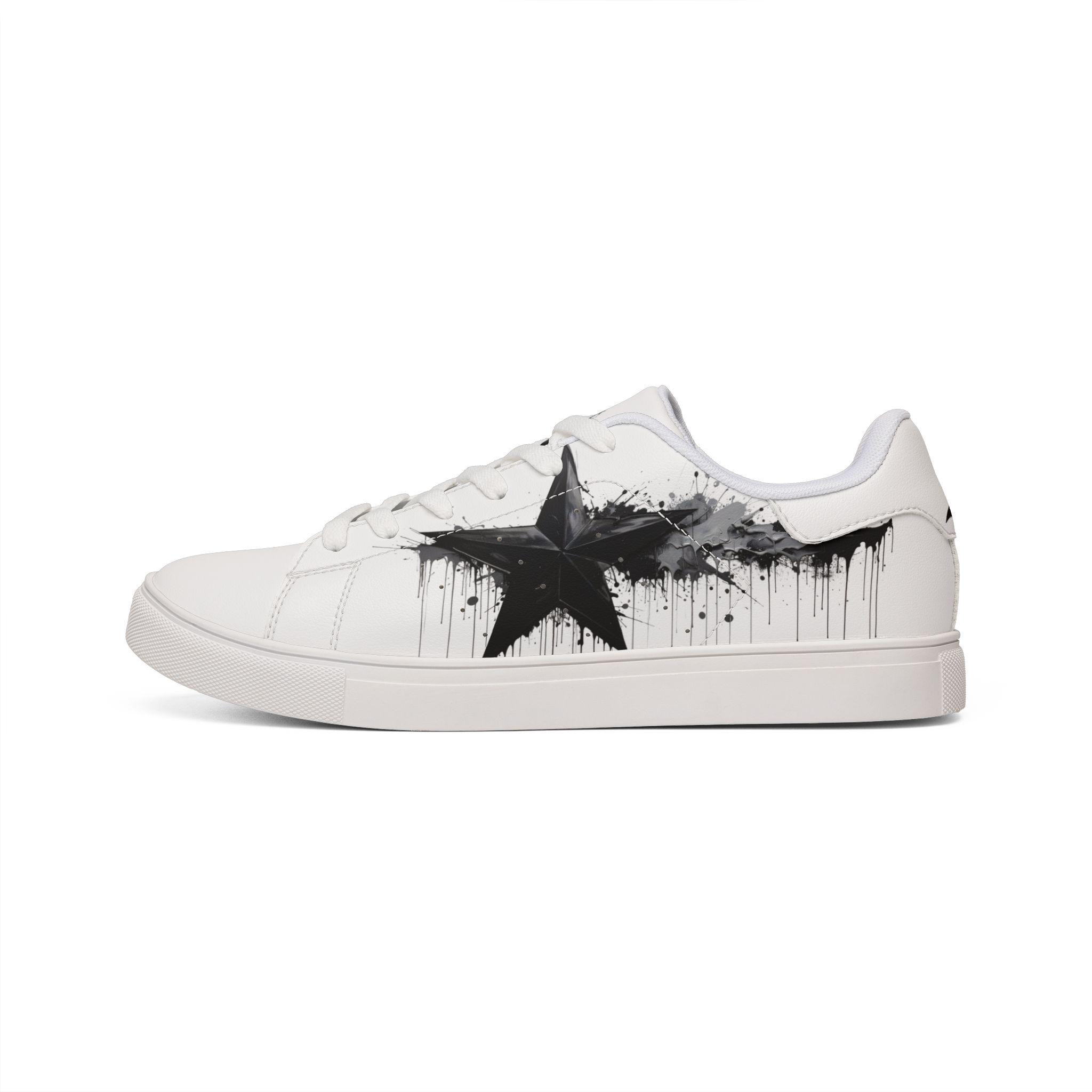 These low-top leather sneakers bring a raw, streetwise edge to everyday wear. Smooth microfiber PU gives the look of classic leather while staying lightweight and easy to care for. A bold, brushed-black star motif splashes across the sides like a quick spray of alleyway art — deliberate but effortless. Lace-up construction locks your foot in with reliable stability, and the rubber outsole with an EVA layer absorbs impact so your steps feel quieter and softer. They sit low at the ankle for casual layering with jeans or cropped trousers, and the contrasting stitching on black- or white-soled versions adds a subtle design detail that holds up under wear. These sneakers fit a wide size range and carry a confident, urban energy that complements street-style wardrobes and creative day-to-day looks.