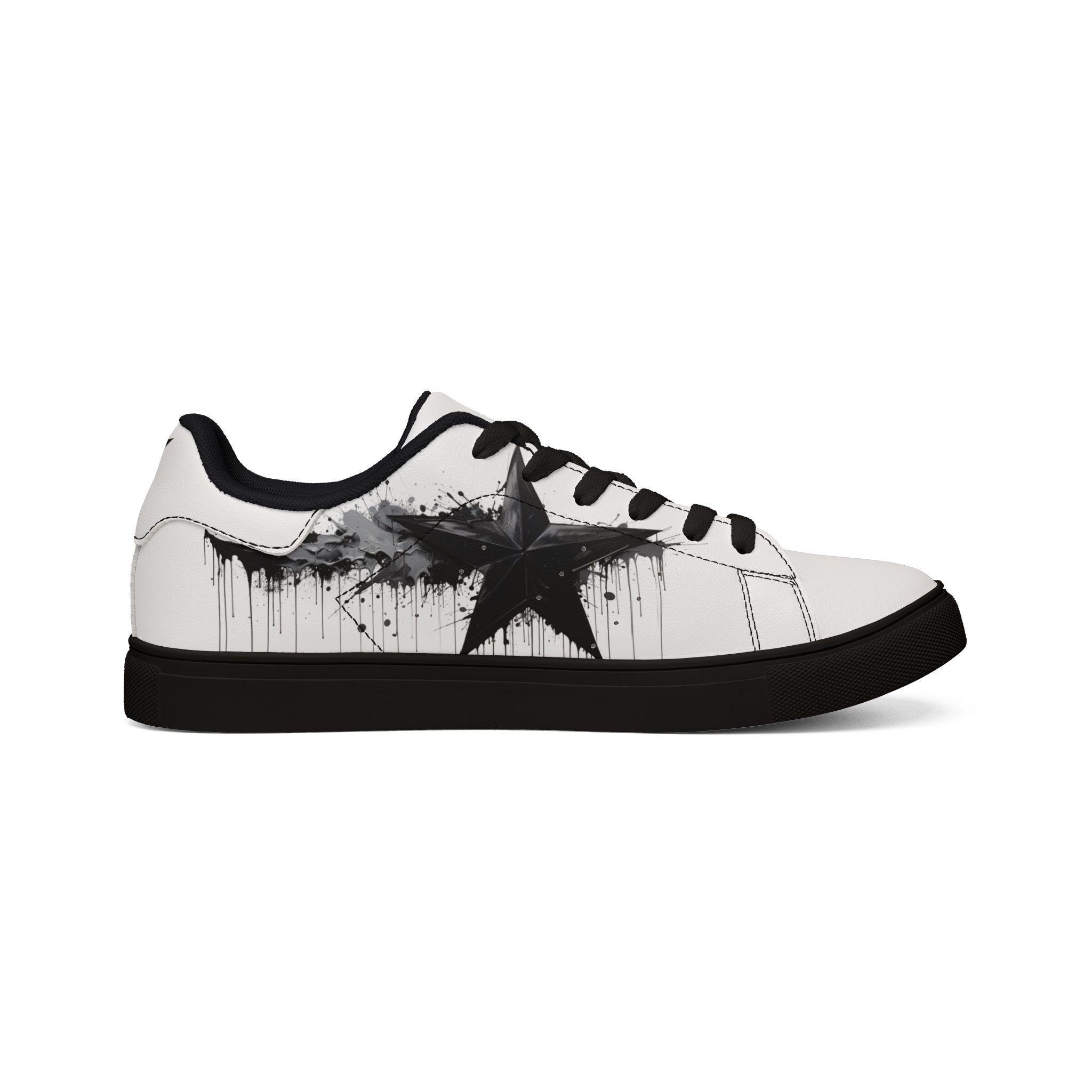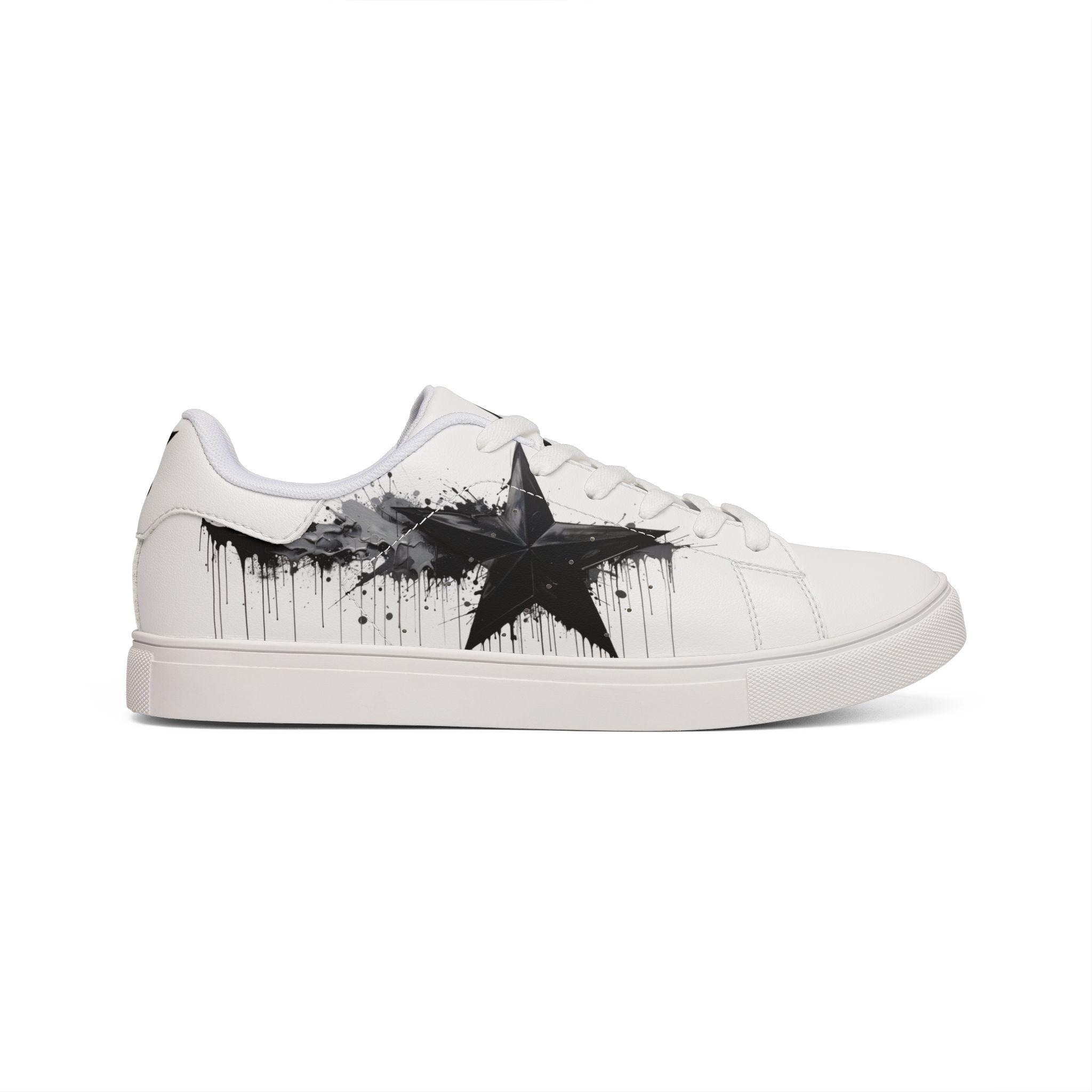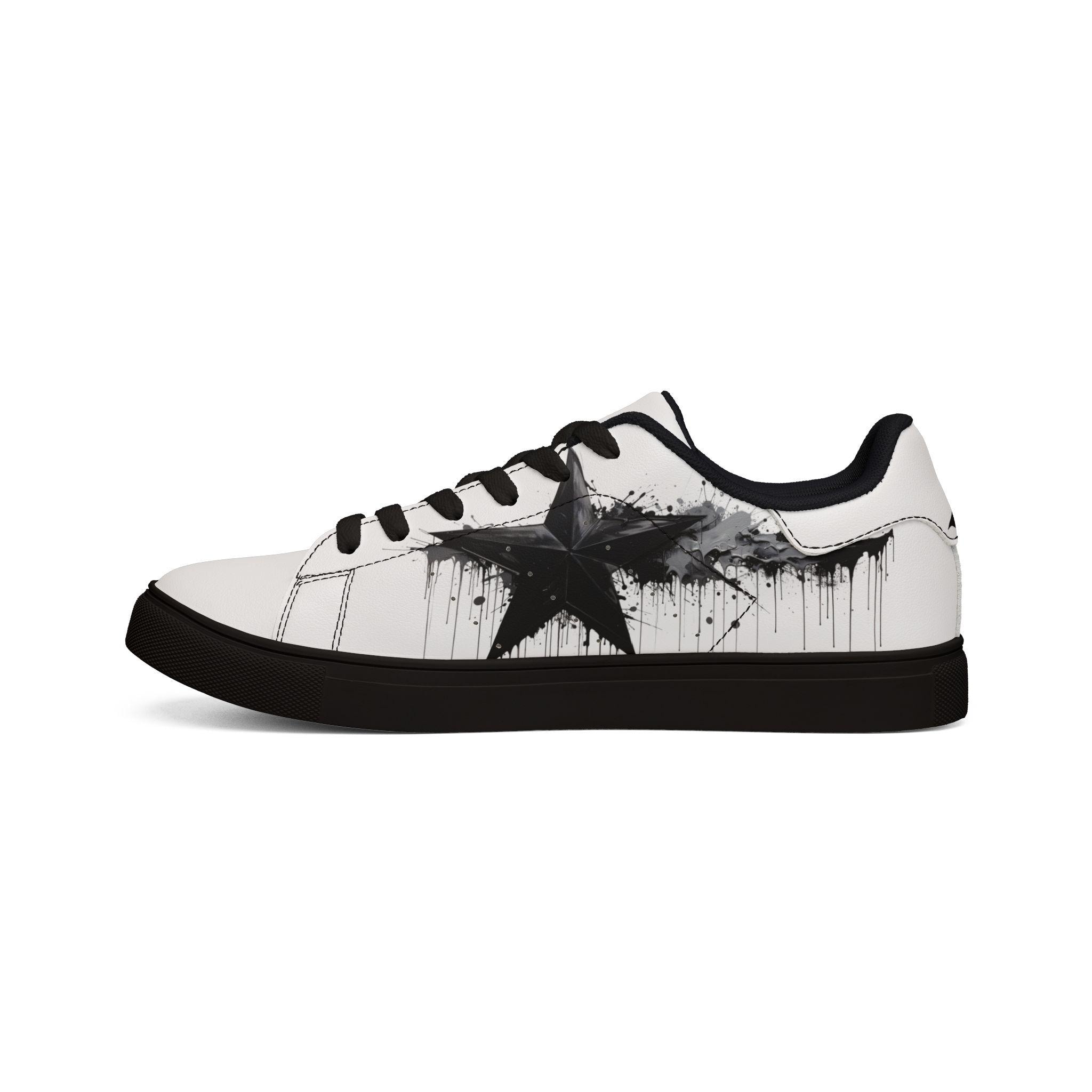These low-top leather sneakers bring a raw, streetwise edge to everyday wear. Smooth microfiber PU gives the look of classic leather while staying lightweight and easy to care for. A bold, brushed-black star motif splashes across the sides like a quick spray of alleyway art — deliberate but effortless. Lace-up construction locks your foot in with reliable stability, and the rubber outsole with an EVA layer absorbs impact so your steps feel quieter and softer. They sit low at the ankle for casual layering with jeans or cropped trousers, and the contrasting stitching on black- or white-soled versions adds a subtle design detail that holds up under wear. These sneakers fit a wide size range and carry a confident, urban energy that complements street-style wardrobes and creative day-to-day looks.