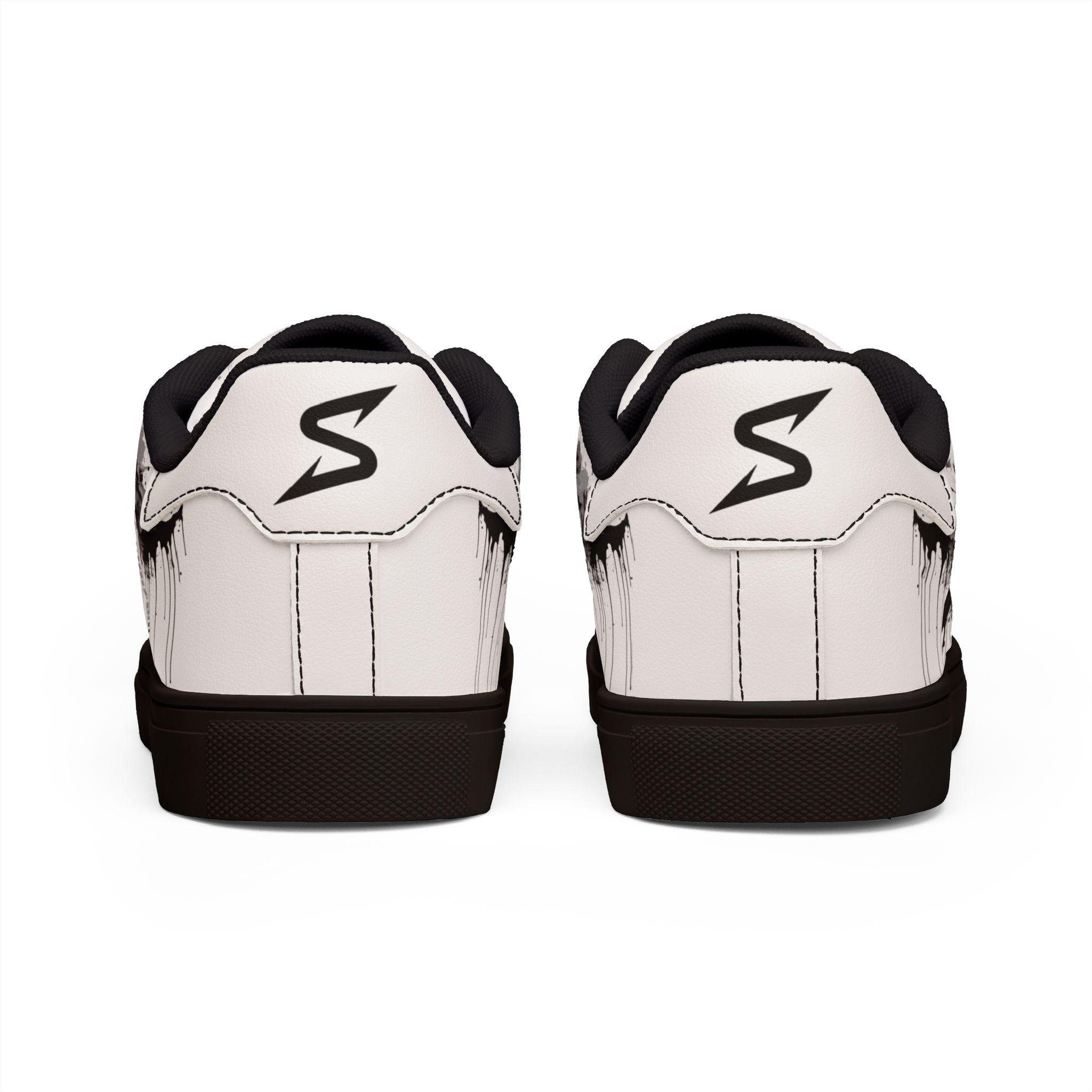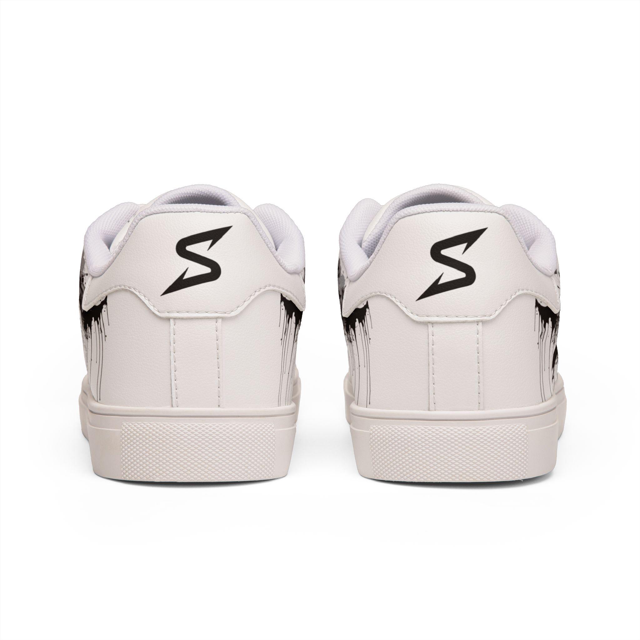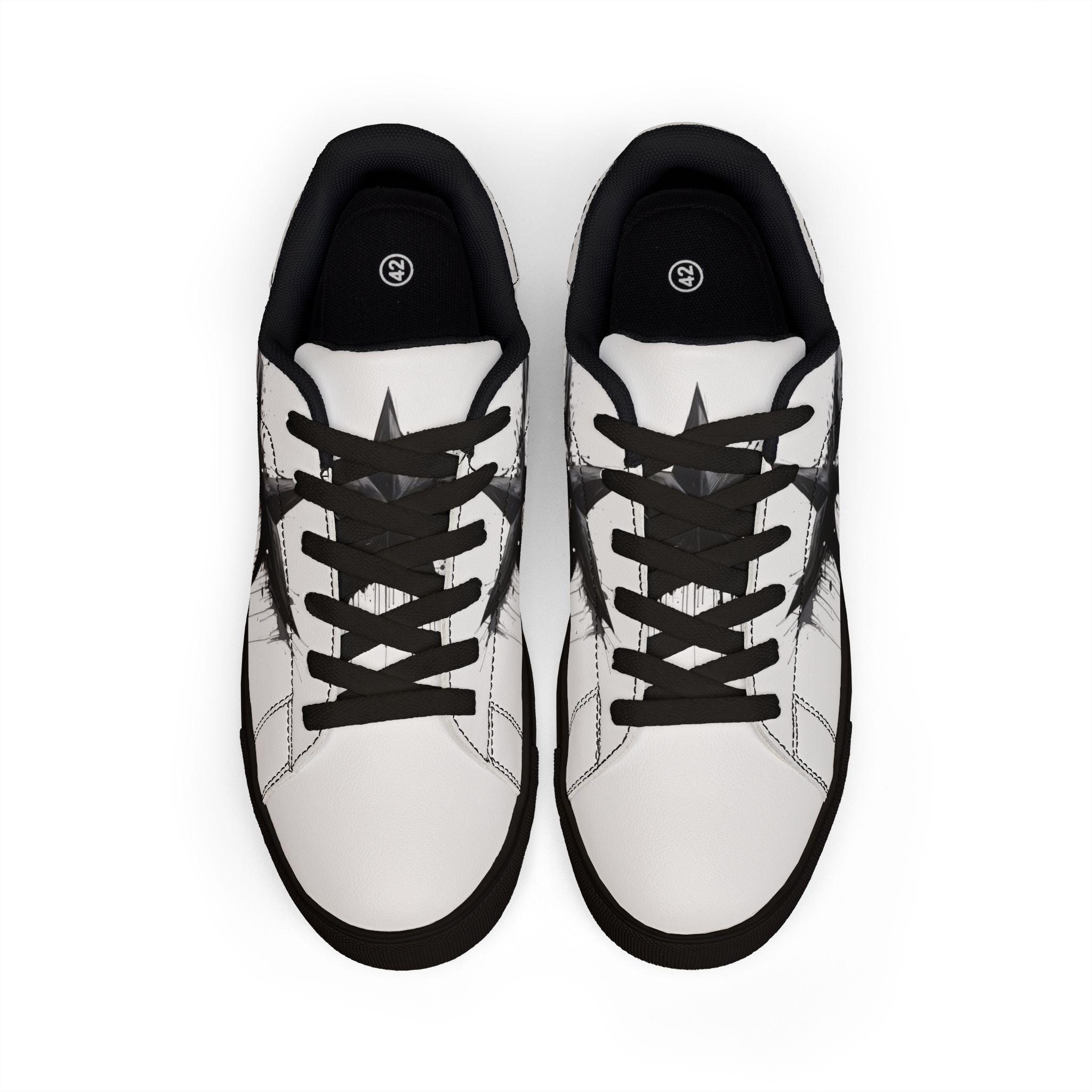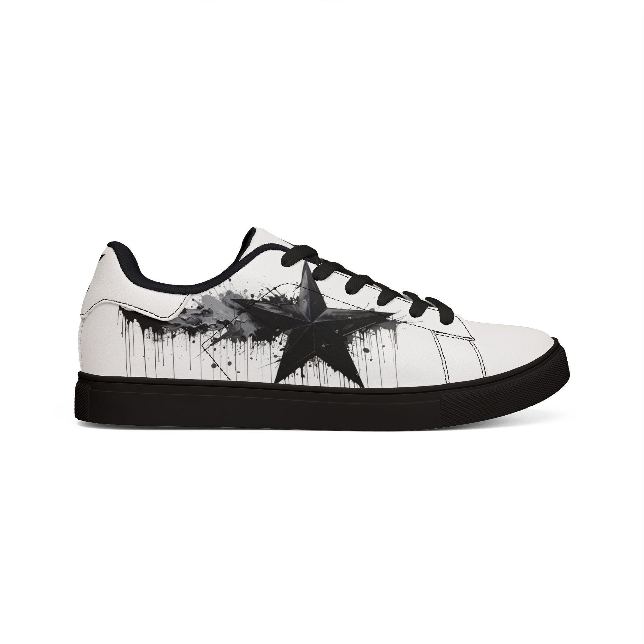 These low-top leather sneakers bring a raw, streetwise edge to everyday wear. Smooth microfiber PU gives the look of classic leather while staying lightweight and easy to care for. A bold, brushed-black star motif splashes across the sides like a quick spray of alleyway art — deliberate but effortless. Lace-up construction locks your foot in with reliable stability, and the rubber outsole with an EVA layer absorbs impact so your steps feel quieter and softer. They sit low at the ankle for casual layering with jeans or cropped trousers, and the contrasting stitching on black- or white-soled versions adds a subtle design detail that holds up under wear. These sneakers fit a wide size range and carry a confident, urban energy that complements street-style wardrobes and creative day-to-day looks.