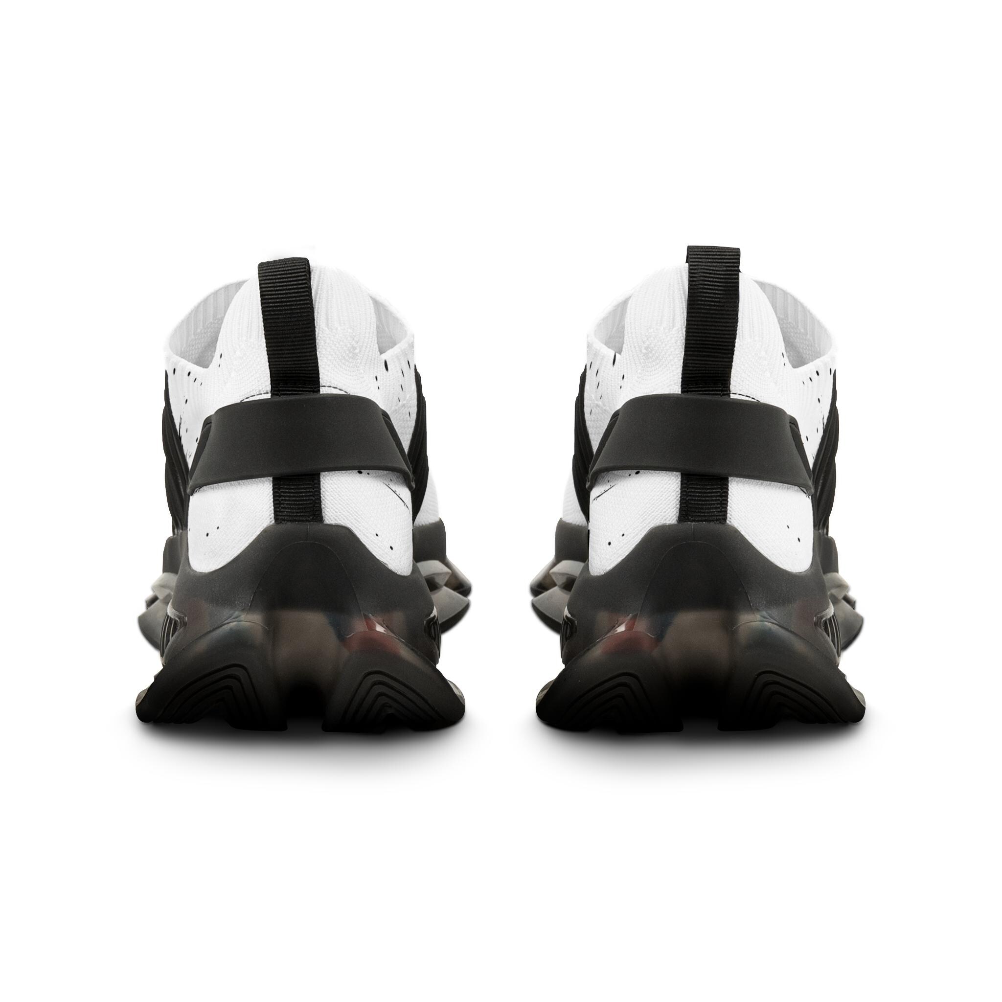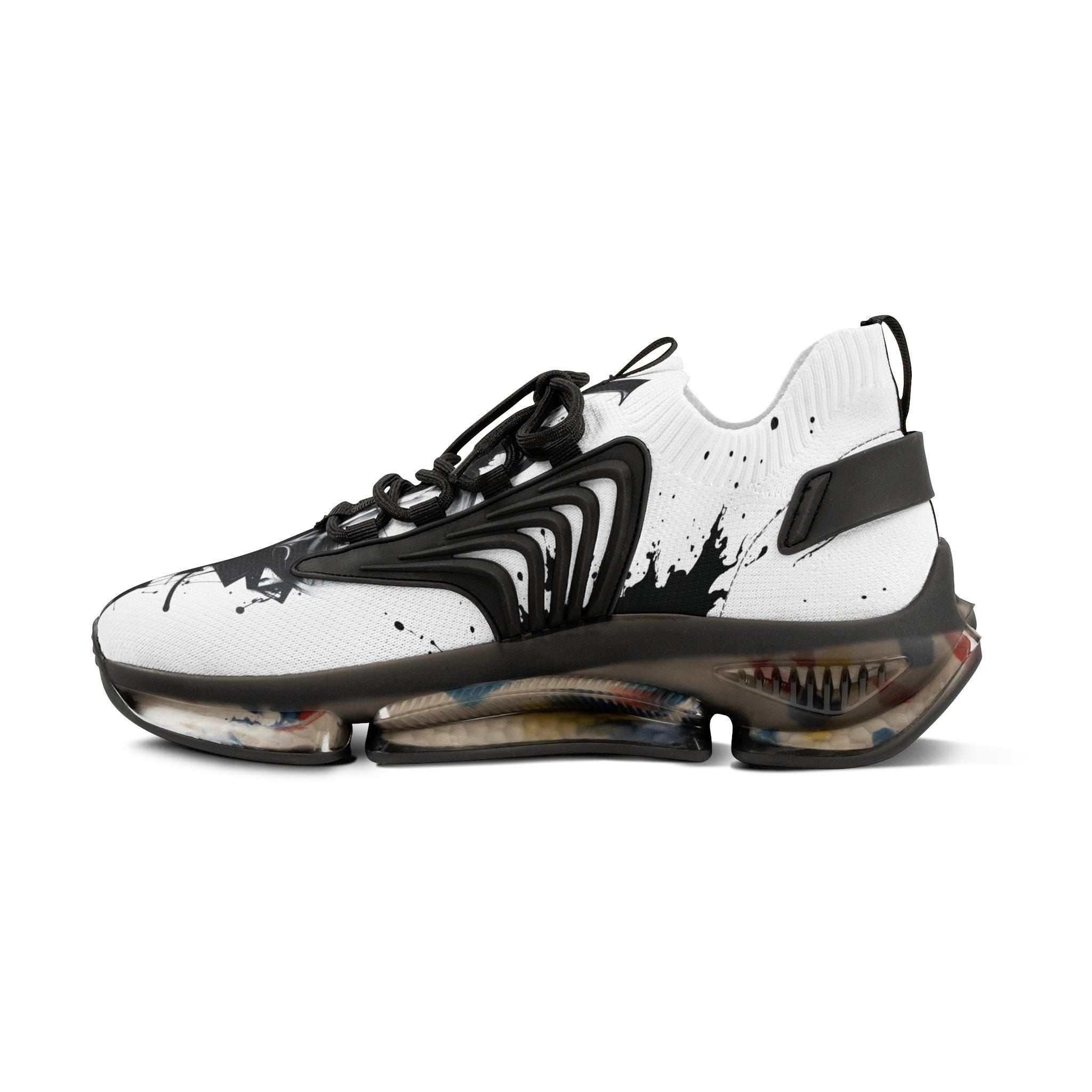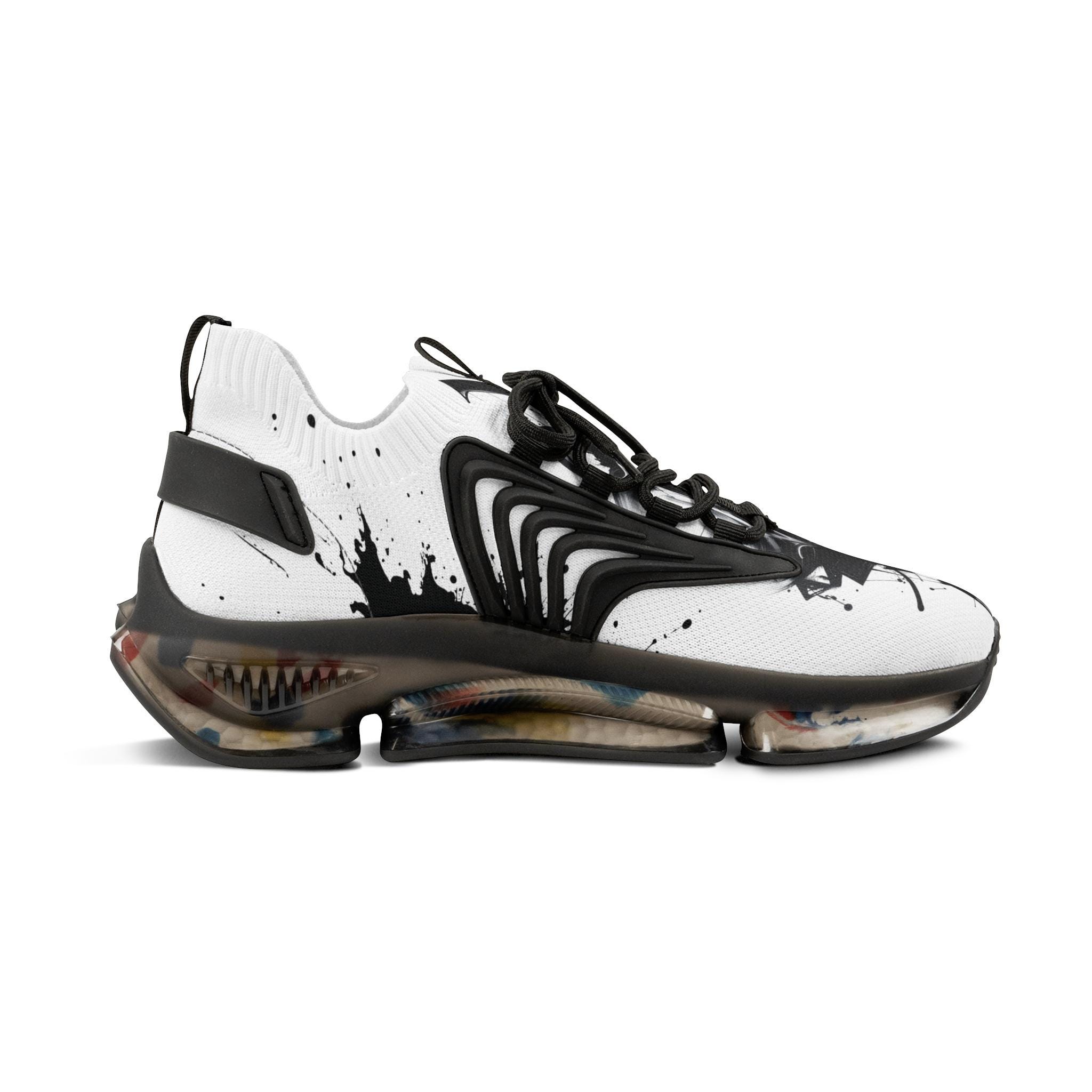 These mesh sneakers bring streetwise energy to everyday movement. Lightweight mesh-knit uppers feel airy against your foot while the deodorant memory foam insole cushions each step and controls heat. The sculpted EVA/TPU sole gives a responsive, springy ride and shows subtle color flecks that echo the ink-splash print across the vamp. KPU overlays add weather-resistant structure so the shoe keeps its shape through commutes, studio sessions, or weekend walks. Clean black or white detailing keeps the look wearable with layered streetwear, tailored joggers, or minimalist denim.