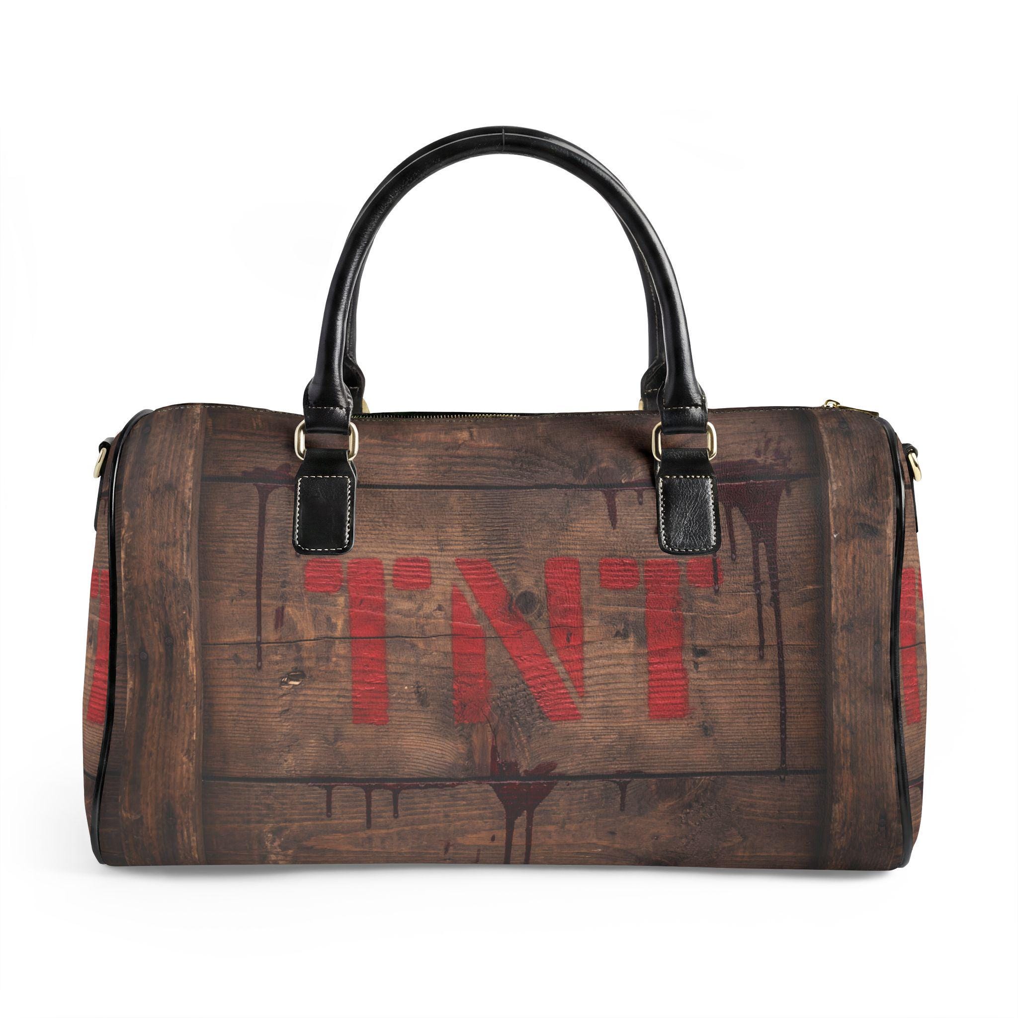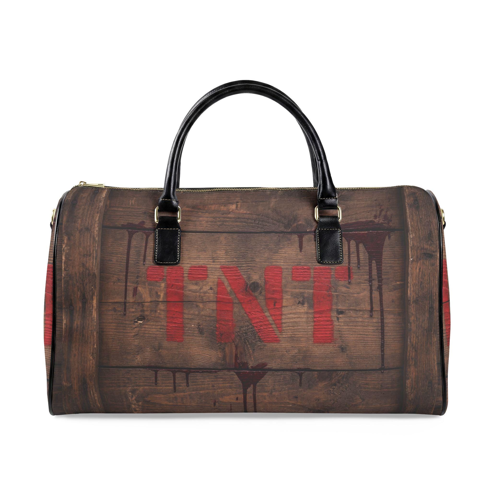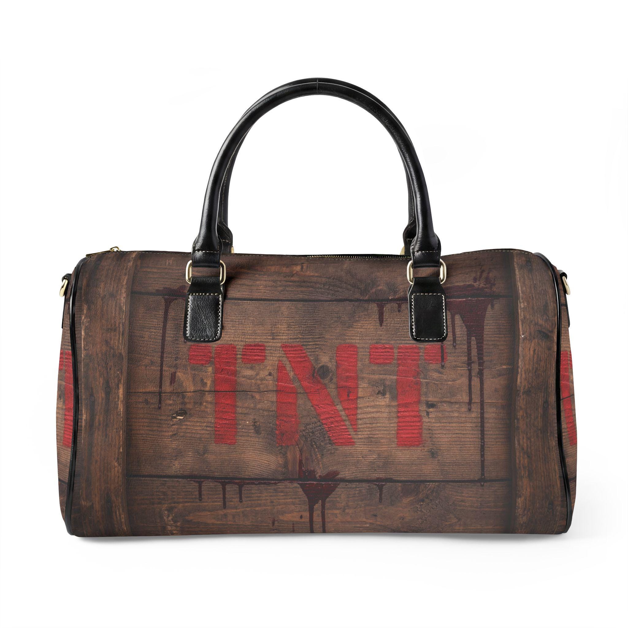This travel bag channels that adventurous, cinematic energy—imagine a weathered wooden crate stamped with red TNT, carried through train stations and backroads. The high-grade PU leather exterior imitates aged wood grain and dark metal accents, while the roomy single compartment swallows jackets, boots, and the weekend’s essentials. A sturdy PU top handle and adjustable shoulder strap with metal clips give you carrying options whether you’re sprinting for a connection or strolling a market. It’s a bold, statement piece for someone who likes rugged style without the weight of real leather.