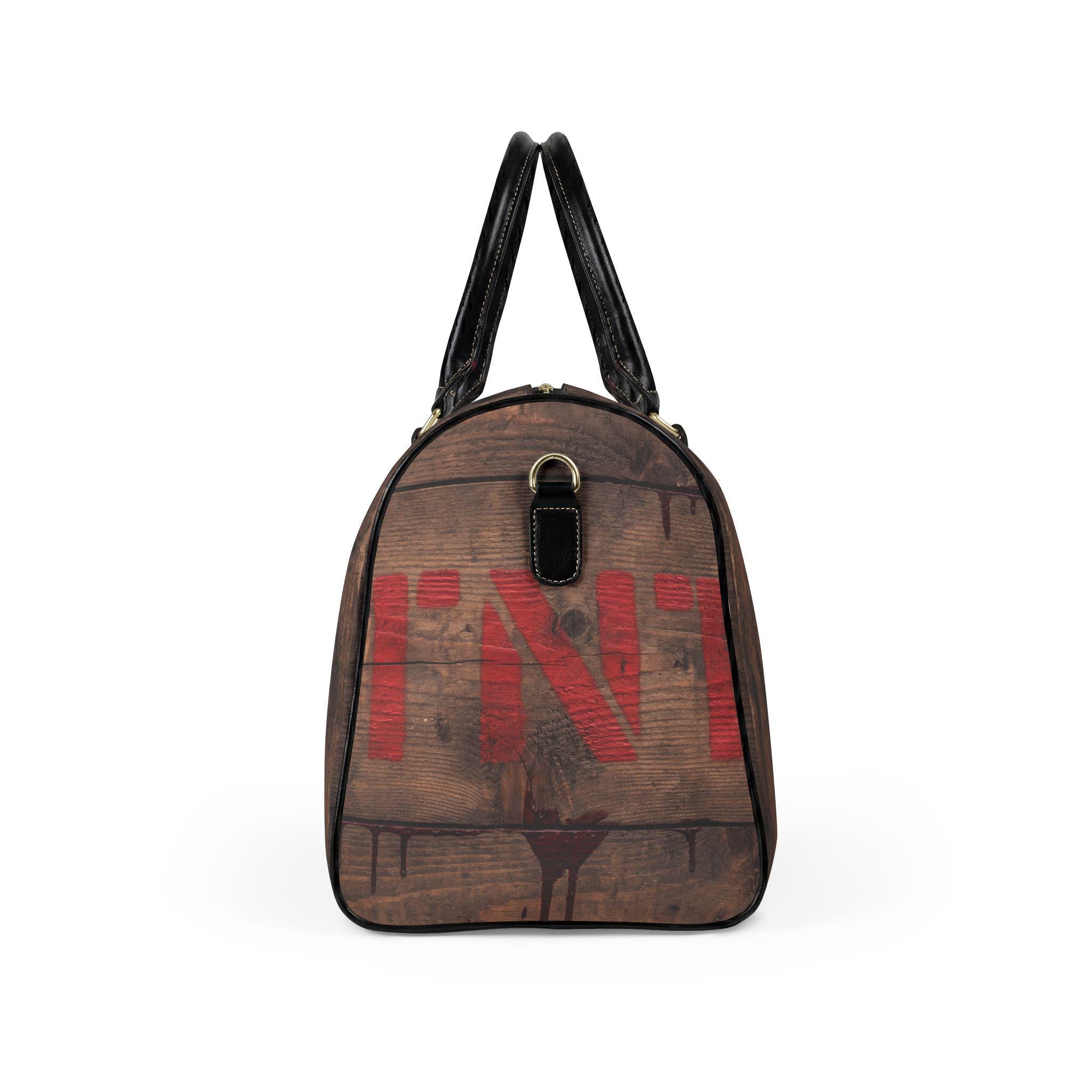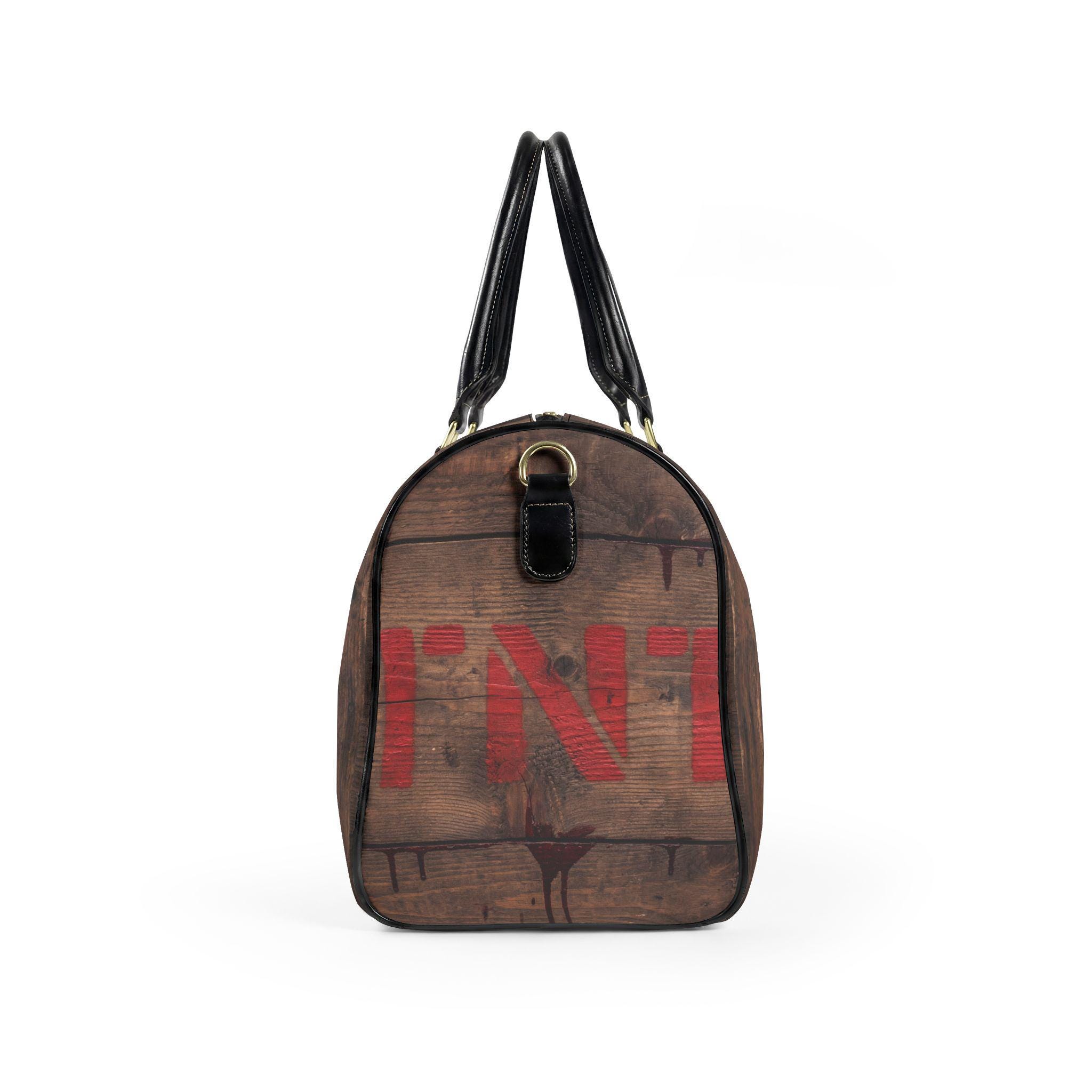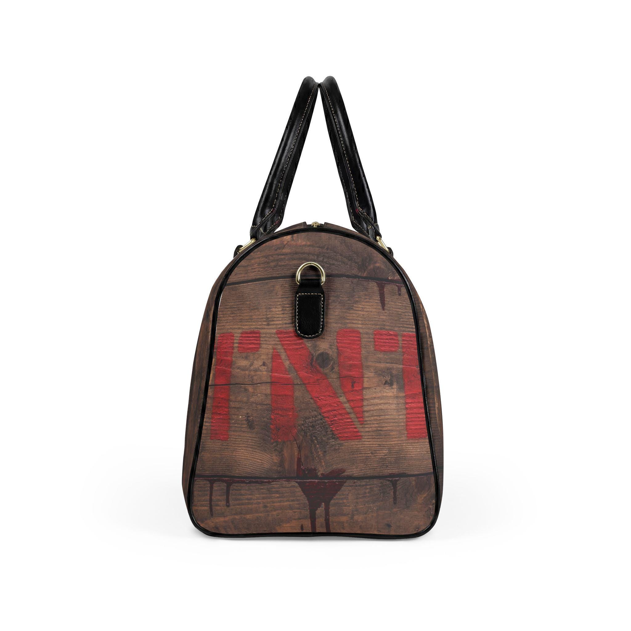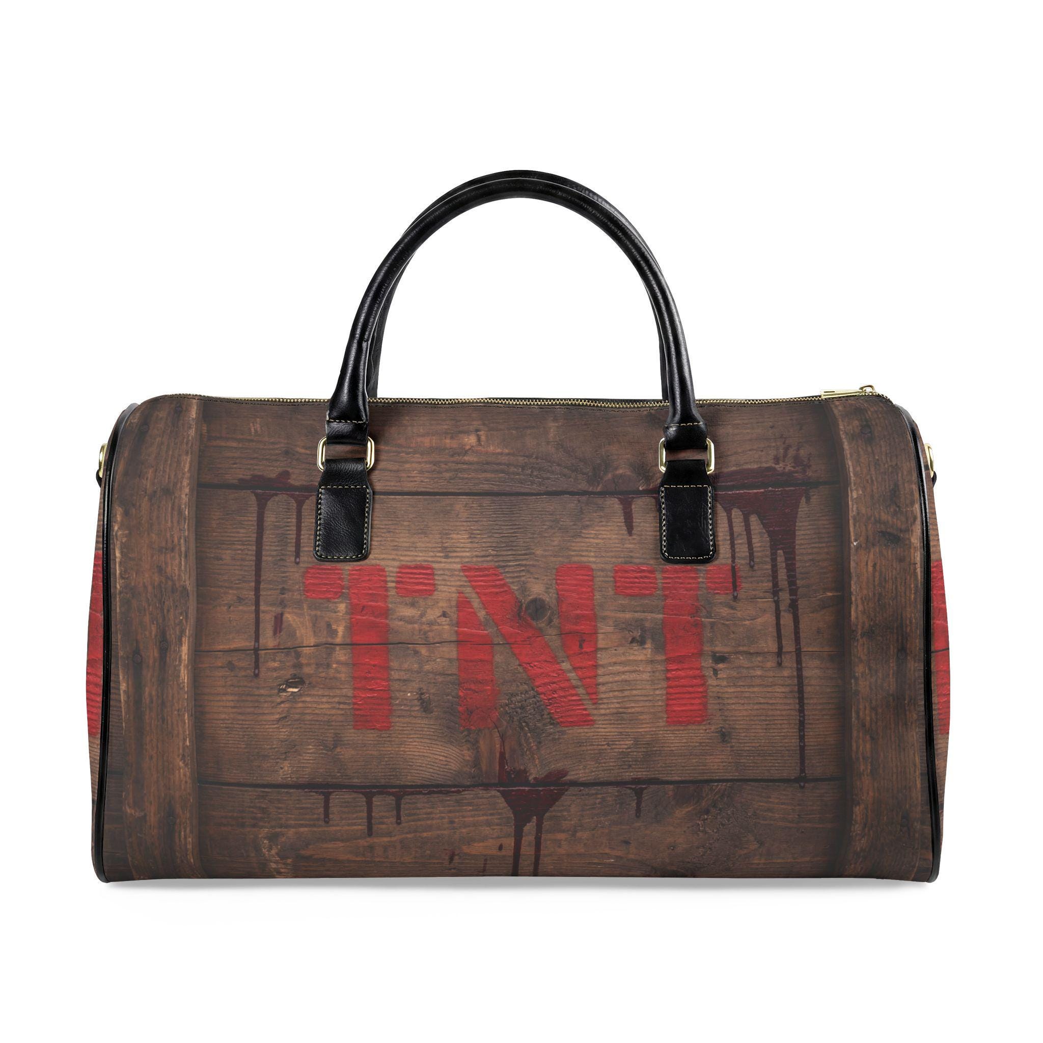 This travel bag channels that adventurous, cinematic energy—imagine a weathered wooden crate stamped with red TNT, carried through train stations and backroads. The high-grade PU leather exterior imitates aged wood grain and dark metal accents, while the roomy single compartment swallows jackets, boots, and the weekend’s essentials. A sturdy PU top handle and adjustable shoulder strap with metal clips give you carrying options whether you’re sprinting for a connection or strolling a market. It’s a bold, statement piece for someone who likes rugged style without the weight of real leather.