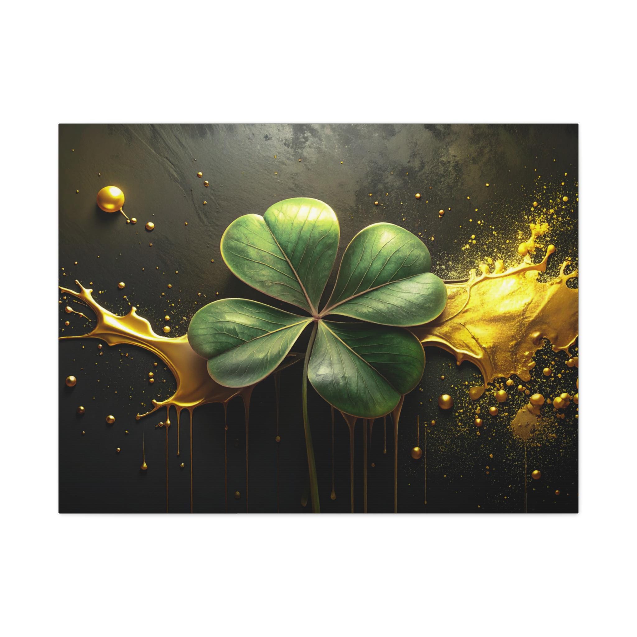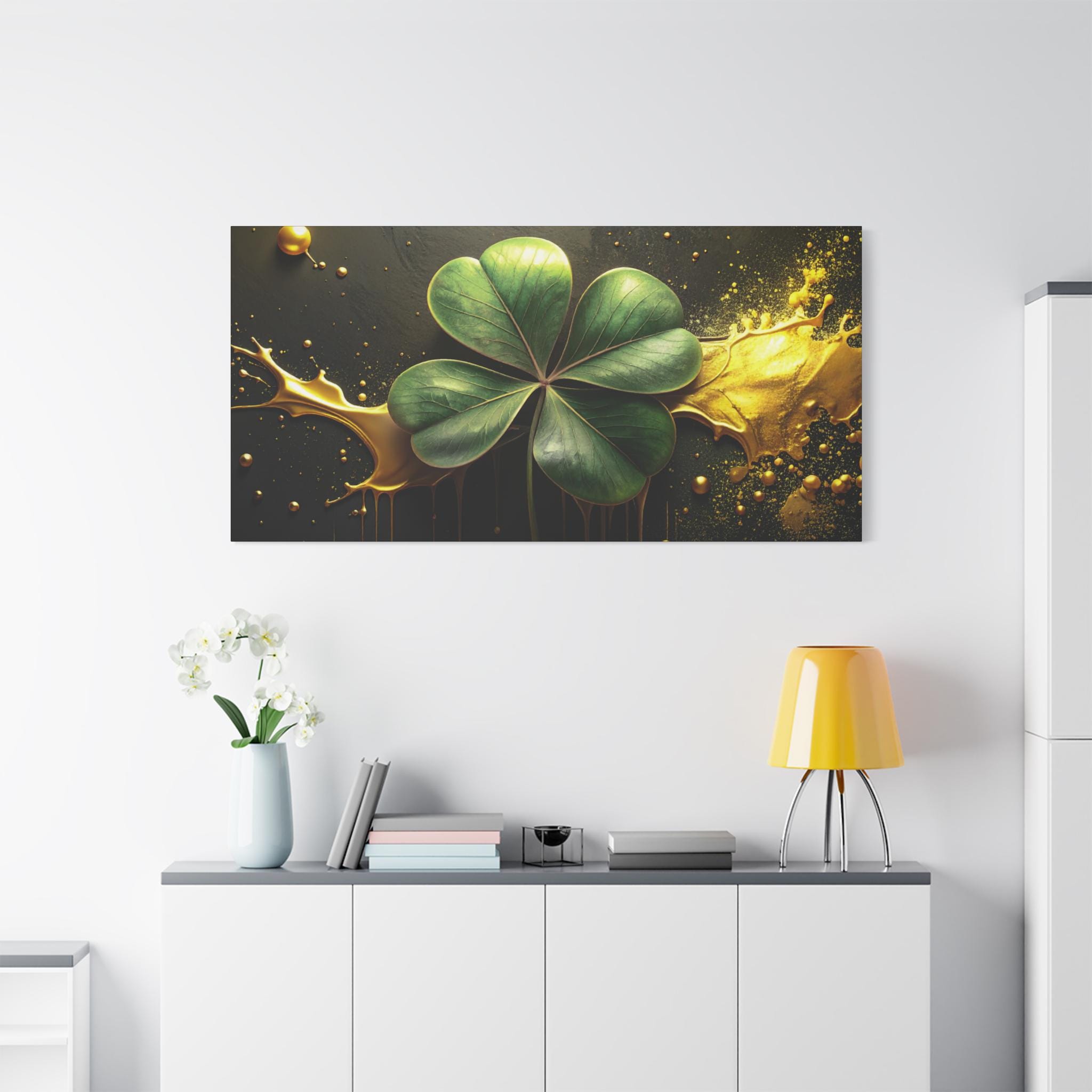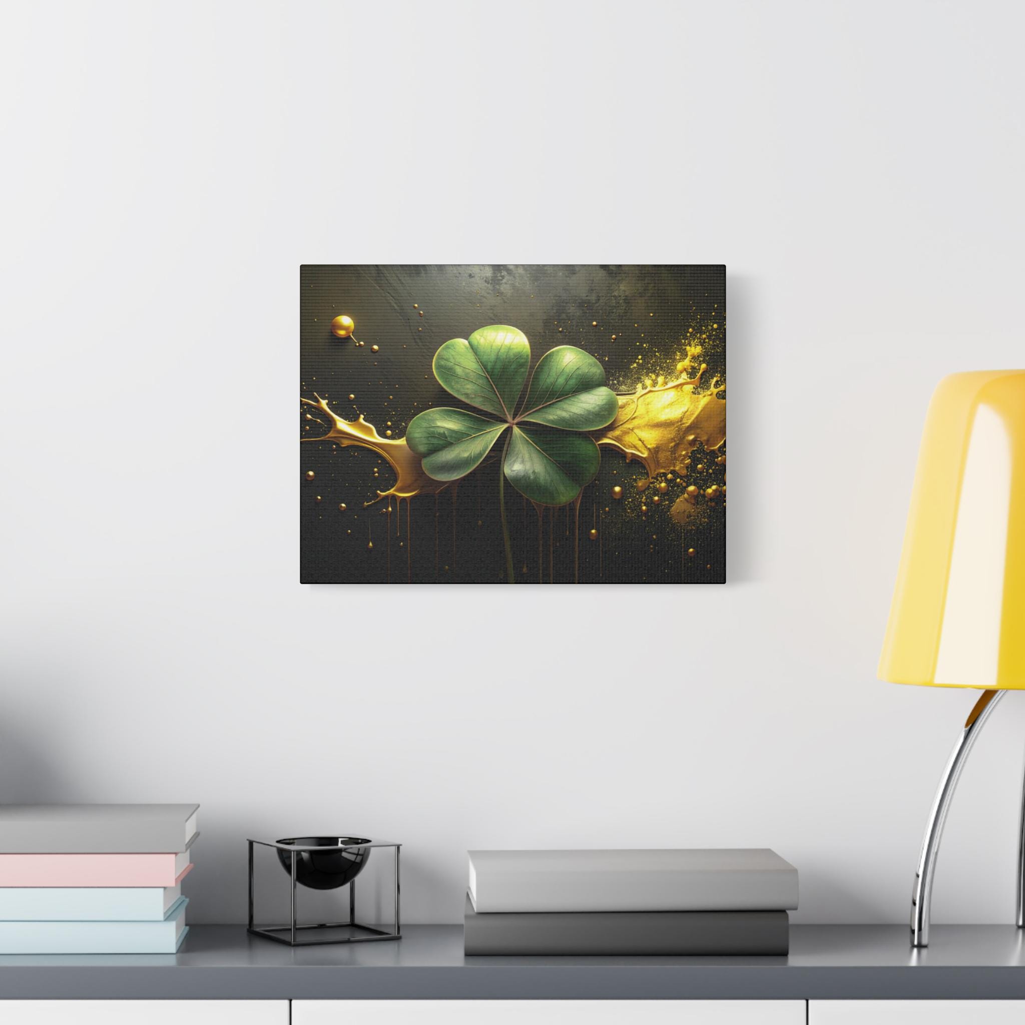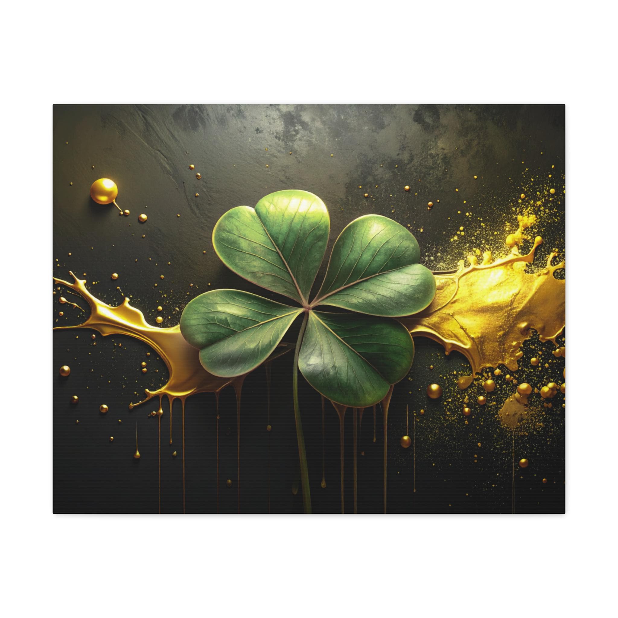A matte stretched canvas that brings a quiet, elegant moment into any room. Deep charcoal and gold tones cradle a luminous four-leaf clover rendered with painterly detail—each leaf catching light against a moody, textured background. The 1.25" profile gives the piece presence on the wall without overwhelming a space. It hangs securely thanks to soft rubber corner supports and a built-in back hanger, and the image quality stays vivid over time thanks to Greenguard Gold-certified latex inks. This canvas feels like a found treasure—sophisticated, slightly mysterious, and ready to anchor a living room, study, or entryway with subtle symbolism and rich color.