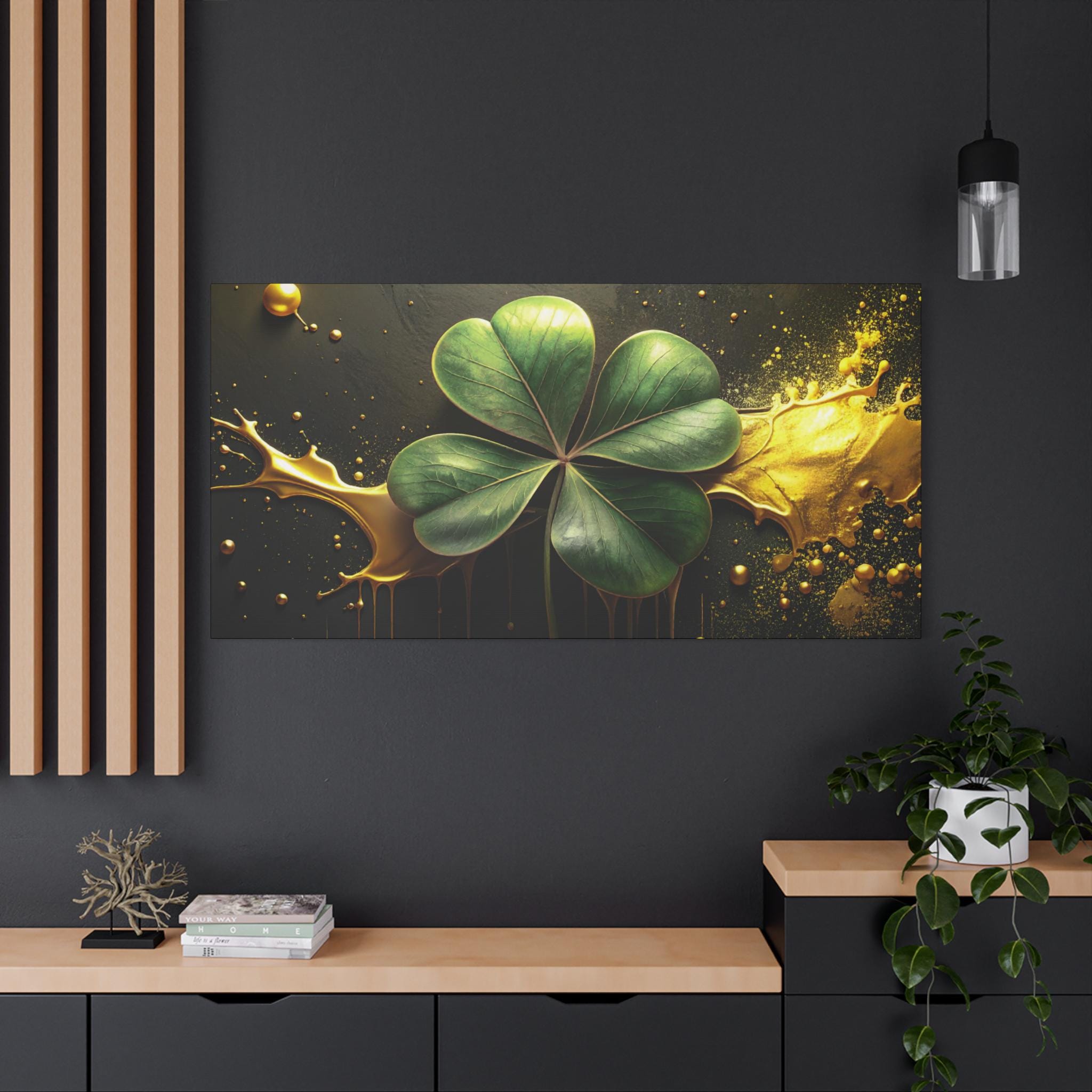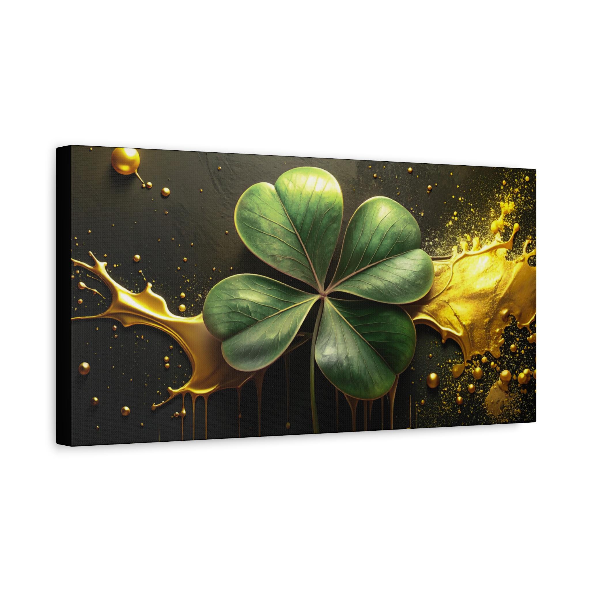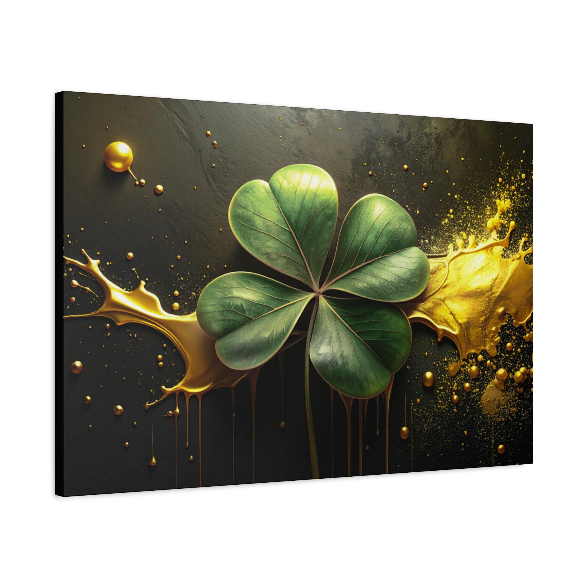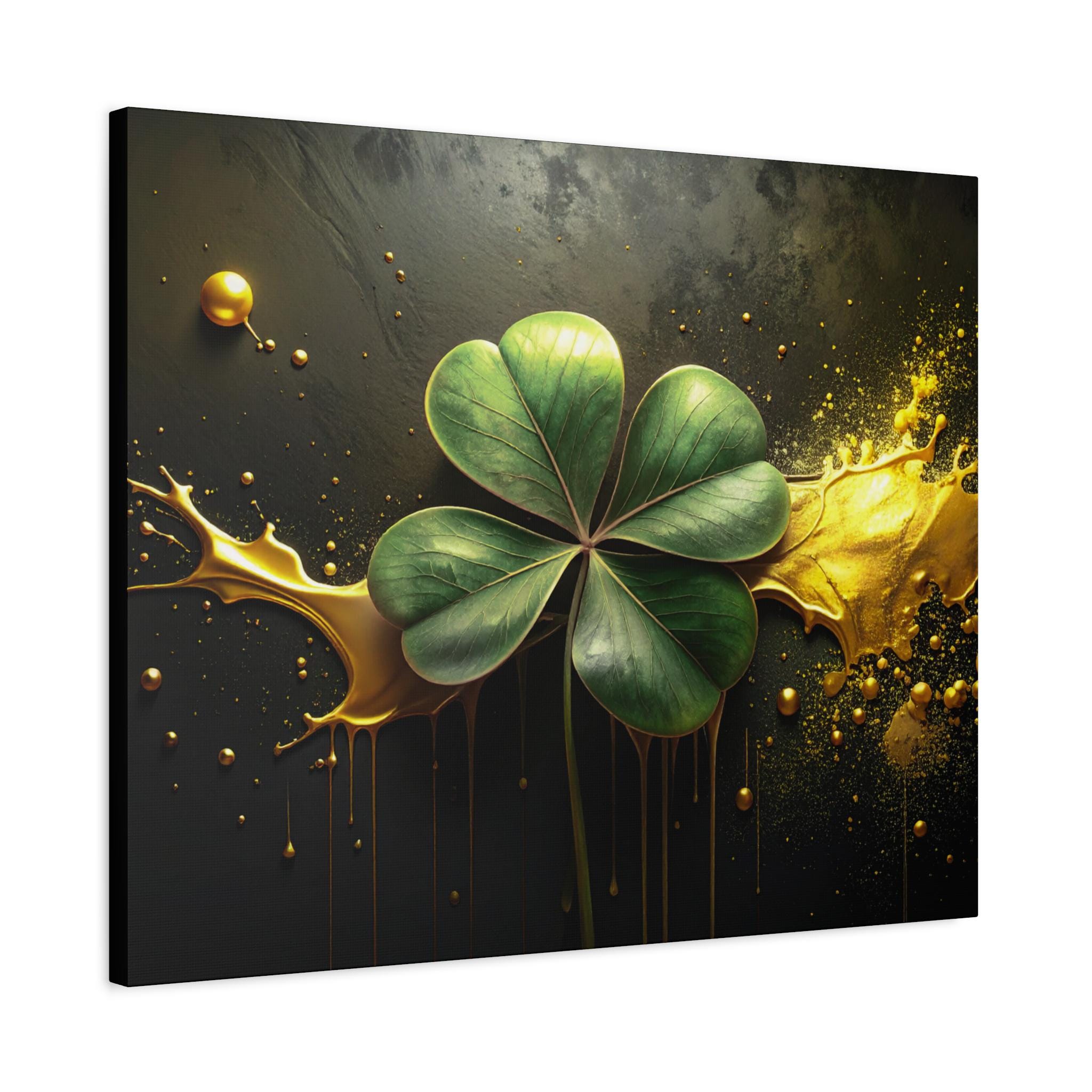 A matte stretched canvas that brings a quiet, elegant moment into any room. Deep charcoal and gold tones cradle a luminous four-leaf clover rendered with painterly detail—each leaf catching light against a moody, textured background. The 1.25" profile gives the piece presence on the wall without overwhelming a space. It hangs securely thanks to soft rubber corner supports and a built-in back hanger, and the image quality stays vivid over time thanks to Greenguard Gold-certified latex inks. This canvas feels like a found treasure—sophisticated, slightly mysterious, and ready to anchor a living room, study, or entryway with subtle symbolism and rich color.