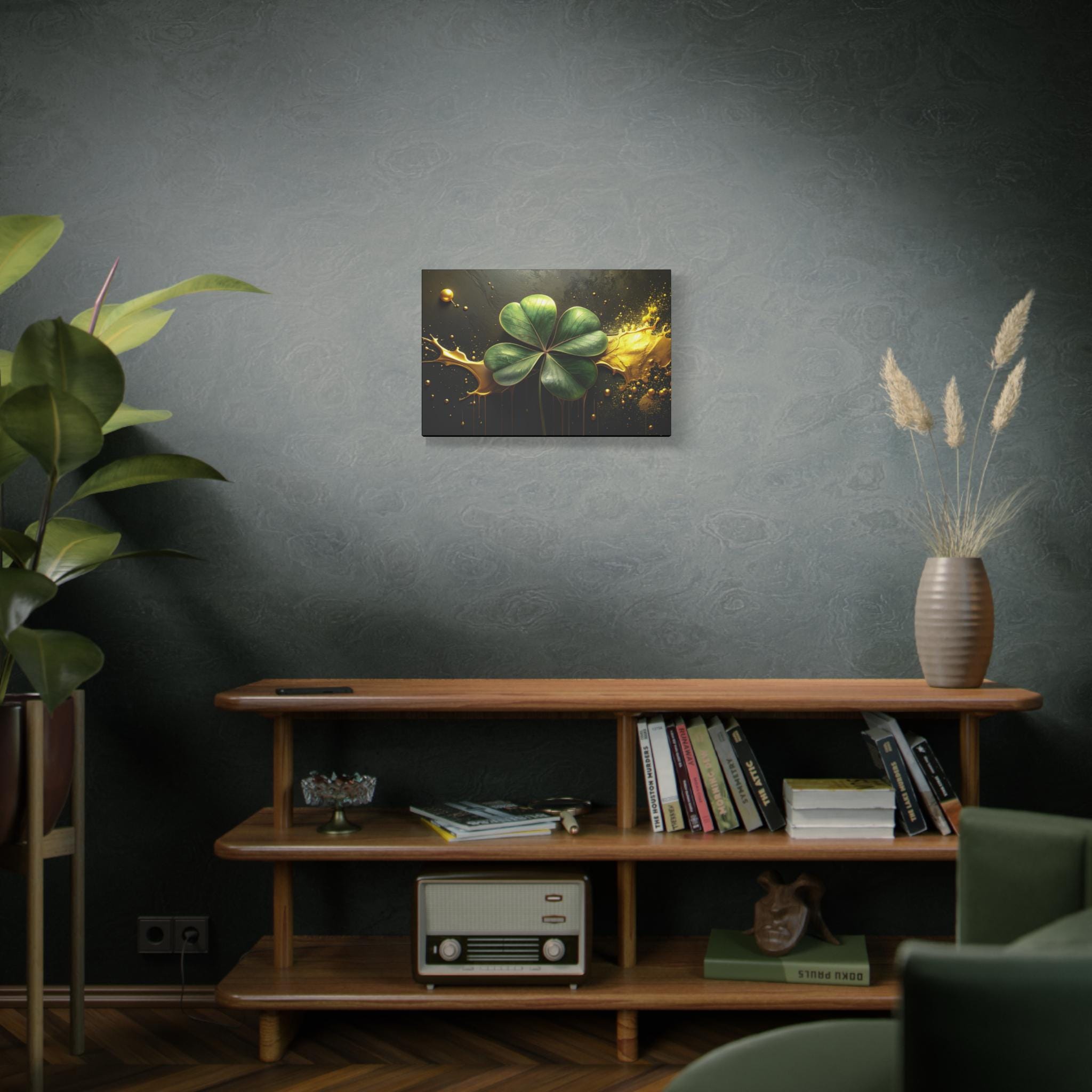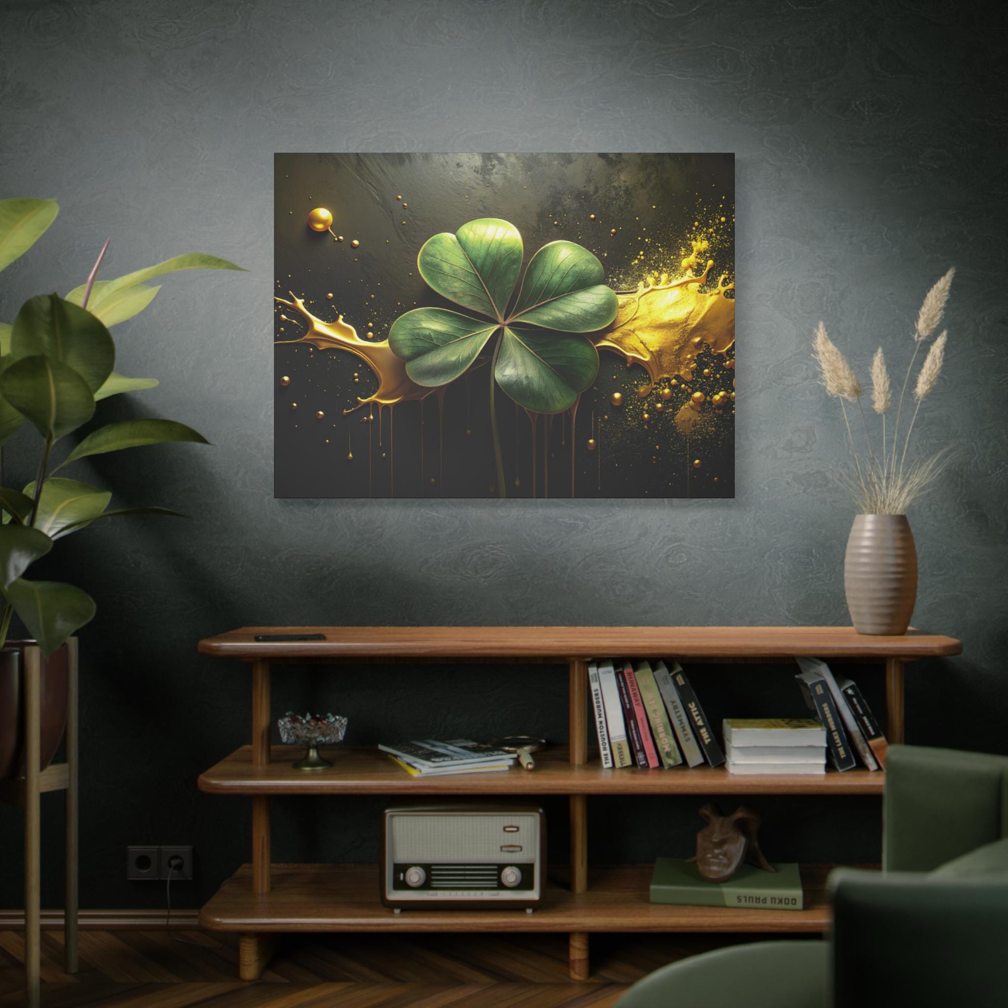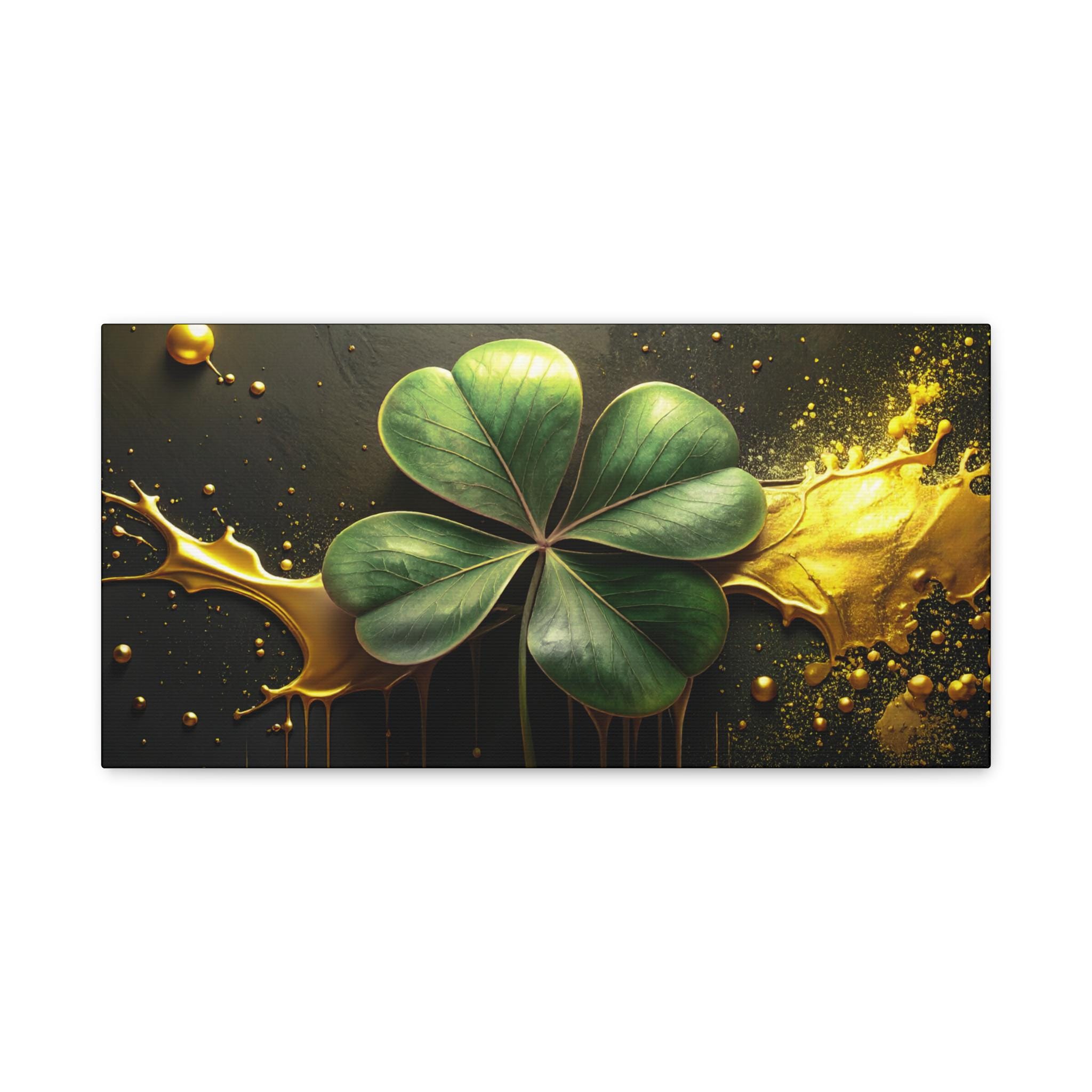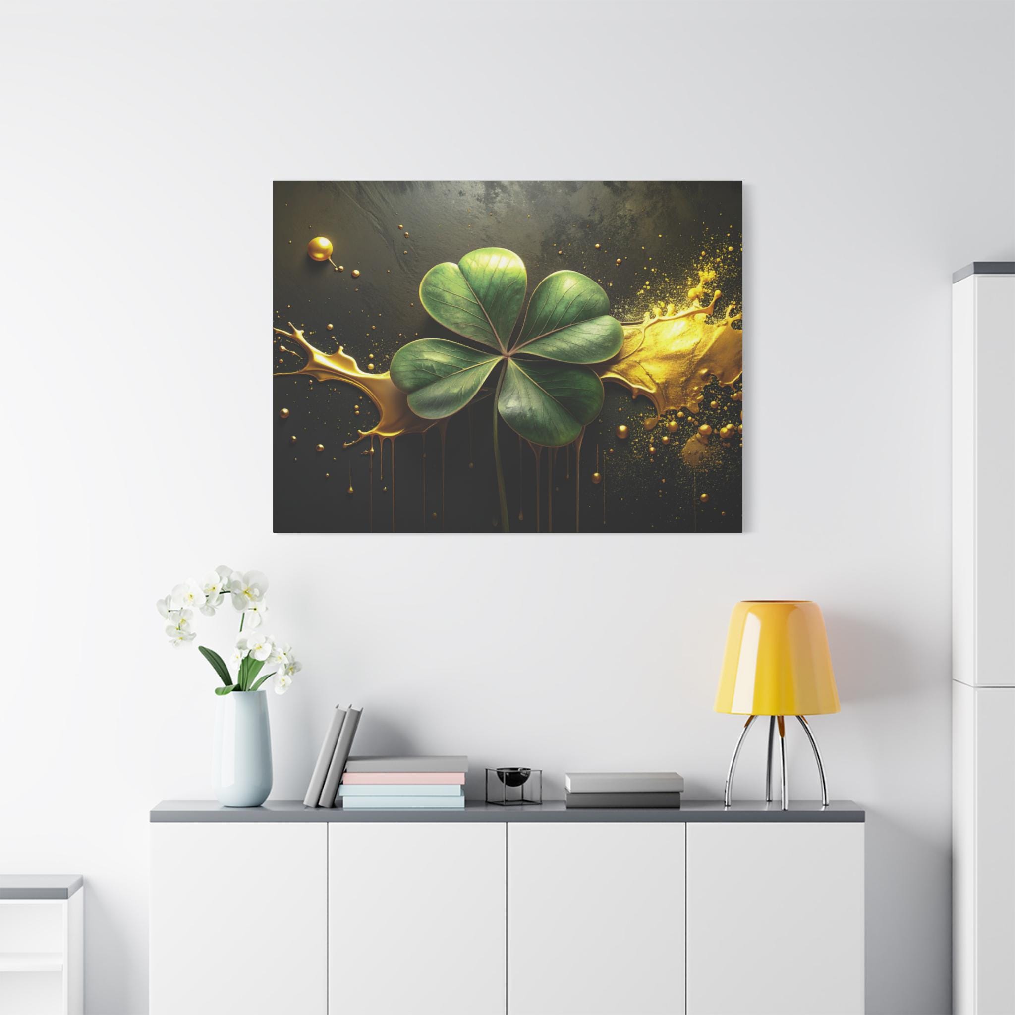 A matte stretched canvas that brings a quiet, elegant moment into any room. Deep charcoal and gold tones cradle a luminous four-leaf clover rendered with painterly detail—each leaf catching light against a moody, textured background. The 1.25" profile gives the piece presence on the wall without overwhelming a space. It hangs securely thanks to soft rubber corner supports and a built-in back hanger, and the image quality stays vivid over time thanks to Greenguard Gold-certified latex inks. This canvas feels like a found treasure—sophisticated, slightly mysterious, and ready to anchor a living room, study, or entryway with subtle symbolism and rich color.