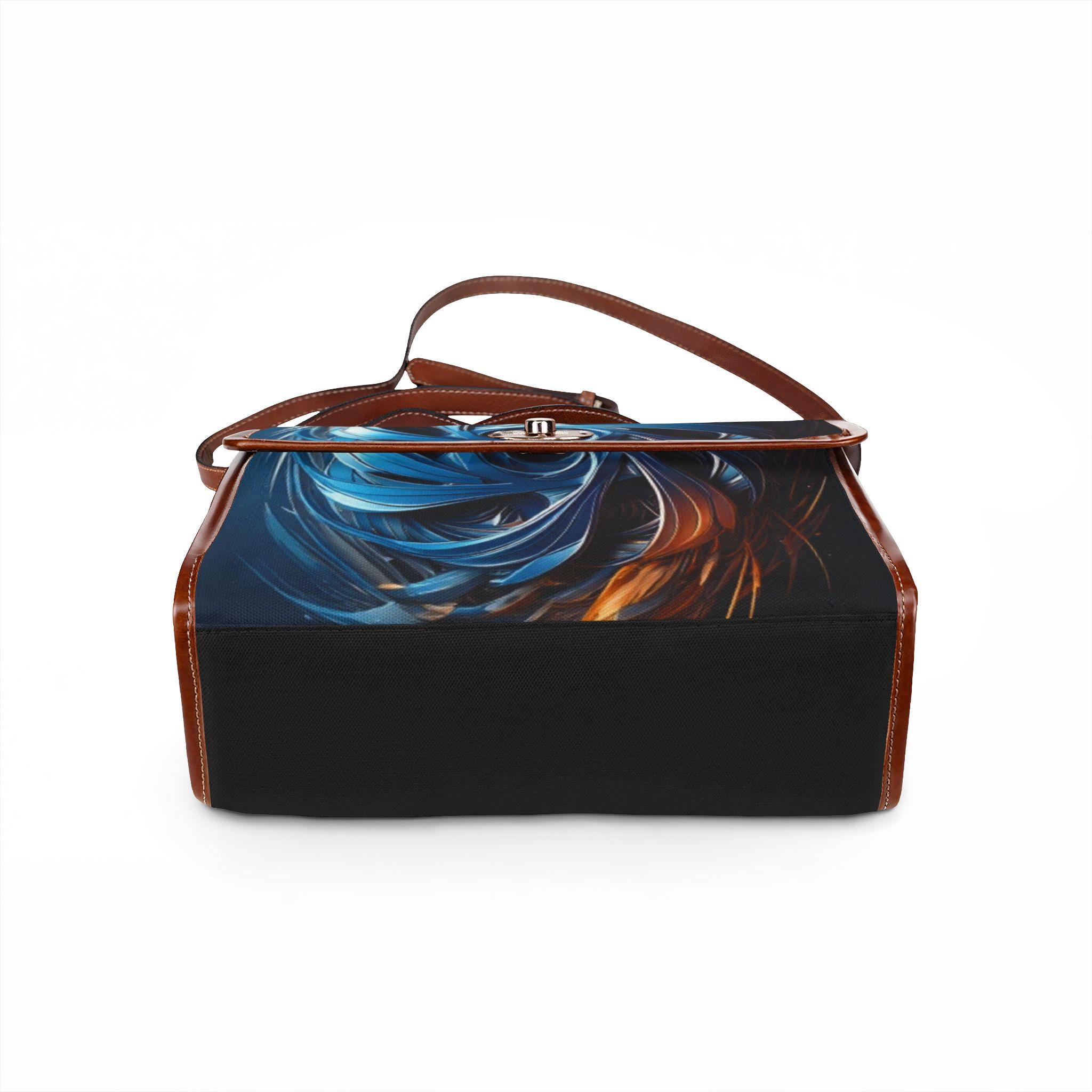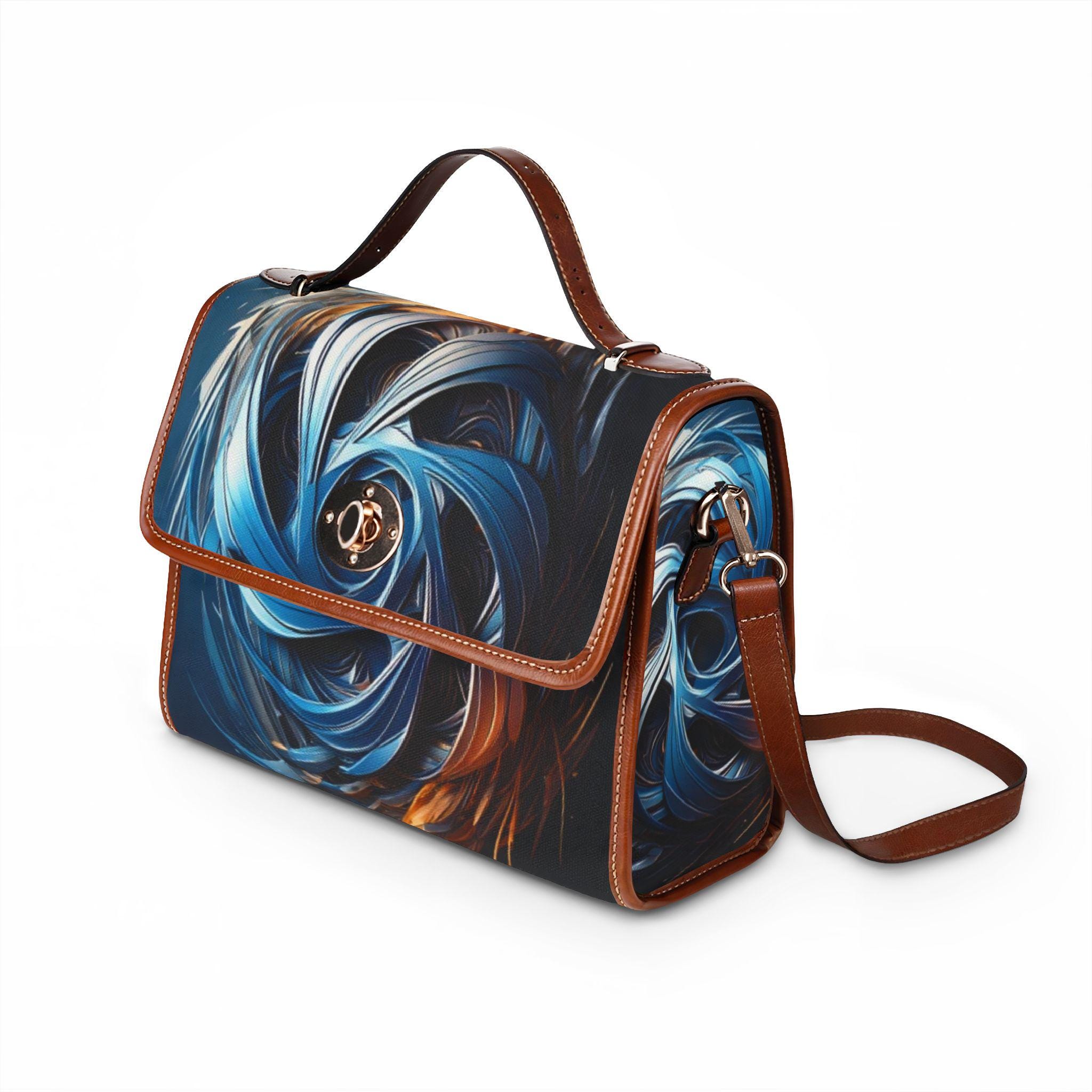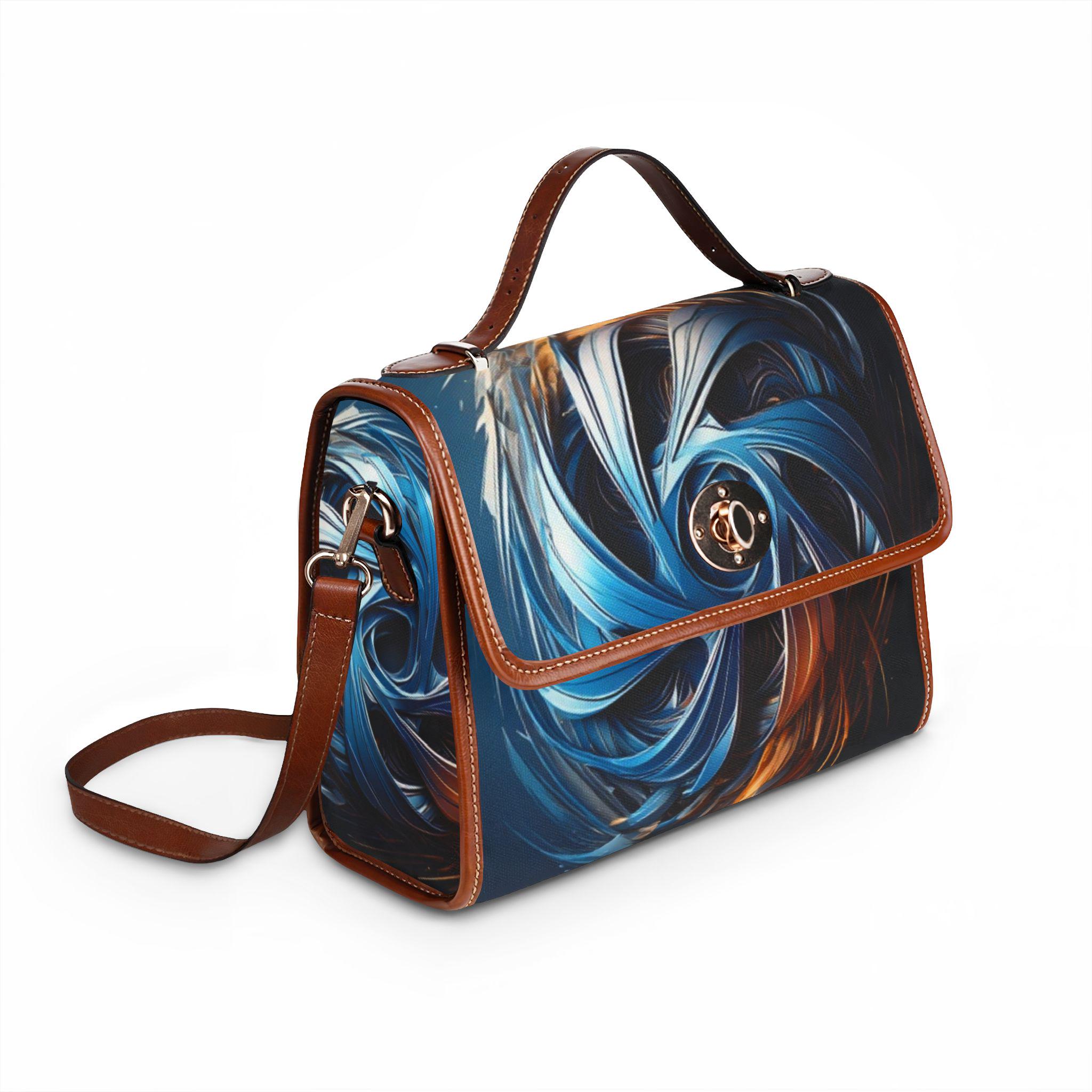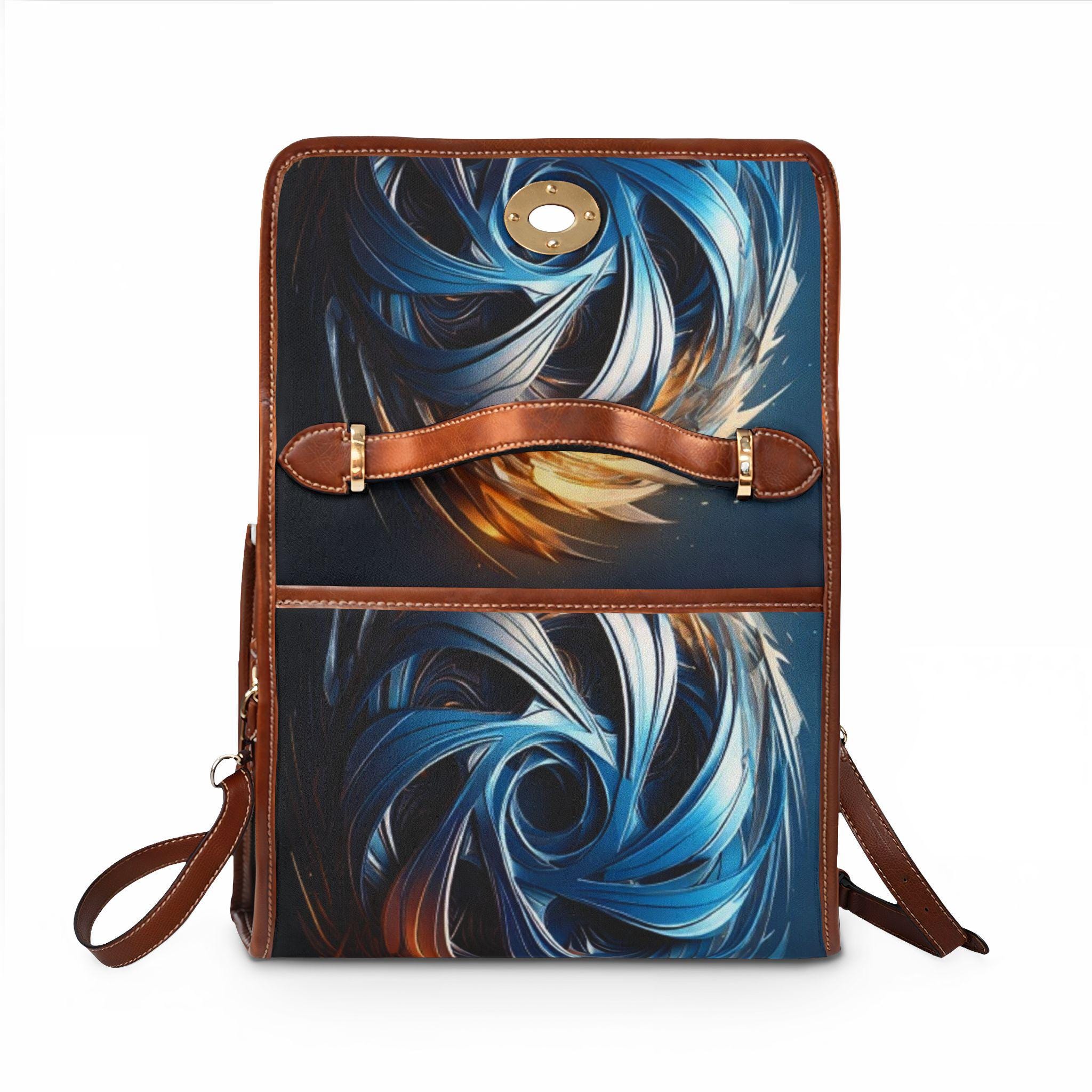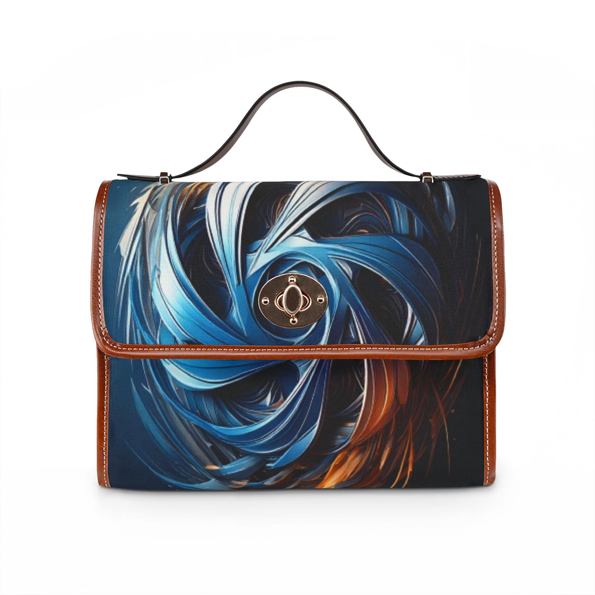 A compact, waterproof canvas bag that blends utility with expressive art. The swirling blue-and-amber print gives the bag a fluid, painterly energy that stands out without shouting. Carry it by the sturdy double PU leather handles for a polished look, or switch to the removable, adjustable leather shoulder strap when you need hands-free ease. Inside, two organized pockets—one zippered—keep small essentials secure and accessible. Built from high-grade waterproof canvas and accented with neat stitching and a secure turn-lock closure, this bag moves effortlessly from rainy commutes to creative afternoons at a café.