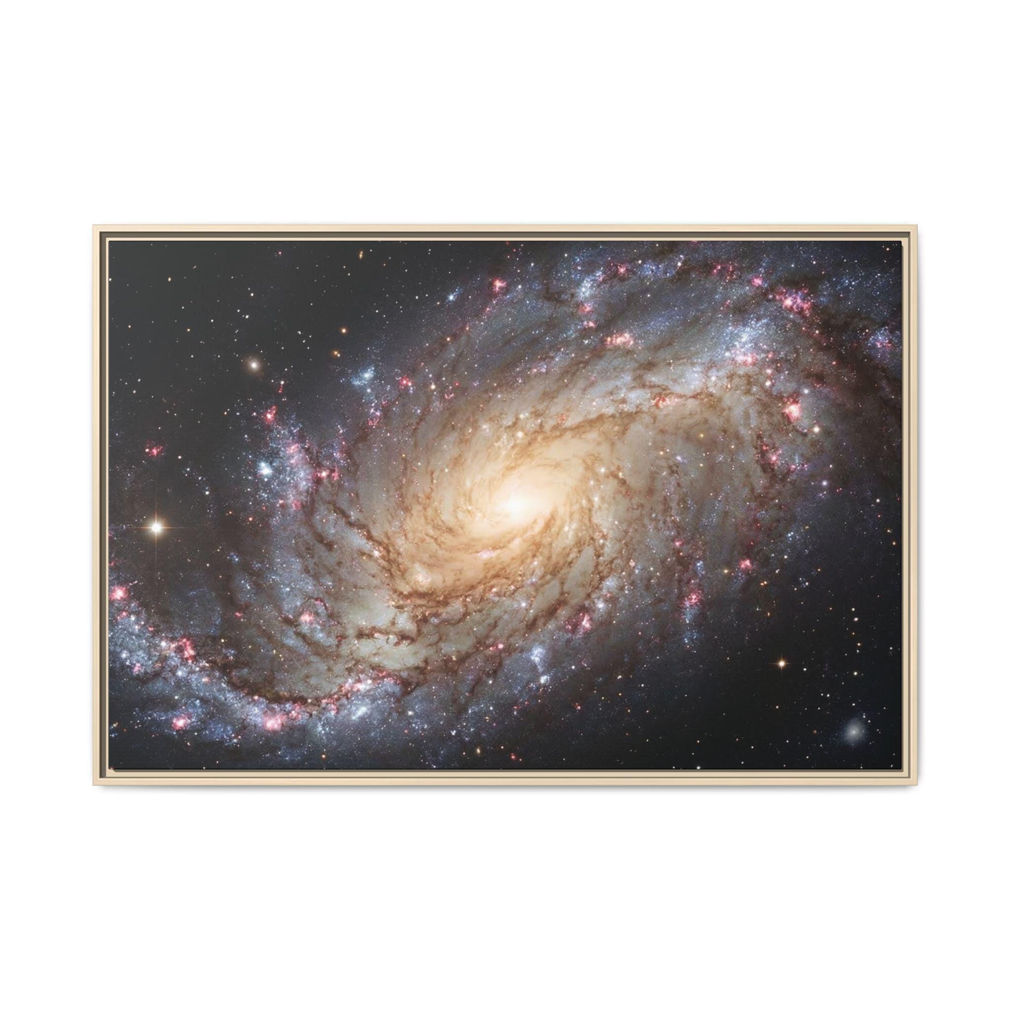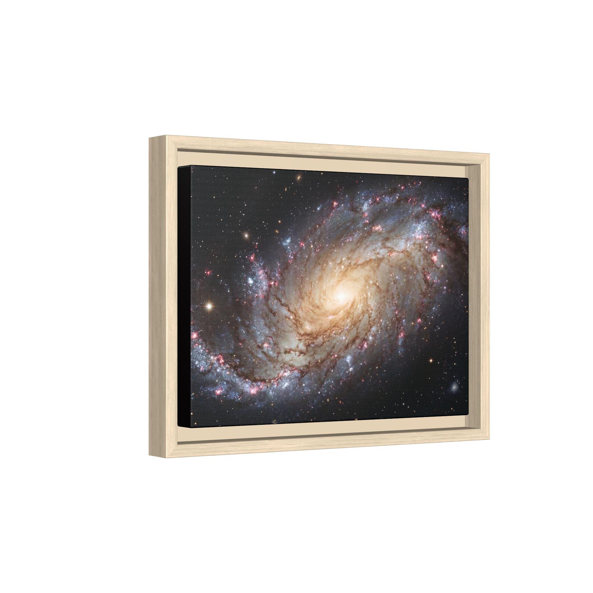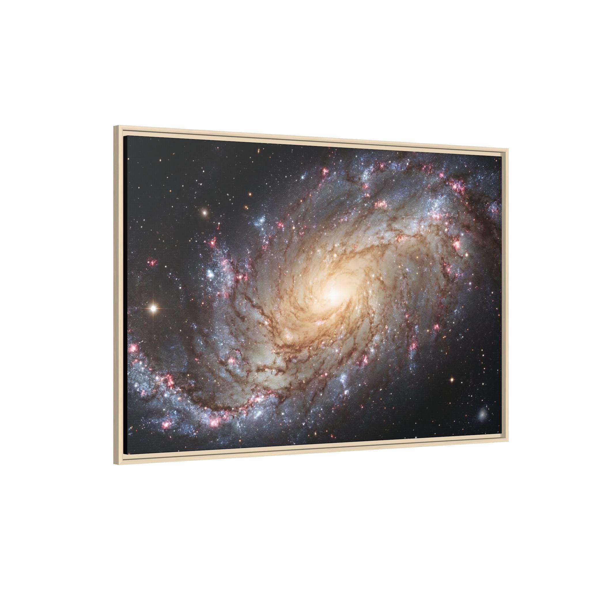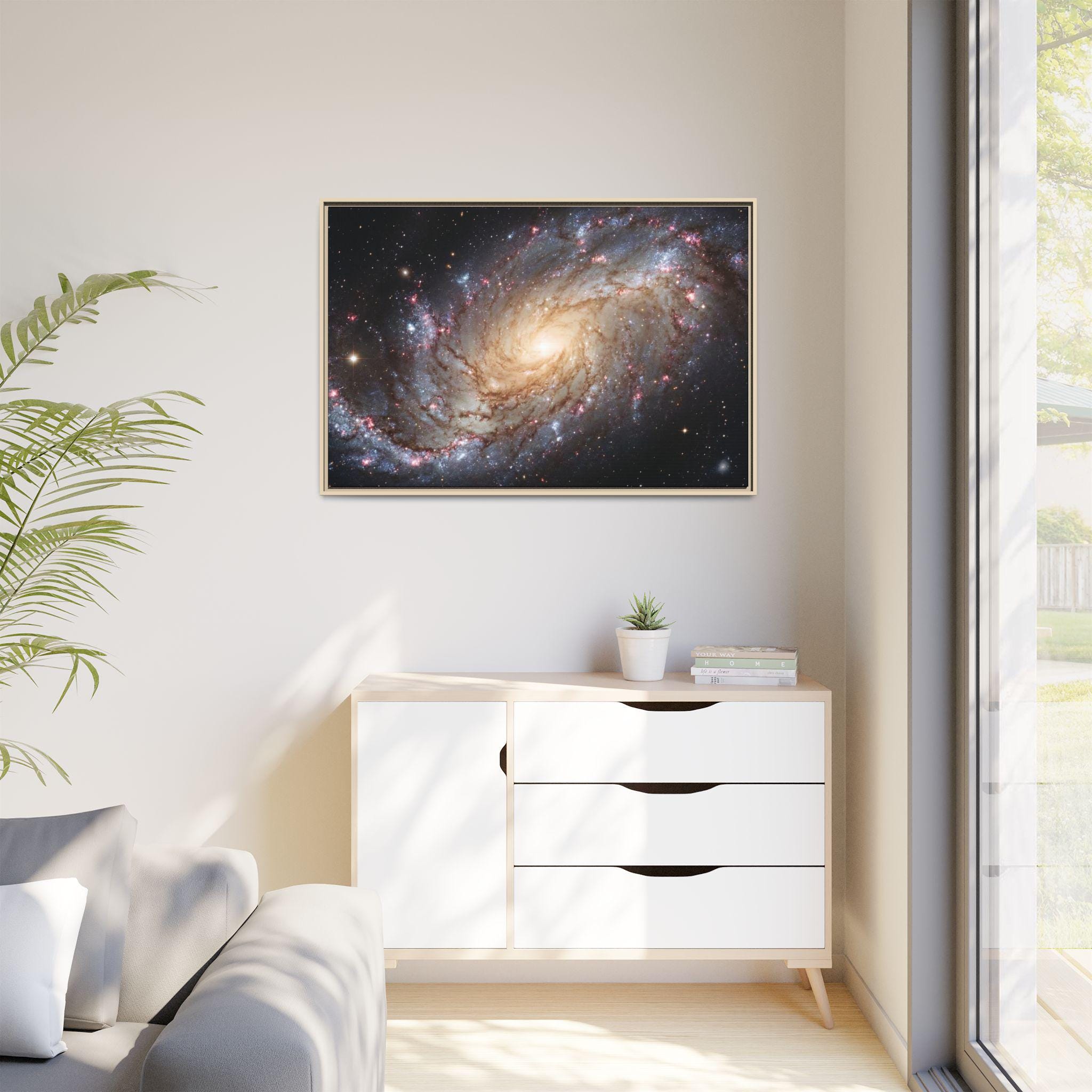 Hang the cosmos on your wall with this matte canvas print, framed in warm pine. The image’s swirling galaxy draws the eye inward—soft golden core, wisps of blue and rose nebulae, and pinpricks of starlight—rendered with vivid, archival inks that keep depth and texture alive. The low-reflective matte finish gives a museum-like presence without glare, while the slender pine frame adds an organic edge that balances the celestial subject. It settles naturally in a living room, studio, or reading nook and invites quiet evenings spent tracing spiral arms and imagining distant storms of light.
