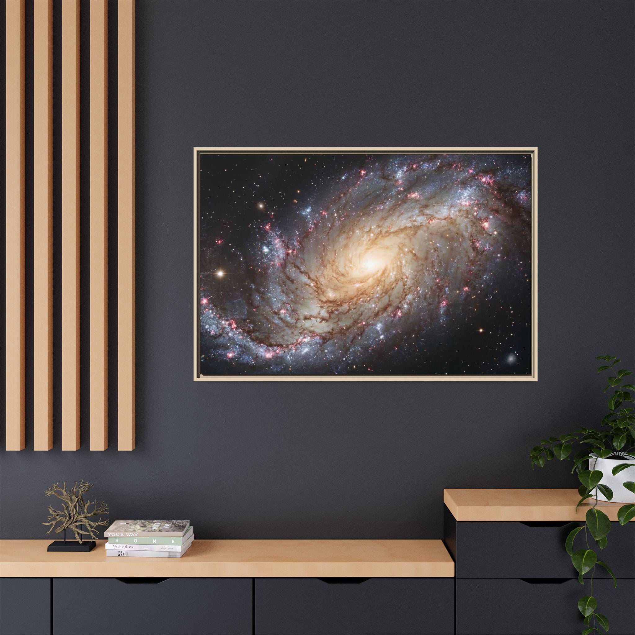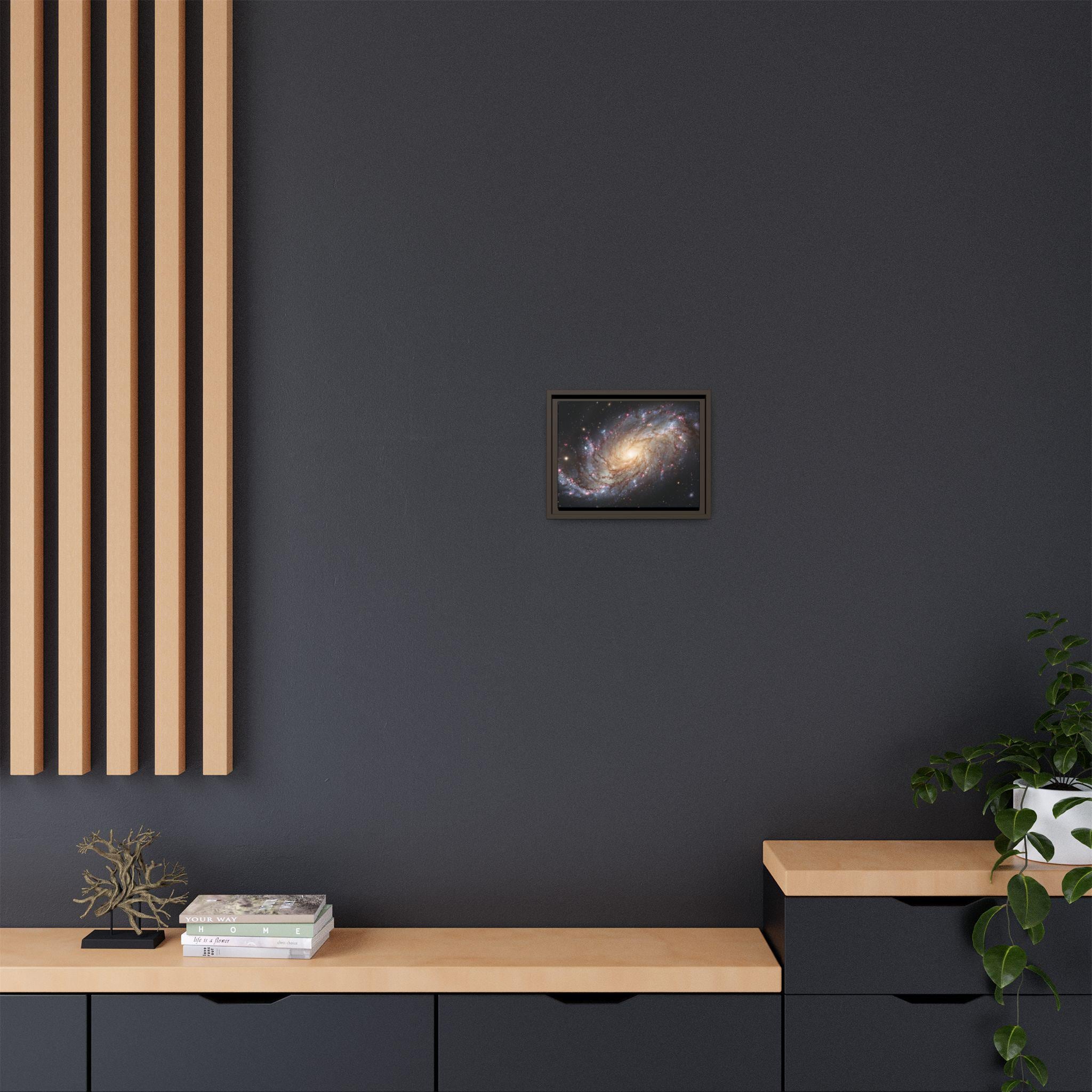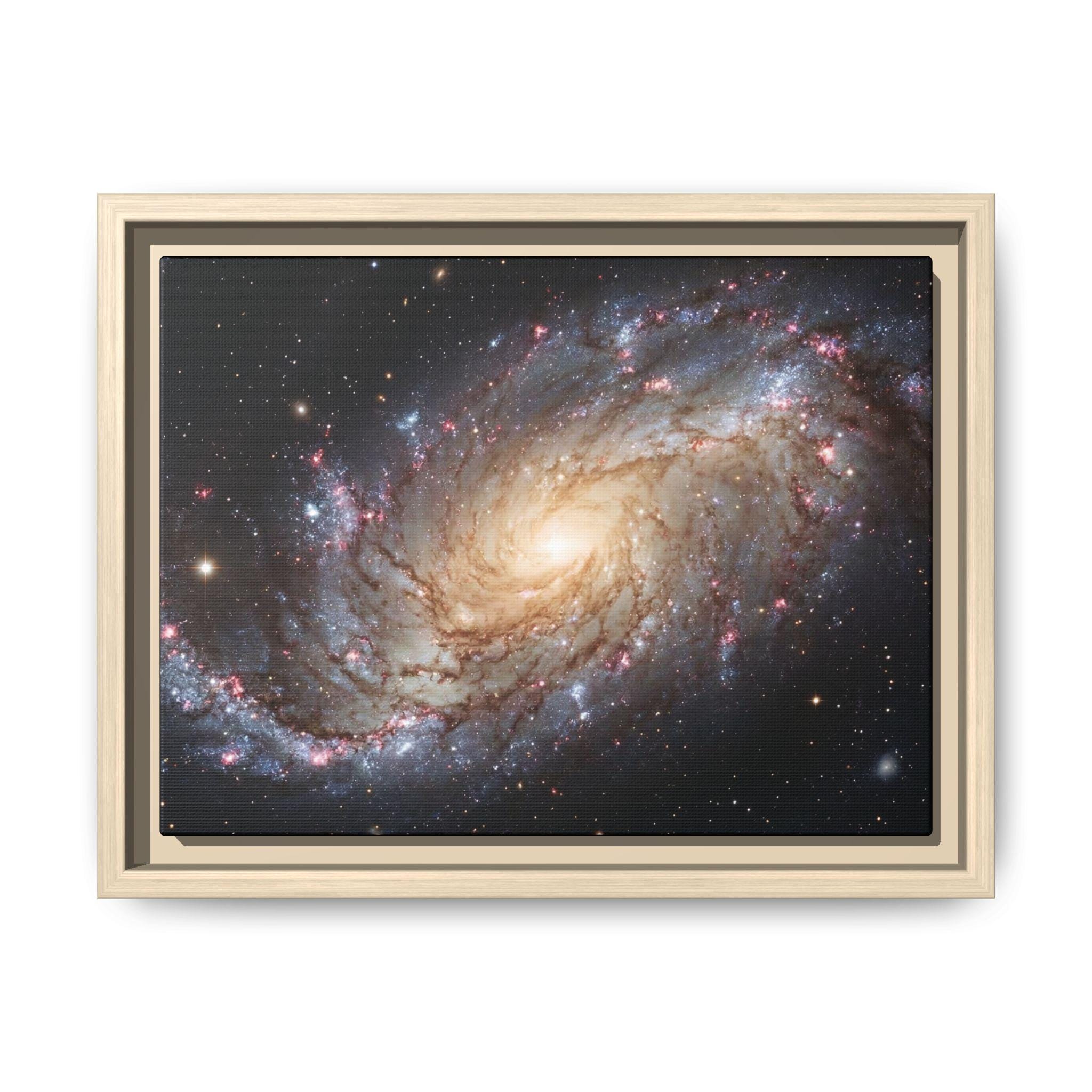 Hang the cosmos on your wall with this matte canvas print, framed in warm pine. The image’s swirling galaxy draws the eye inward—soft golden core, wisps of blue and rose nebulae, and pinpricks of starlight—rendered with vivid, archival inks that keep depth and texture alive. The low-reflective matte finish gives a museum-like presence without glare, while the slender pine frame adds an organic edge that balances the celestial subject. It settles naturally in a living room, studio, or reading nook and invites quiet evenings spent tracing spiral arms and imagining distant storms of light.