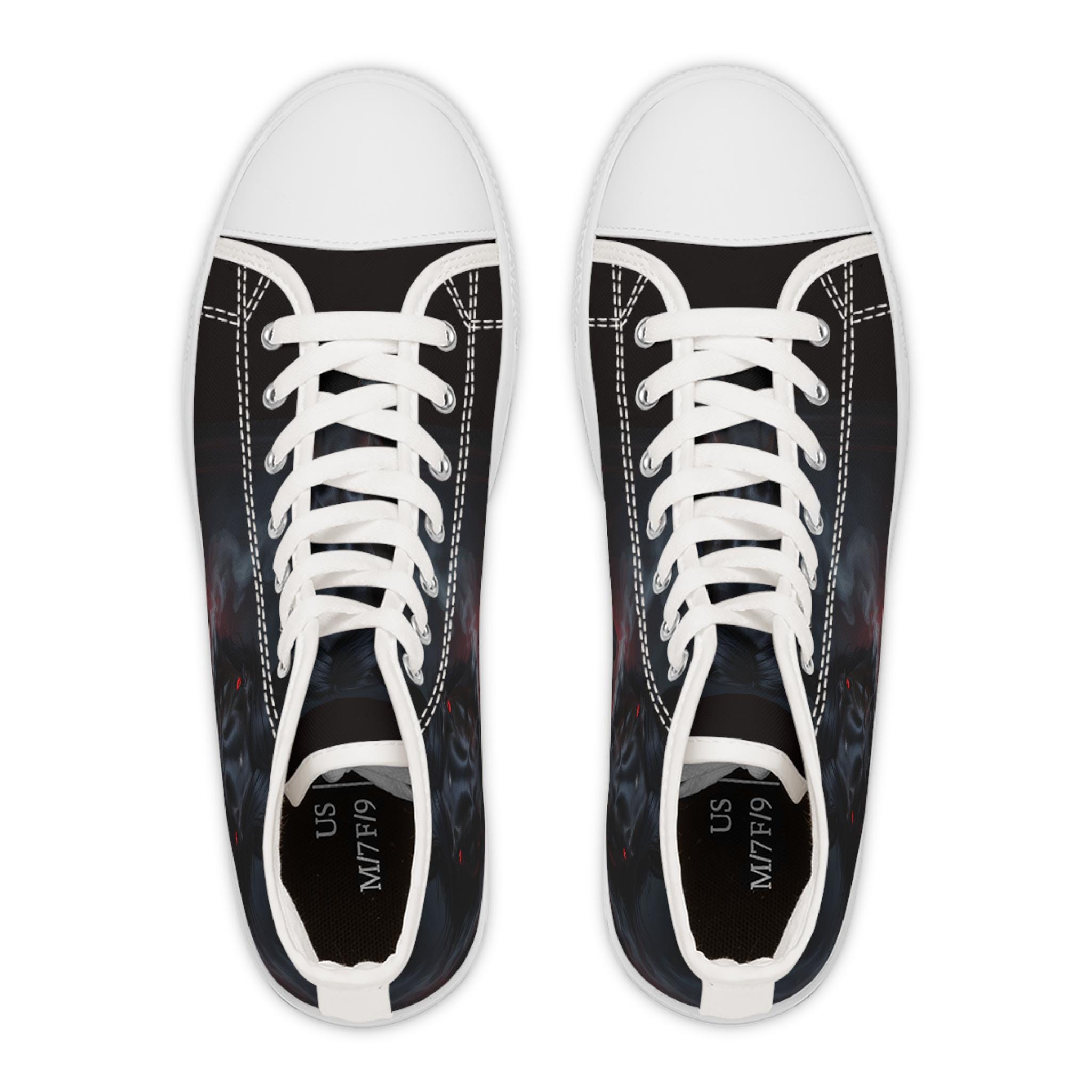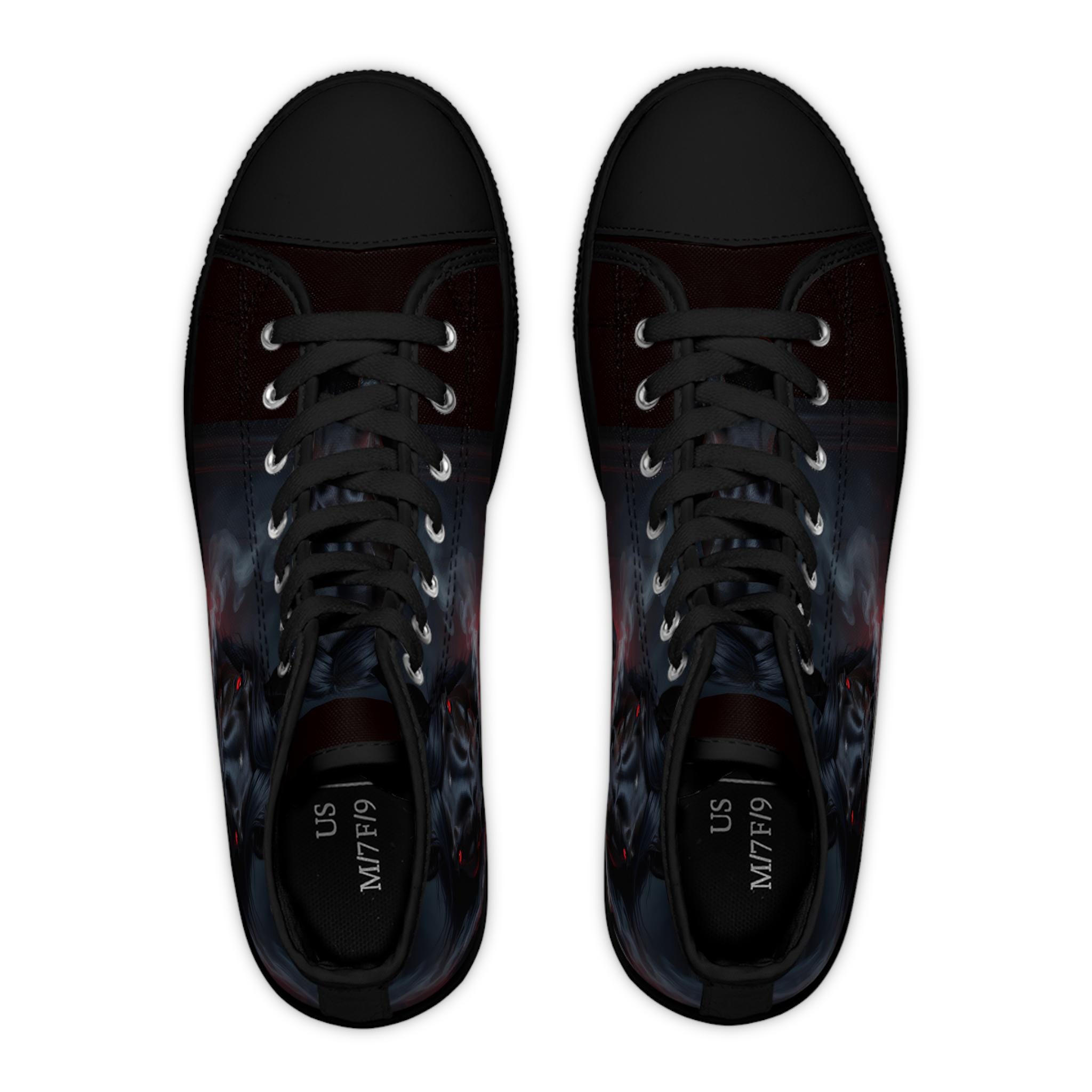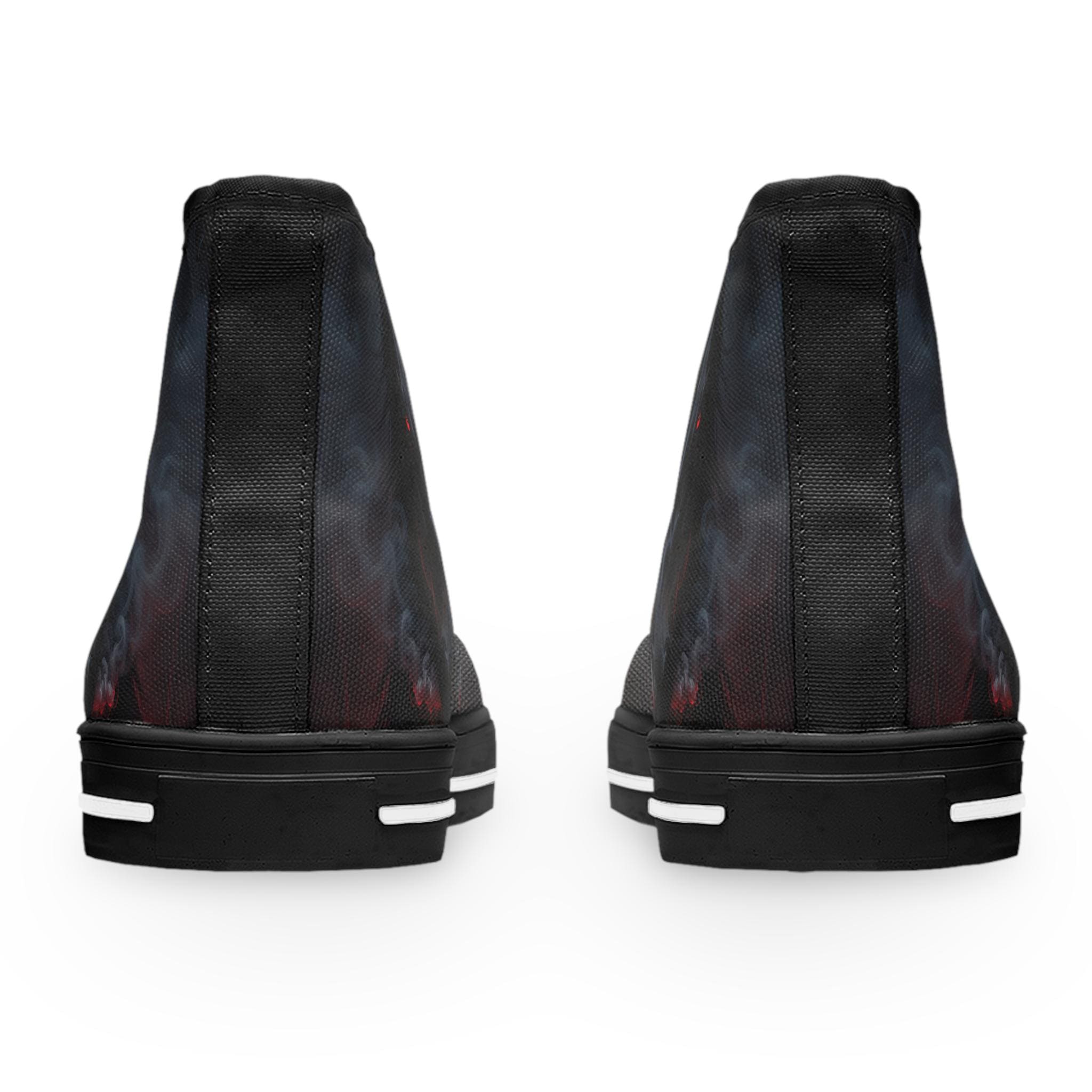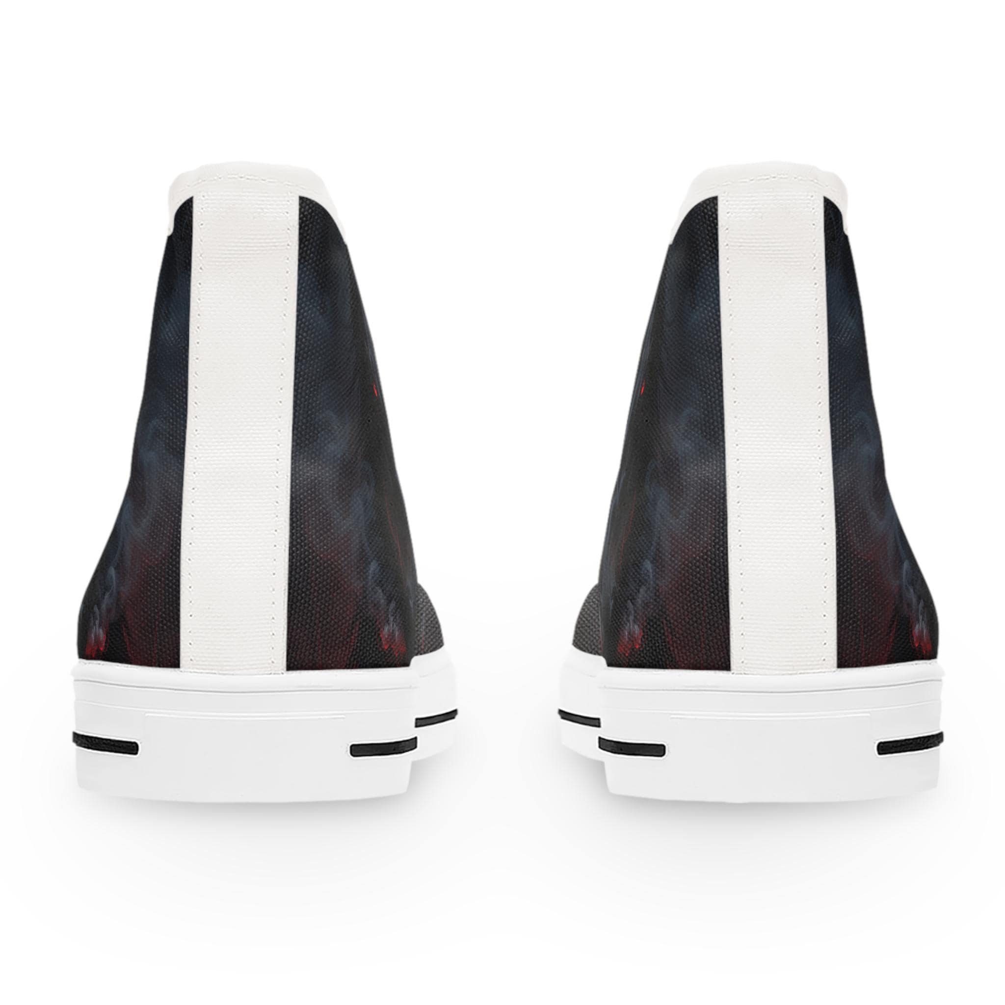 These high-top canvas sneakers bring a dark, smoky edge to everyday wear. The wraparound print blends deep blacks and muted plumes of color for a brooding, artful look that reads like a mini canvas on your feet. Built with cushioned EVA memory-foam insoles and a flexible, shock-absorbing midsole, they move with you all day without feeling heavy. Metal eyelets and pleather-reinforced toes add durability where it counts. Wear them with cropped jeans, layered streetwear, or a flowing dress to let the design peek through — they add quiet attitude without shouting for attention.
