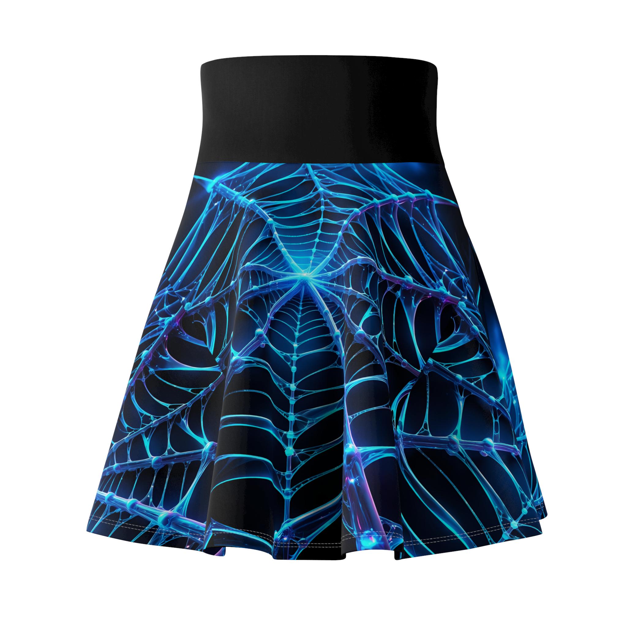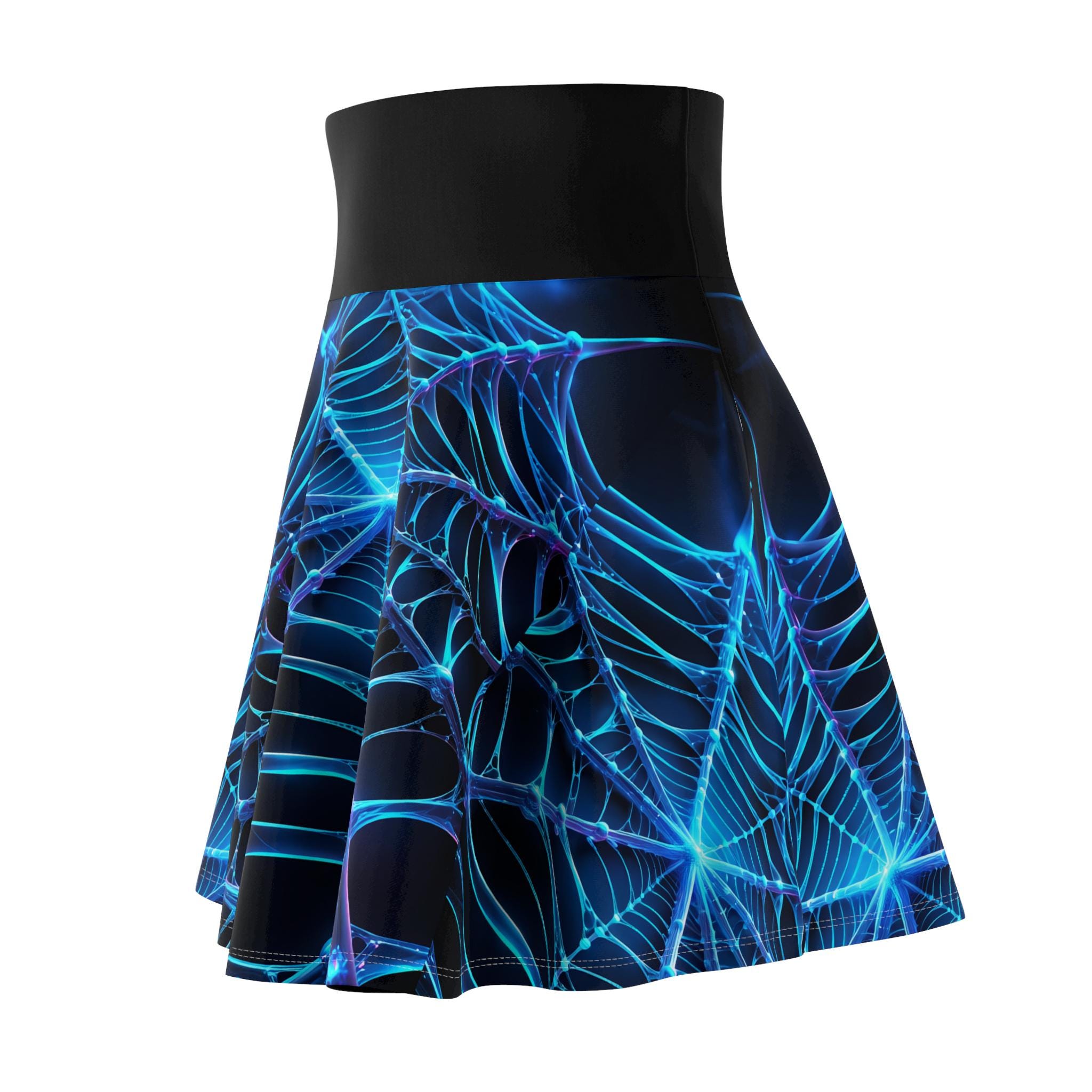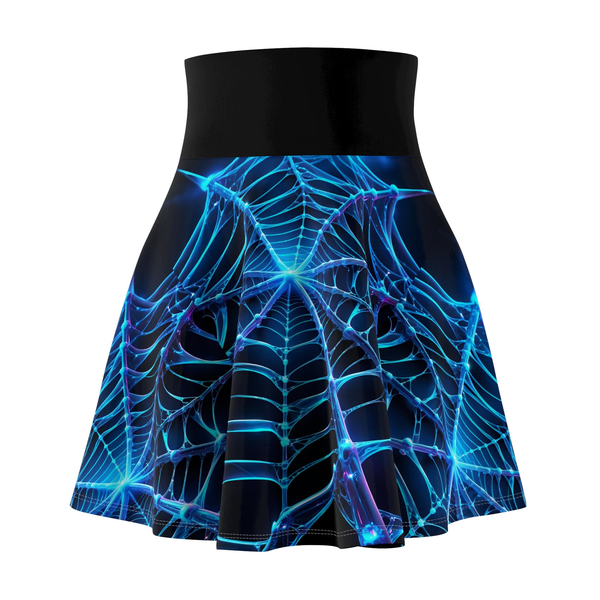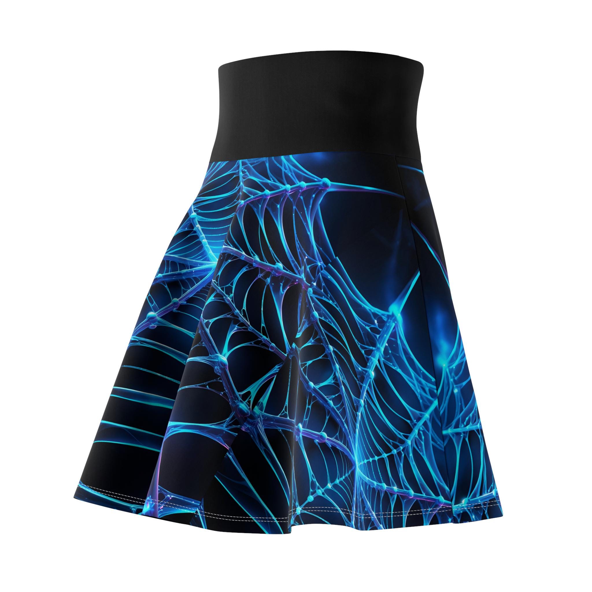 This flared skater skirt brings a bold, electric energy to casual and festival wardrobes. Vivid neon-blue webbing flows across a deep black field, catching the eye with luminous highlights and a sense of motion. The high-rise double waistband sits securely while the swingy A-line cut moves with you—great for dancing, wandering city nights, or layering under a moto jacket. Wear it when you want an edgy, futuristic mood: it reads cyber-goth and street-rave without trying too hard. The fabric’s four-way stretch and flat seams keep the silhouette smooth and comfortable, so the focus stays on the graphic and whatever you pair it with.