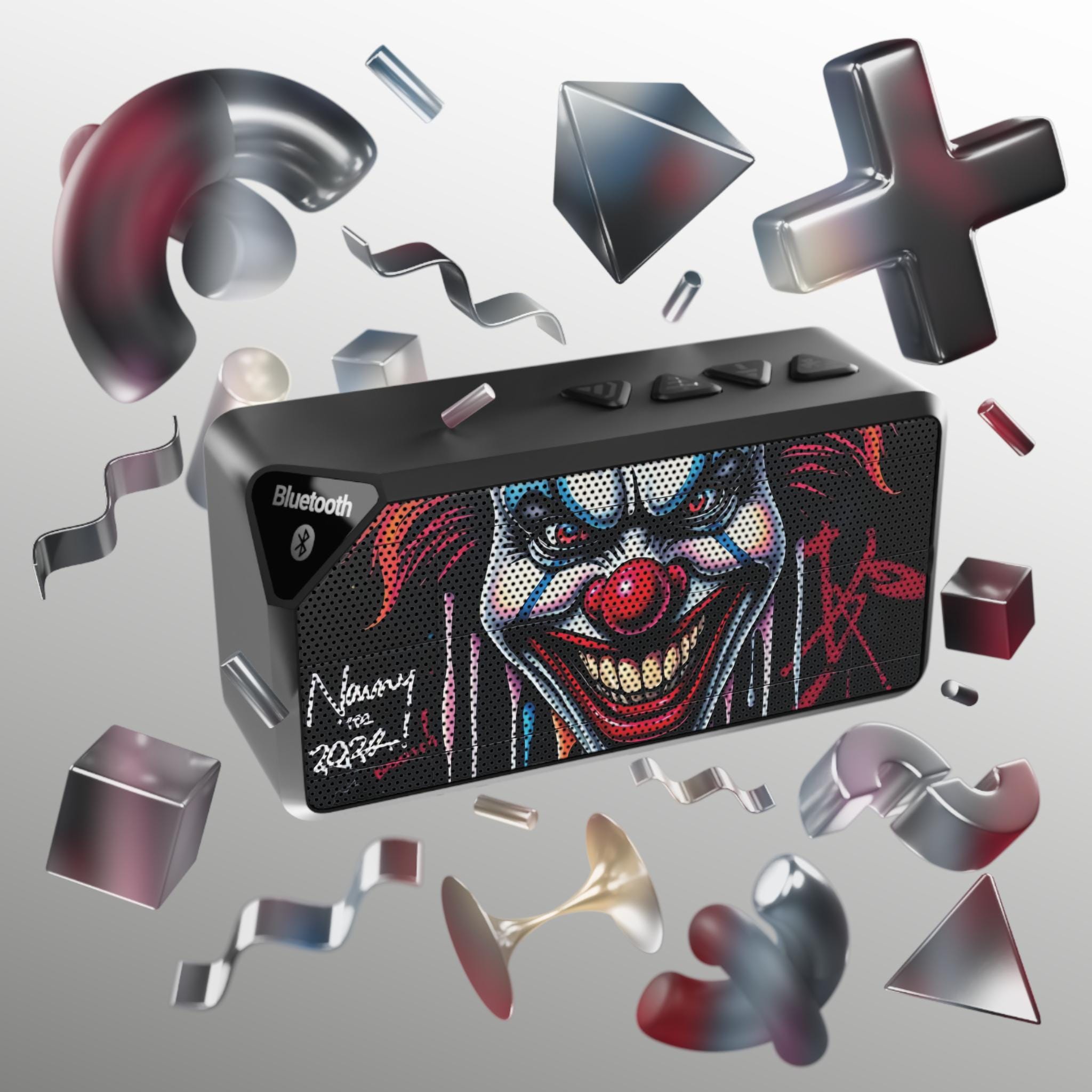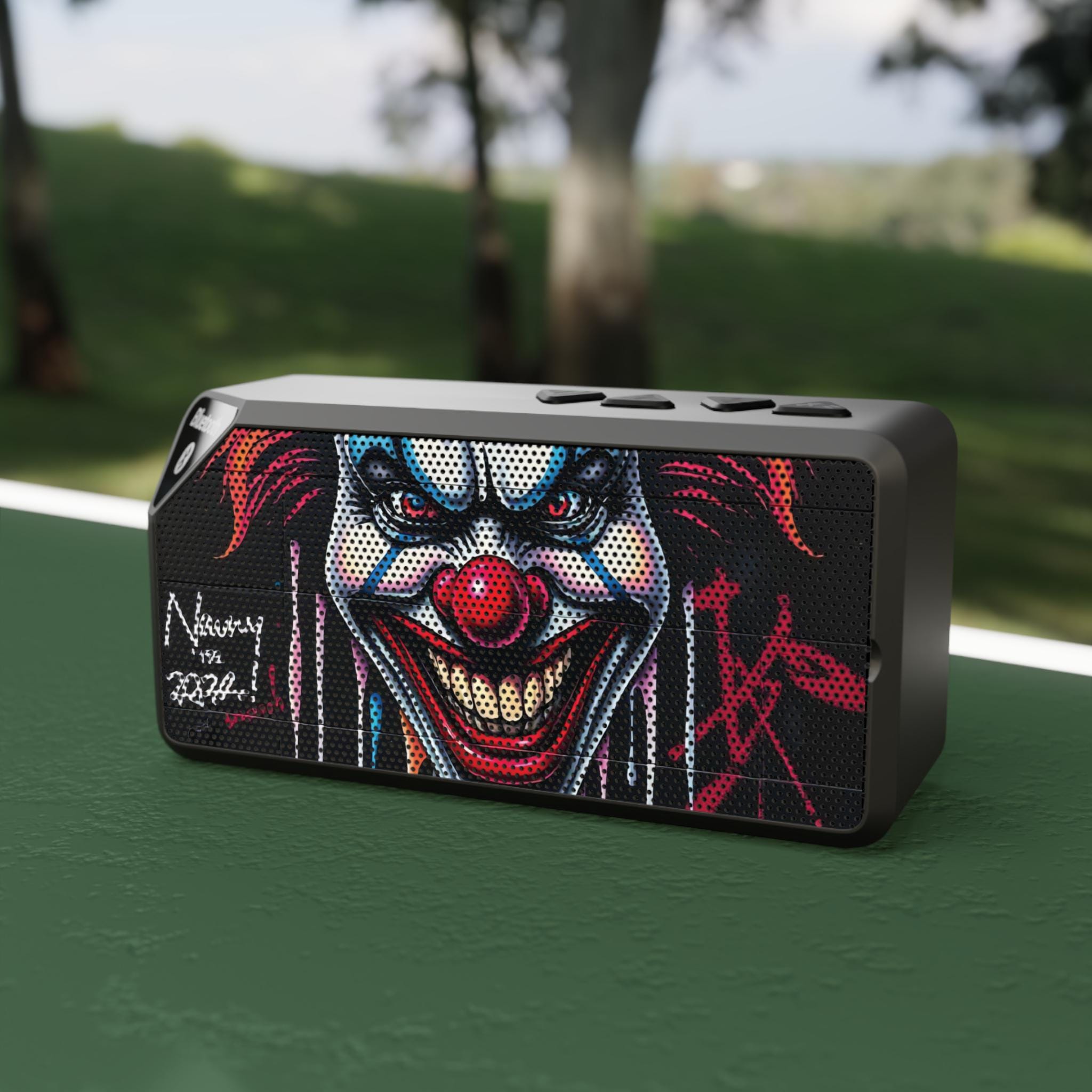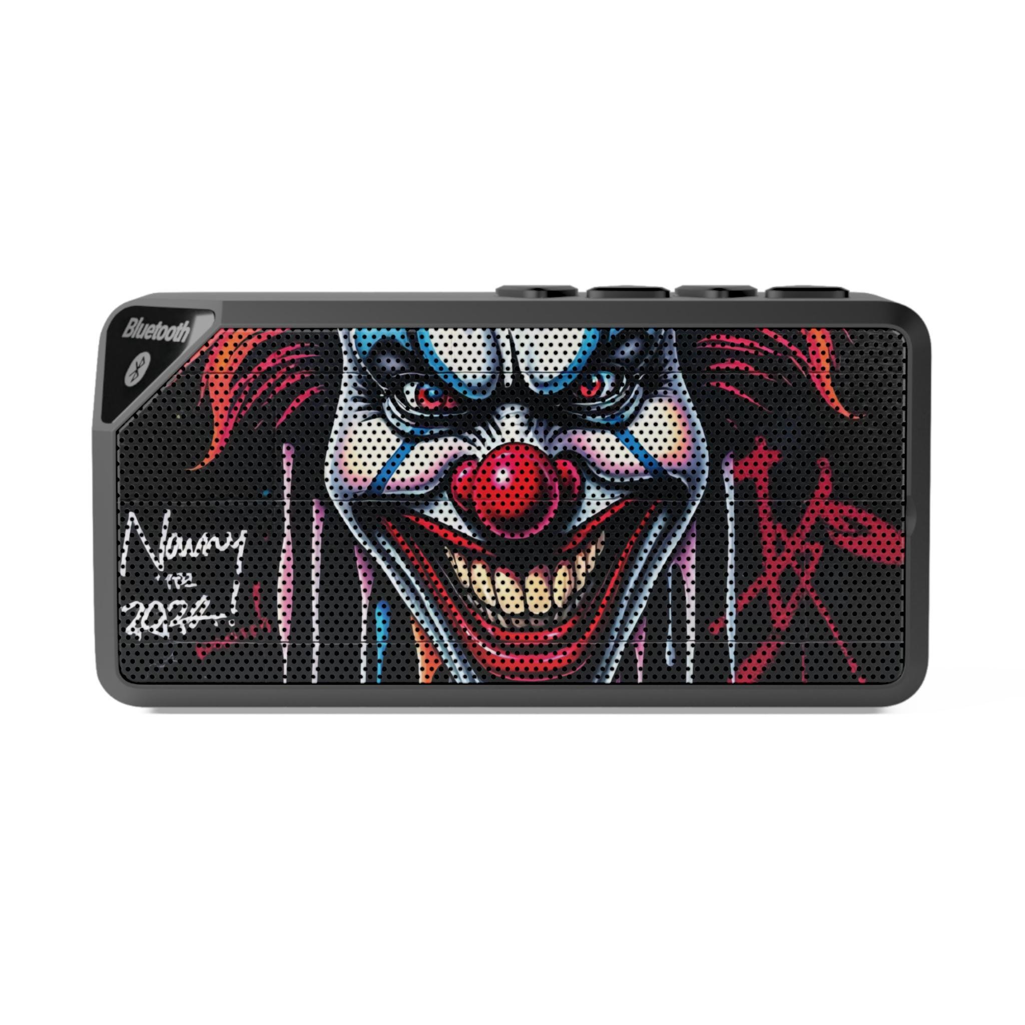 A compact, bold Bluetooth speaker that brings gritty street-art attitude to every playlist. The front grille features an intense, hand-painted clown design with graffiti-style signatures, so the speaker reads like a mini art piece as much as an audio device. It slips easily into a backpack or sits on a desk, filling small rooms, porches, and late-night hangouts with clear, punchy sound. Use Bluetooth or the included aux port to connect phones, tablets, or laptops; the built-in 500mAh Li-ion battery powers up to about two hours of listening at full volume. Rugged ABS housing stands up to daily use while the simple top controls make skipping tracks and adjusting volume fast and tactile. This speaker matches the energy of street performers, skateboard sessions, and bedroom producers who want loud personality with portable functionality.