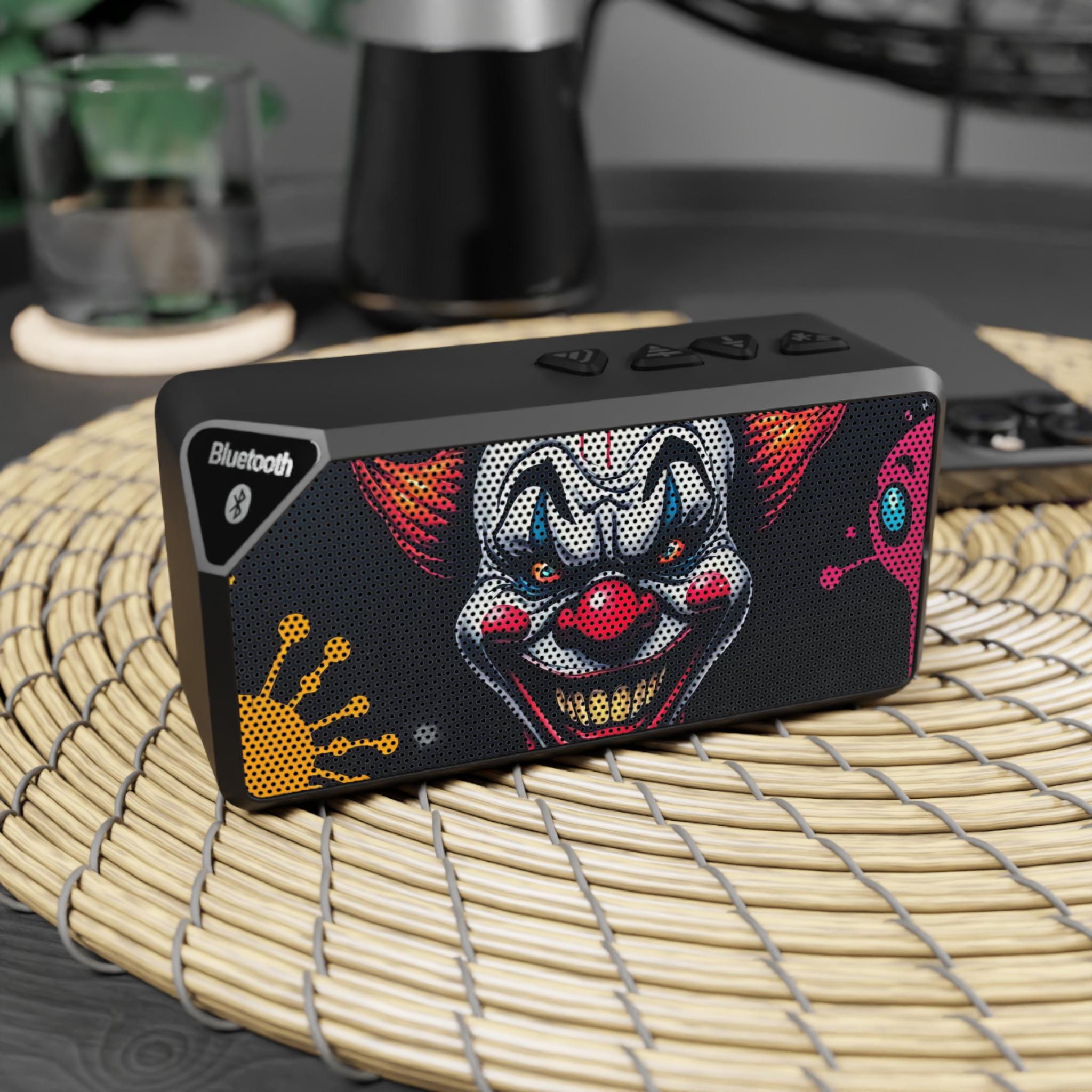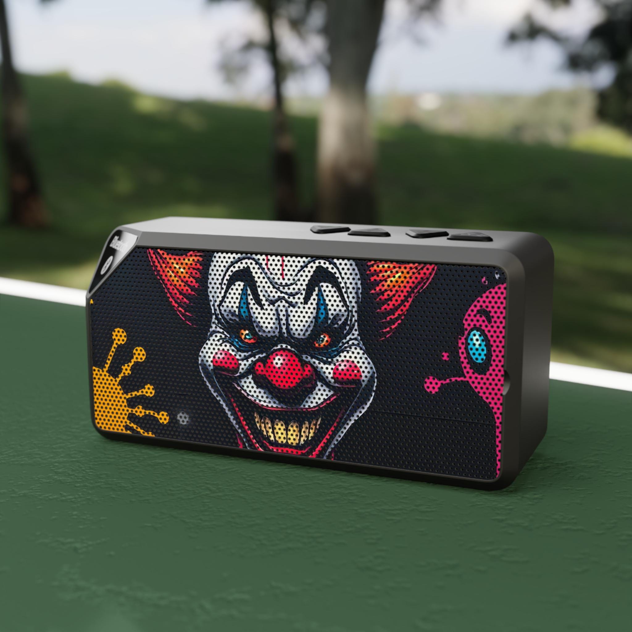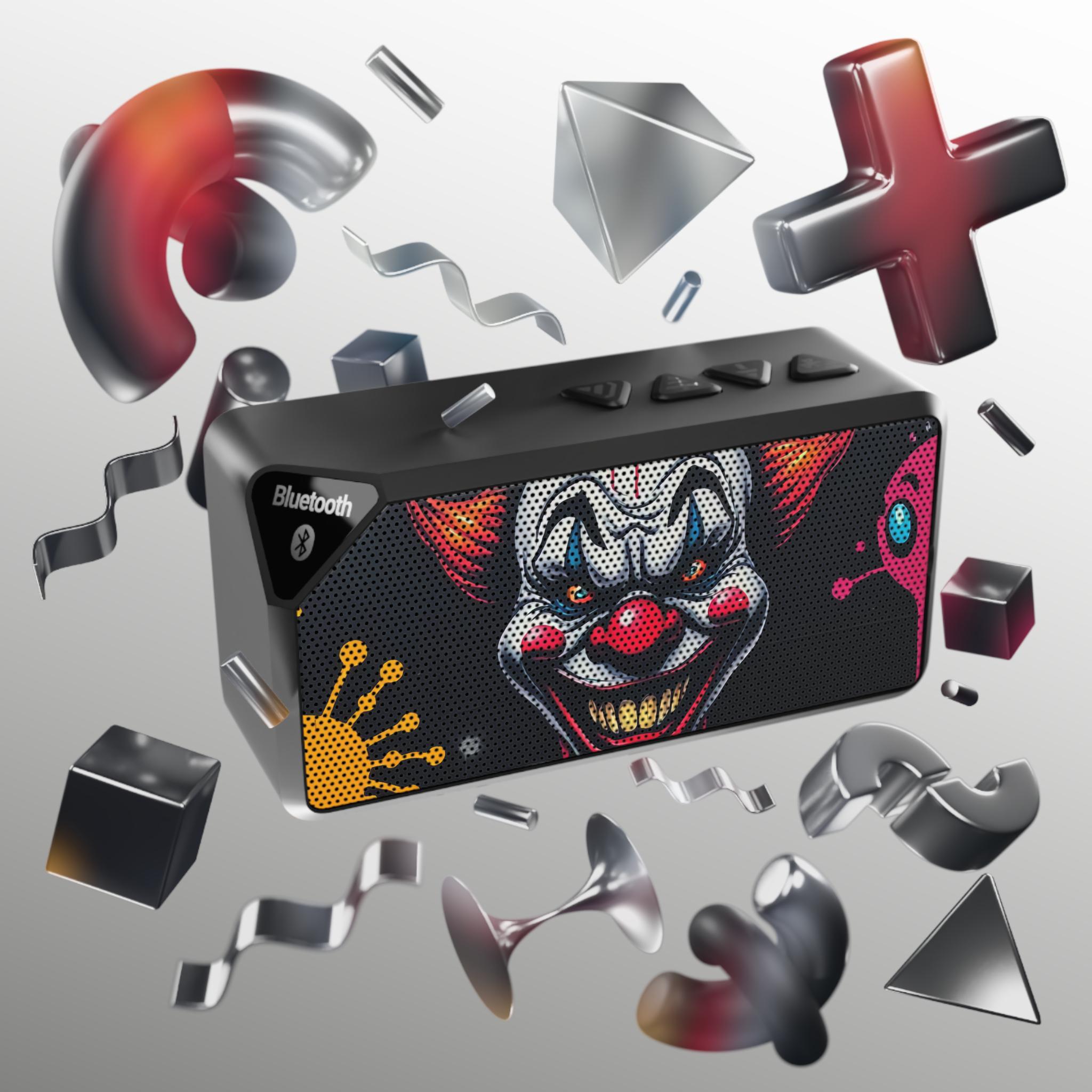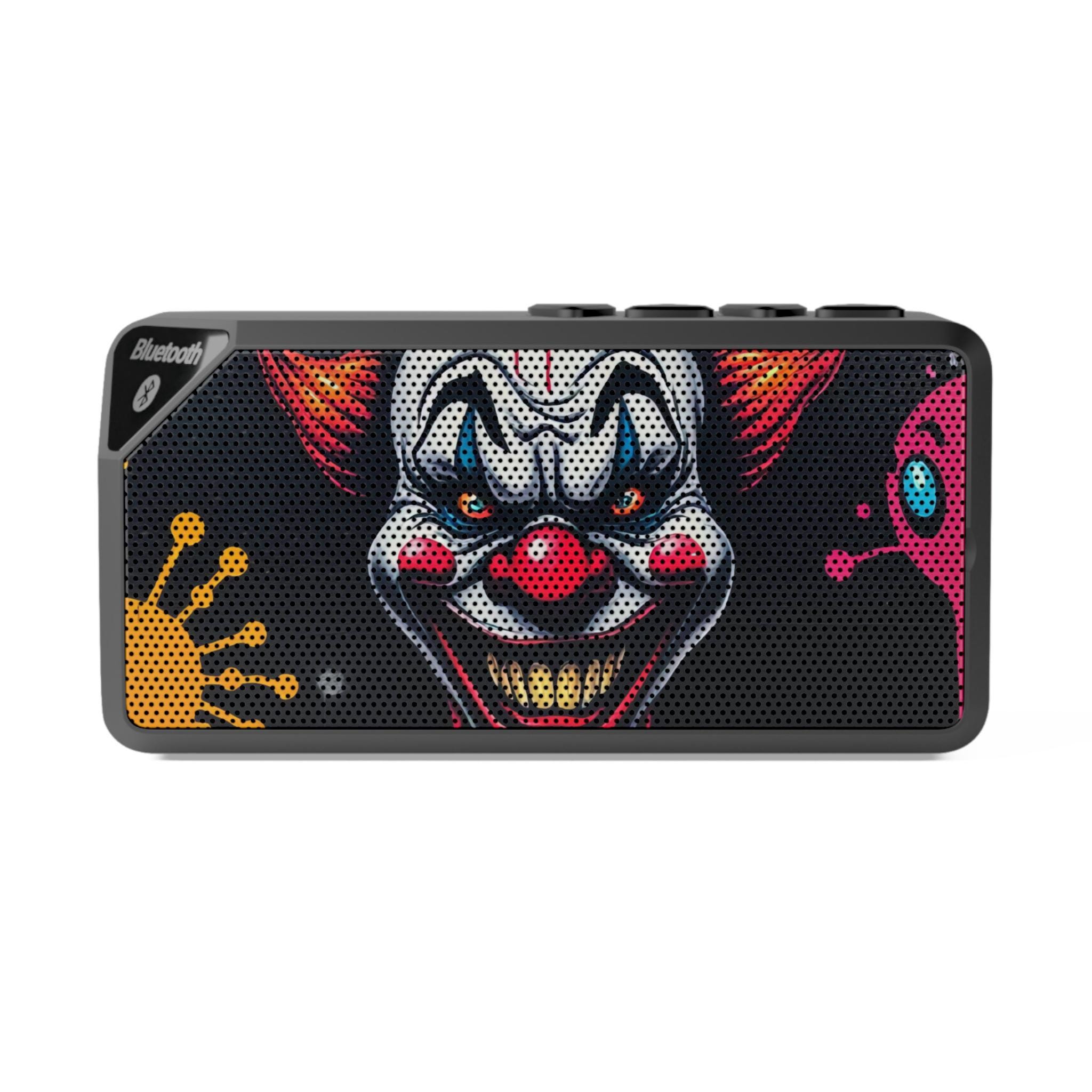 This compact Bluetooth speaker brings gritty, playful energy to any playlist. Its bold clown graphic makes a statement on desk, shelf, or nightstand, while the textured ABS body feels sturdy and travel-ready. Pair it quickly via Bluetooth or plug in with a 3.5mm aux when needed. At cruising volume you get around two hours of playback from the built-in 3.7V/500mAh Li-ion battery — enough to push a short jam session or set the mood for a small gathering. Controls sit on top for easy skip, play, and pause, and a discreet charging port and battery hatch keep the look clean. If you like compact sound with personality, this speaker folds into your day — from late-night playlists to on-the-go mixes.