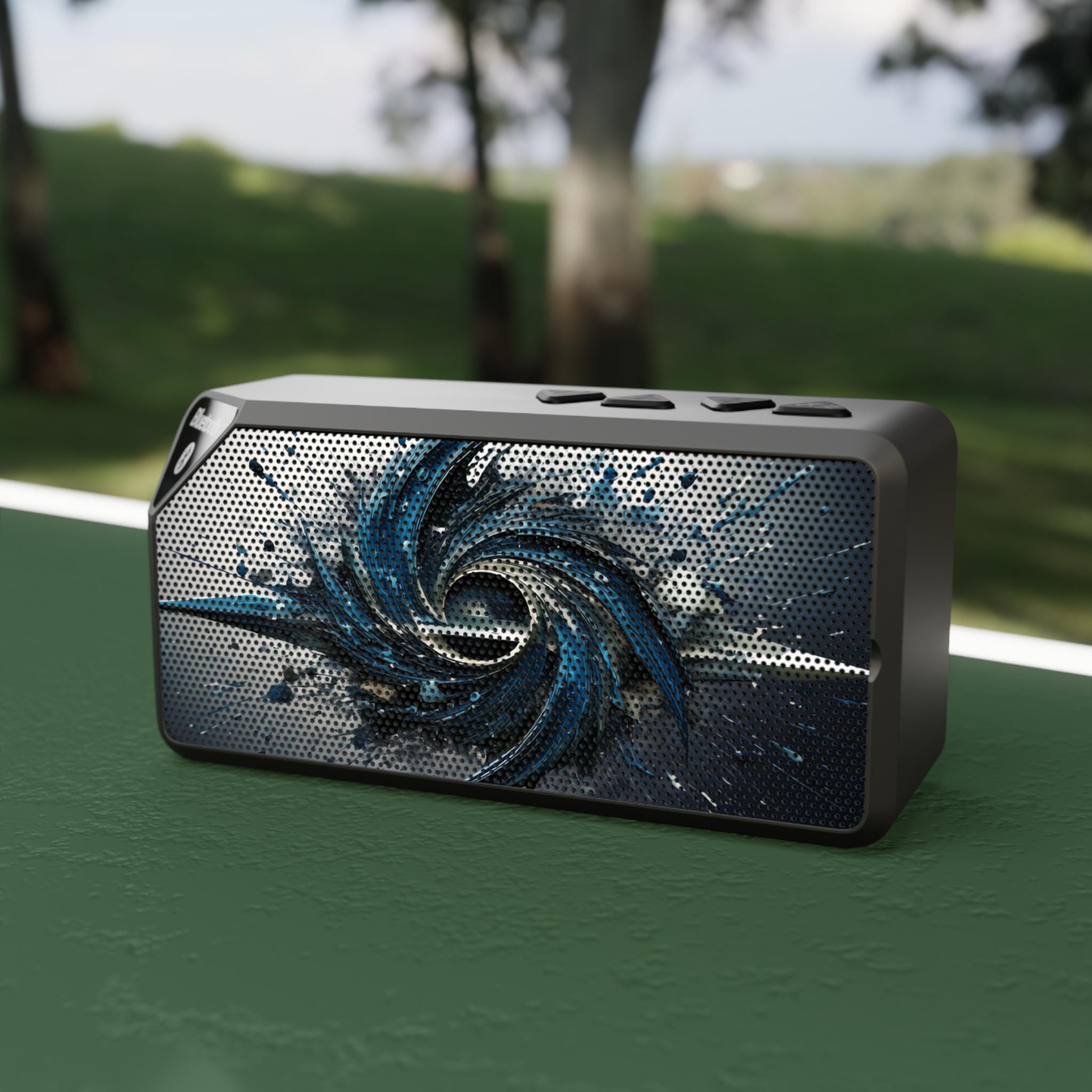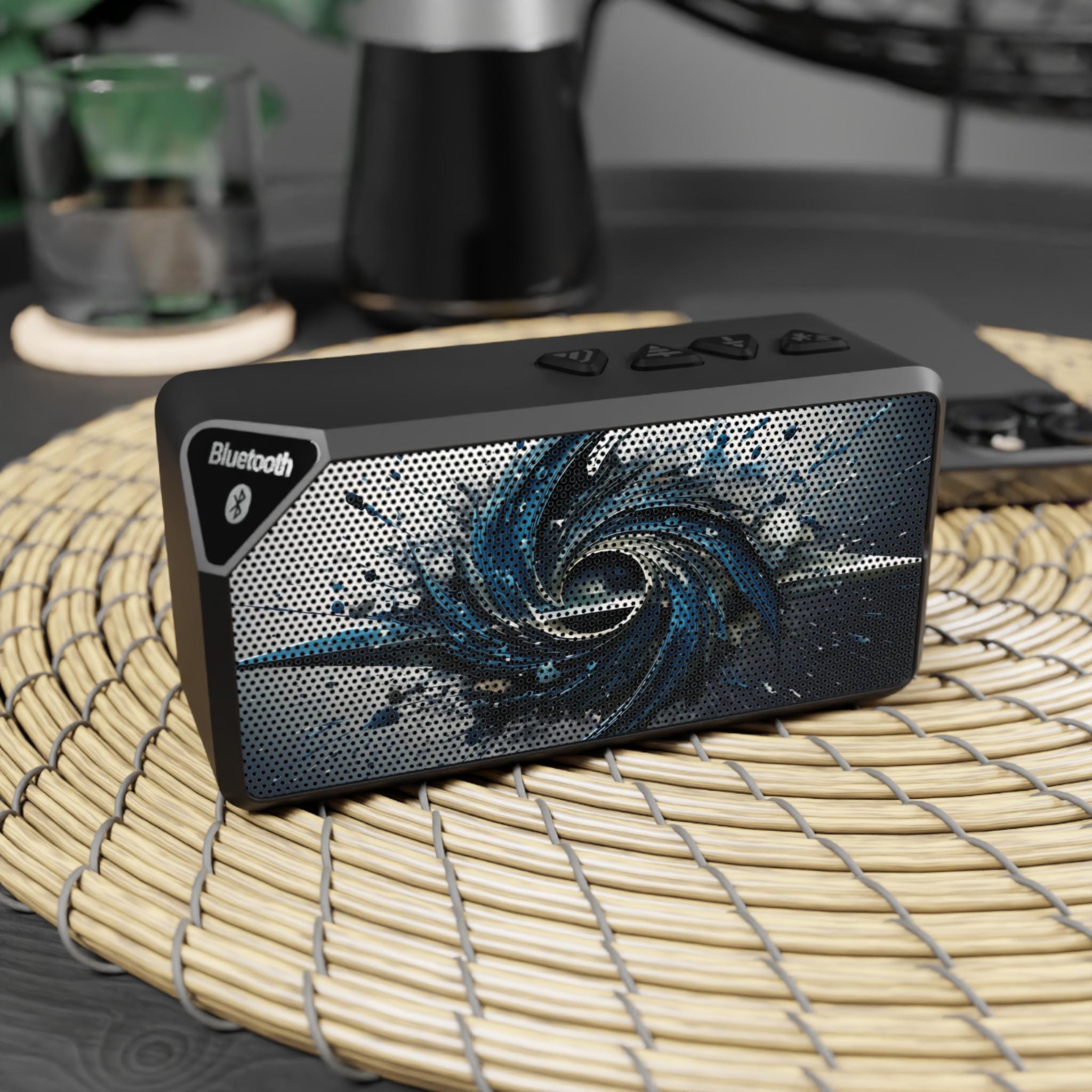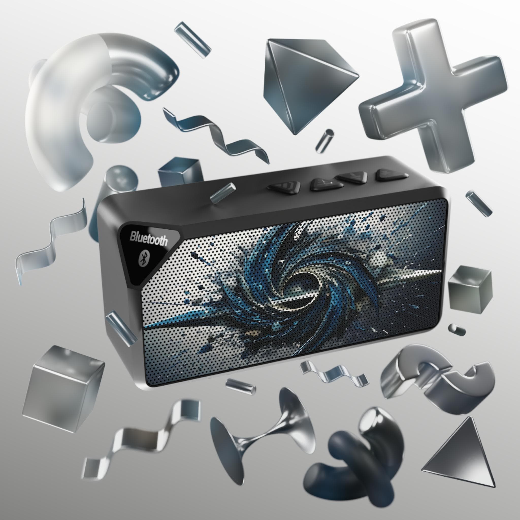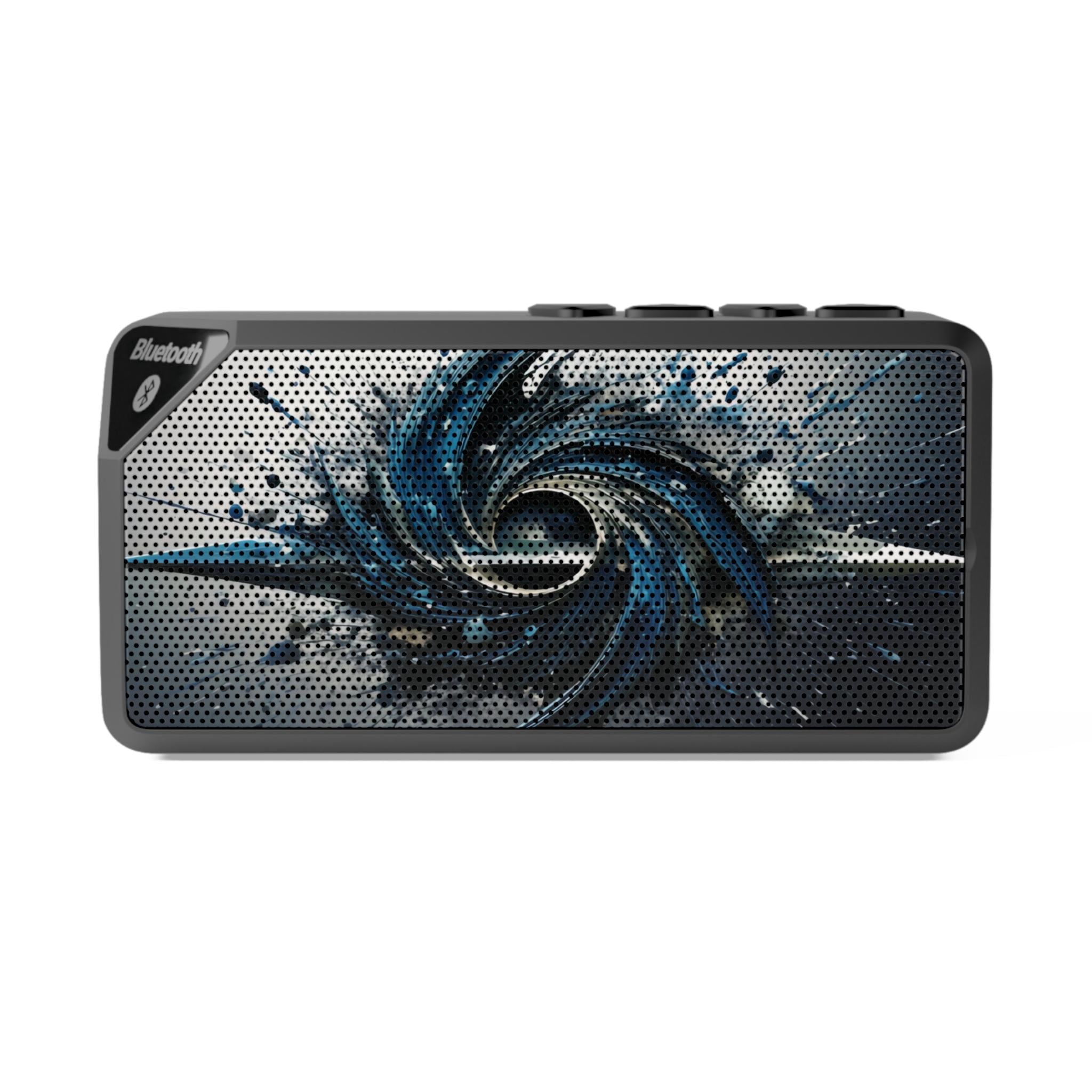 A compact wireless speaker that brings bold sound and streetwise style to small gatherings and solo listening. The grille features a dynamic abstract vortex design in stormy blues and charcoal, giving the speaker an urban, slightly futuristic attitude. It connects wirelessly over Bluetooth (about 10 meters) or via a 3.5mm aux cable, and runs for roughly two hours on the built-in 3.7V/500mAh Li-ion battery at its 3W peak output. The ABS plastic housing keeps it light and durable for bedside tables, bike racks, dorm desks, or a city picnic blanket. Small controls on top make skipping tracks and adjusting volume quick and tactile, while the rear ports stay neatly tucked away for charging and wired playback.