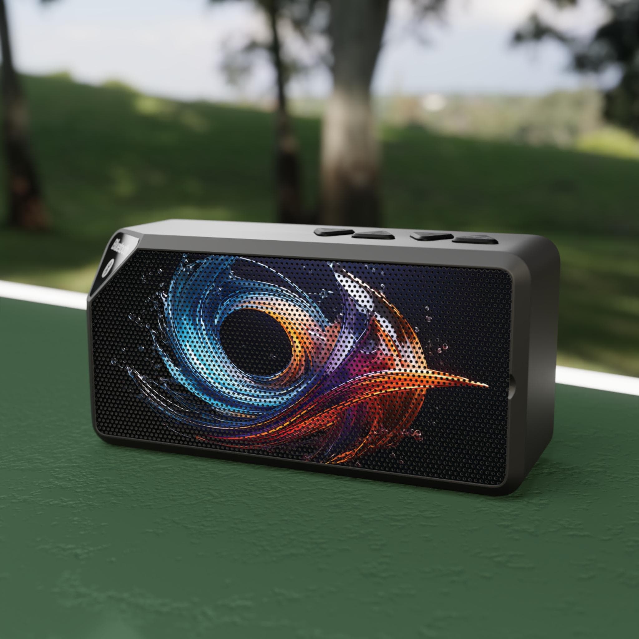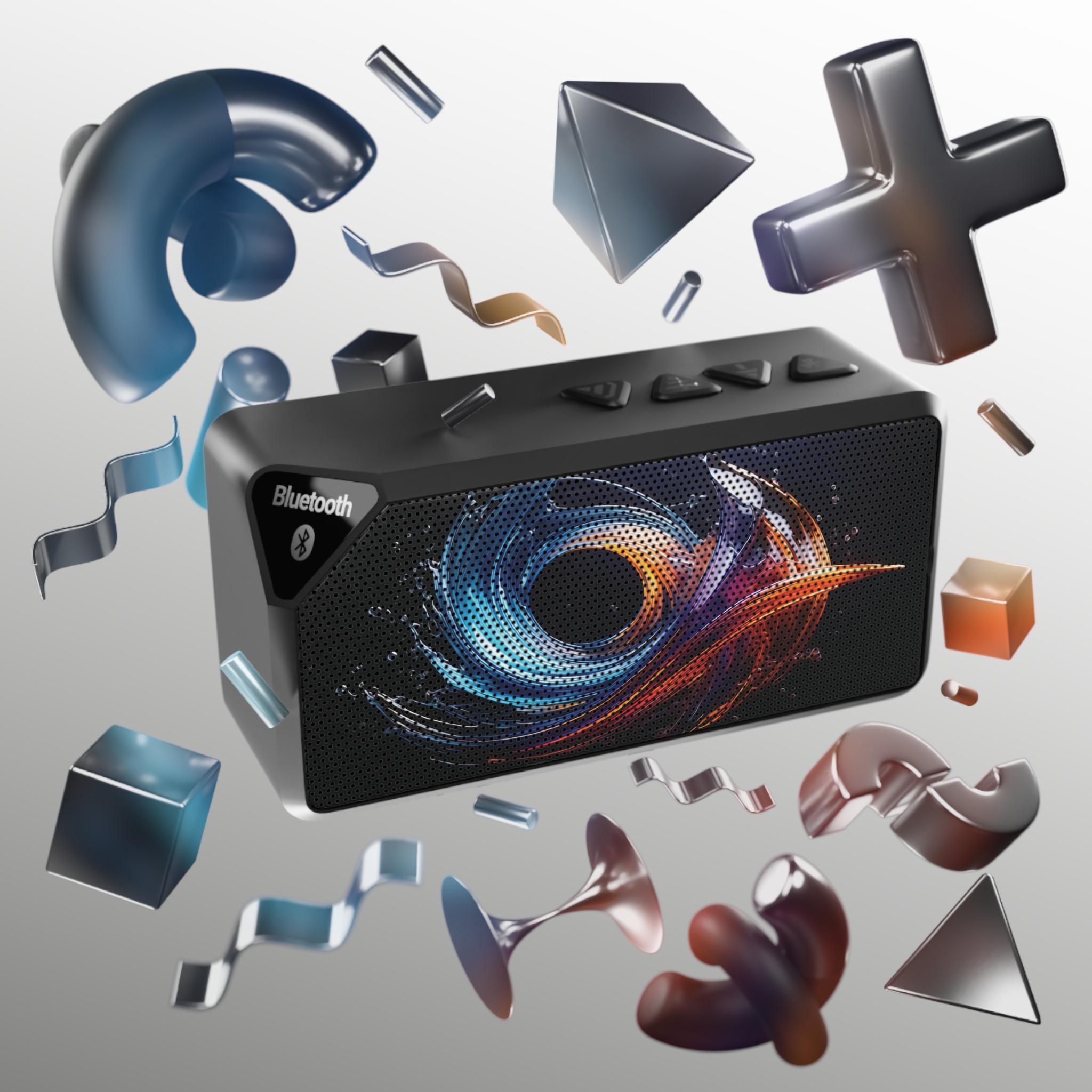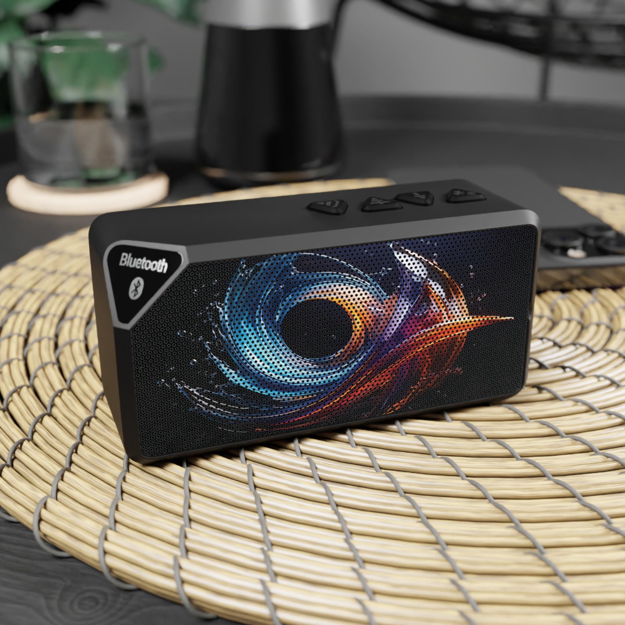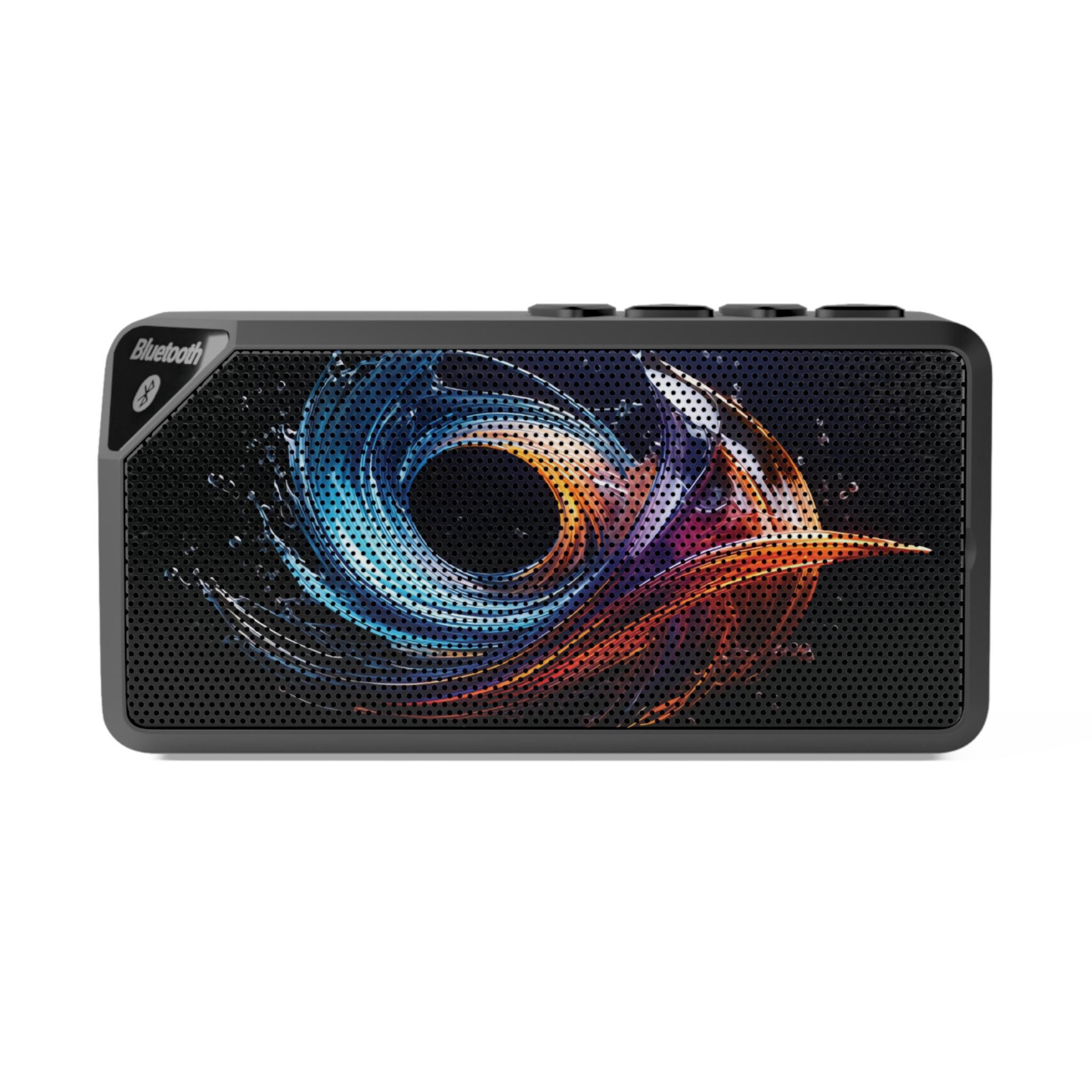 This compact Bluetooth speaker brings bold sound and portable style to small gatherings, late-night playlists, and on-the-go listening. The grilled front features an energetic cosmic swirl design that feels modern and adventurous. With Bluetooth pairing or a 3.5mm aux input, it slips into daily life easily — toss it in a bag for a picnic, set it on a desk while you work, or bring it to a low-key house hangout. The textured ABS housing stands up to everyday use, while physical control buttons keep playback simple and tactile. Two hours of continuous playback at full volume gives you bursts of reliable sound when you need it most, and the built-in rechargeable Li-ion battery charges via micro USB for fuss-free refills. It’s for people who want compact, dependable audio with a bit of visual personality.