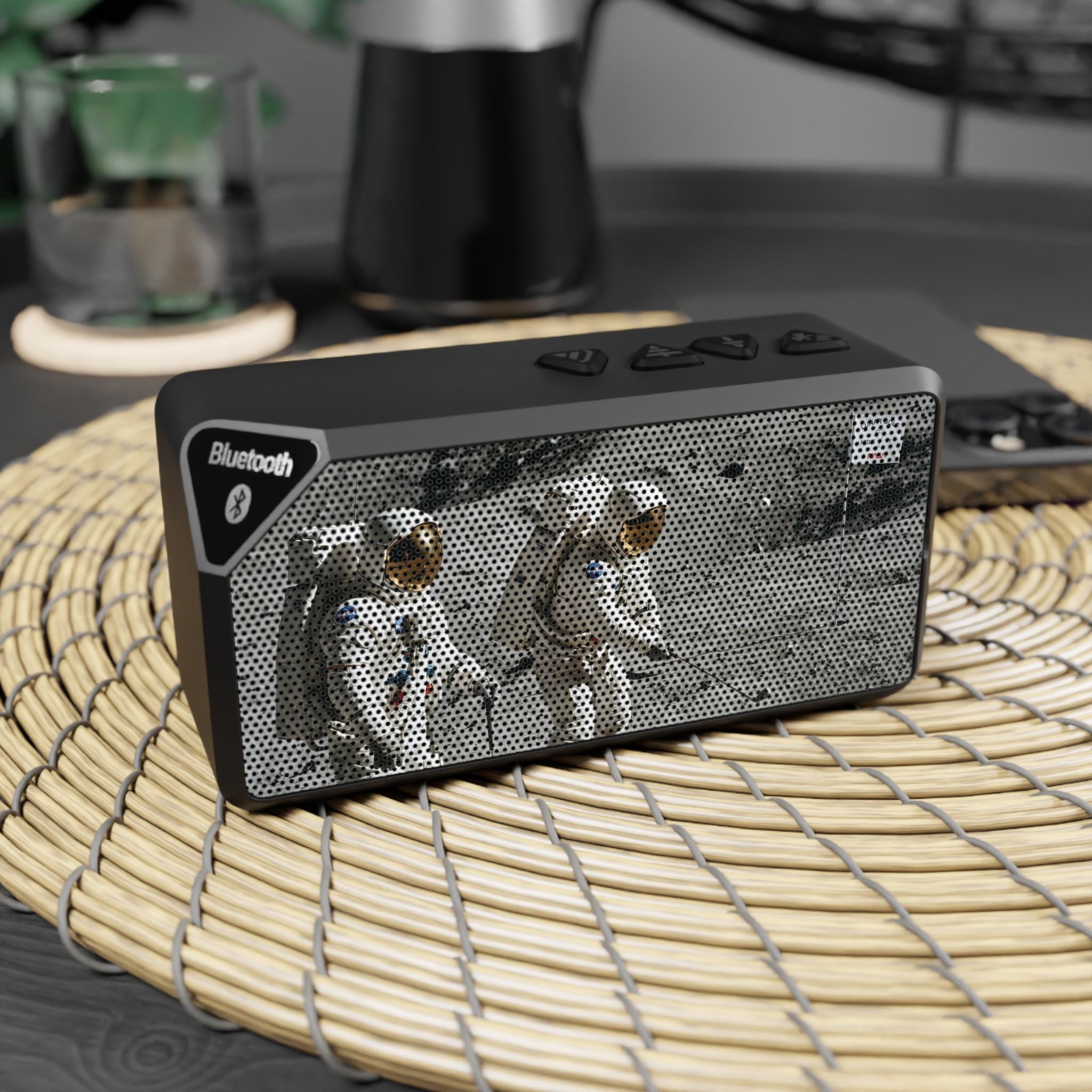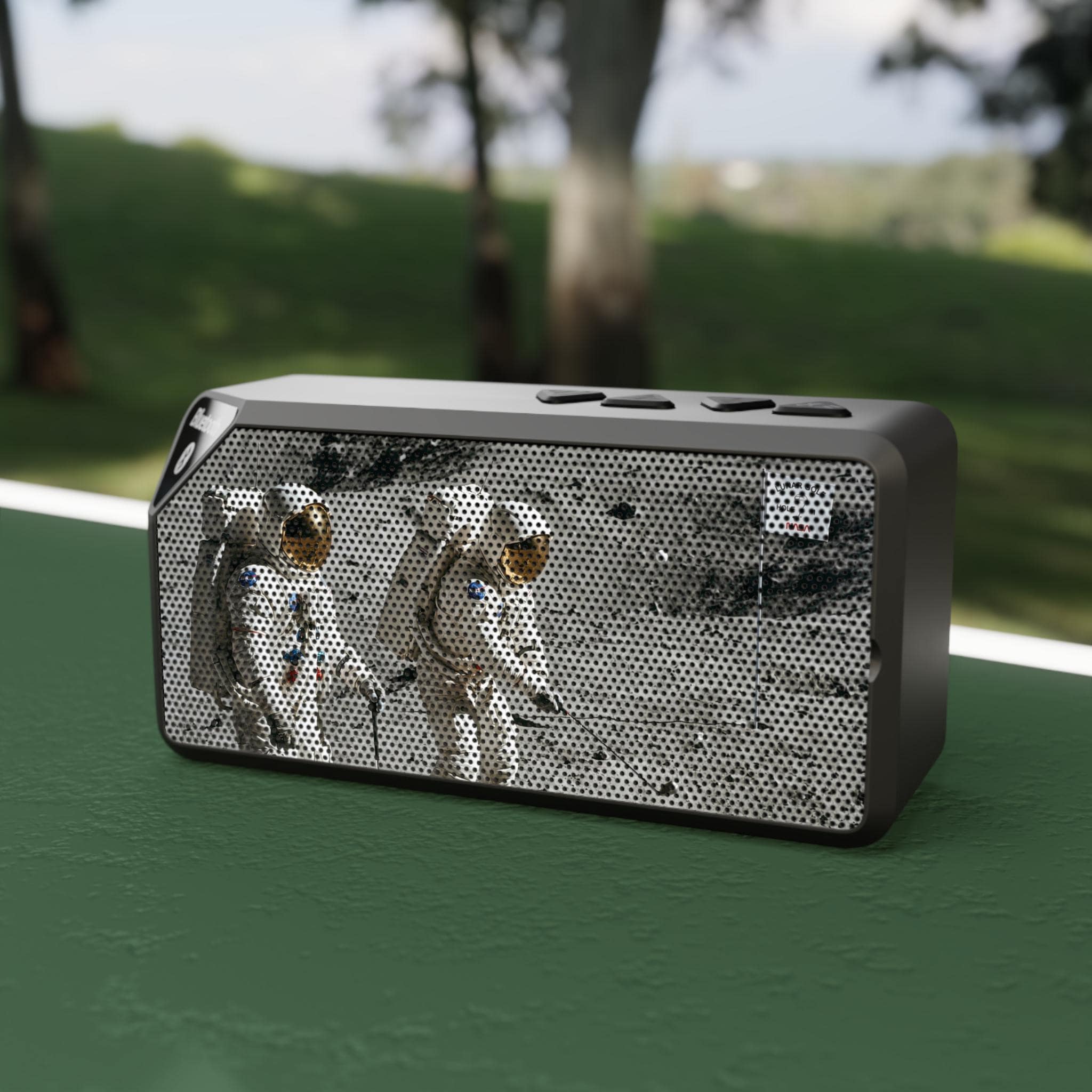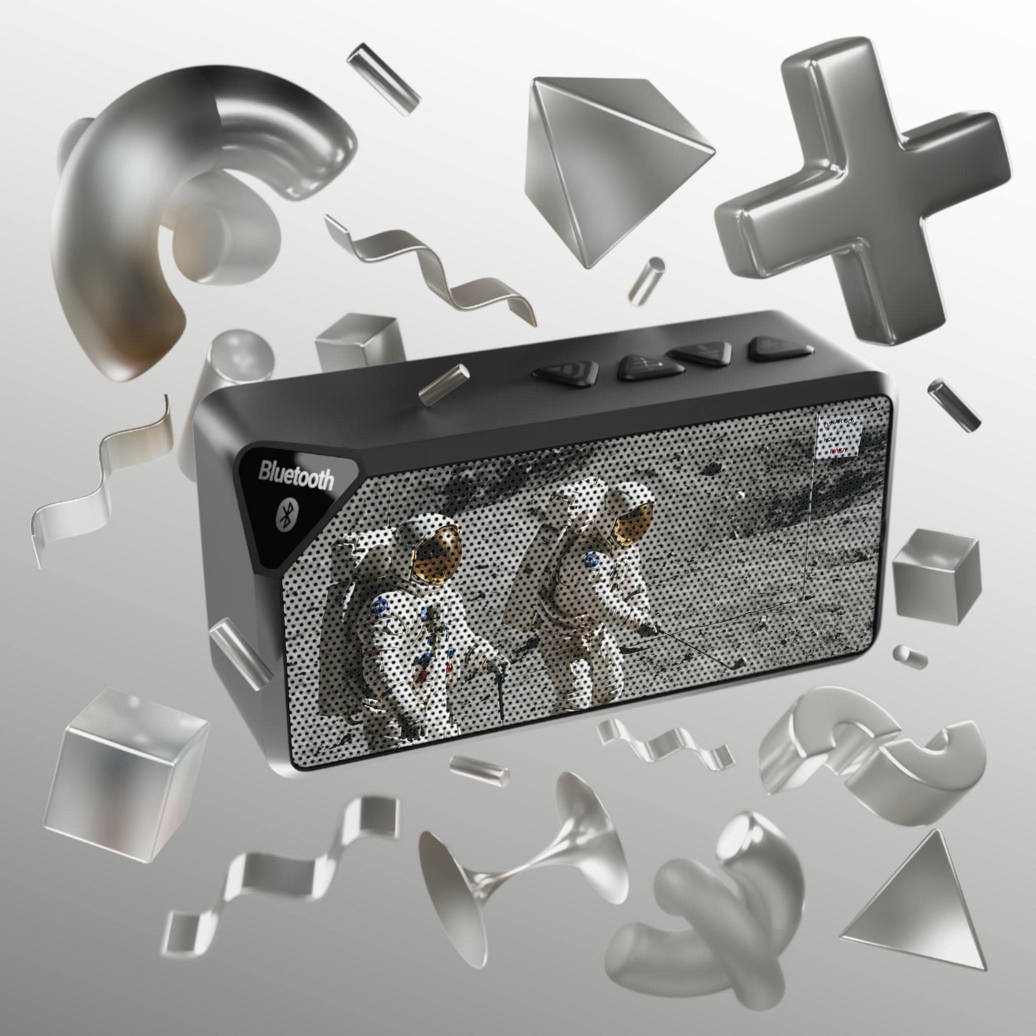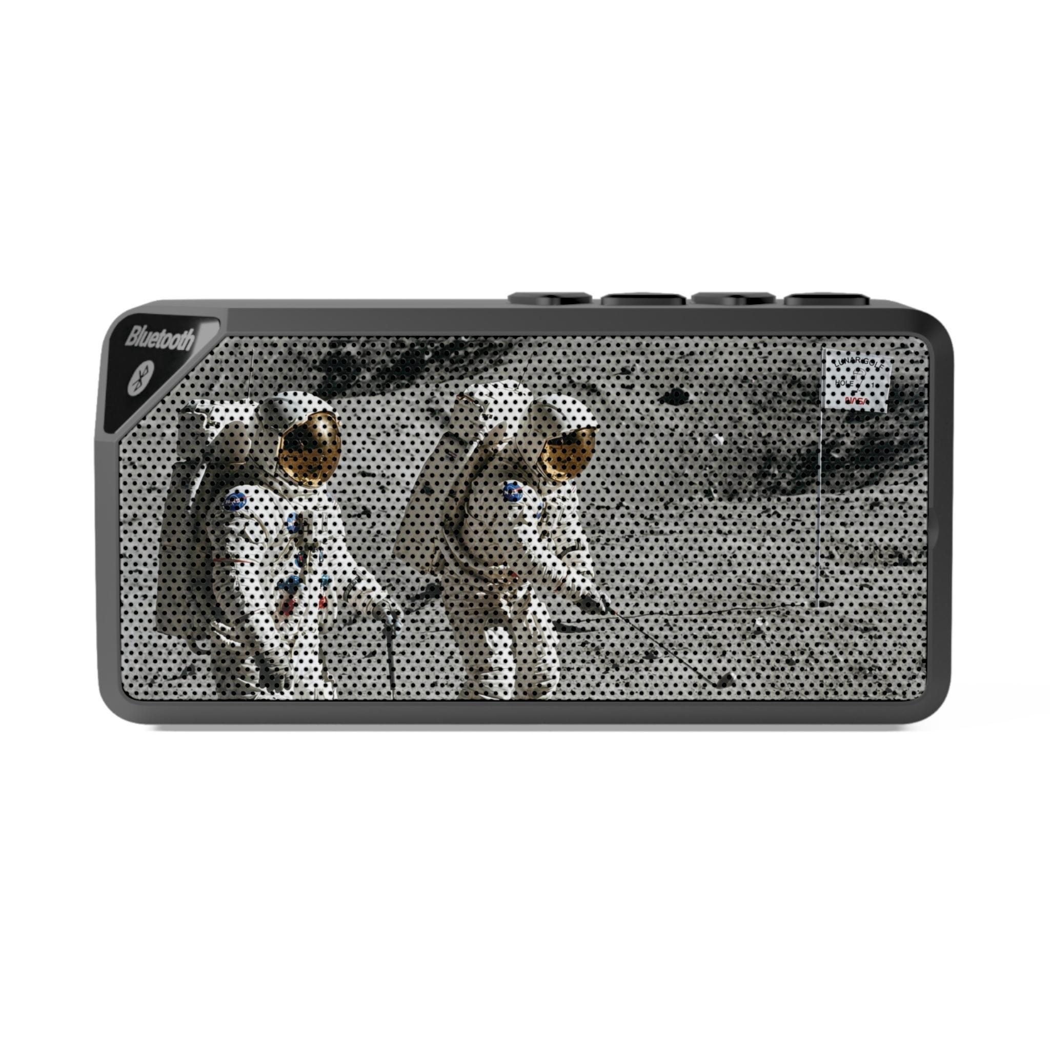 This compact Bluetooth speaker brings a bold, retro vibe to small gatherings and solo listening. Its durable ABS shell and rectangular grille feature a printed lunar-landing design that sparks curiosity and conversation. Bring it to a desk, kitchen counter, or outdoor picnic — it fills close quarters with clear sound from Bluetooth or a 3.5mm aux connection. The built-in rechargeable battery delivers up to two hours of play at full volume, and simple top-mounted controls make playback and volume effortless. Lightweight and travel-ready, it’s for listeners who value style, portability, and straightforward functionality.