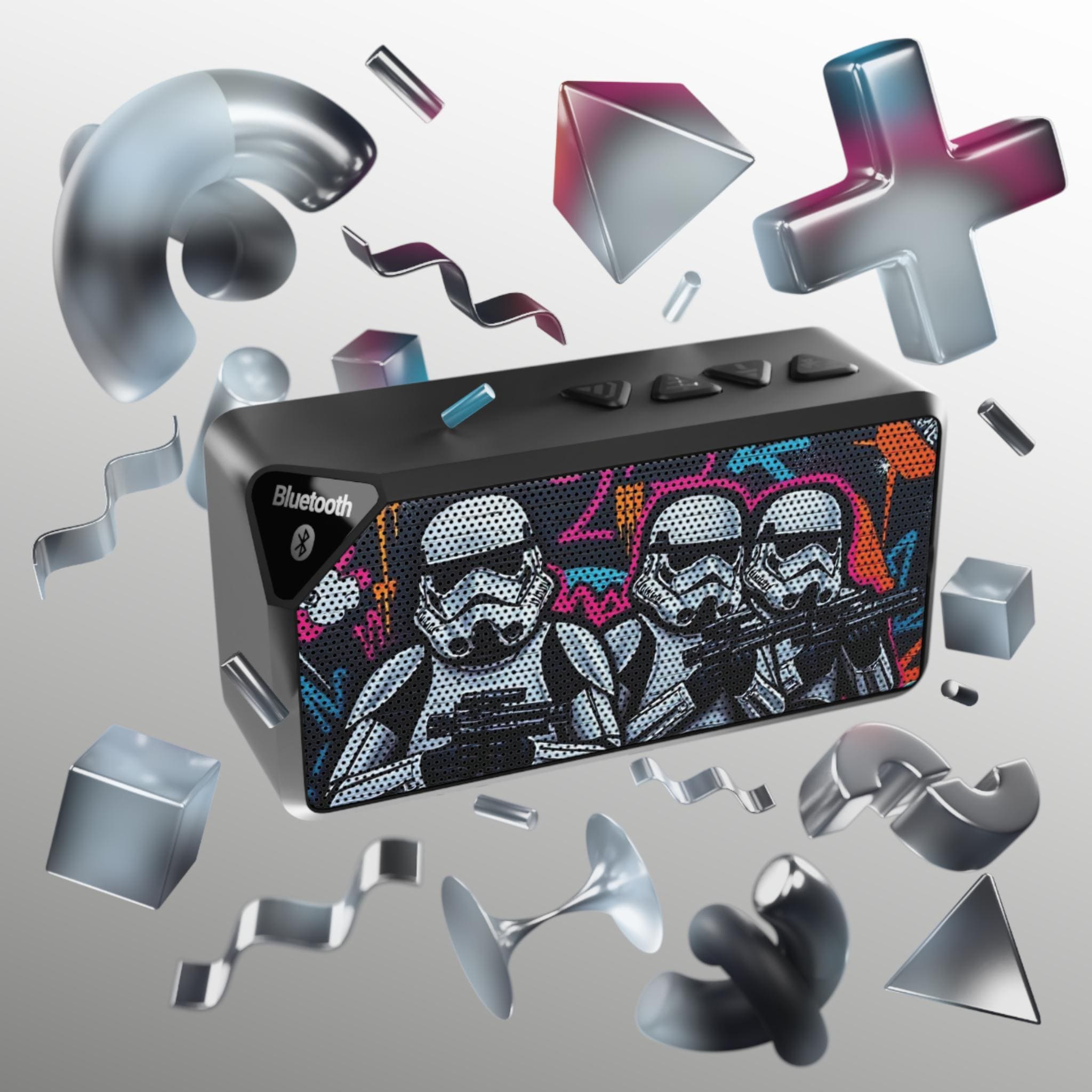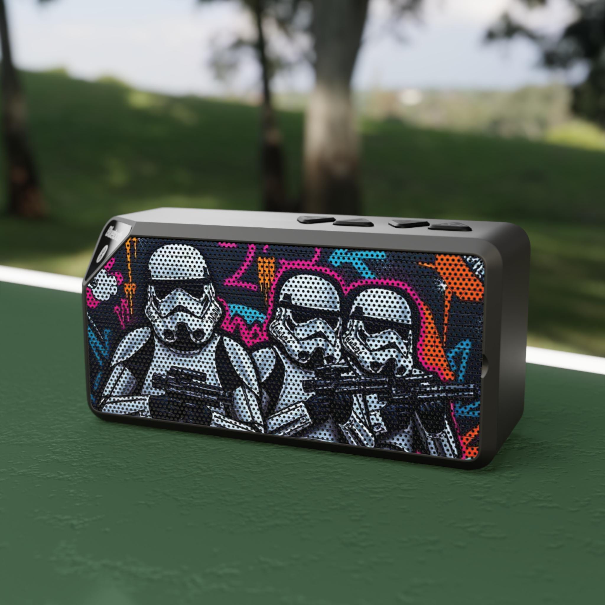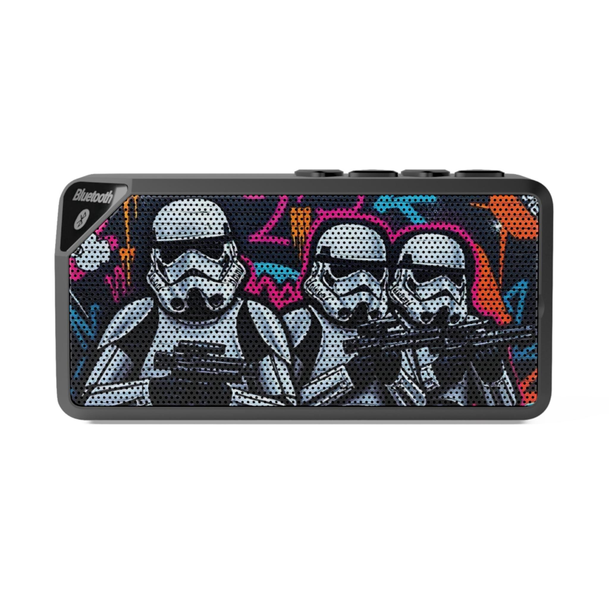 A compact Bluetooth speaker that brings bold visuals and portable sound to casual hangouts, desk setups, and on-the-go listening. The rugged ABS casing houses a 3W driver and a built-in 3.7V/500mAh Li-ion battery for about two hours of play at max volume. Pair wirelessly up to 10 meters (33 ft) or plug in with the 3.5mm aux for straightforward, no-fuss audio. The front grille features colorful, graffiti-inspired stormtrooper artwork that adds character to a workspace, dorm room, or travel bag. Controls sit on top for quick playback and the back panel provides micro-USB charging and an aux input for older devices.