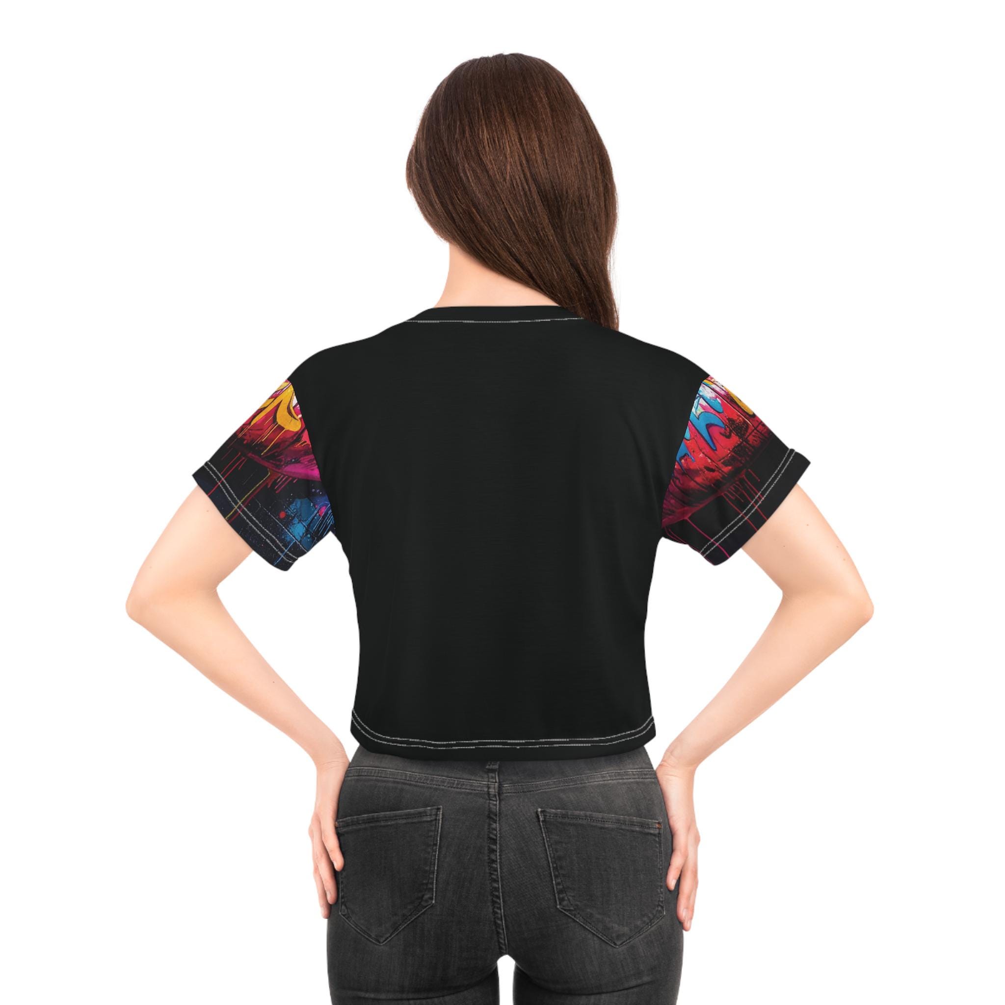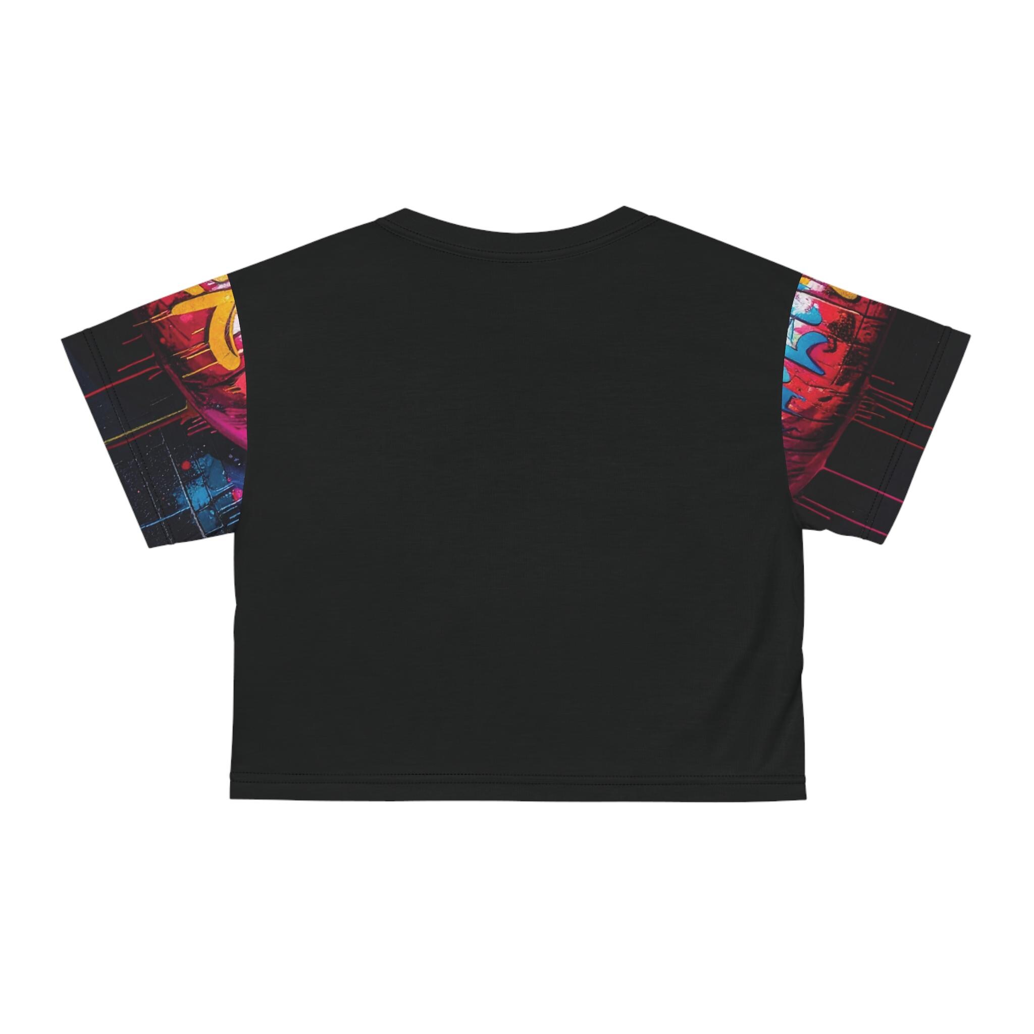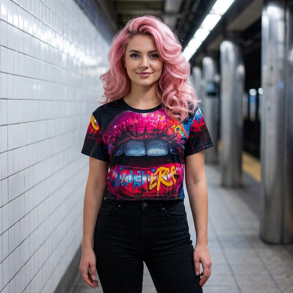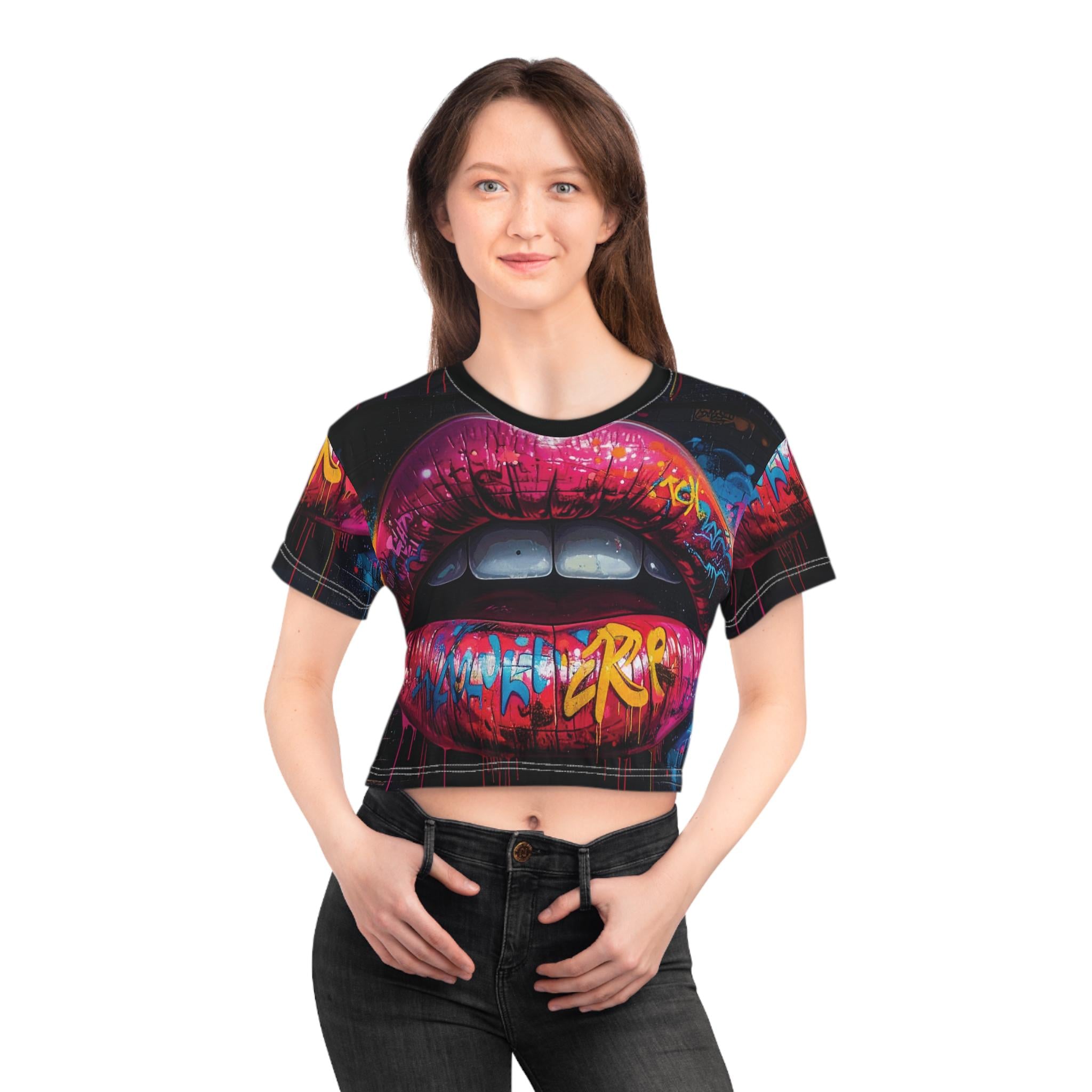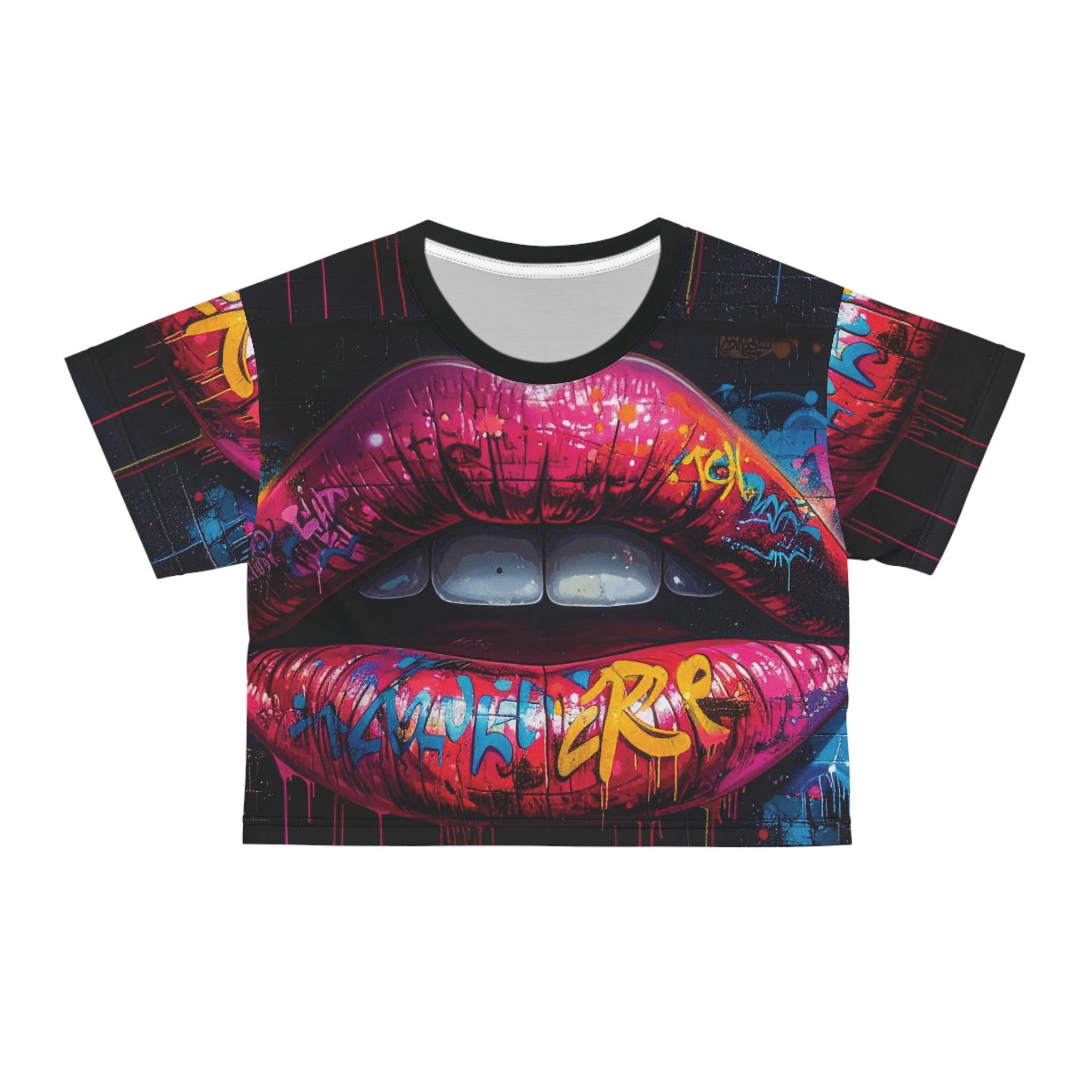 Bright, bold, and unapologetically urban — this cropped tee carries street-art energy right into your wardrobe. The all-over print features a vivid lip mural layered with graffiti tags and neon highlights, so every angle feels like a walk through a late-night city alley. Lightweight polyester keeps the fit breezy while the ribbed collar holds its shape through wear. Wear it with high-waisted jeans, a leather jacket, or layered over a bralette when you want to channel confident, artsy vibes for concerts, gallery nights, or city hangs. The fabric’s fast-drying, color-fast print keeps that mural pop after multiple wears, so the statement stays sharp and electric.