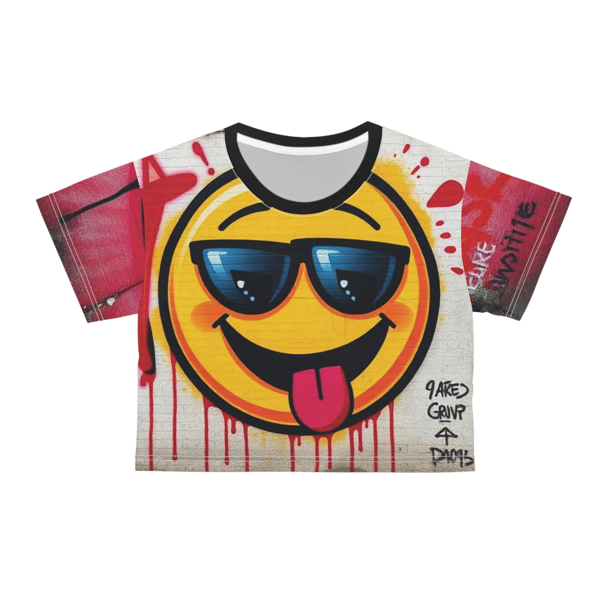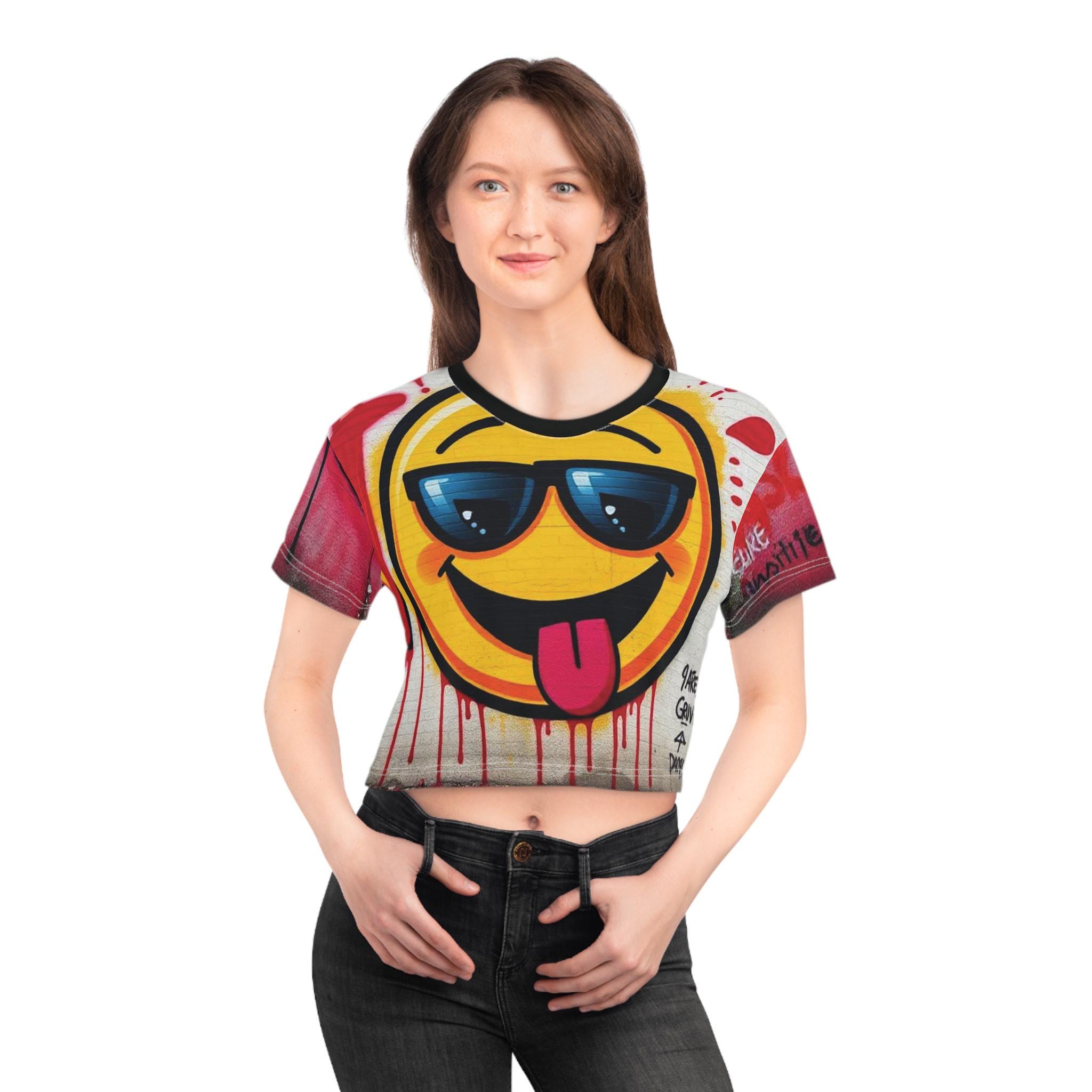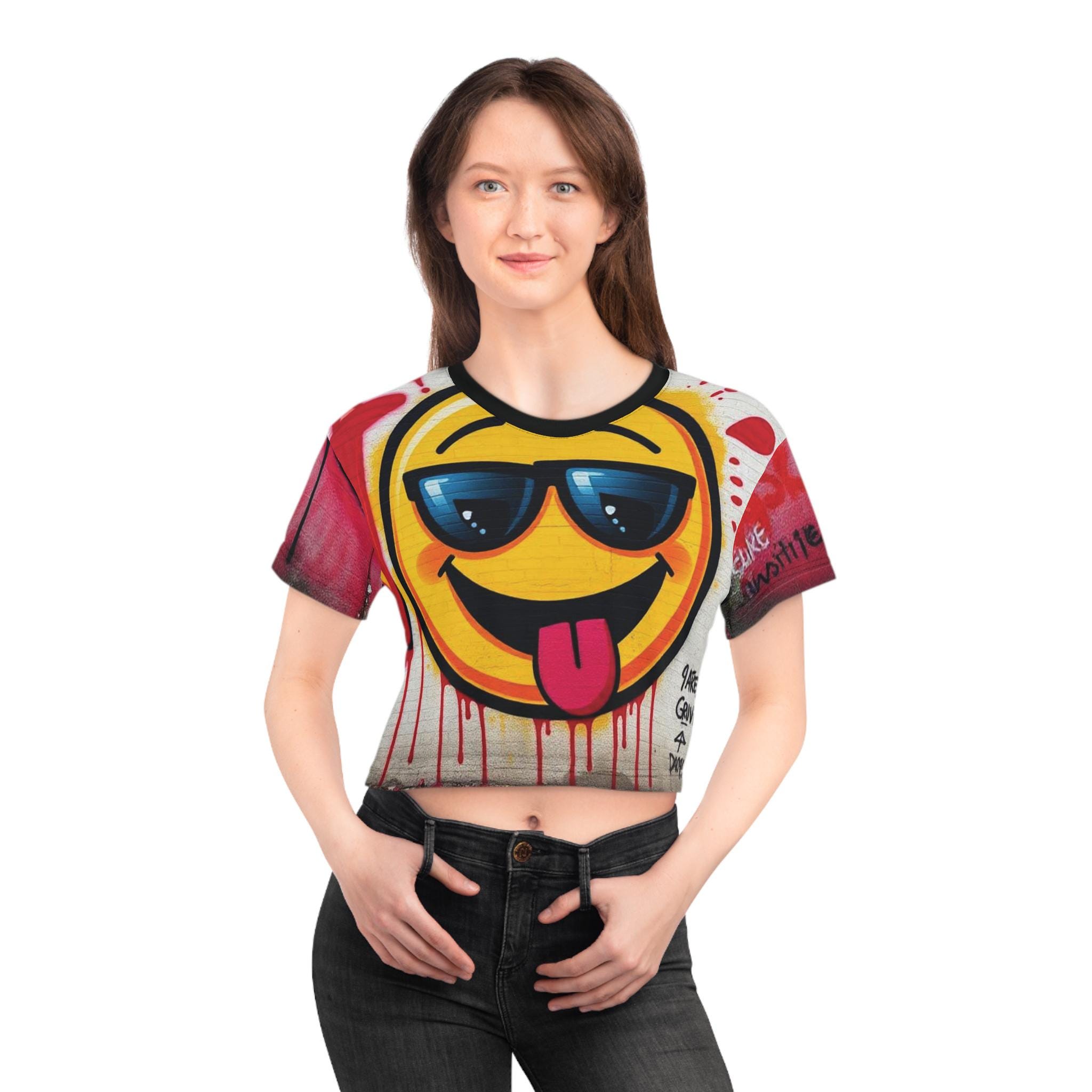 This vibrant crop tee brings street art energy into your everyday wardrobe. Bold, all-over print covers the lightweight fabric with graffiti-style motifs: a winking smiley face on the front and a dripping heart against a brick wall on the back. The fitted, short silhouette sits just above the waist, letting colorful layers or high-waist bottoms take center stage. Wear it to add a playful, edgy accent to a casual outfit, concert look, or city stroll — it feels lively, confident, and a little mischievous, like finding a bright mural down a back alley and deciding to follow it. The durable polyester keeps the colors sharp wash after wash, and the ribbed collar holds shape through repeat wear.
