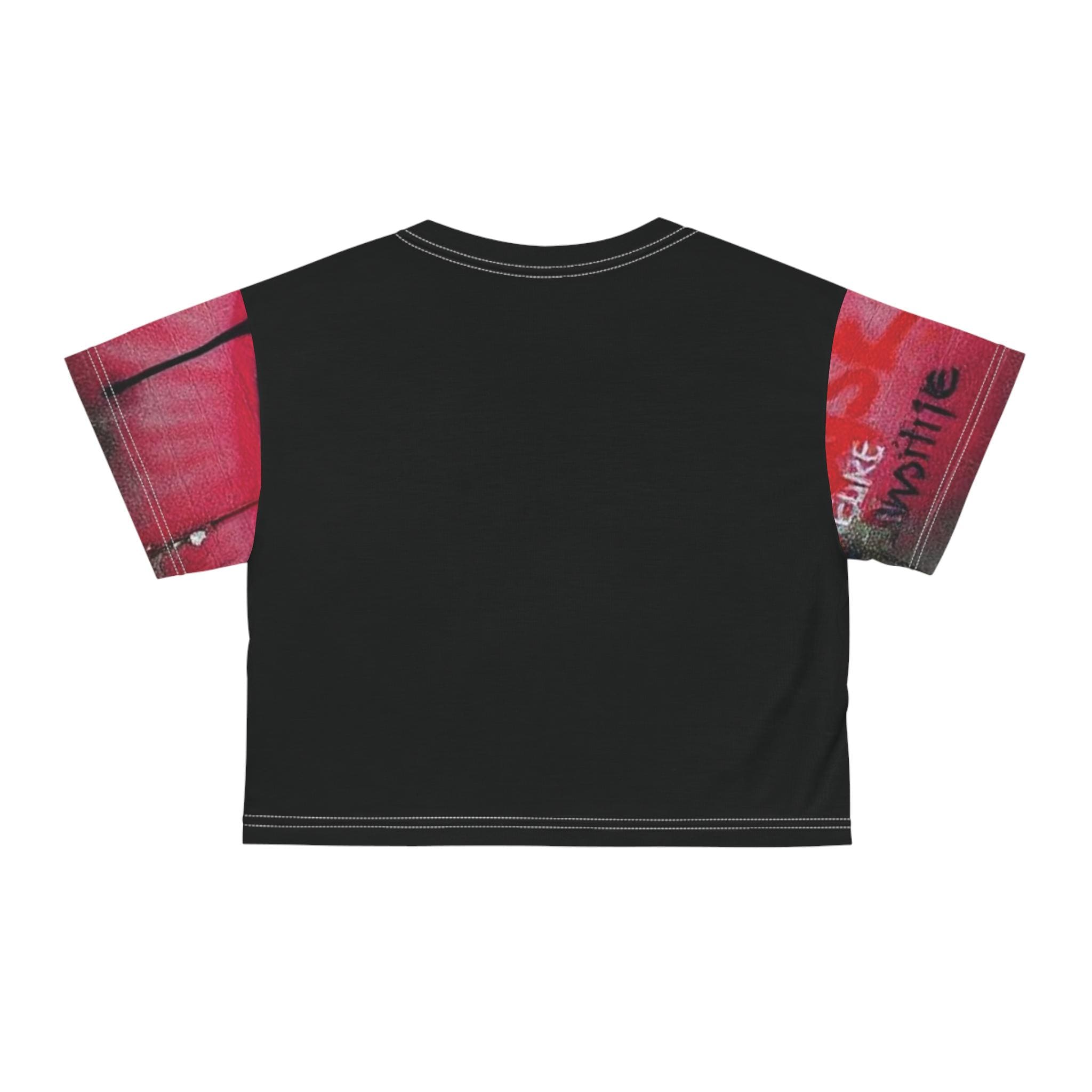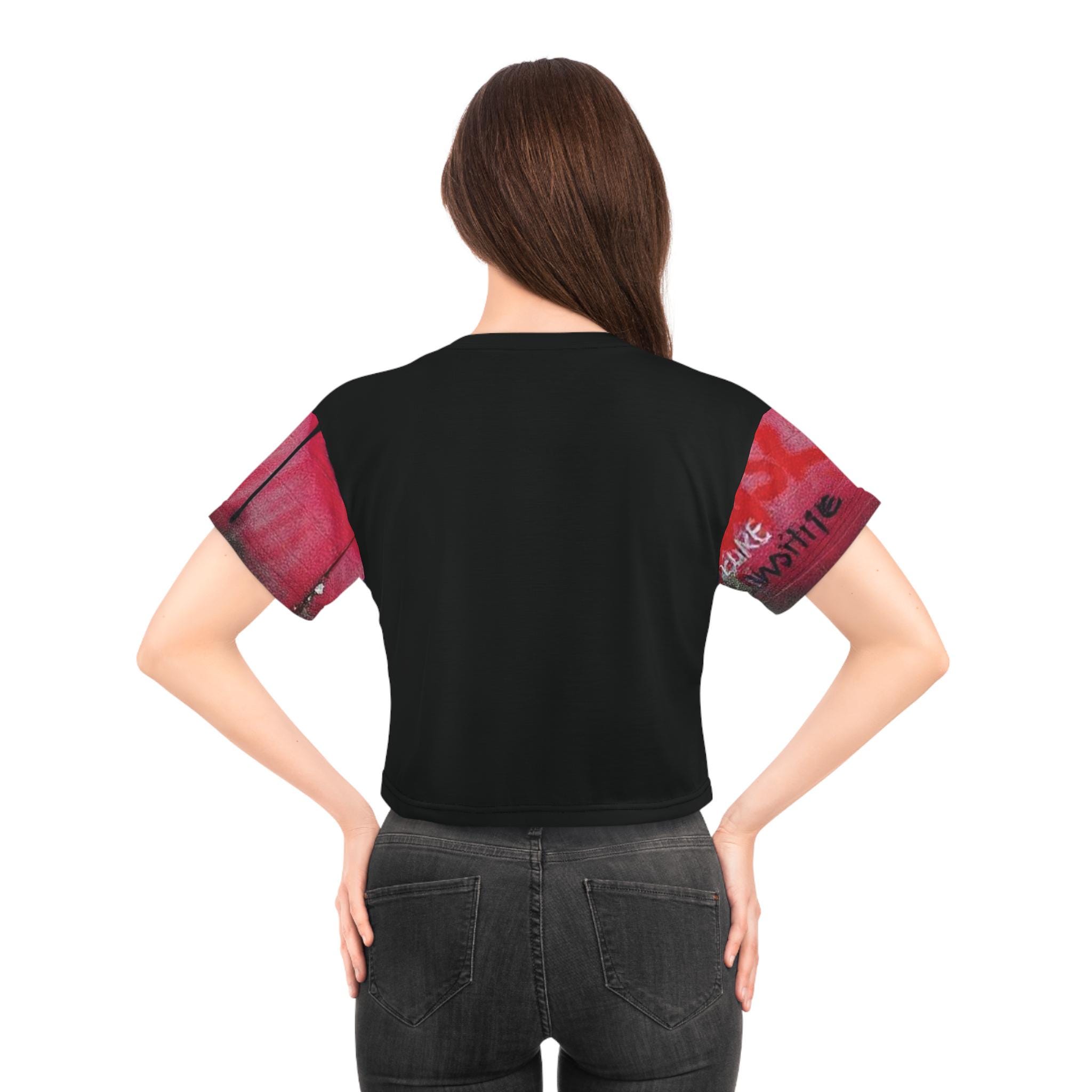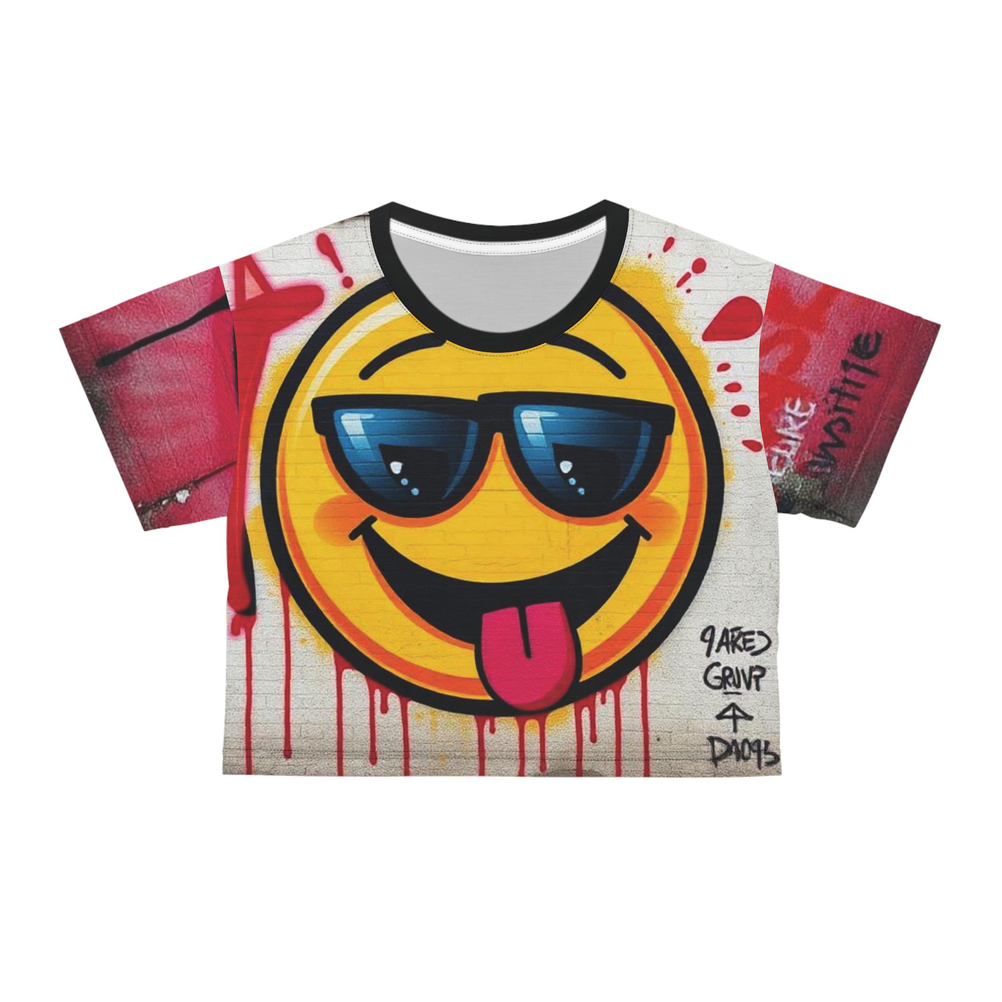 This vibrant crop tee brings street art energy into your everyday wardrobe. Bold, all-over print covers the lightweight fabric with graffiti-style motifs: a winking smiley face on the front and a dripping heart against a brick wall on the back. The fitted, short silhouette sits just above the waist, letting colorful layers or high-waist bottoms take center stage. Wear it to add a playful, edgy accent to a casual outfit, concert look, or city stroll — it feels lively, confident, and a little mischievous, like finding a bright mural down a back alley and deciding to follow it. The durable polyester keeps the colors sharp wash after wash, and the ribbed collar holds shape through repeat wear.