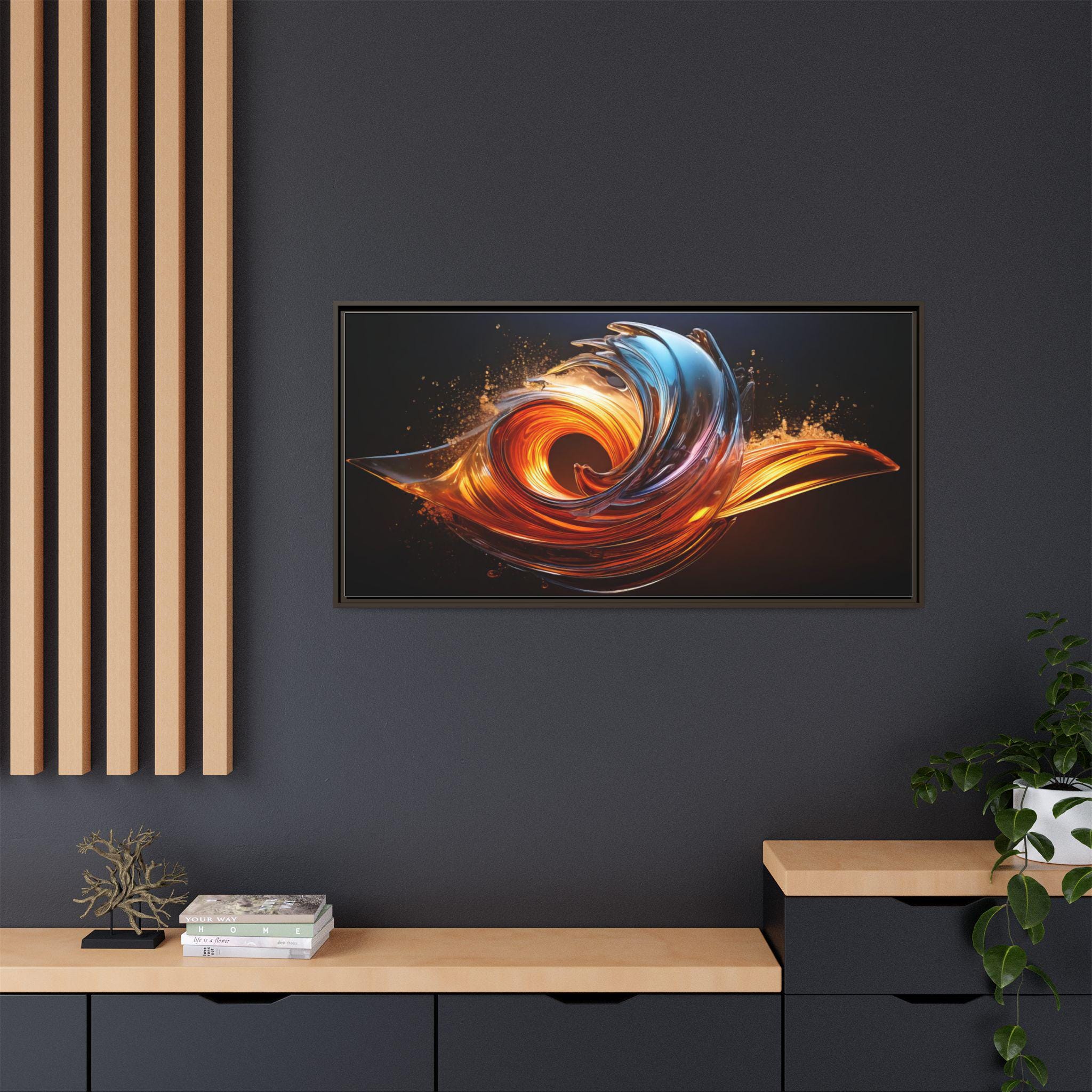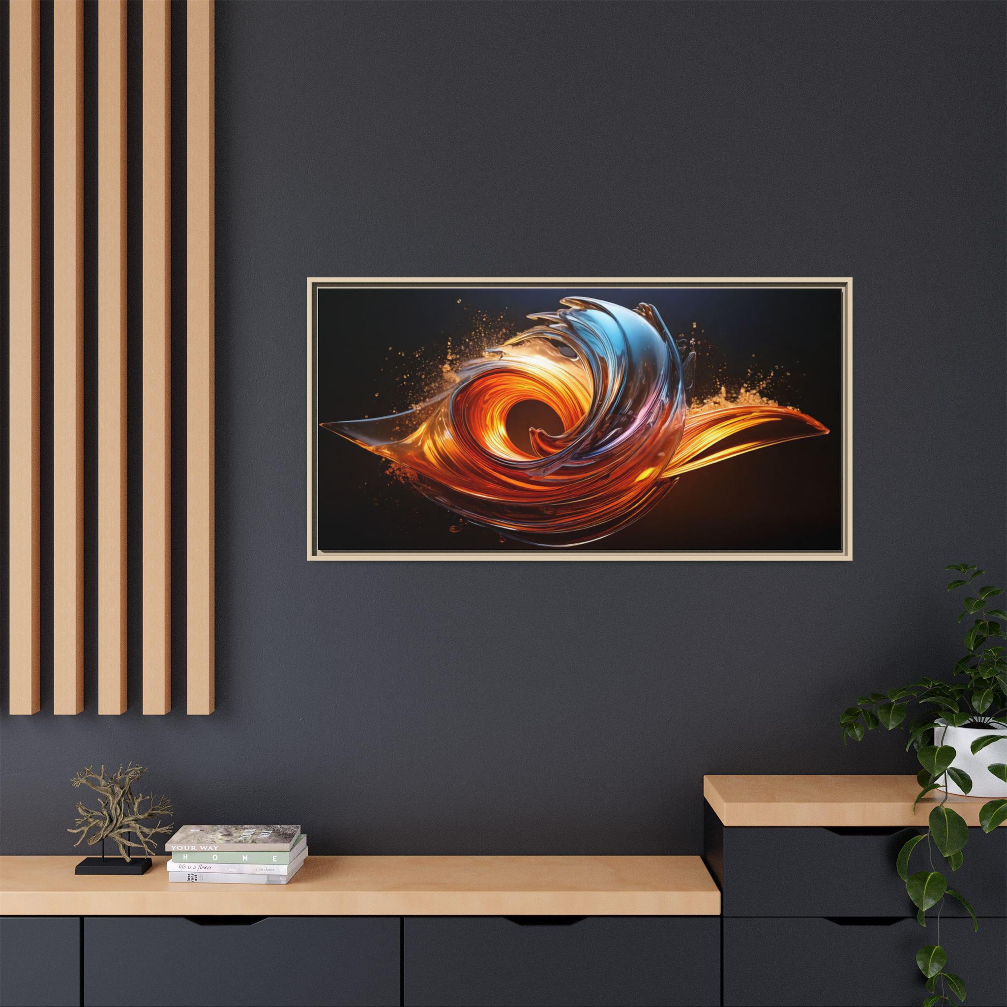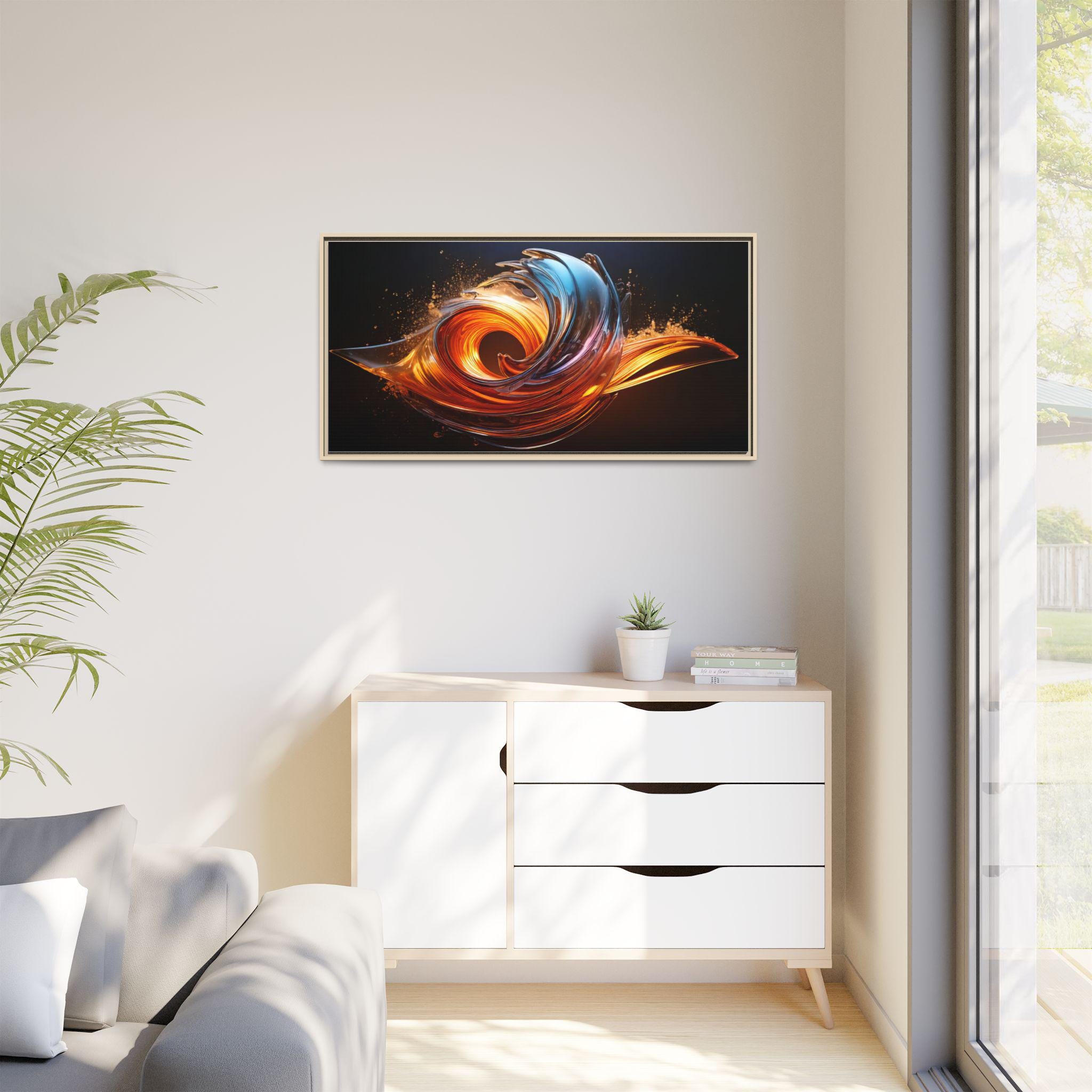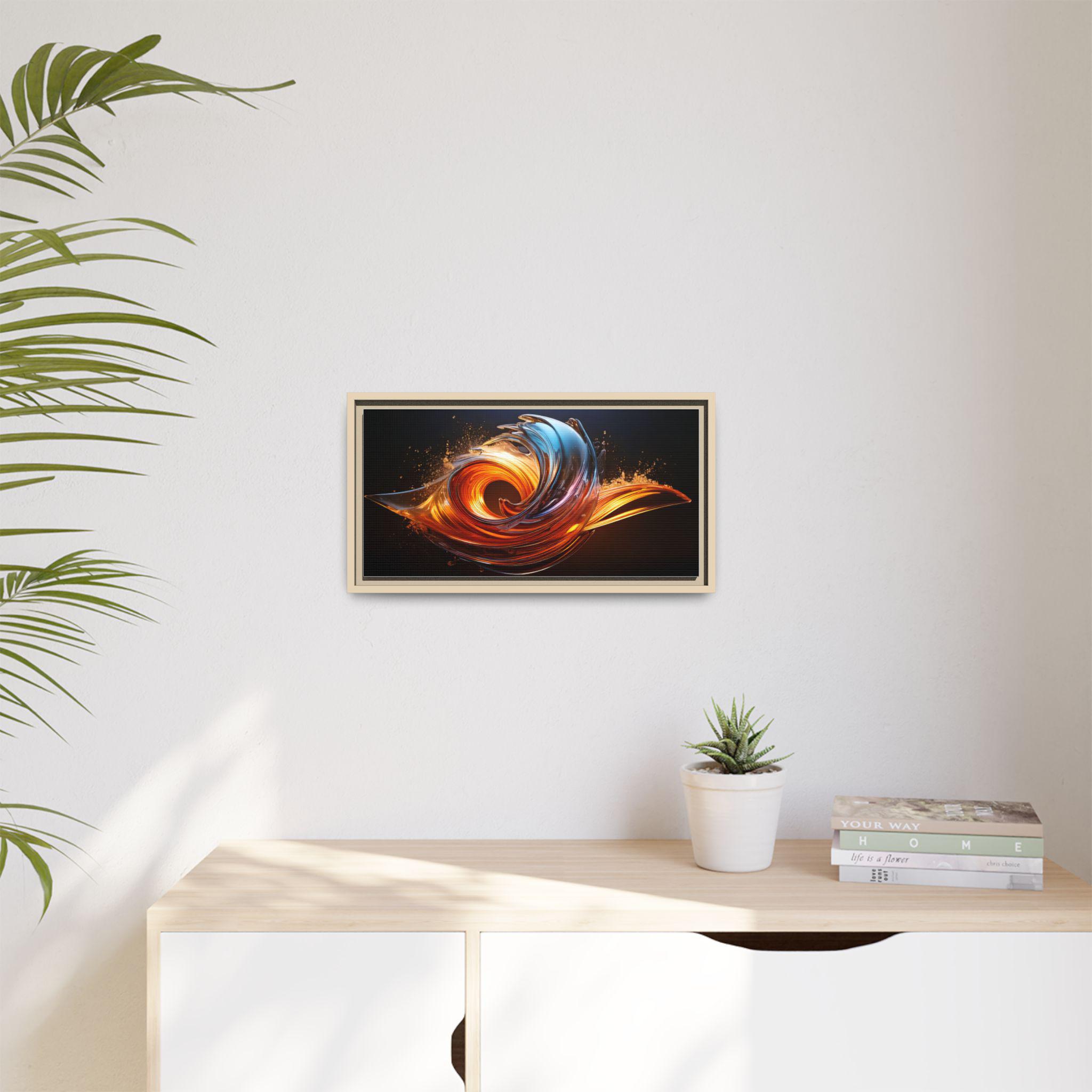 This framed matte canvas brings movement and heat into any room. The print captures a swirling, flame-like abstract in molten oranges and cool cerulean streaks against a deep, velvety background. Mounted on a slim pine frame with a soft matte finish, the image reads like a suspended moment — energetic but refined. Hang it over a living room sofa, entry console, or workspace to anchor a contemporary space with dramatic color and sculptural flow. The archival coating and Greenguard Gold inks keep colors vivid while the natural pine frame adds a warm, grounded edge that complements industrial, mid-century, and modern interiors.