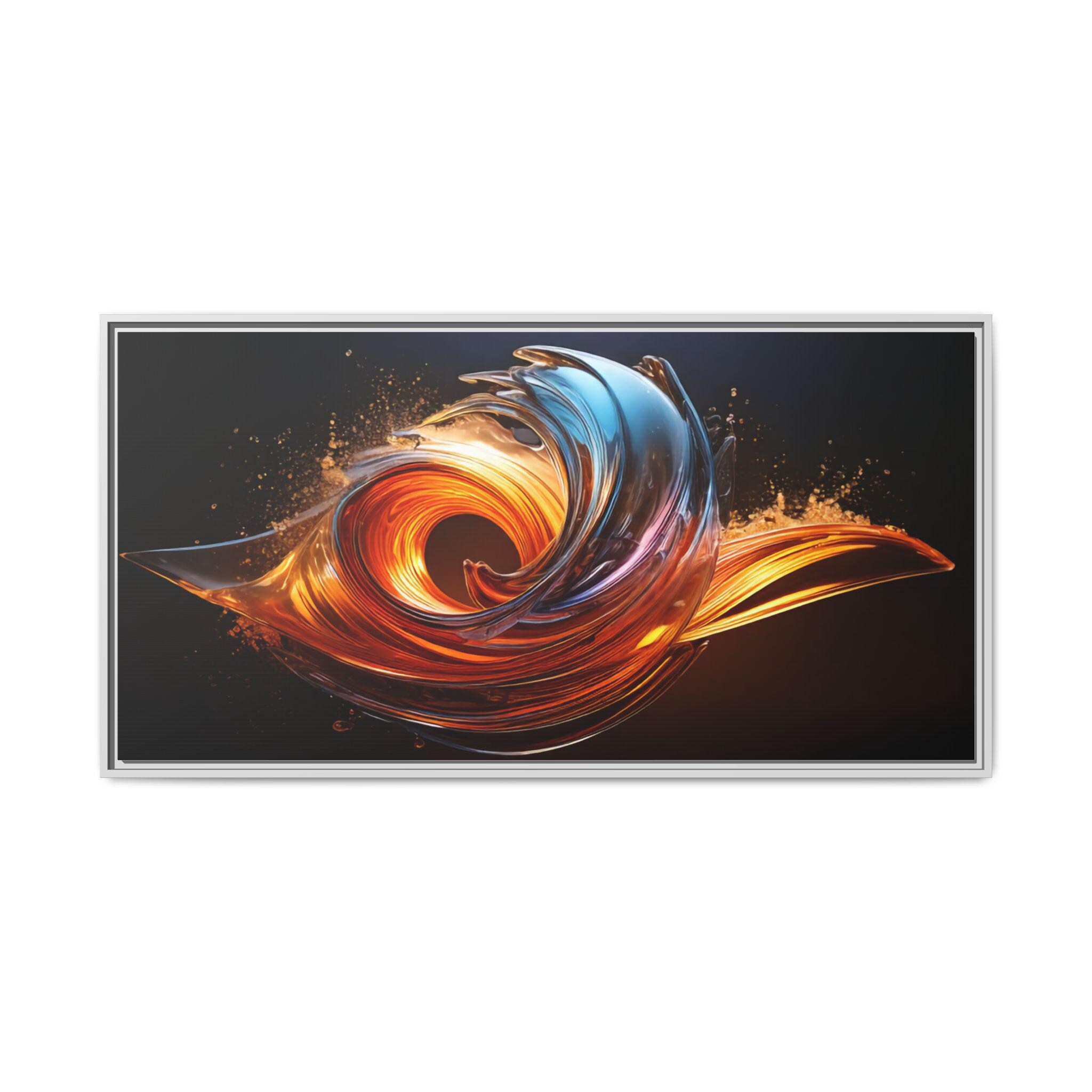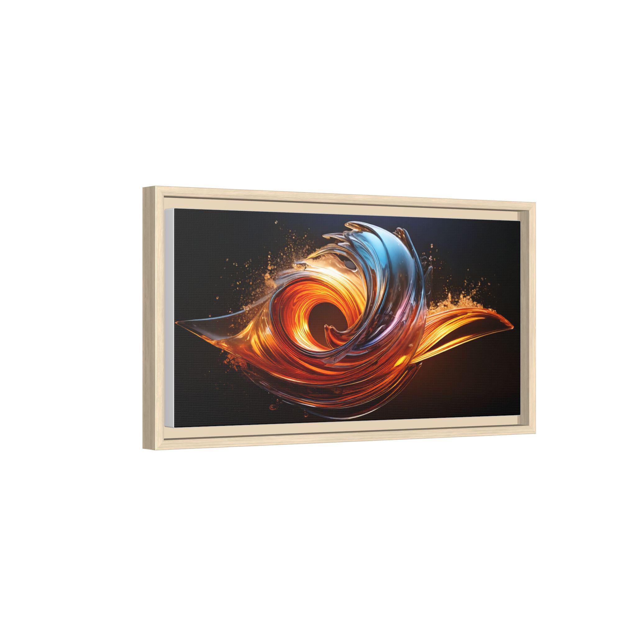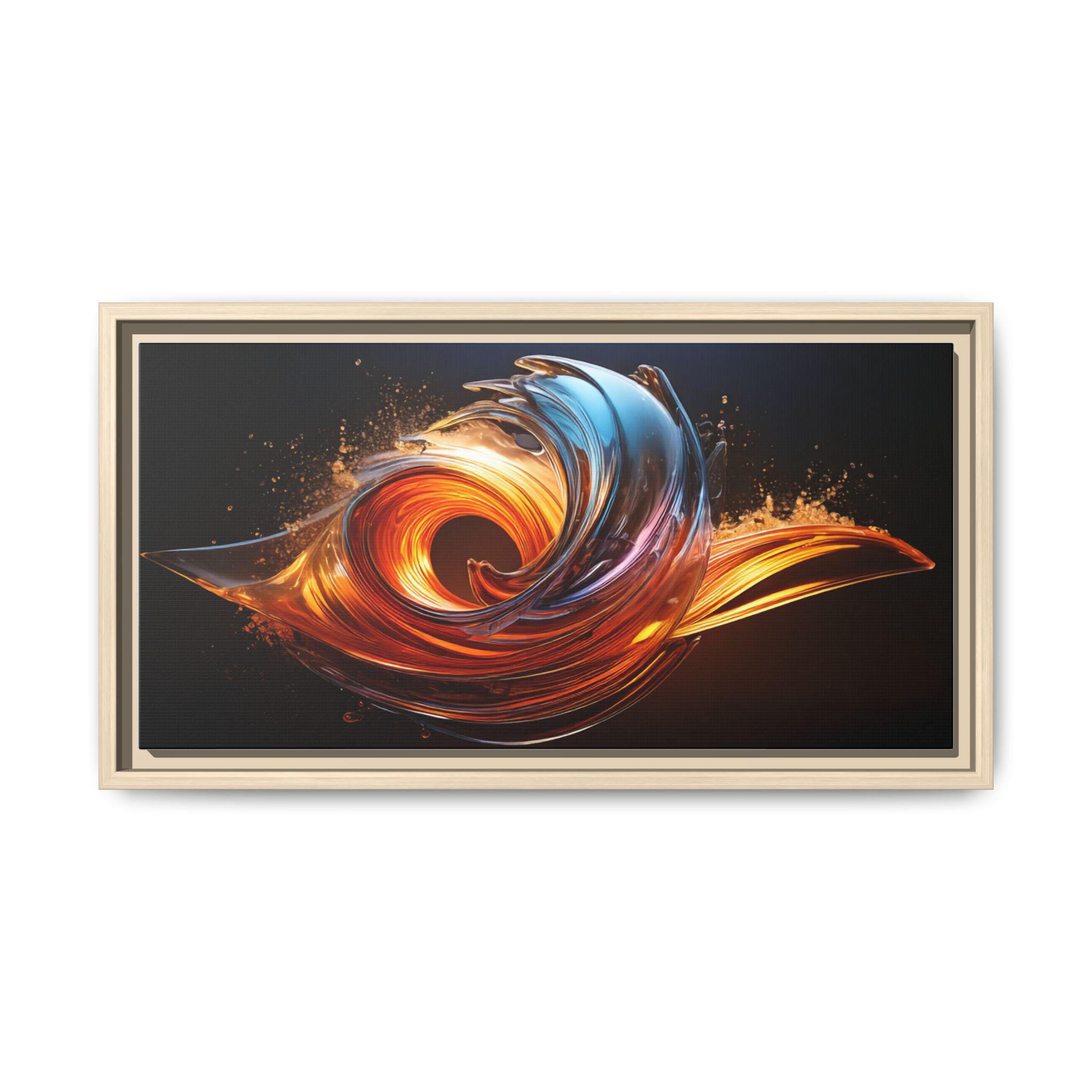 This framed matte canvas brings movement and heat into any room. The print captures a swirling, flame-like abstract in molten oranges and cool cerulean streaks against a deep, velvety background. Mounted on a slim pine frame with a soft matte finish, the image reads like a suspended moment — energetic but refined. Hang it over a living room sofa, entry console, or workspace to anchor a contemporary space with dramatic color and sculptural flow. The archival coating and Greenguard Gold inks keep colors vivid while the natural pine frame adds a warm, grounded edge that complements industrial, mid-century, and modern interiors.