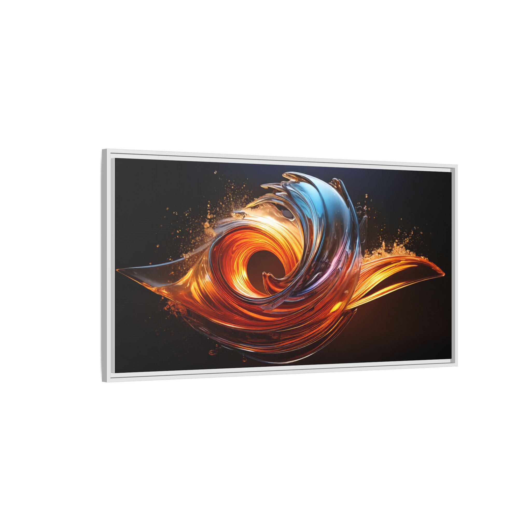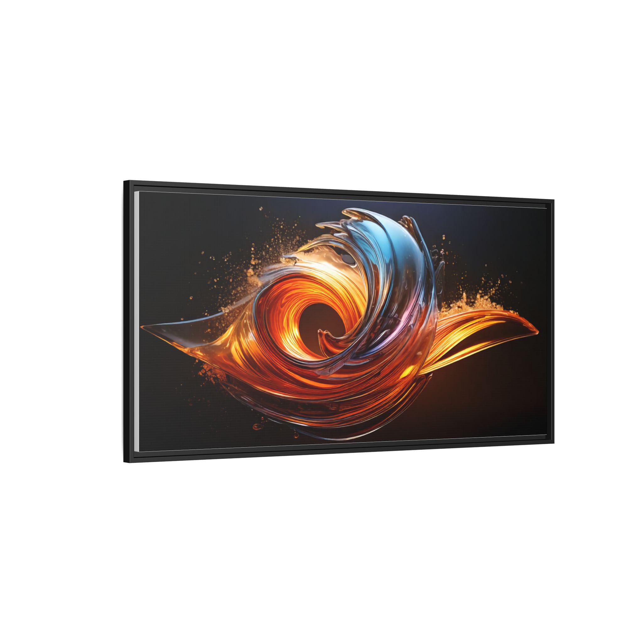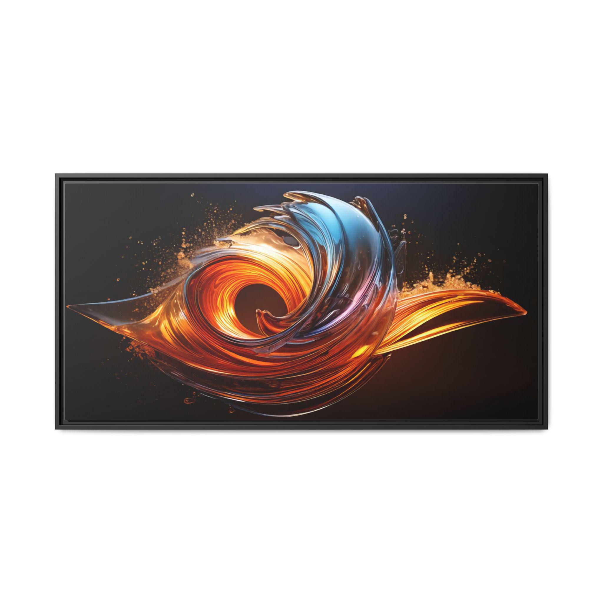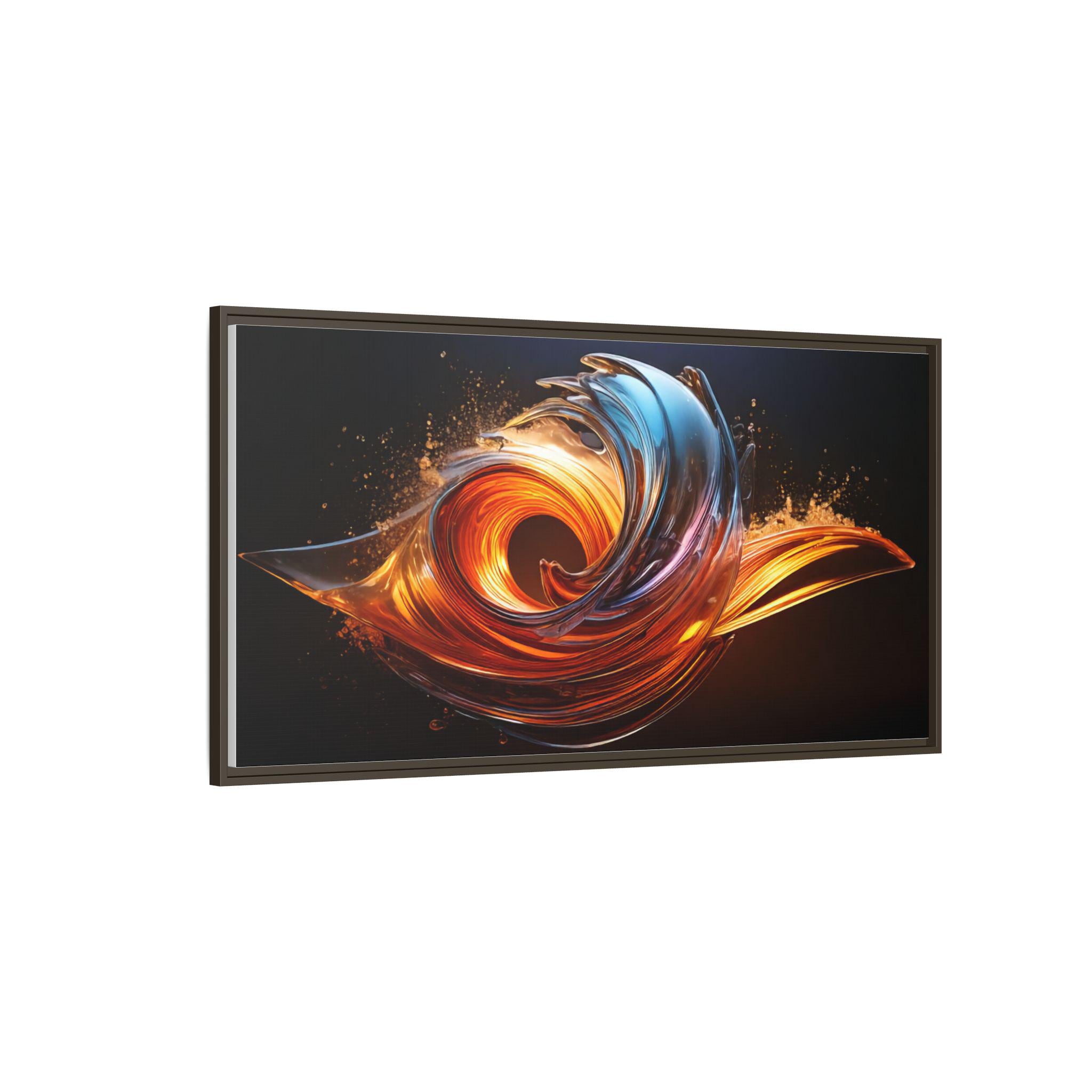 This framed matte canvas brings movement and heat into any room. The print captures a swirling, flame-like abstract in molten oranges and cool cerulean streaks against a deep, velvety background. Mounted on a slim pine frame with a soft matte finish, the image reads like a suspended moment — energetic but refined. Hang it over a living room sofa, entry console, or workspace to anchor a contemporary space with dramatic color and sculptural flow. The archival coating and Greenguard Gold inks keep colors vivid while the natural pine frame adds a warm, grounded edge that complements industrial, mid-century, and modern interiors.
