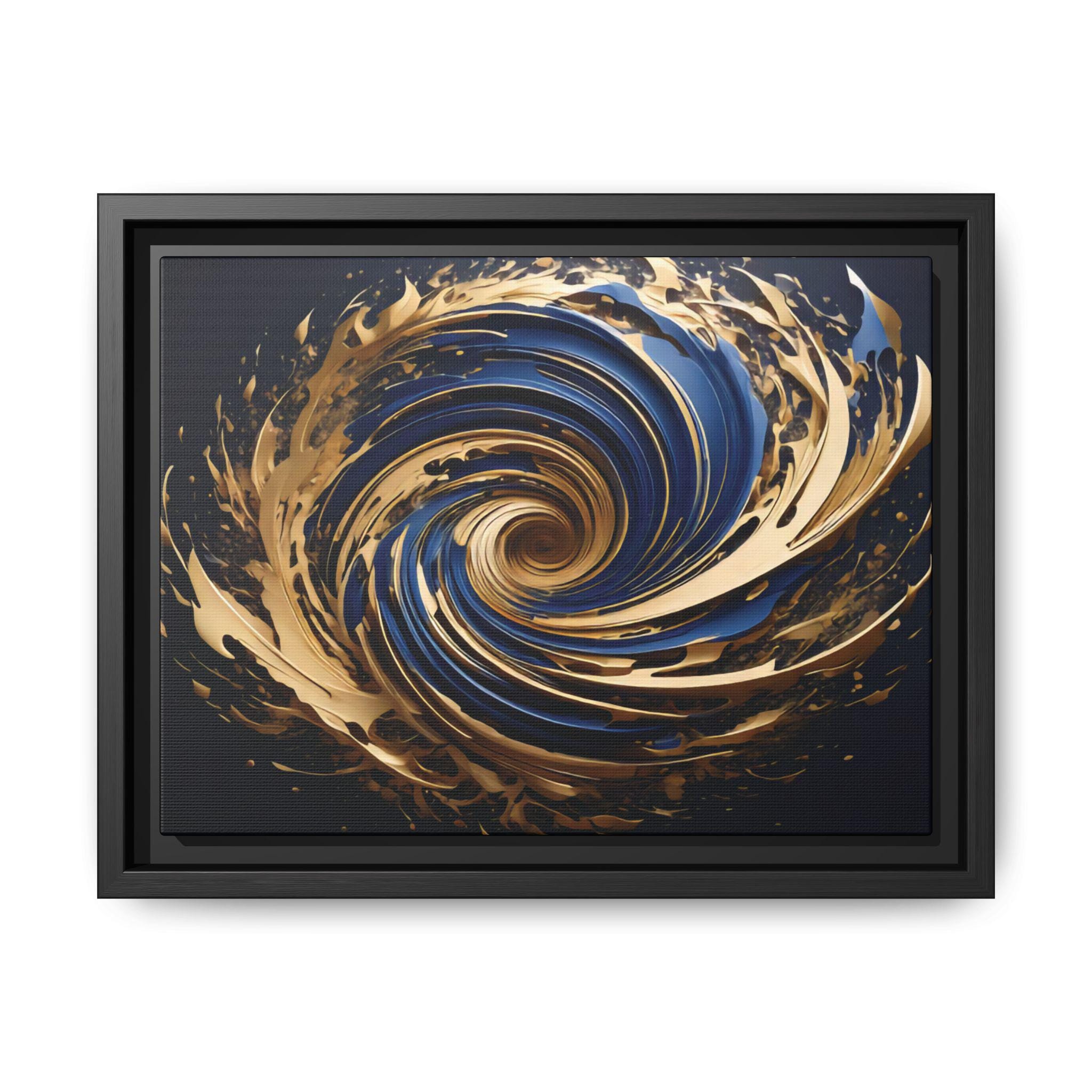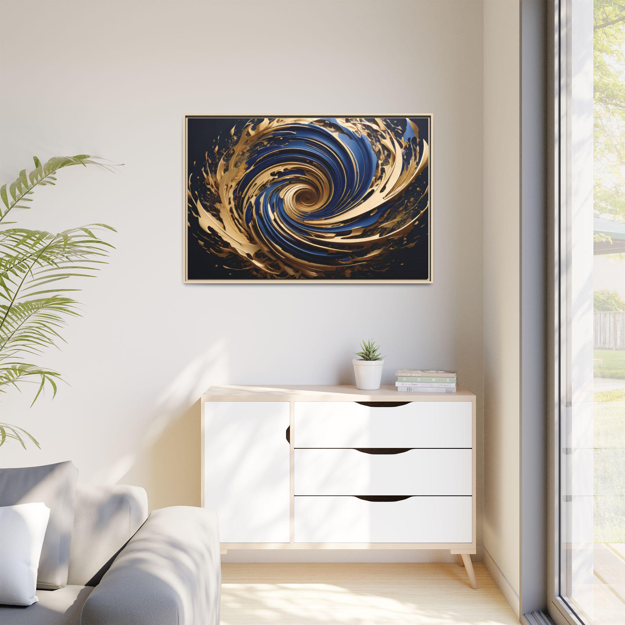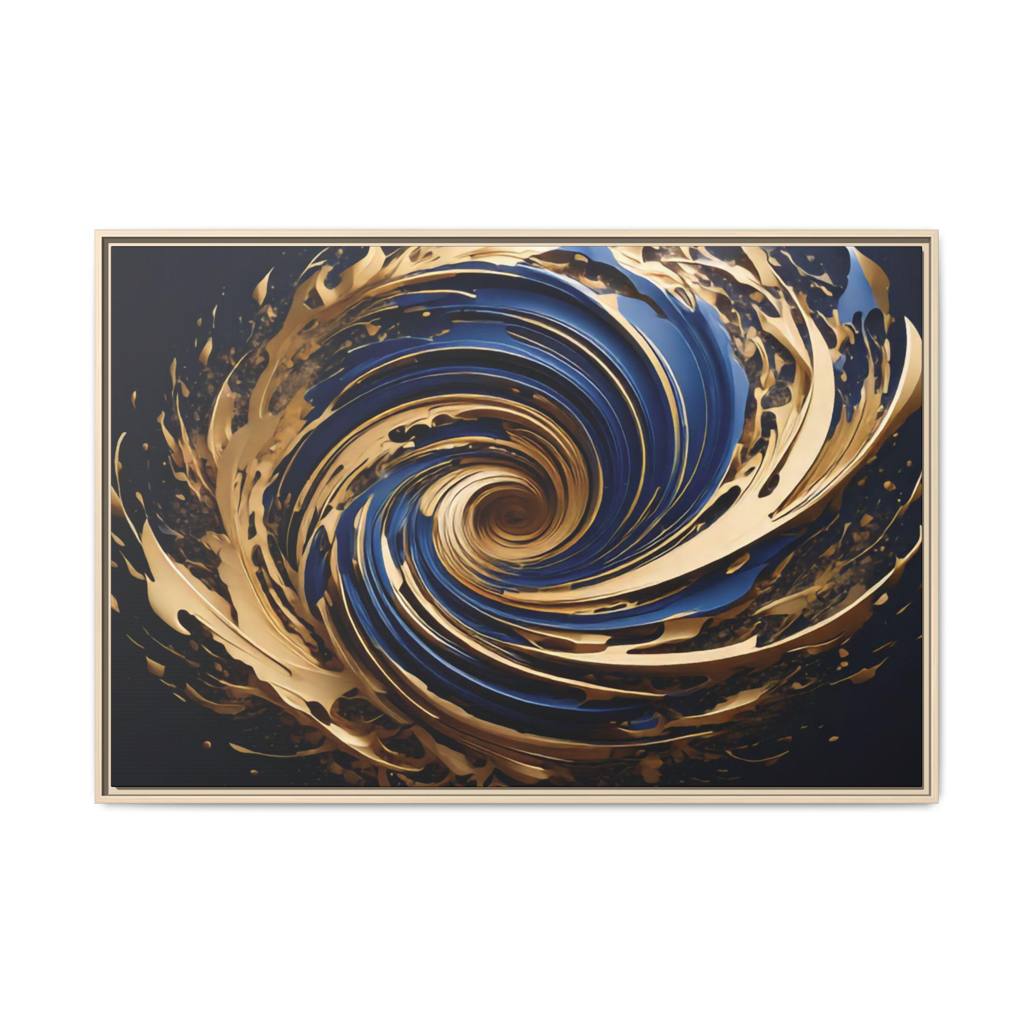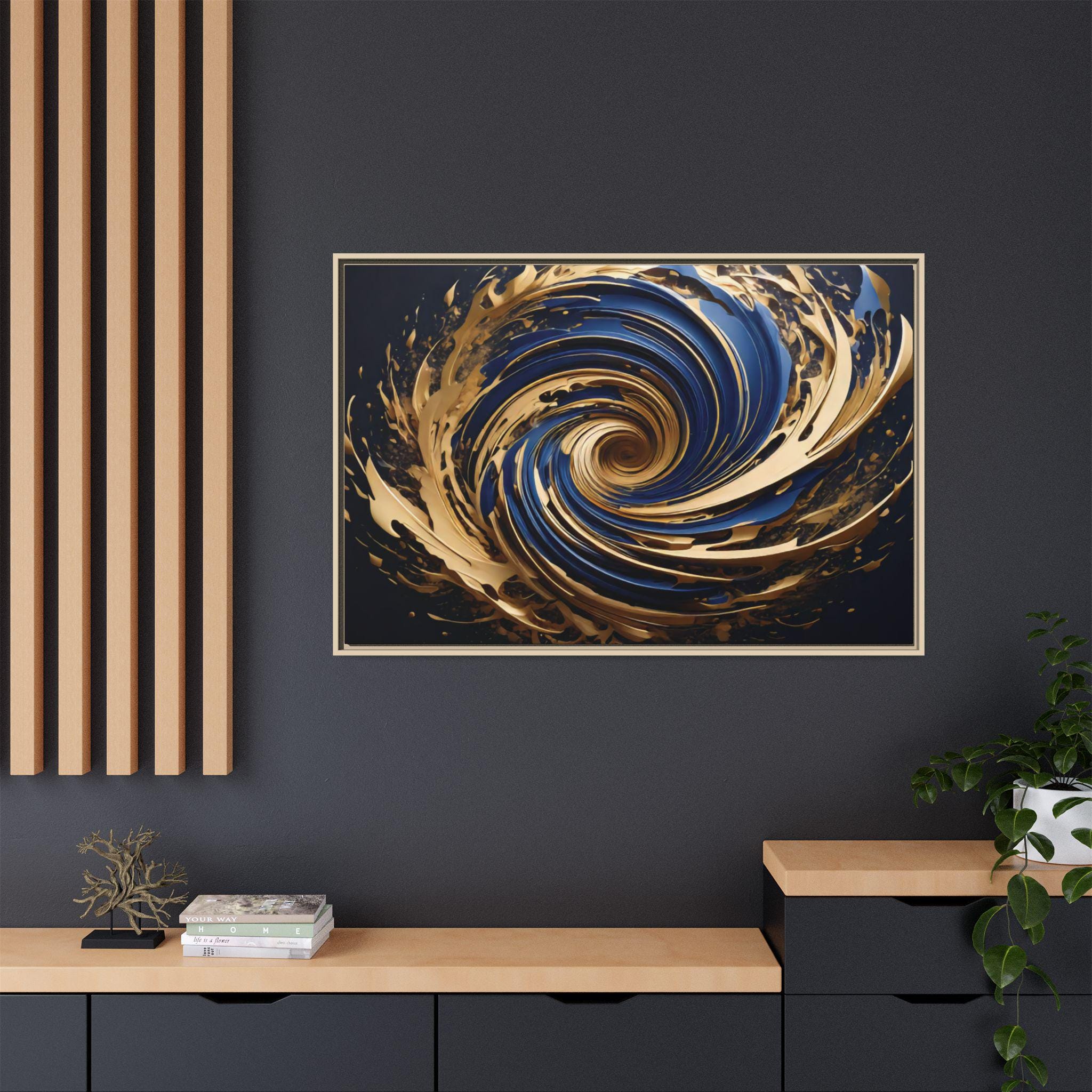 A framed matte canvas print that brings dramatic motion and rich color into any room. Deep navy swirls meet molten gold accents in an abstract vortex that feels alive on the wall. The textured canvas and refined pine frame give the piece an art-gallery presence while keeping it grounded and warm. Hang it above a mantel, in an entryway, or behind a low-profile sofa to anchor the space with elegant energy and hand-crafted detail.