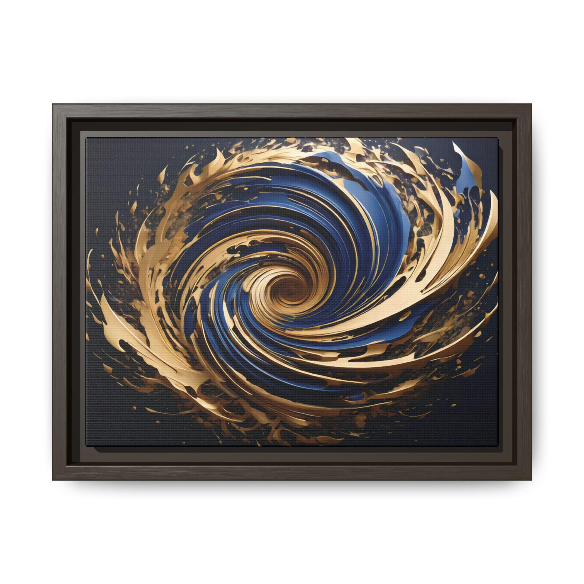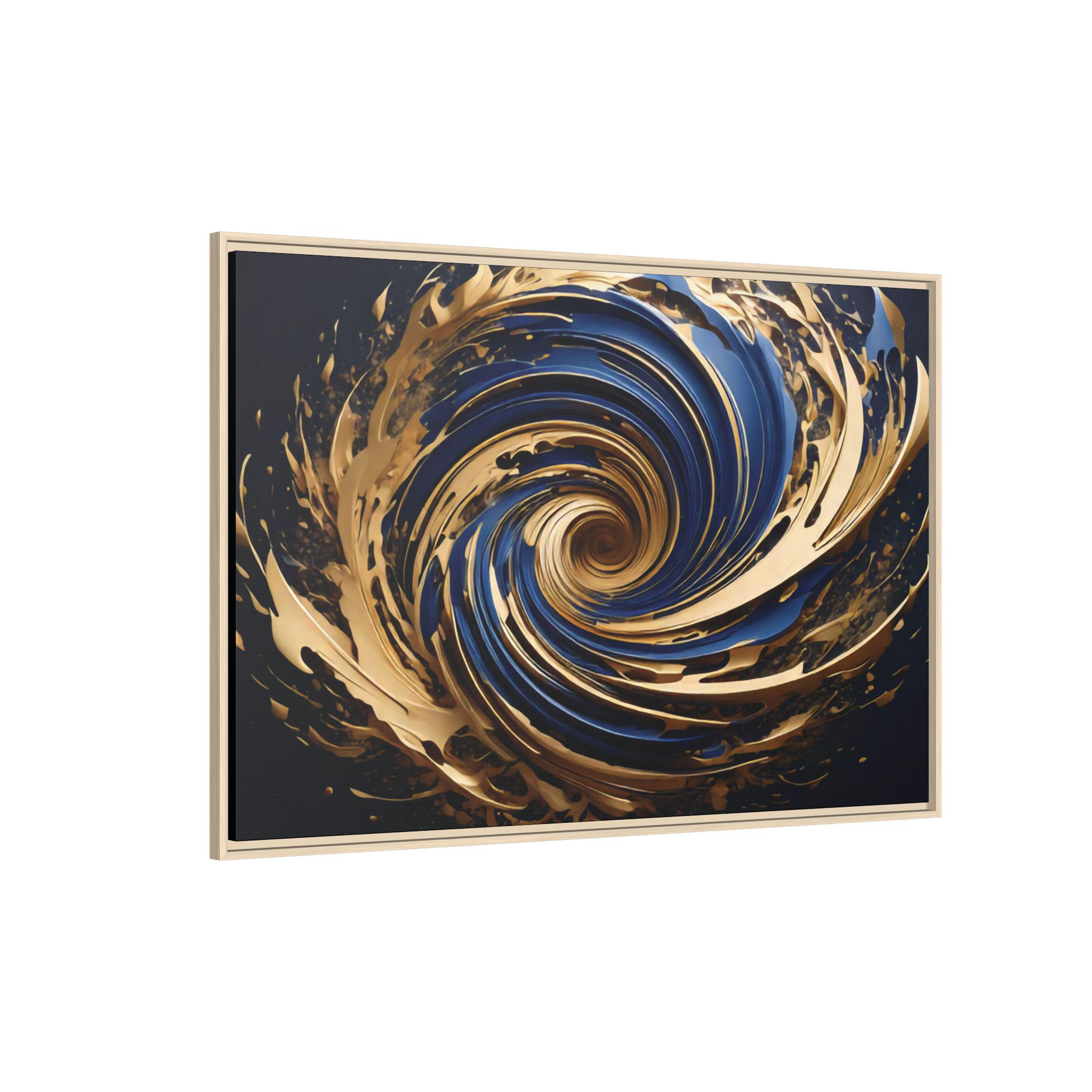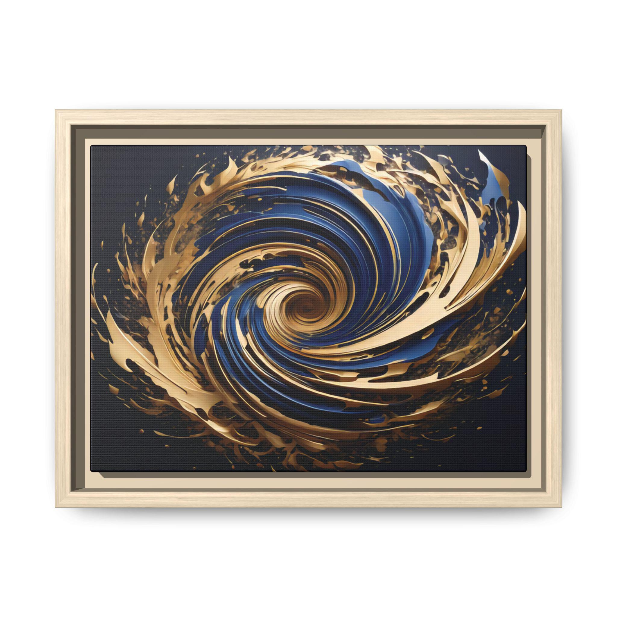 A framed matte canvas print that brings dramatic motion and rich color into any room. Deep navy swirls meet molten gold accents in an abstract vortex that feels alive on the wall. The textured canvas and refined pine frame give the piece an art-gallery presence while keeping it grounded and warm. Hang it above a mantel, in an entryway, or behind a low-profile sofa to anchor the space with elegant energy and hand-crafted detail.