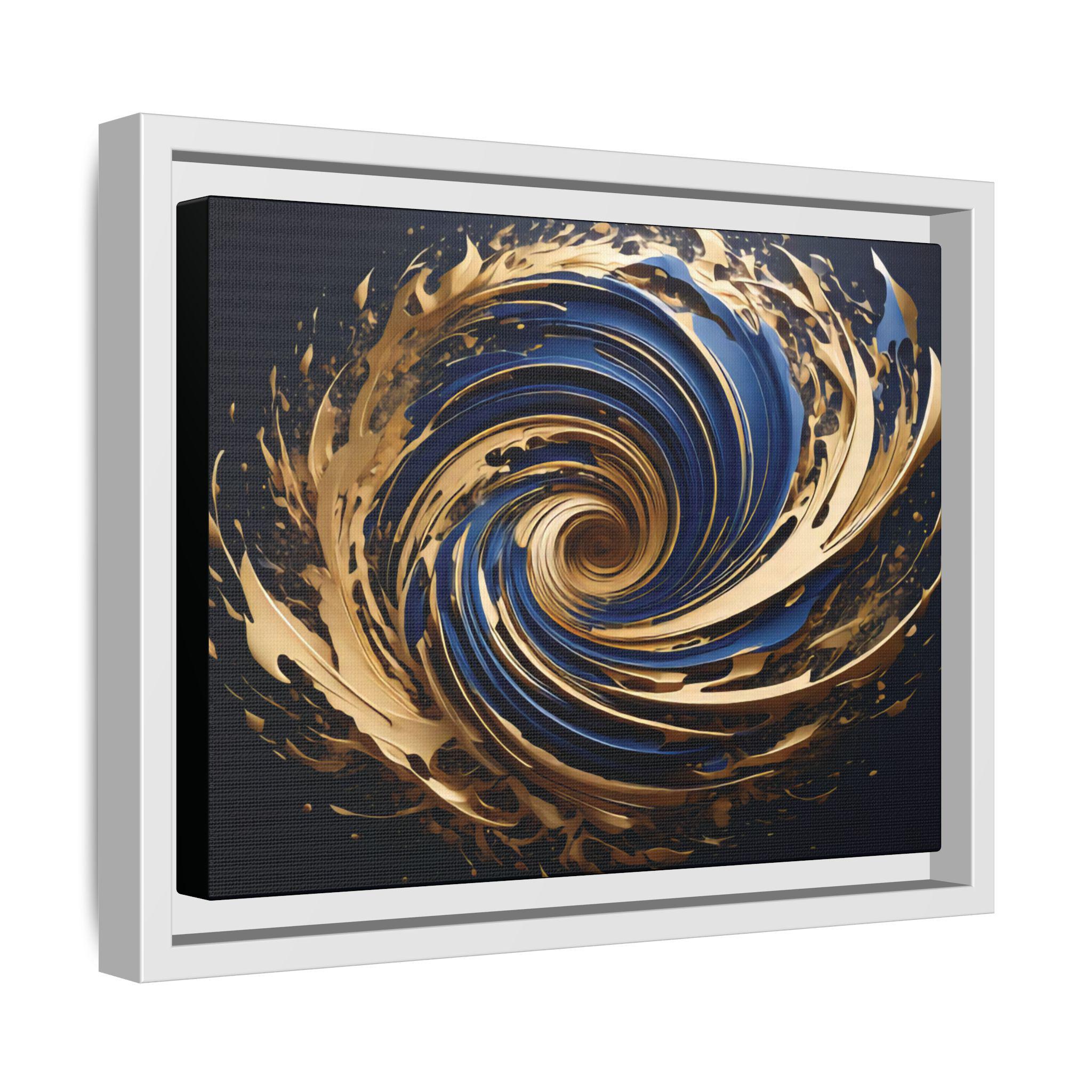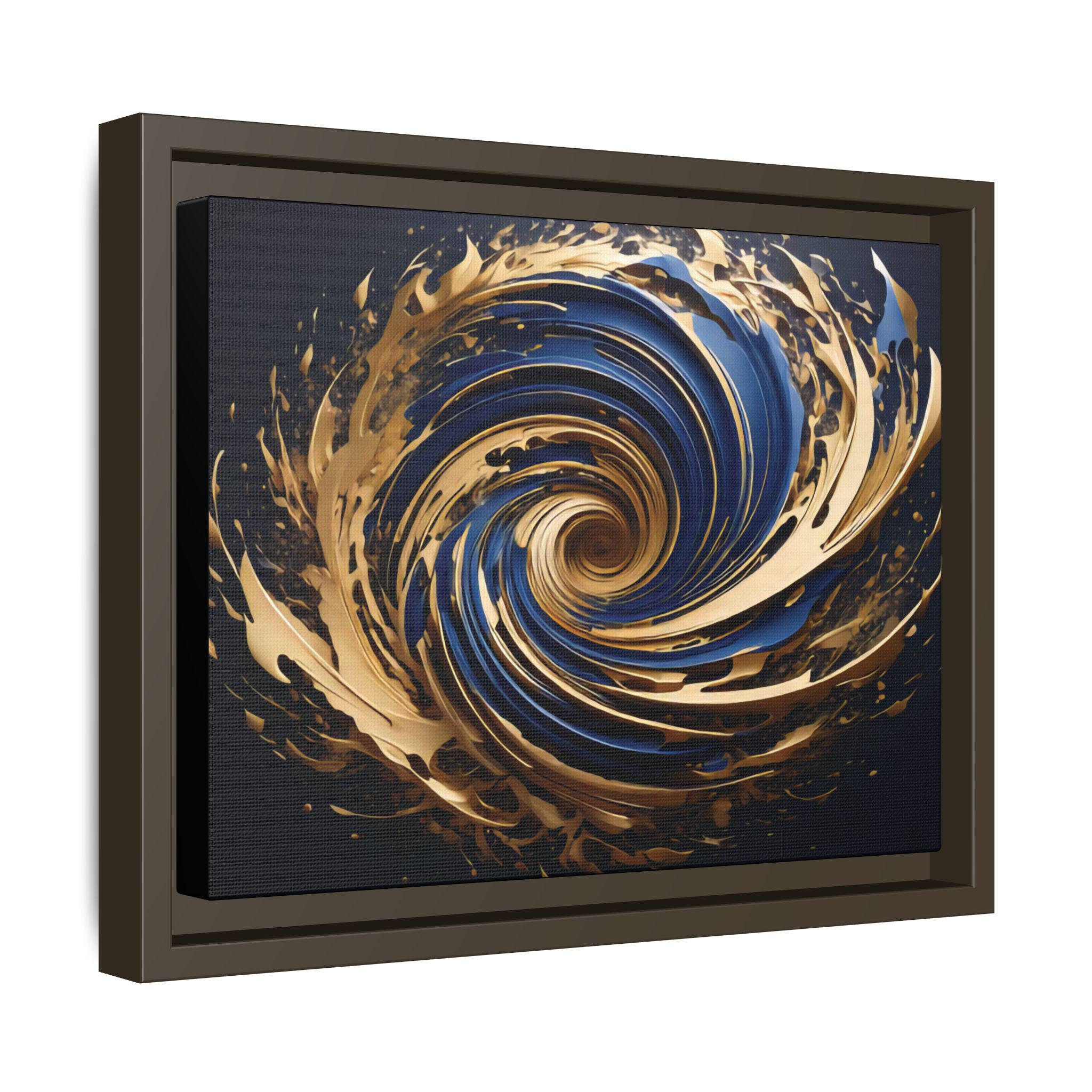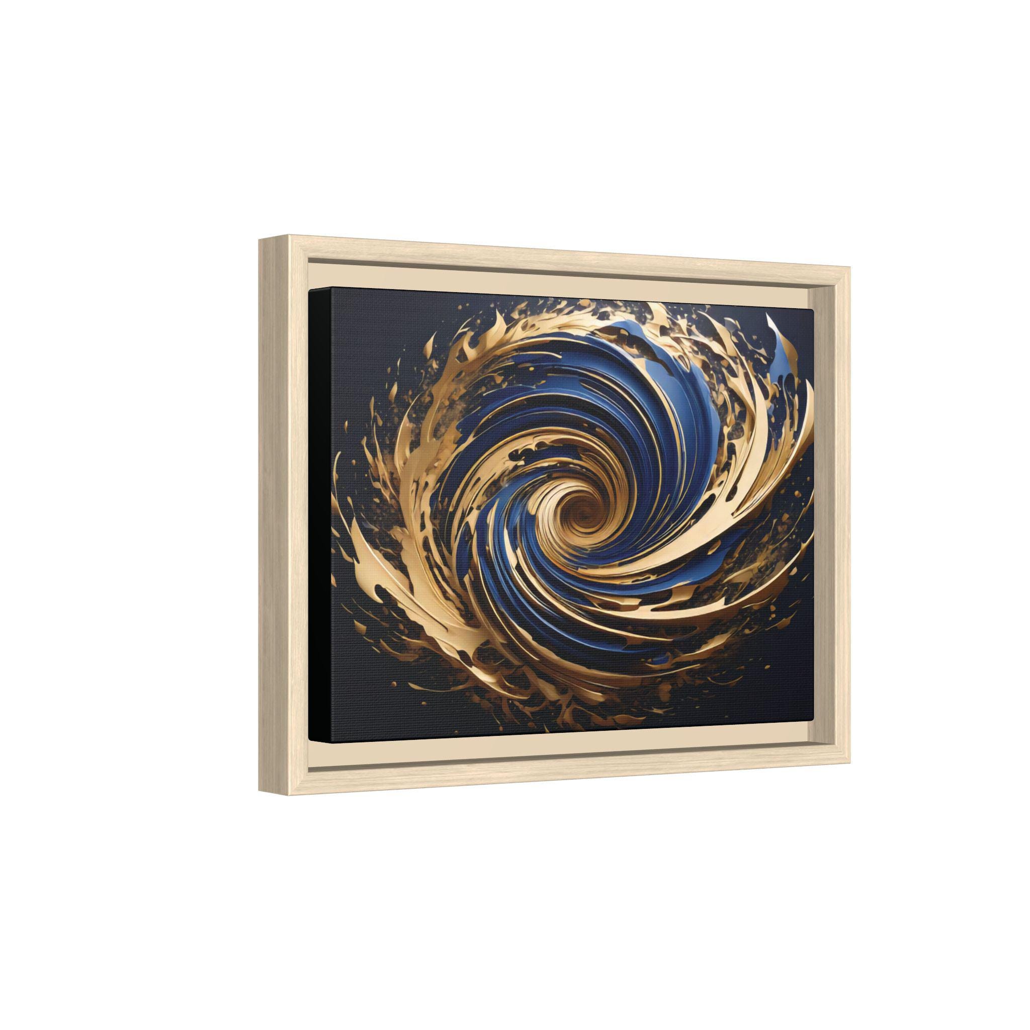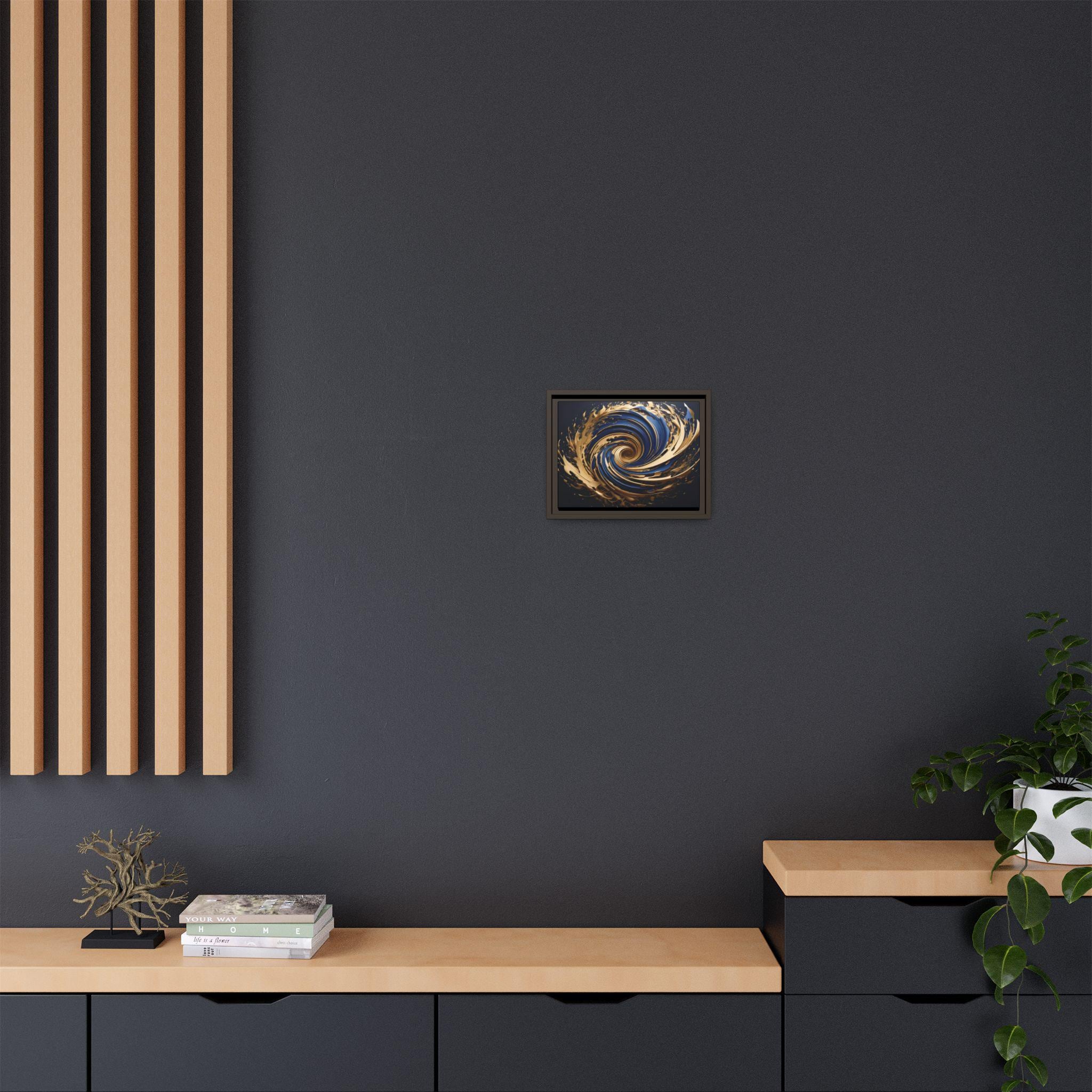 A framed matte canvas print that brings dramatic motion and rich color into any room. Deep navy swirls meet molten gold accents in an abstract vortex that feels alive on the wall. The textured canvas and refined pine frame give the piece an art-gallery presence while keeping it grounded and warm. Hang it above a mantel, in an entryway, or behind a low-profile sofa to anchor the space with elegant energy and hand-crafted detail.