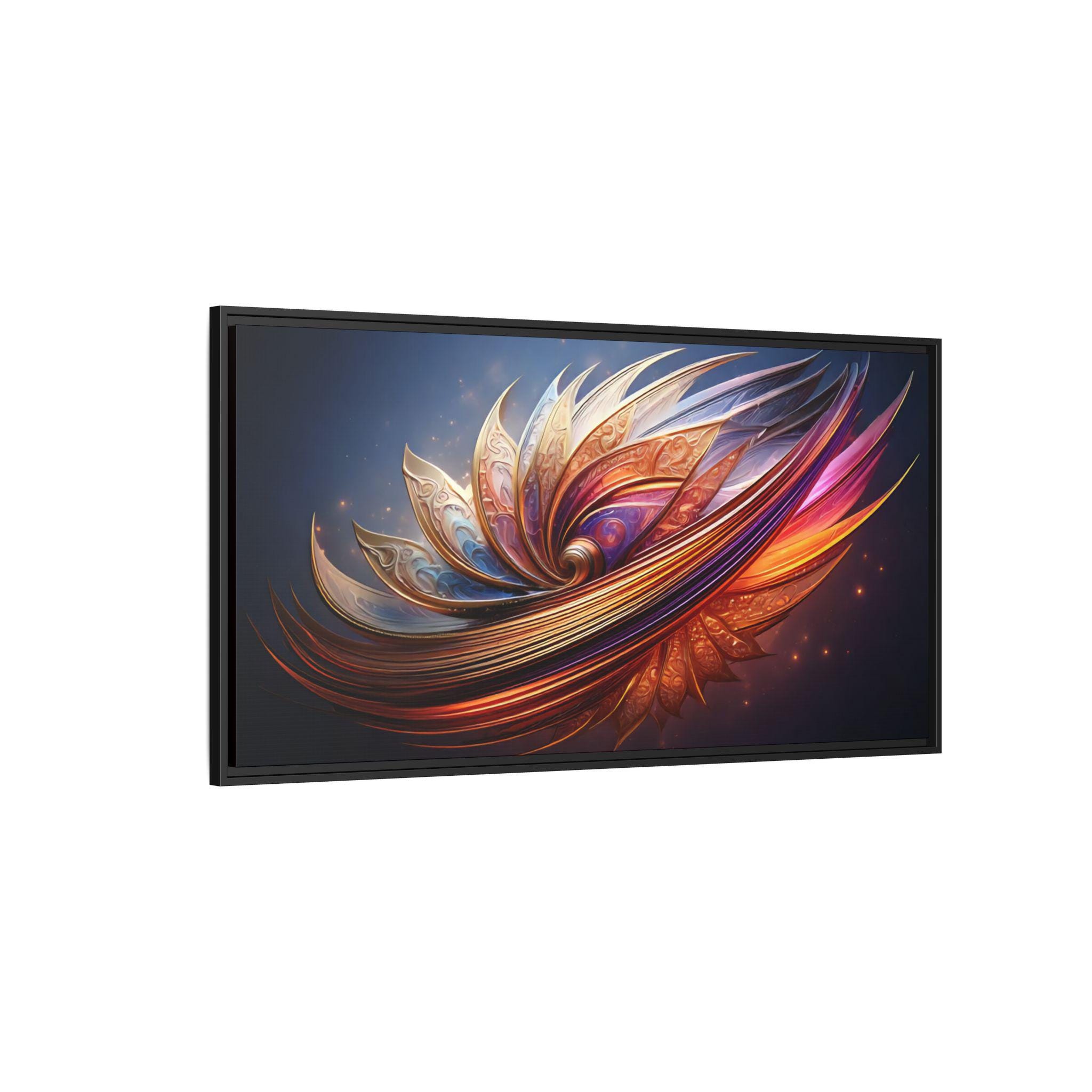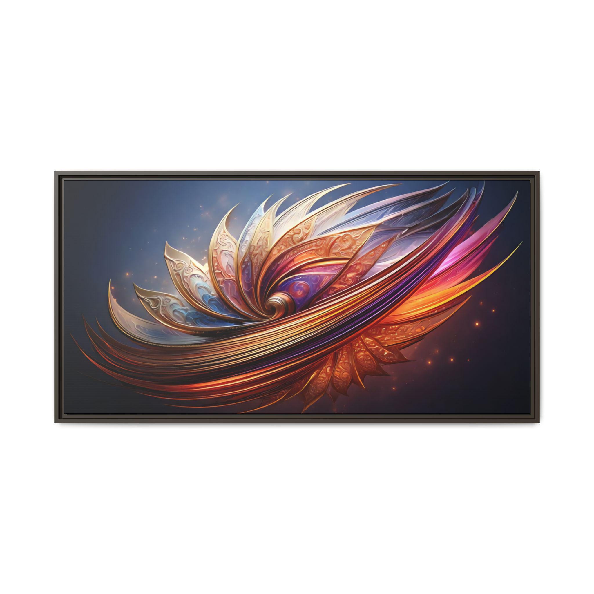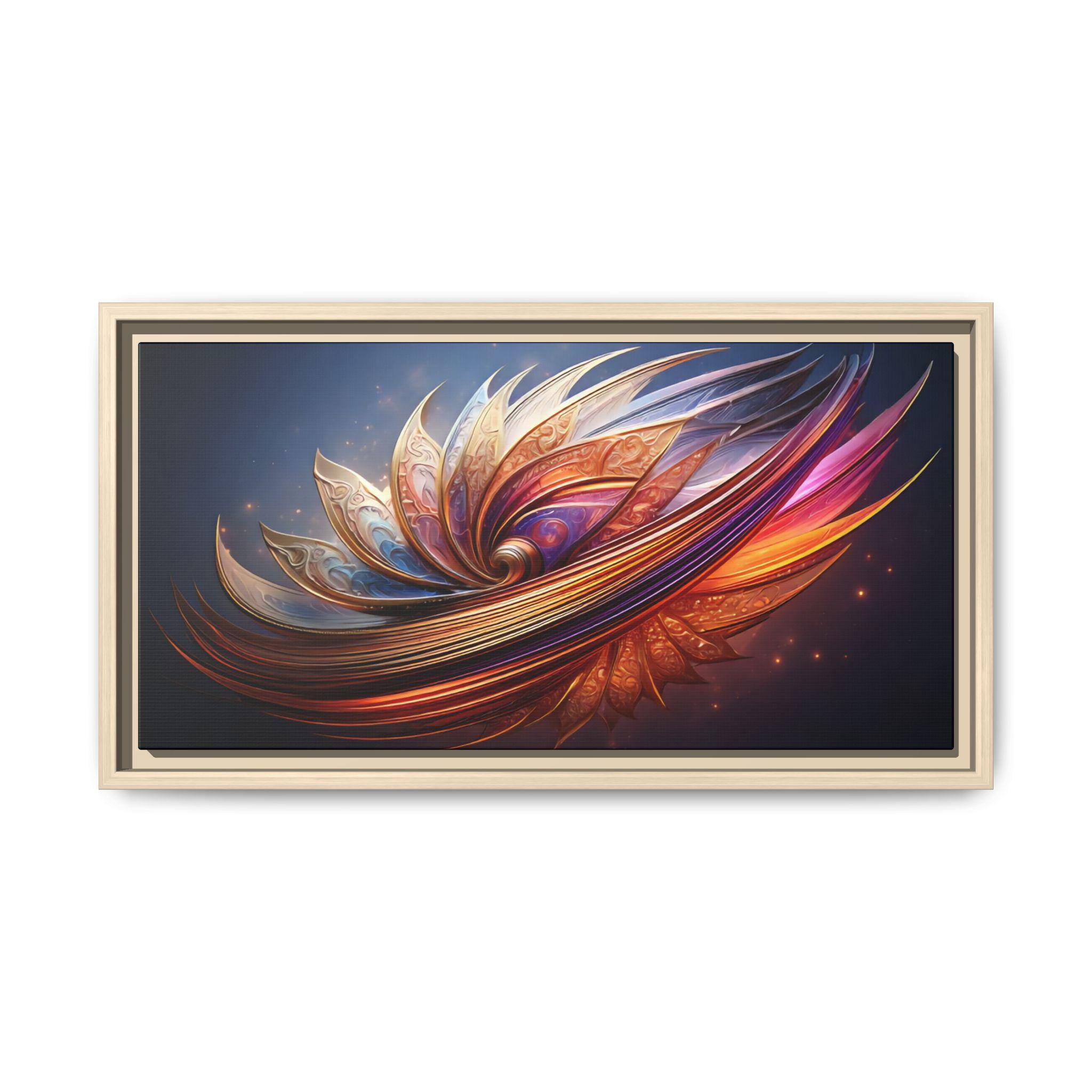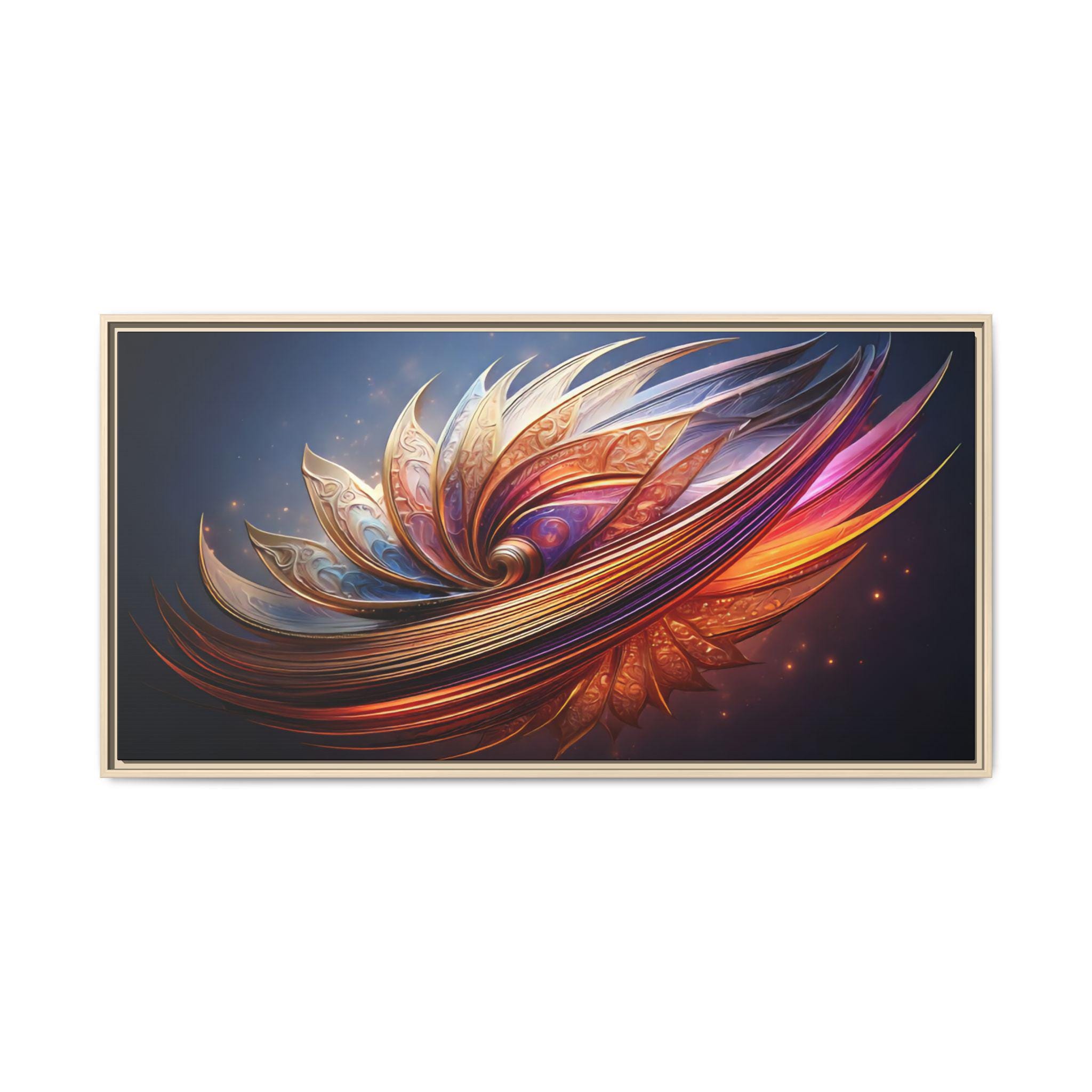 A framed matte canvas print that brings vibrant, sculptural color into a living space. The image’s swirling, petal-like forms glow with rich golds, magentas, and deep blues, creating movement and depth against a dark backdrop. Mounted on a light pine frame and stretched on sustainably sourced radial pine, the piece arrives ready to hang with sawtooth hardware. The specially coated cotton-poly canvas and UL-certified Greenguard Gold latex inks preserve brilliant, non-toxic color and fine detail—great for making a living room wall, hallway, or creative studio feel energized and intentionally curated.