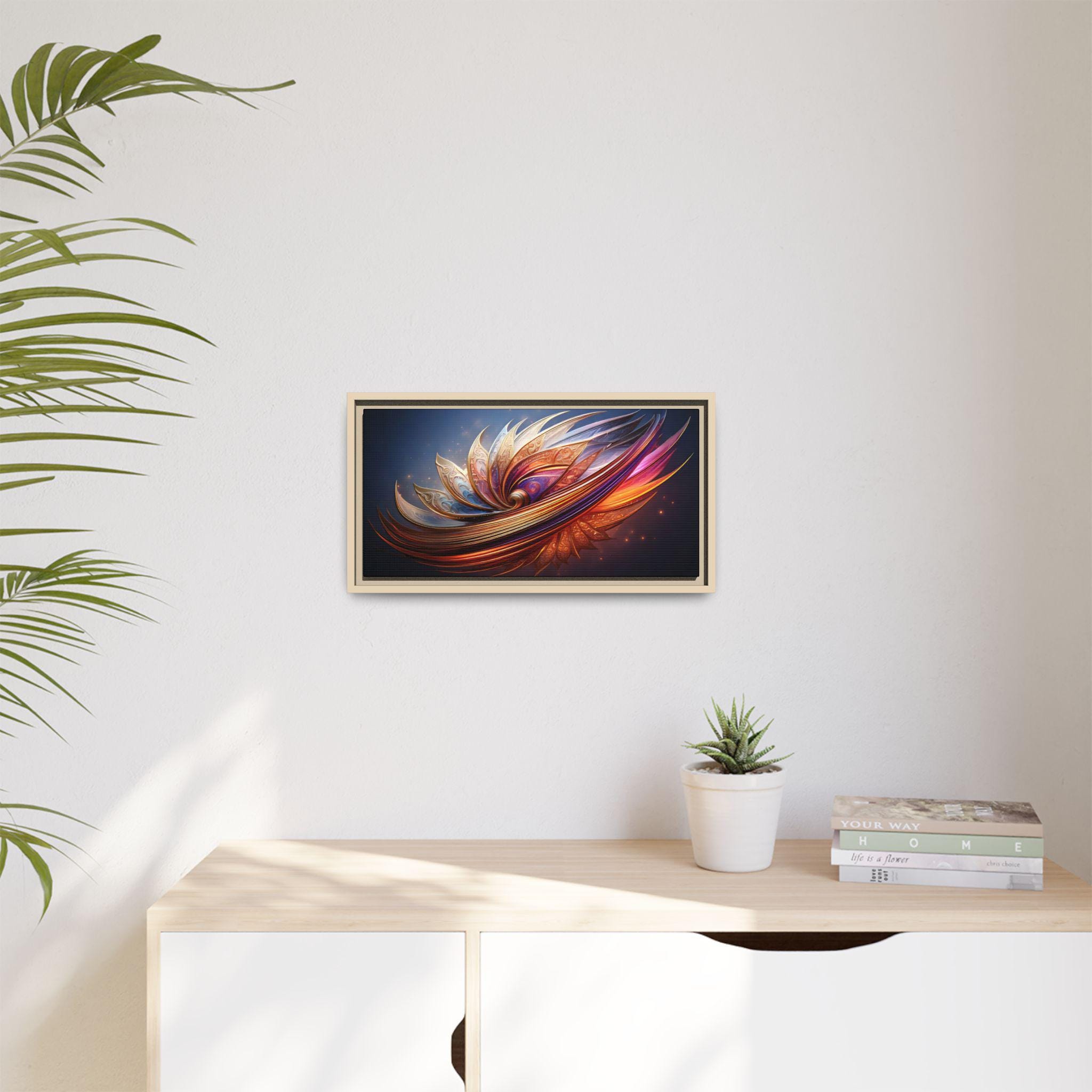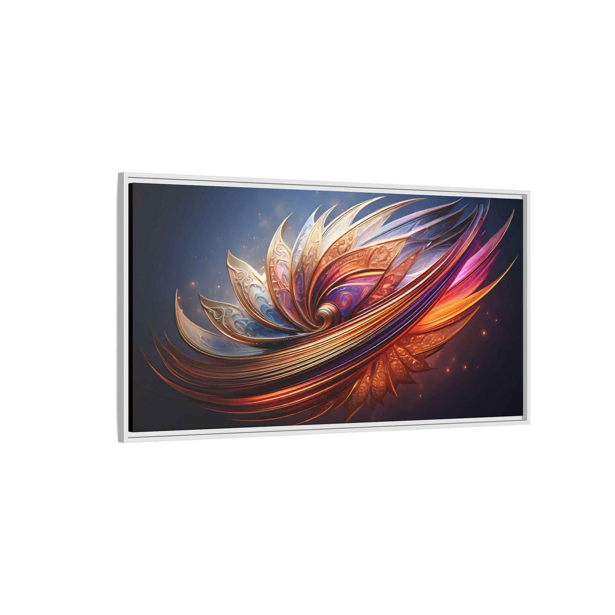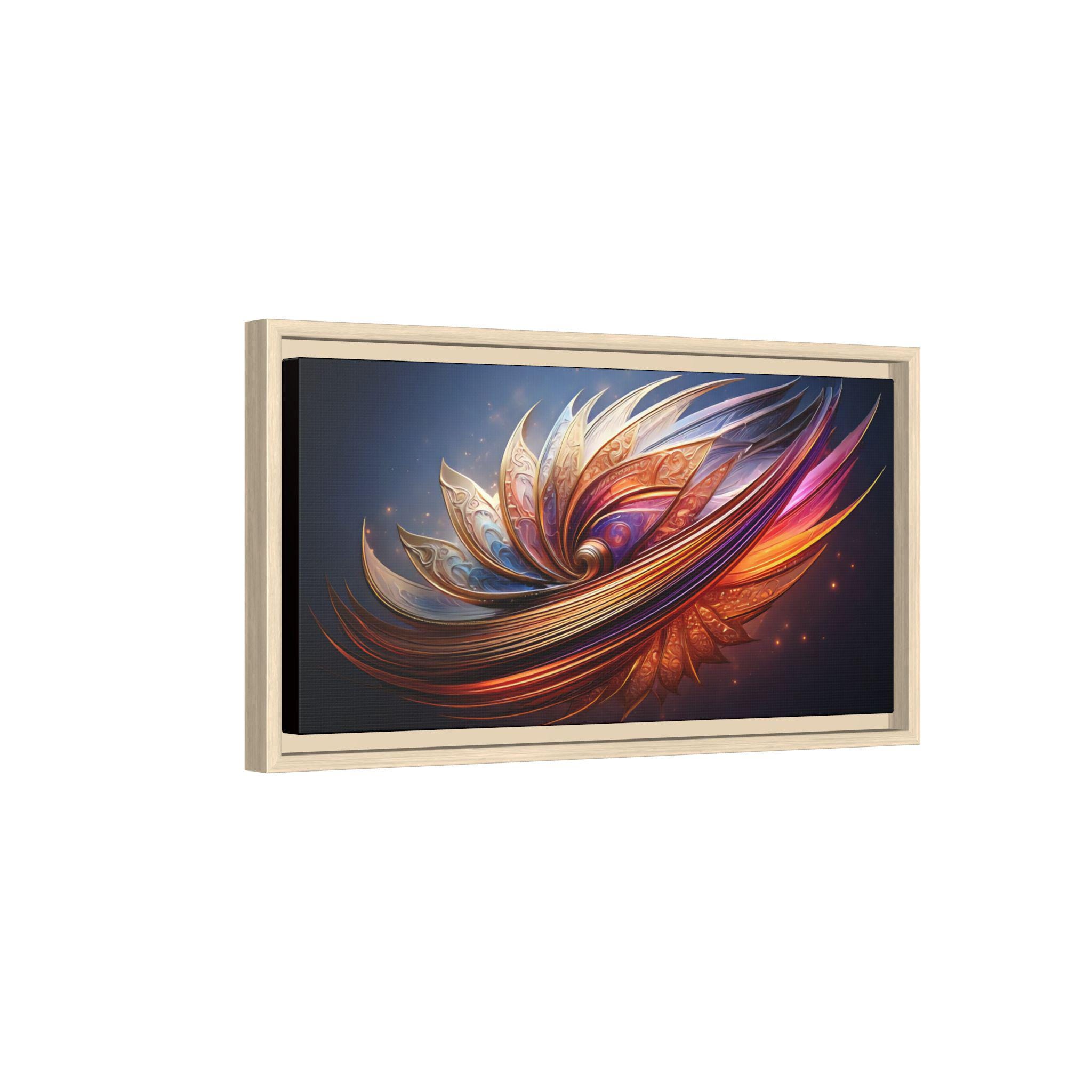 A framed matte canvas print that brings vibrant, sculptural color into a living space. The image’s swirling, petal-like forms glow with rich golds, magentas, and deep blues, creating movement and depth against a dark backdrop. Mounted on a light pine frame and stretched on sustainably sourced radial pine, the piece arrives ready to hang with sawtooth hardware. The specially coated cotton-poly canvas and UL-certified Greenguard Gold latex inks preserve brilliant, non-toxic color and fine detail—great for making a living room wall, hallway, or creative studio feel energized and intentionally curated.