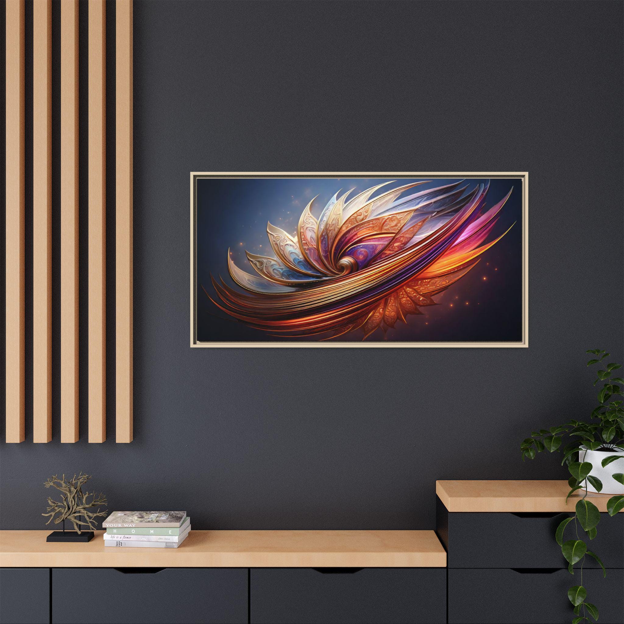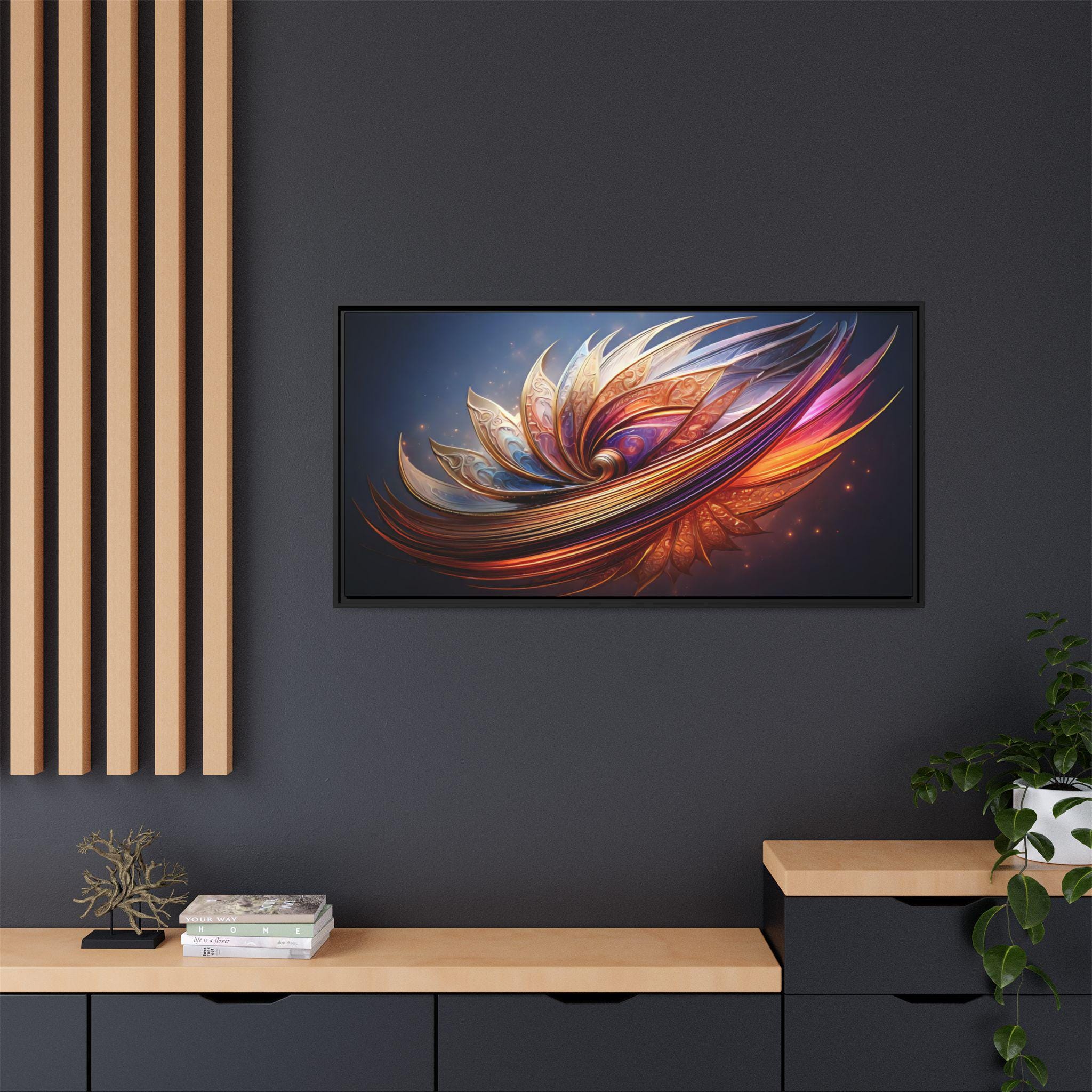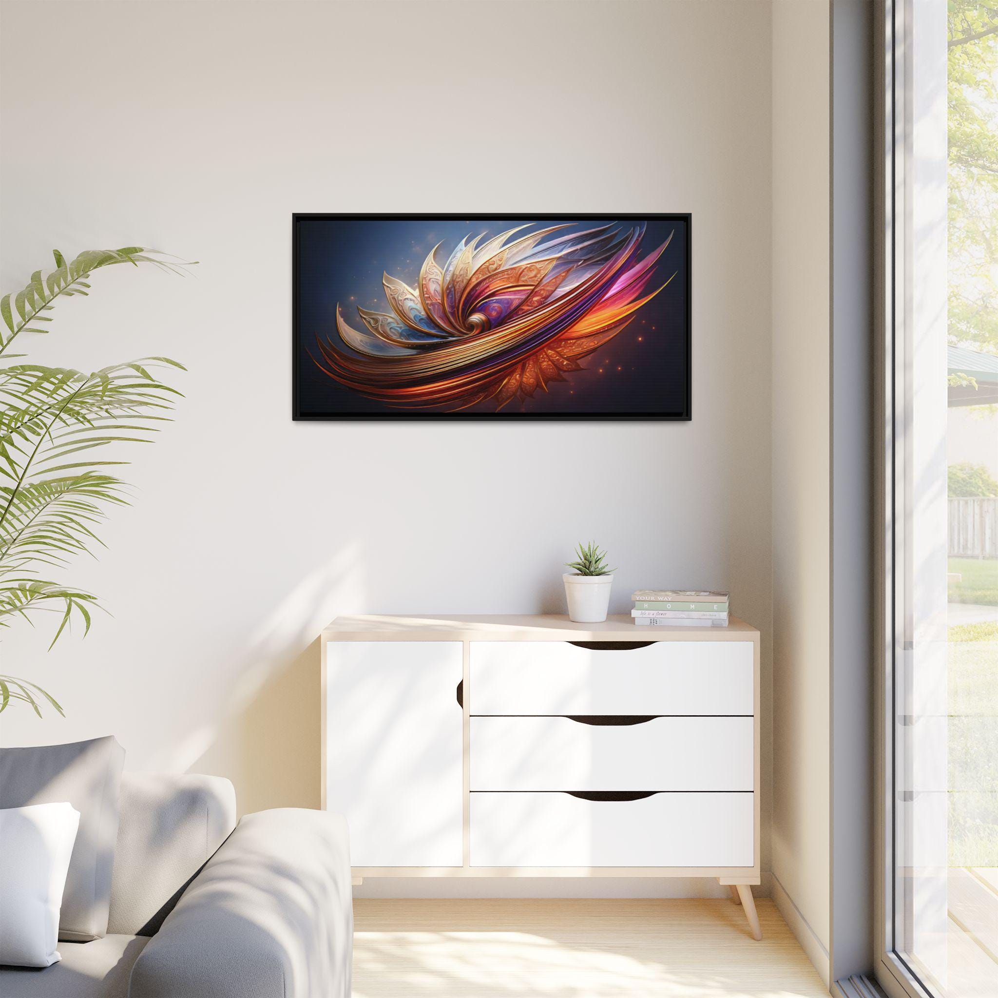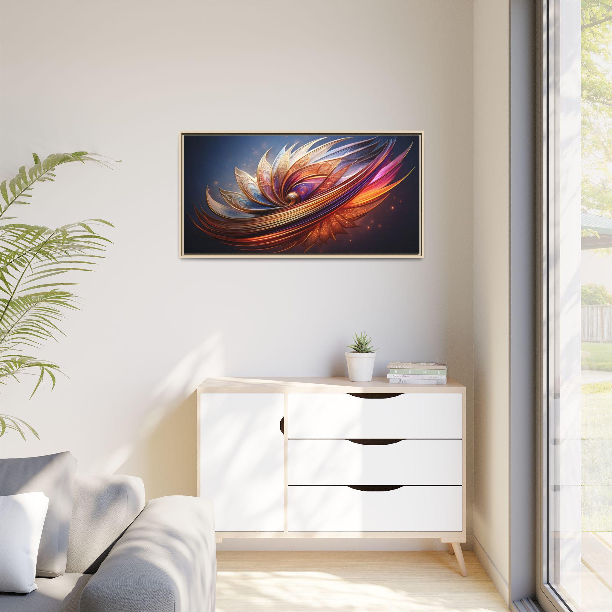 A framed matte canvas print that brings vibrant, sculptural color into a living space. The image’s swirling, petal-like forms glow with rich golds, magentas, and deep blues, creating movement and depth against a dark backdrop. Mounted on a light pine frame and stretched on sustainably sourced radial pine, the piece arrives ready to hang with sawtooth hardware. The specially coated cotton-poly canvas and UL-certified Greenguard Gold latex inks preserve brilliant, non-toxic color and fine detail—great for making a living room wall, hallway, or creative studio feel energized and intentionally curated.