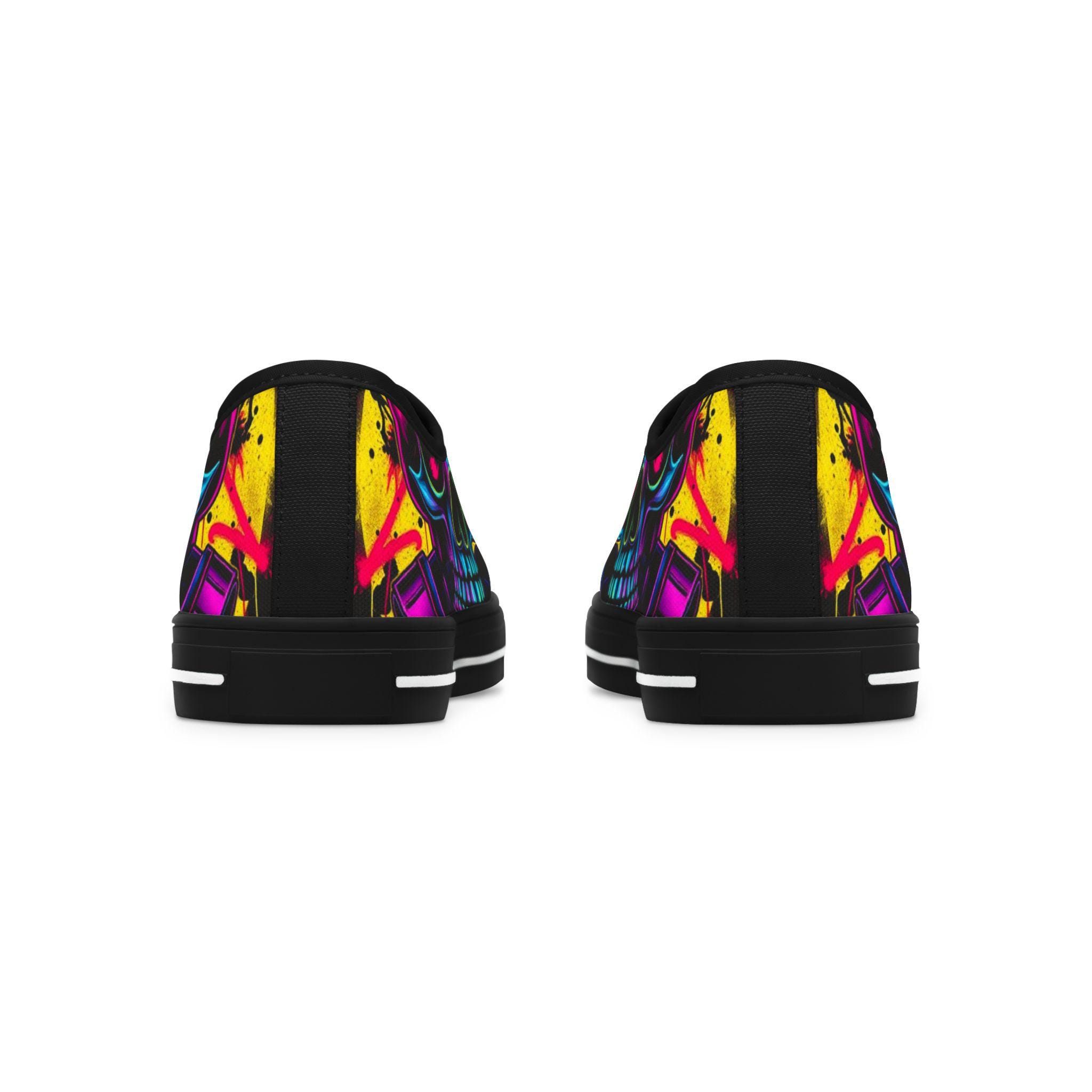 These low-top canvas sneakers bring bold, neon skull art to everyday steps. The full wraparound print lets the vibrant design peek from the outer panels and heel while classic white toe caps and laces keep the look grounded. Lightweight EVA soles and memory-foam insoles give early-morning commutes and late-night walks a springy, shock-absorbing feel. Metal eyelets and PU-leather reinforced toes add durability where you need it most. Wear them with cropped jeans, a band tee, or a leather jacket to push a streetwise, art-forward vibe that stands out without shouting.