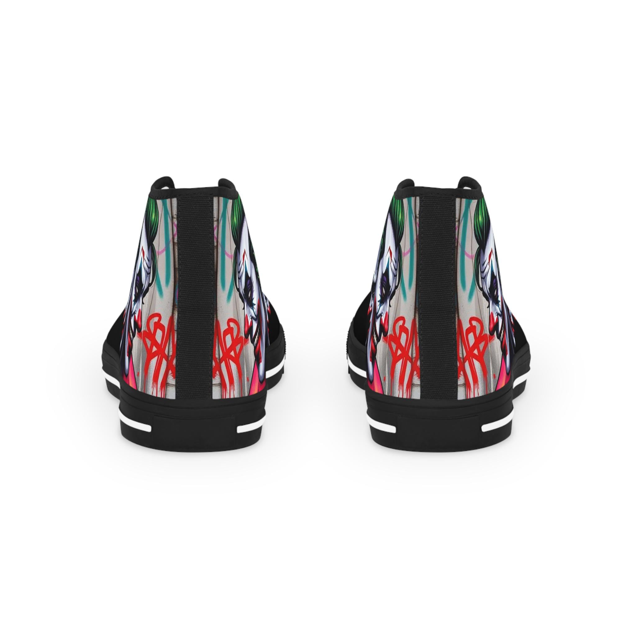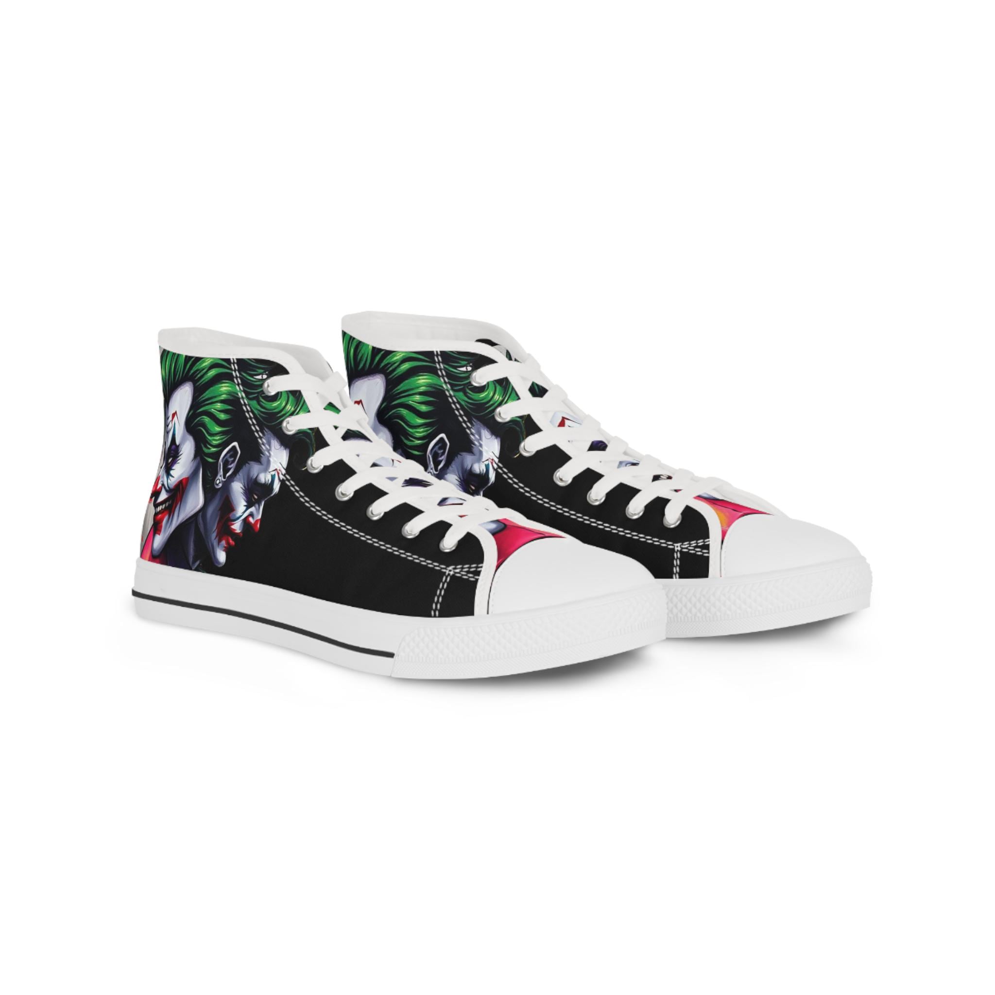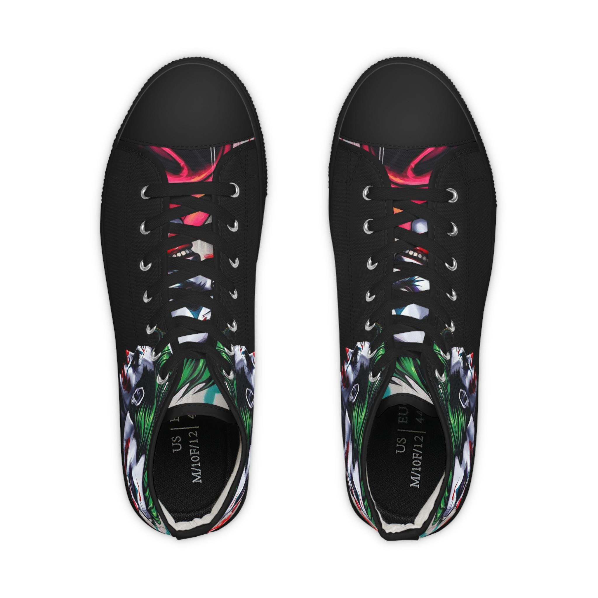 These high-top sneakers bring bold, streetwise energy to every step. The graphic wraparound print features a dark, theatrical character with vivid green hair and pale features, set against deep black panels and pops of magenta at the toe — a look that reads like comic-book mischief turned wearable. Built on a breathable polyester canvas with PU leather accents, they sit on lightweight EVA insoles with memory foam cushioning for shock absorption and lasting comfort. Metal eyelets, a pleather-covered toe cap, and a durable rubber outsole add toughness for everyday wear. Lace them up for nights out, convention floors, or when you want your footwear to do the talking.