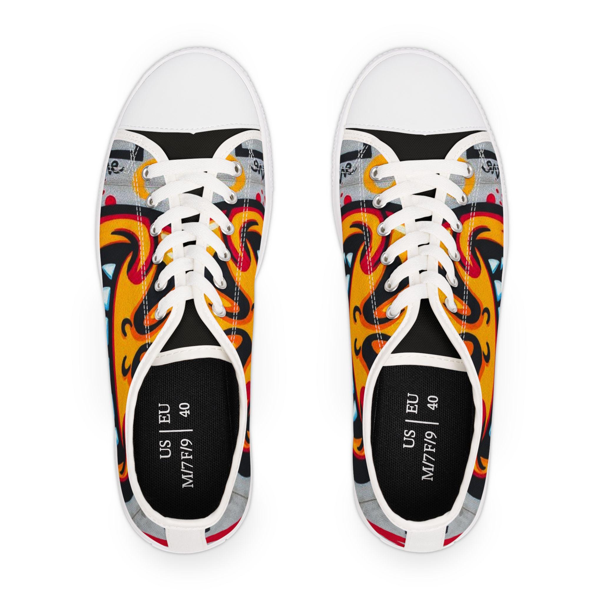 These low-top canvas sneakers bring street art energy to every step. Vivid, wraparound graphics curl across the sides and tongue — a grinning, graffiti-style face rendered in warm oranges and electric blues against concrete-gray accents. They sit low on the ankle for a relaxed, skate-inspired silhouette and pair with worn denim or cropped trousers to let the print speak. The textured polyester canvas and pleather toe give them a lived-in look, while memory-foam insoles and an EVA midsole soften long days on your feet. Wear them to gallery openings, late-night walks, or whenever you want footwear that feels like personal artwork in motion.